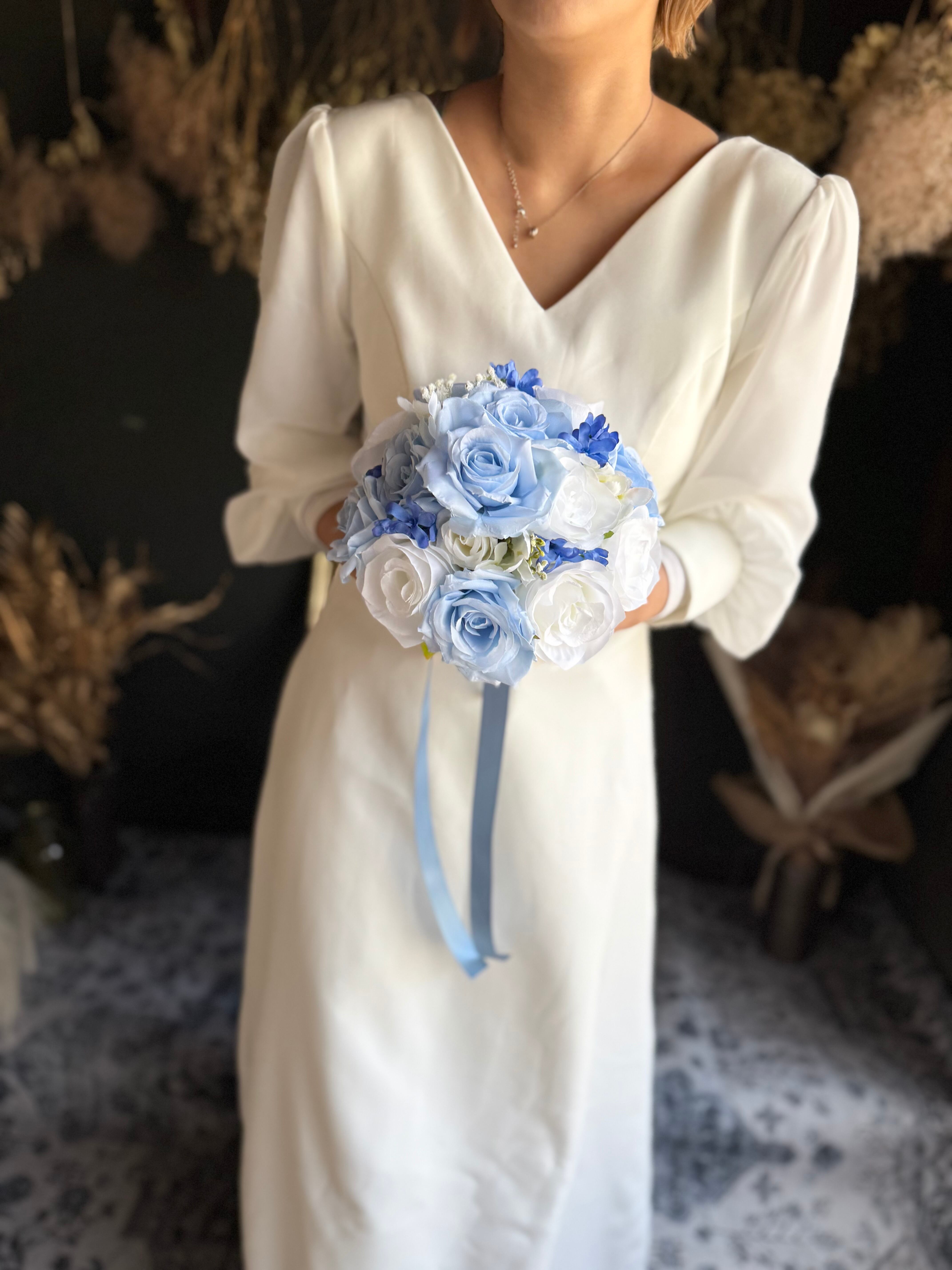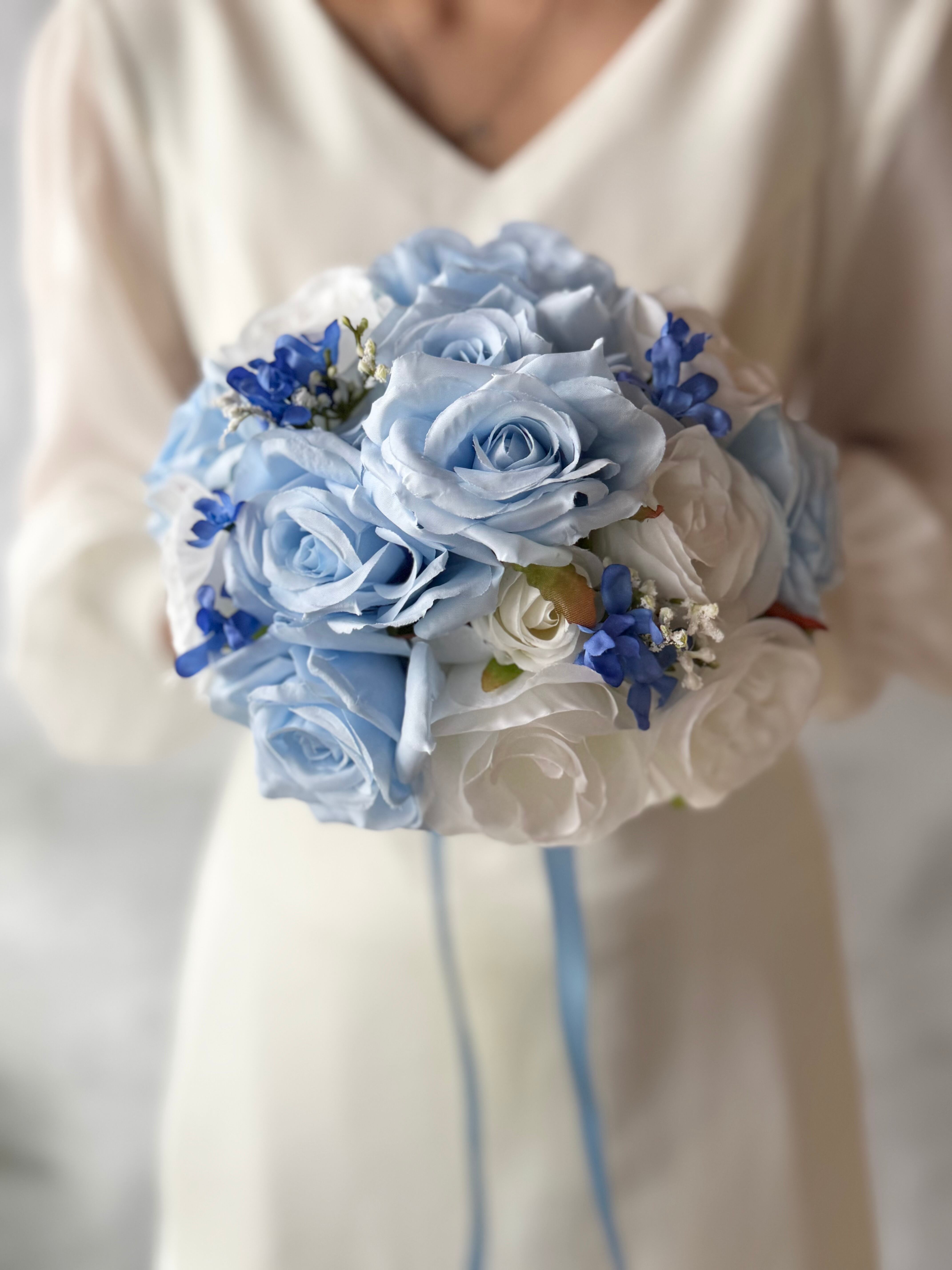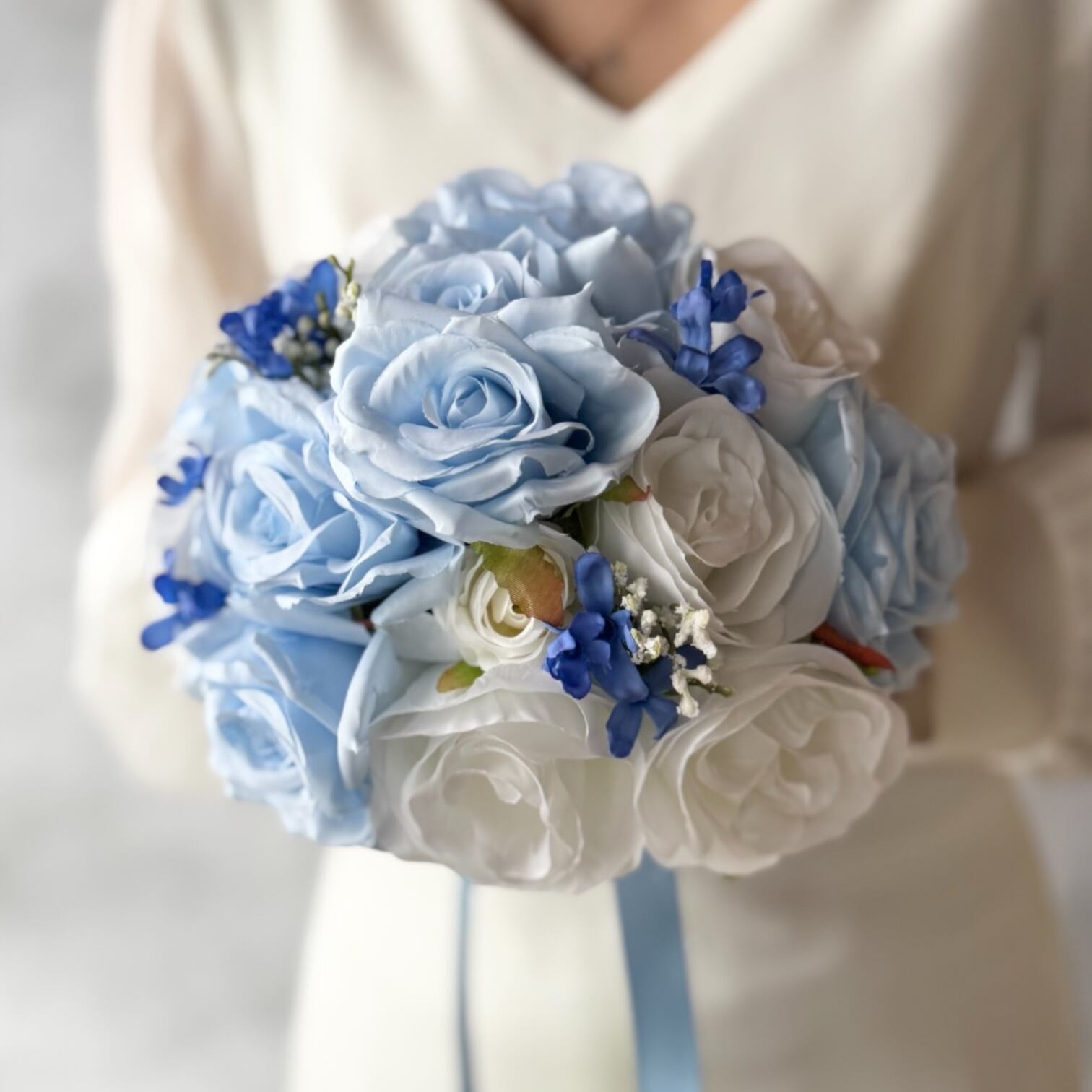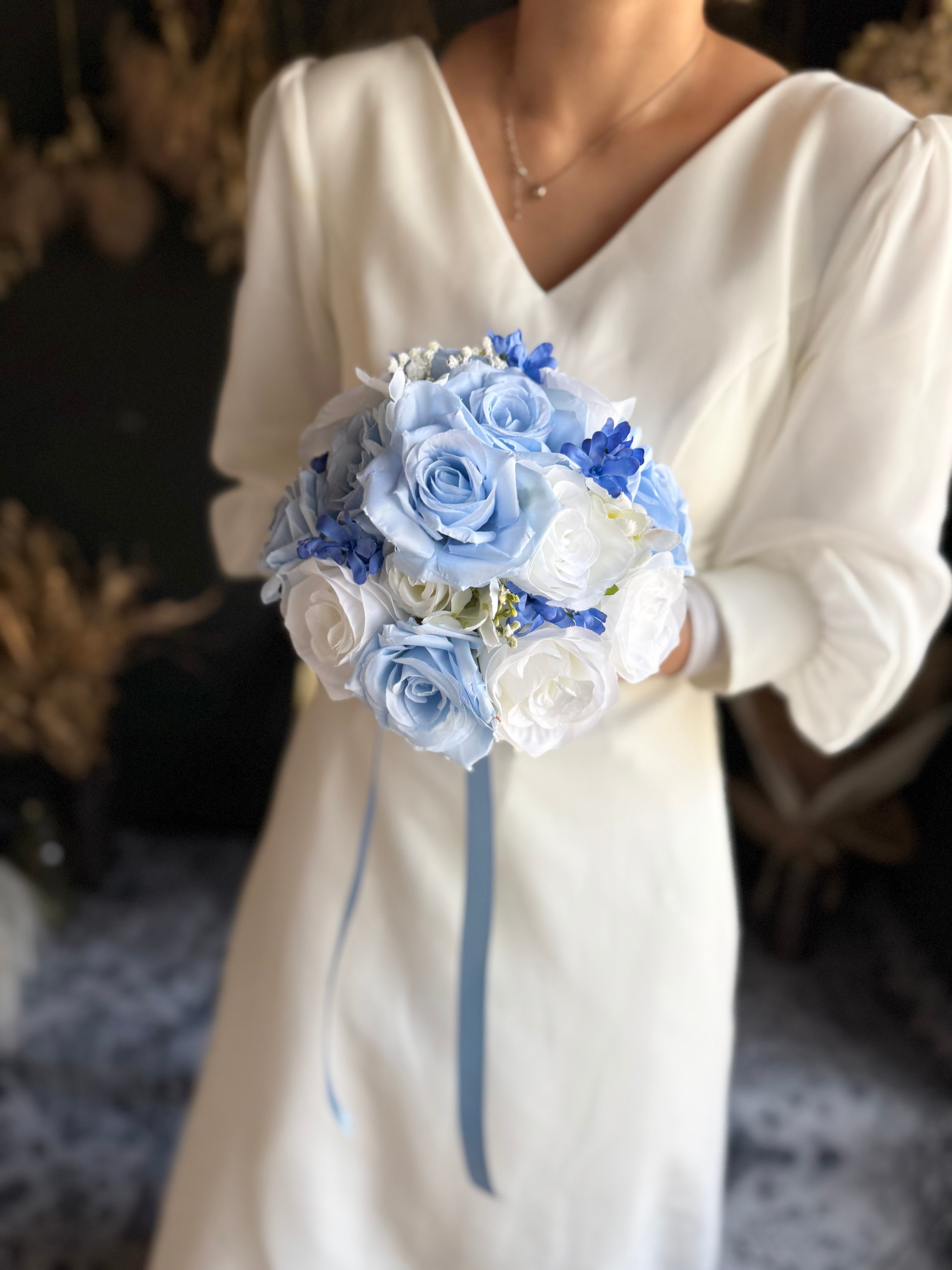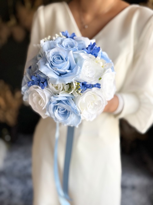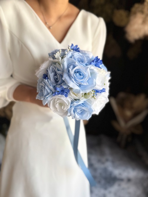 爽やかなブルー濃淡の色味が可愛らしいラウンドブーケ•*・