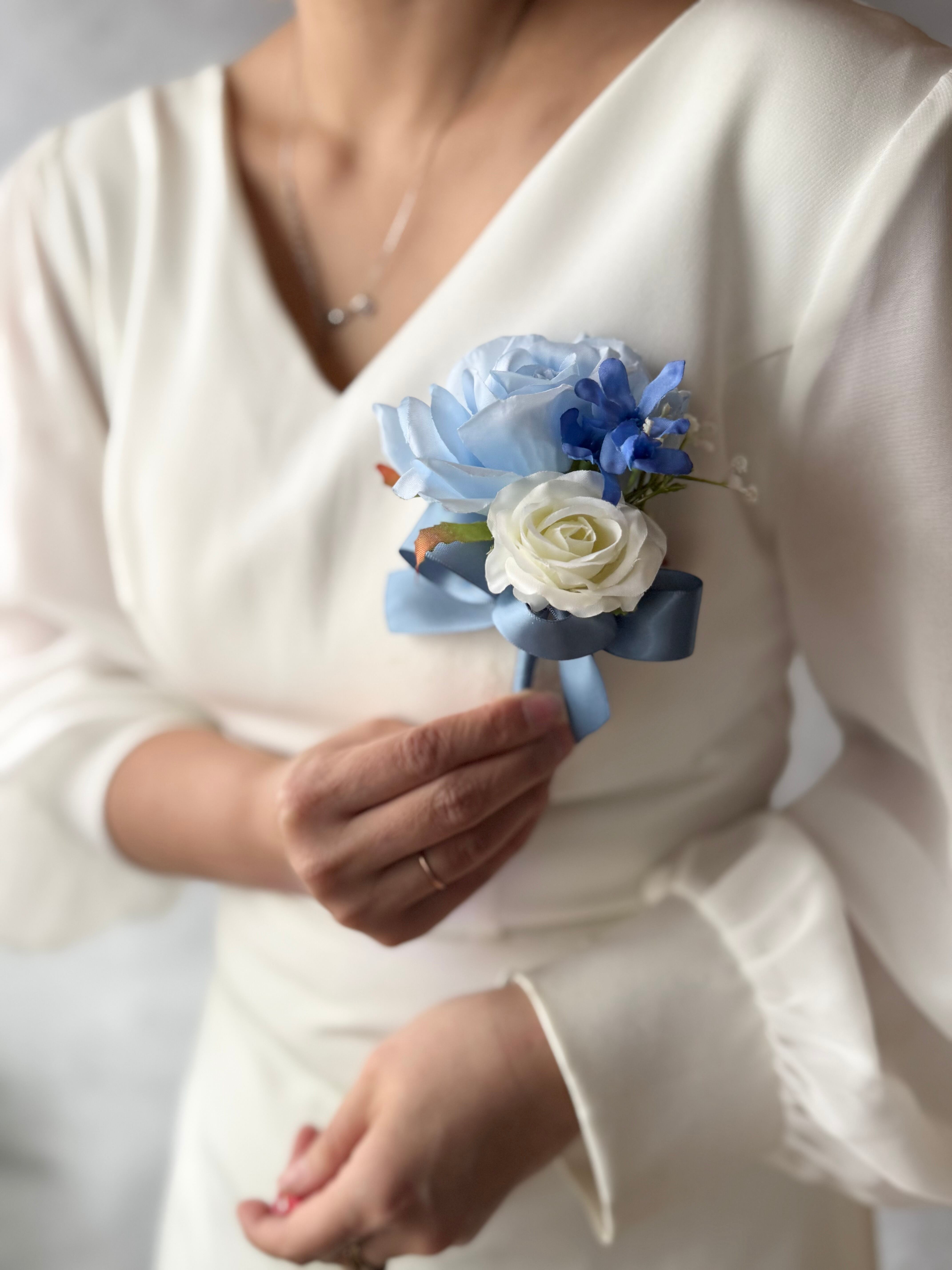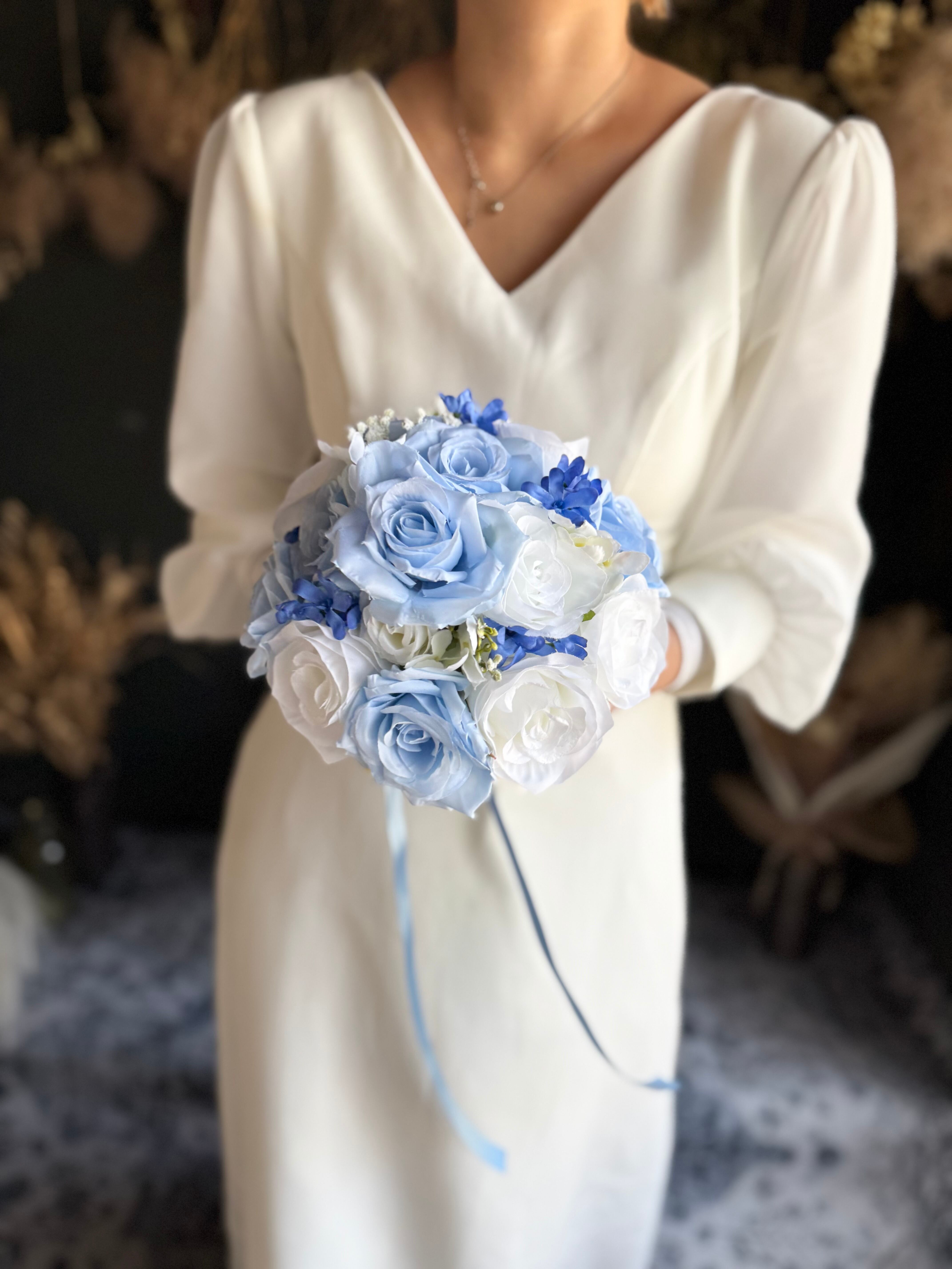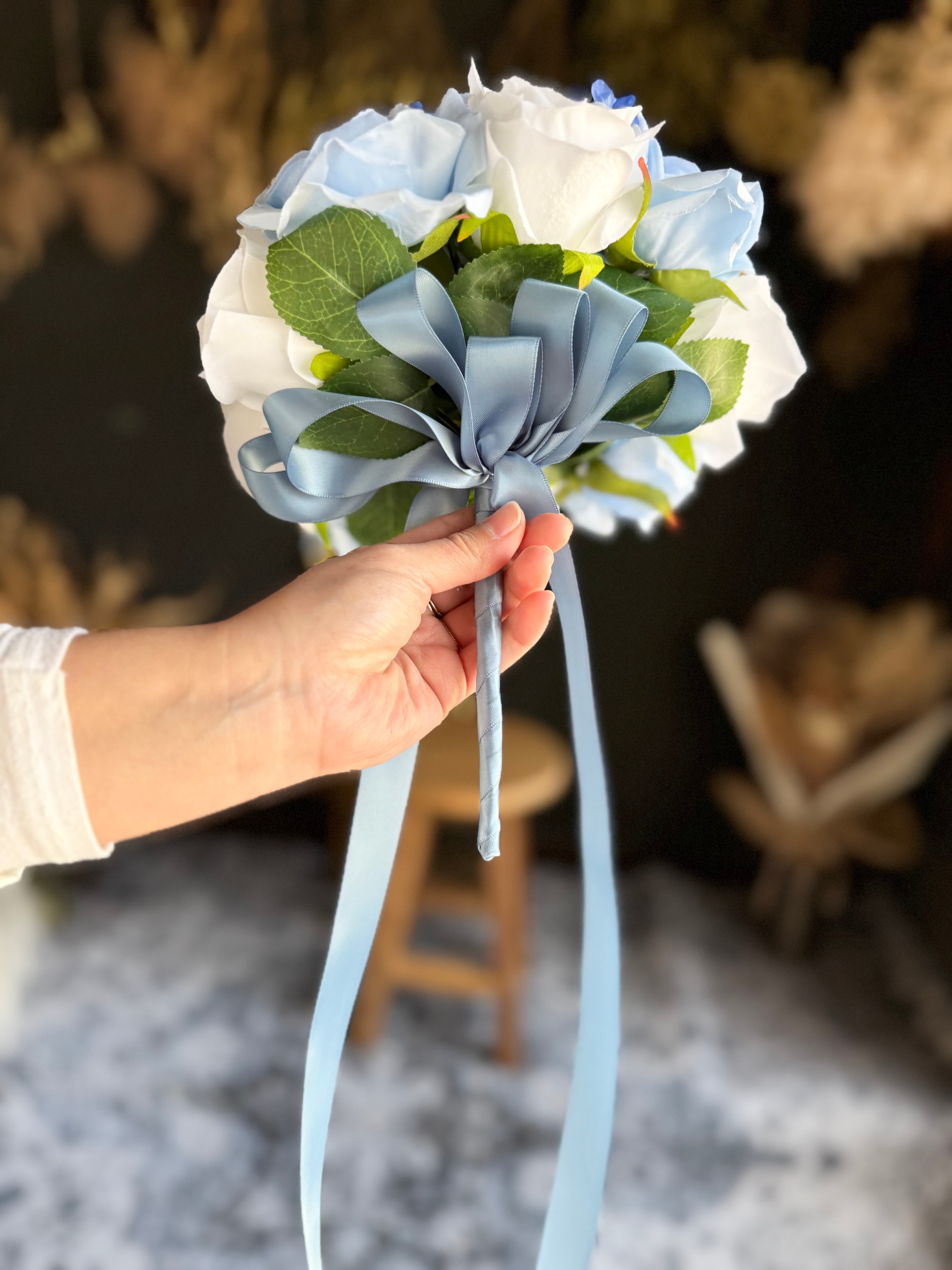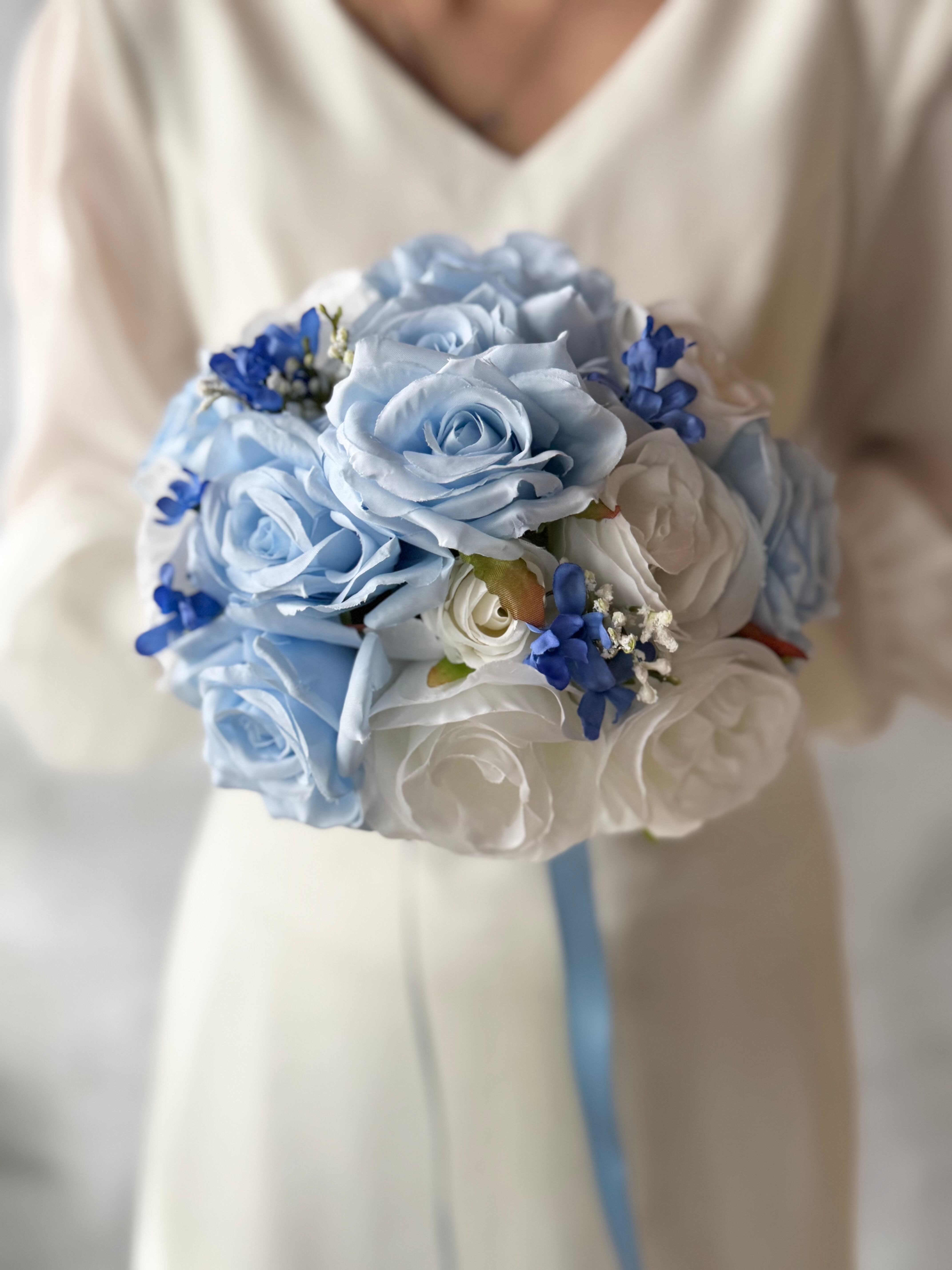 爽やかなブルー濃淡の色味が可愛らしいラウンドブーケ•*・