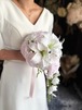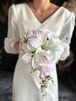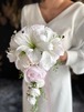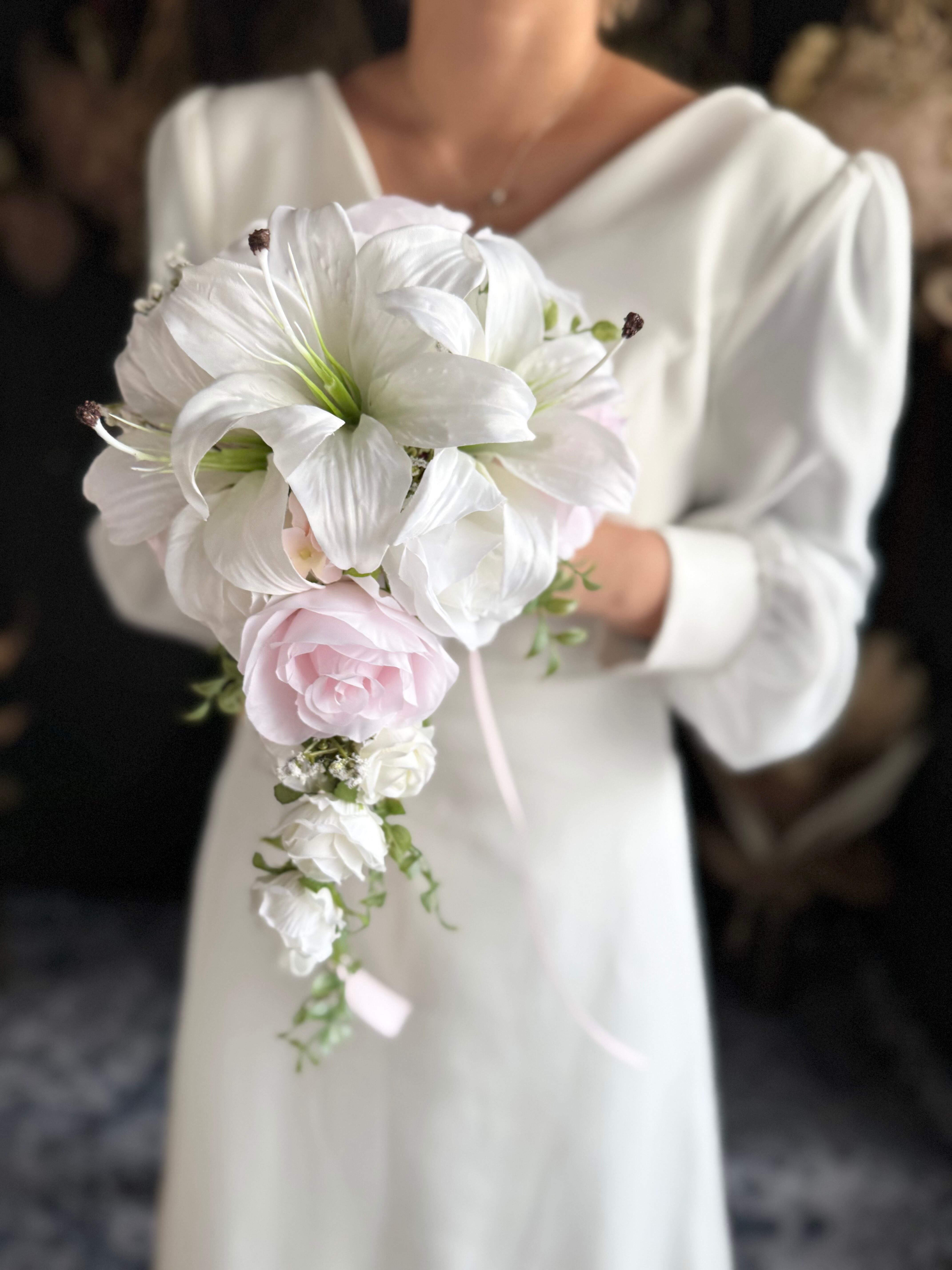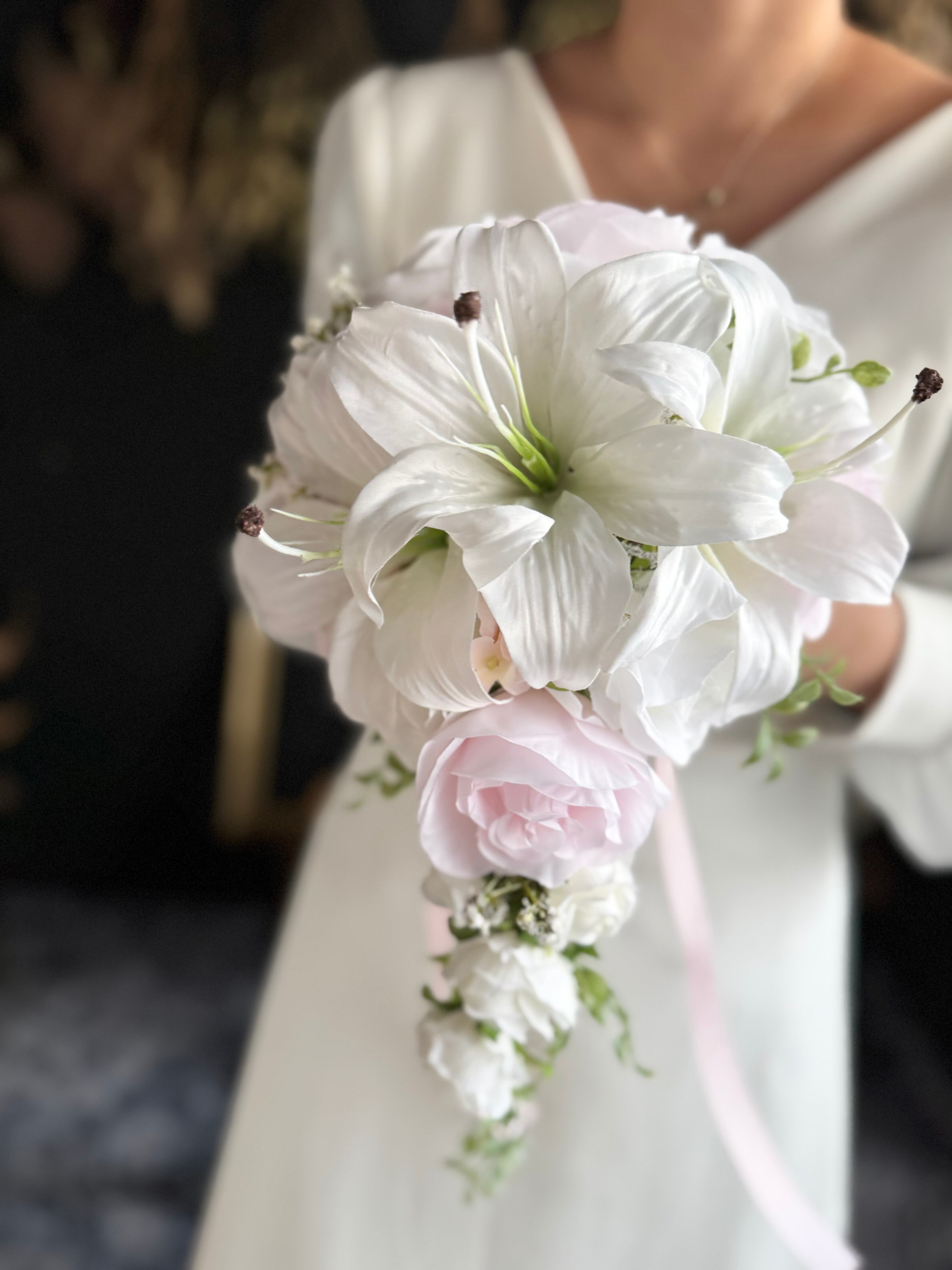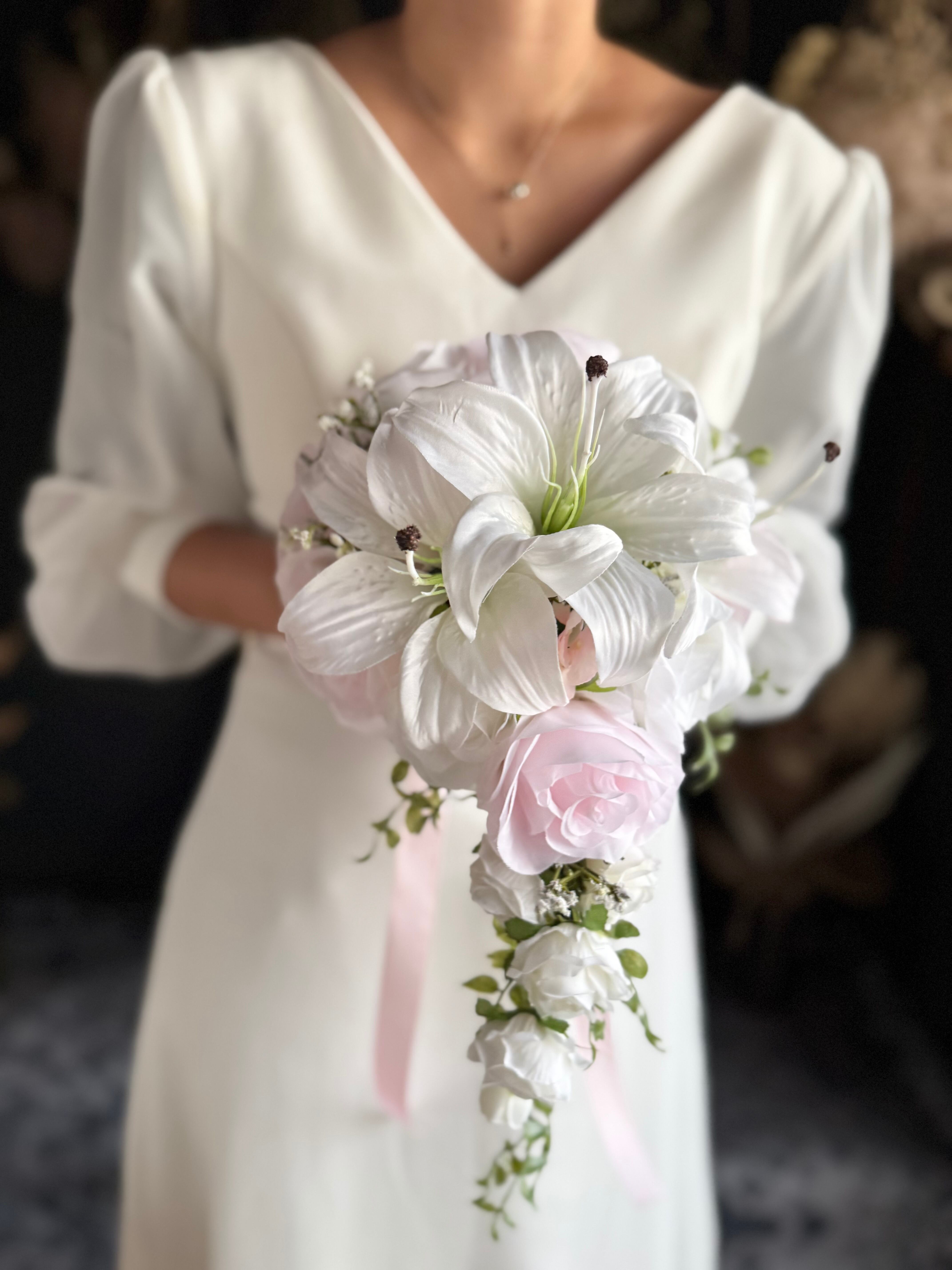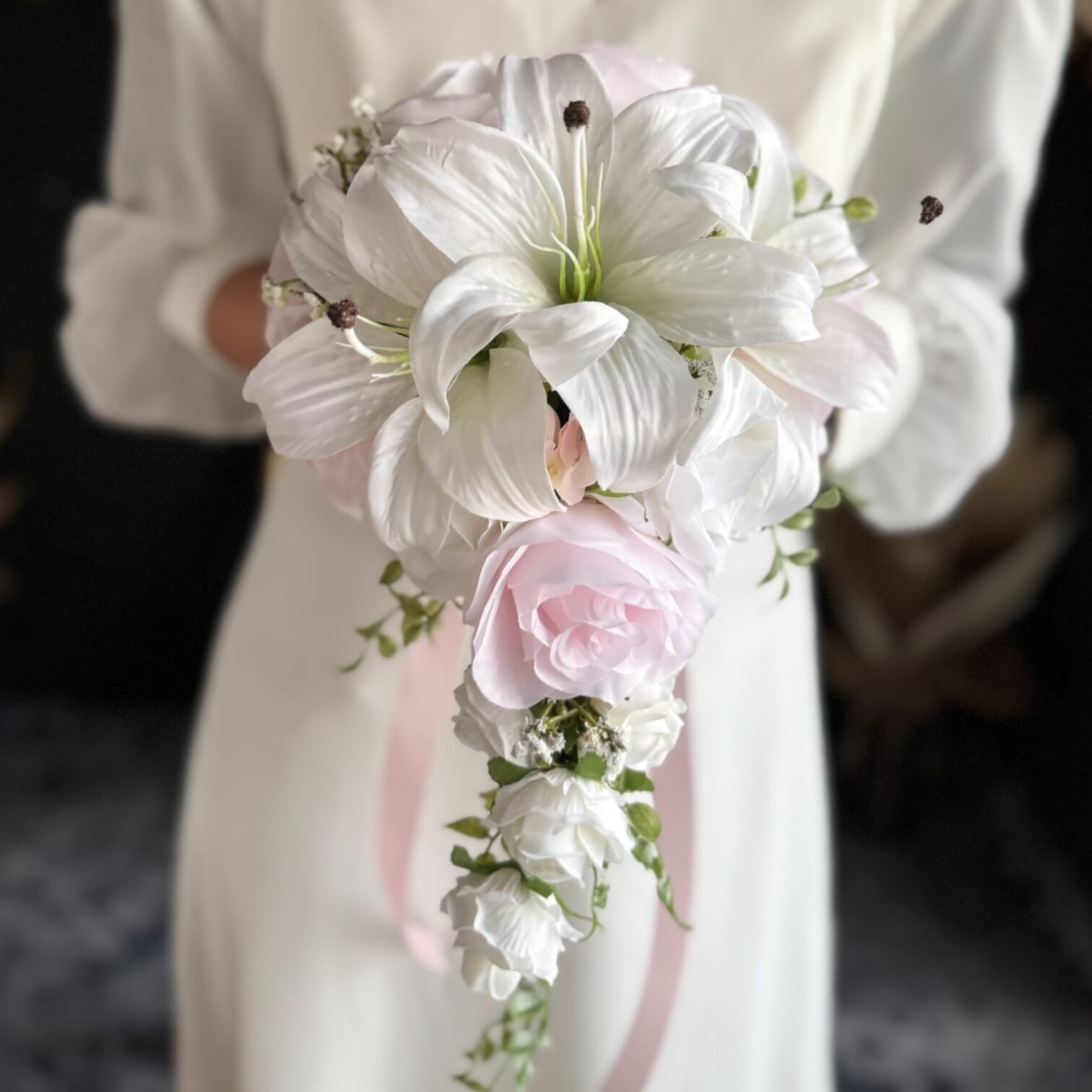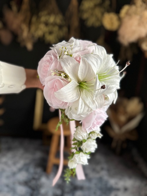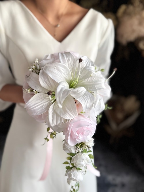 ウェディングブーケ王道デザインのキャスケードブーケ•*・上品なカサブランカとバラを組み合わせ、長すぎず、どんなドレスでも合わせやすいデザインアクセントでピンクを入れて可愛らしく