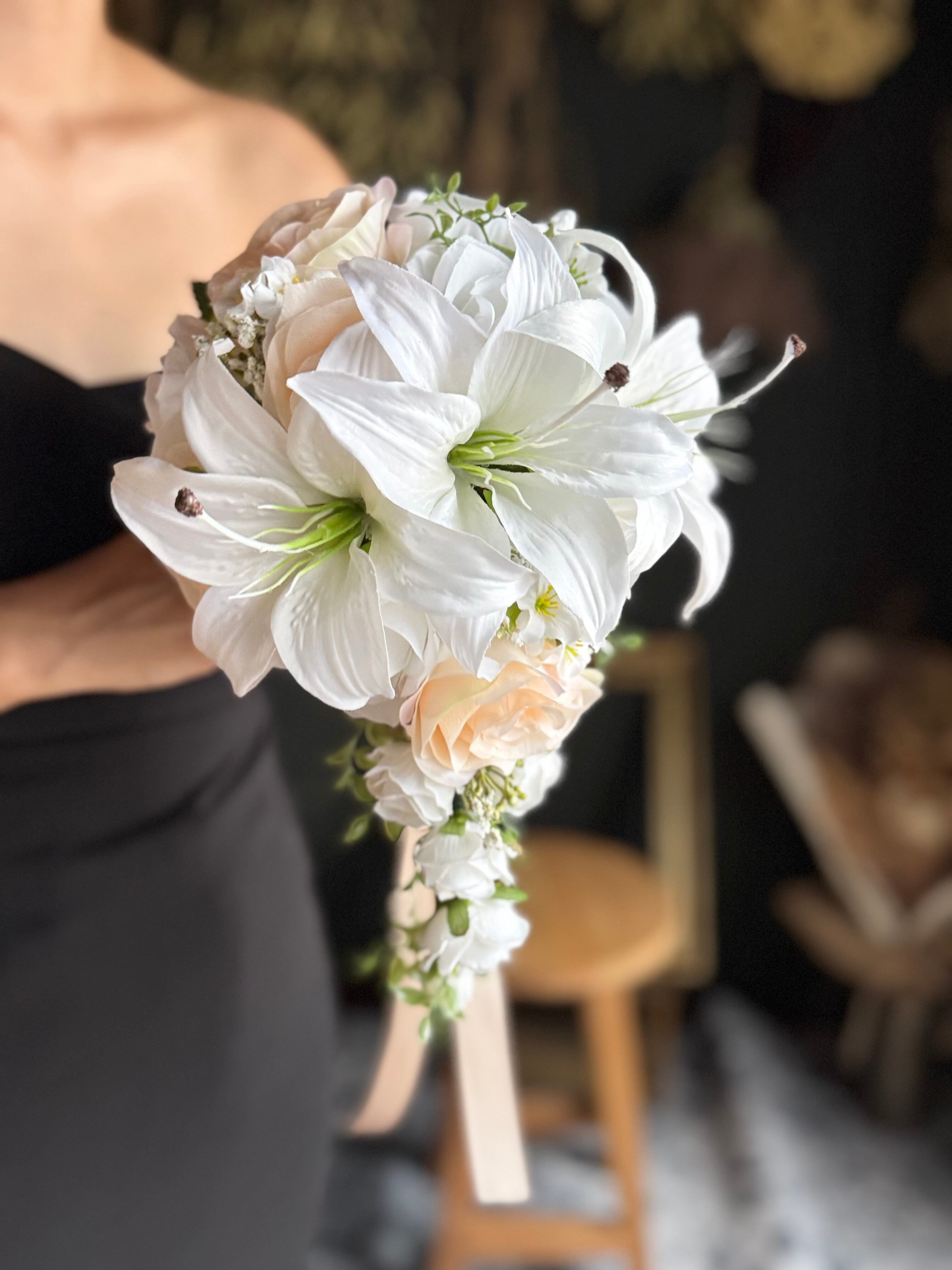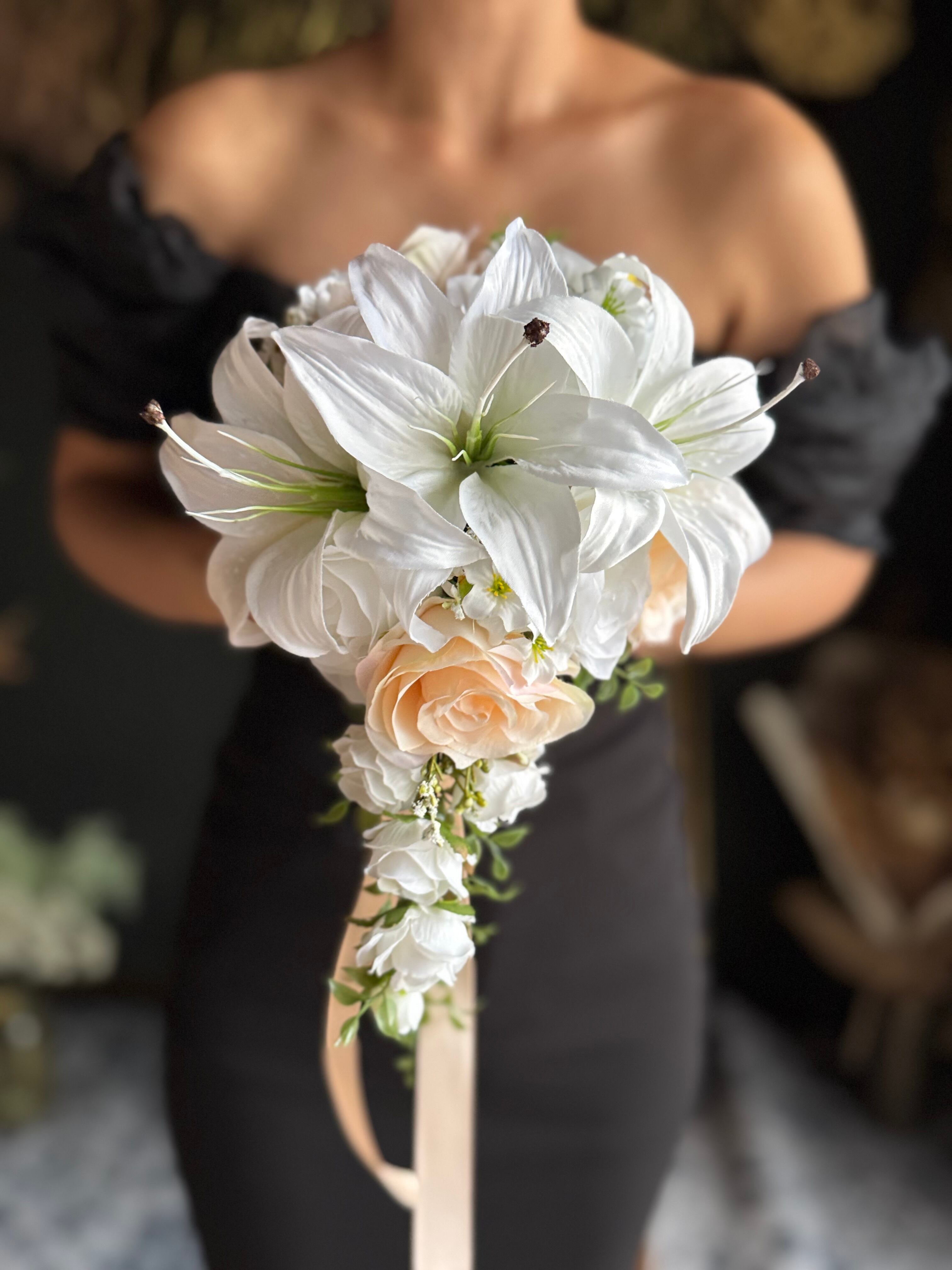 ウェディングブーケ王道デザインのキャスケードブーケ•*・上品なカサブランカとバラを組み合わせ、長すぎず、どんなドレスでも合わせやすいデザインアクセントでサーモンピンク、淡いオレンジを入れて可愛らしく