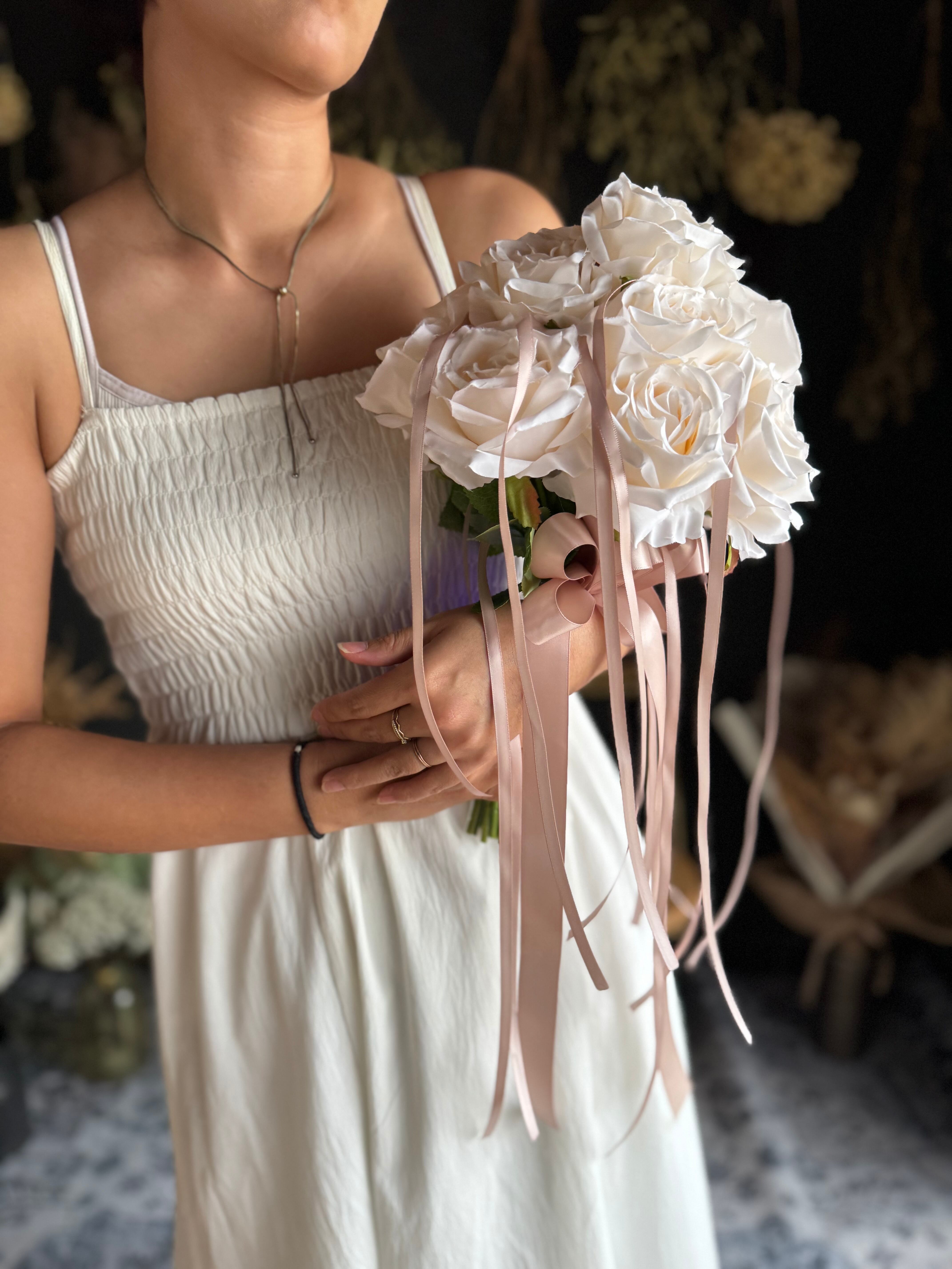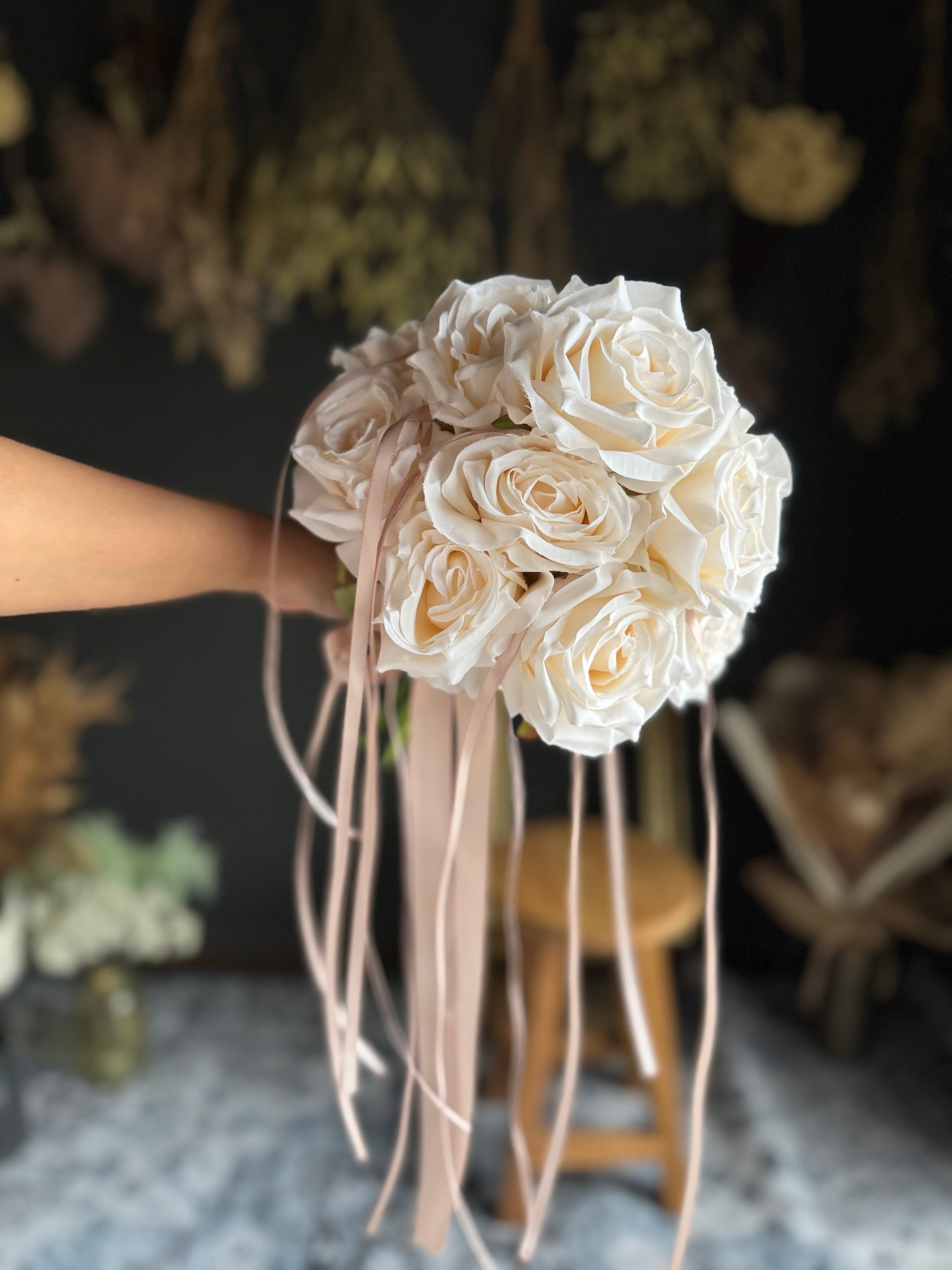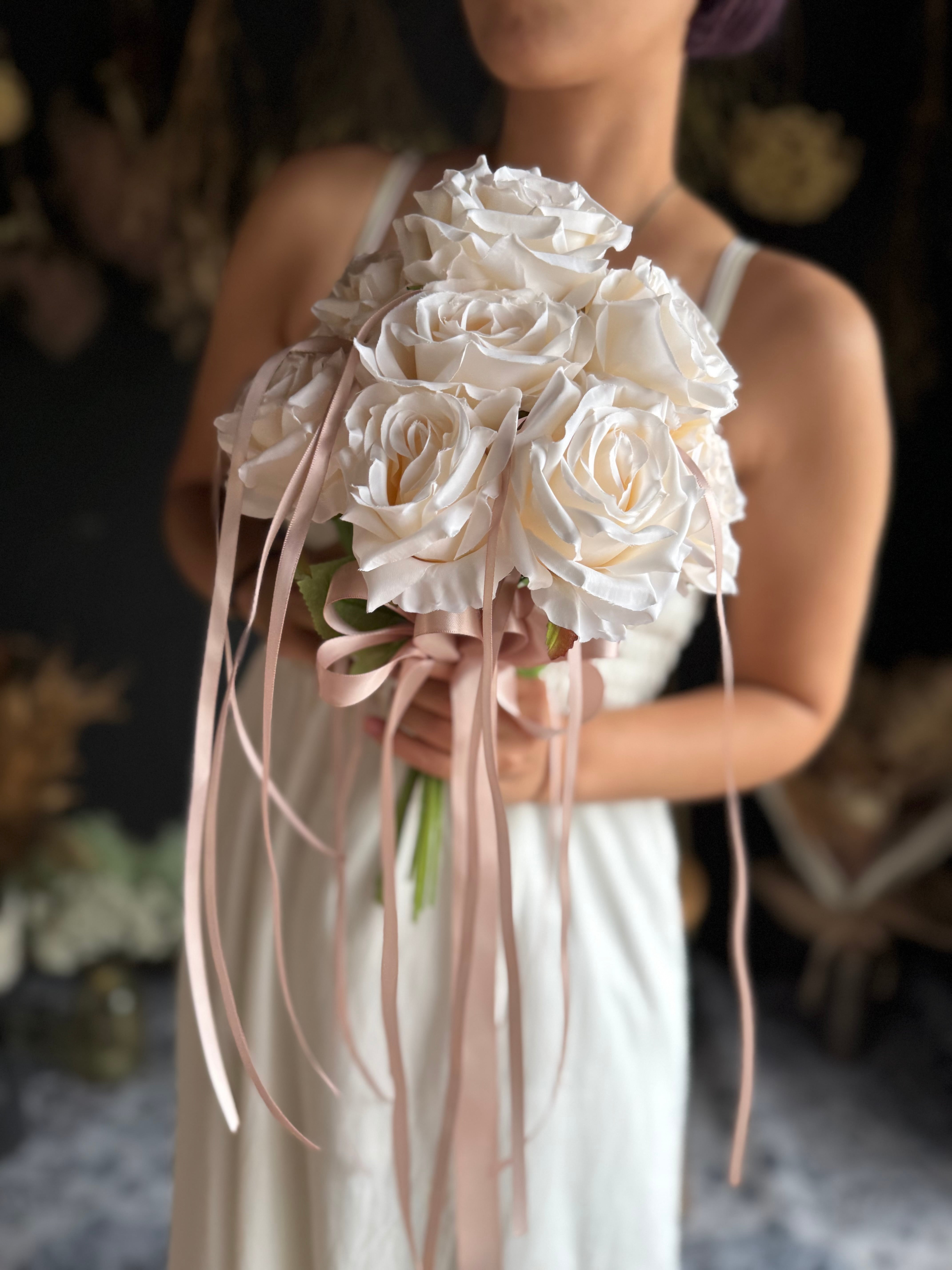 アイボリーのローズを贅沢に束ねた、シンプルかつ華やかなアレンジです。