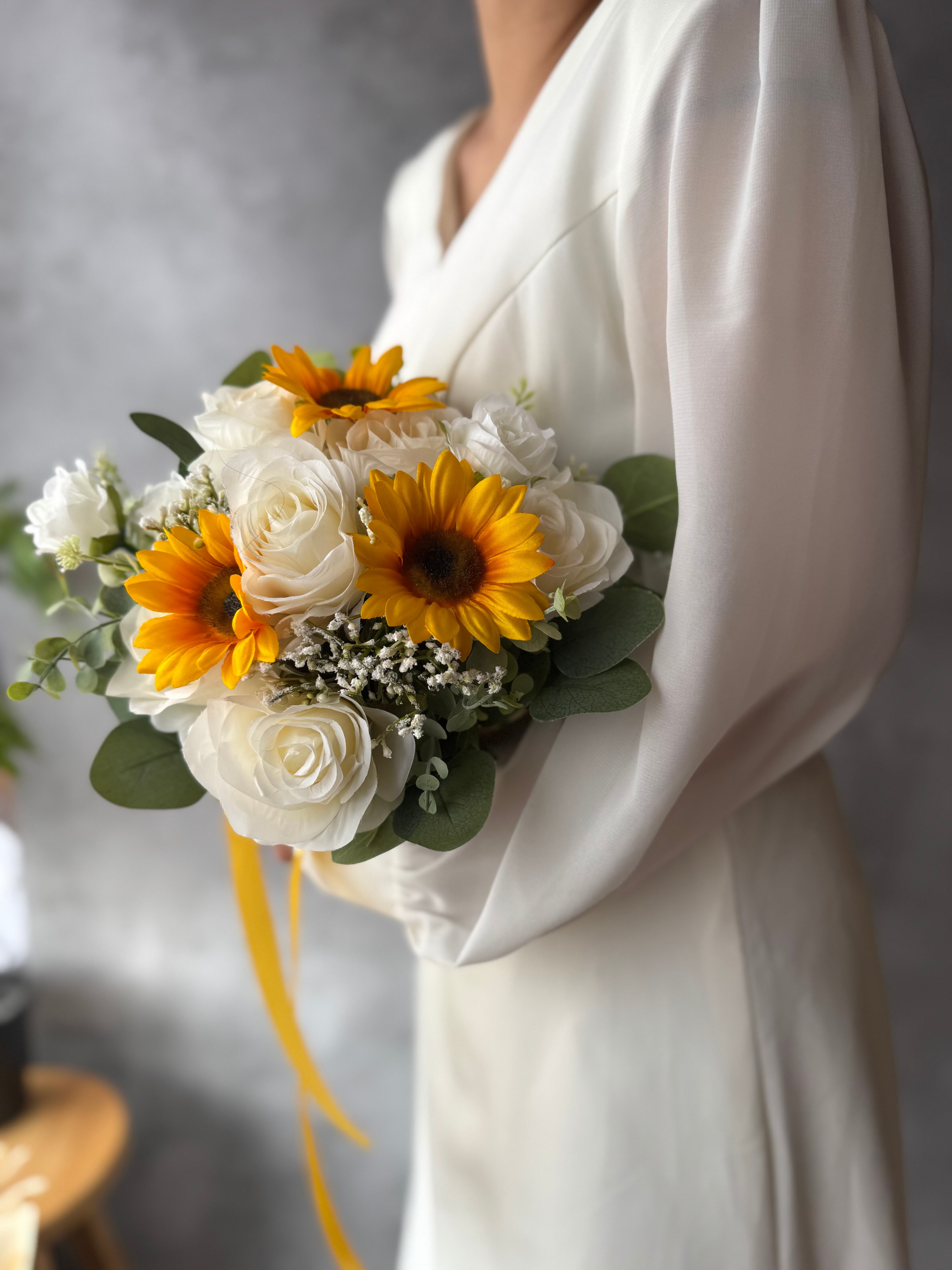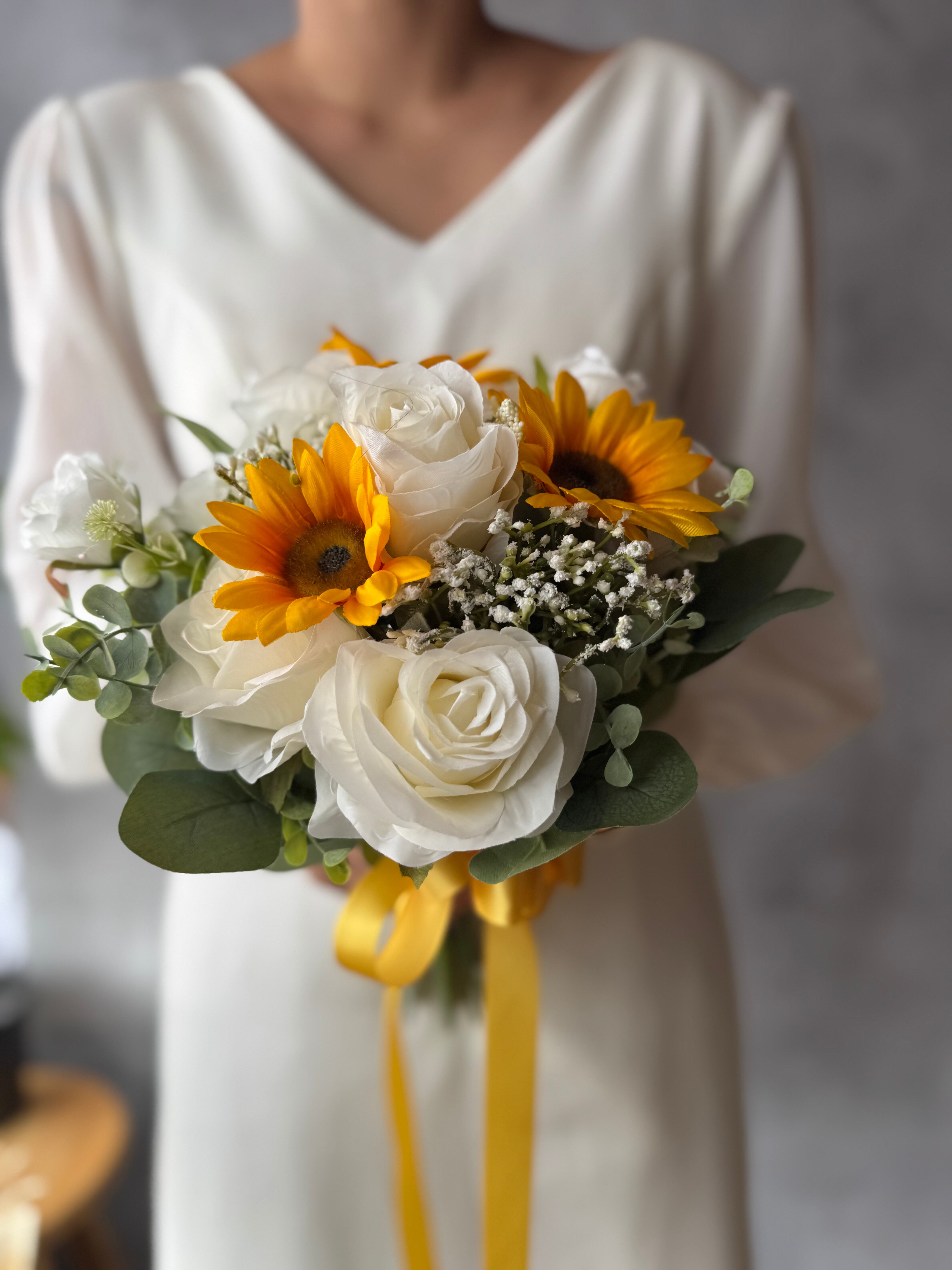 アイボリーのバラを中心に華やかなひまわりを組み合わせた爽やかなクラッチブーケ•*・ウェディングドレス用としても兼用ブーケとしても使いやすいデザイン•*・
