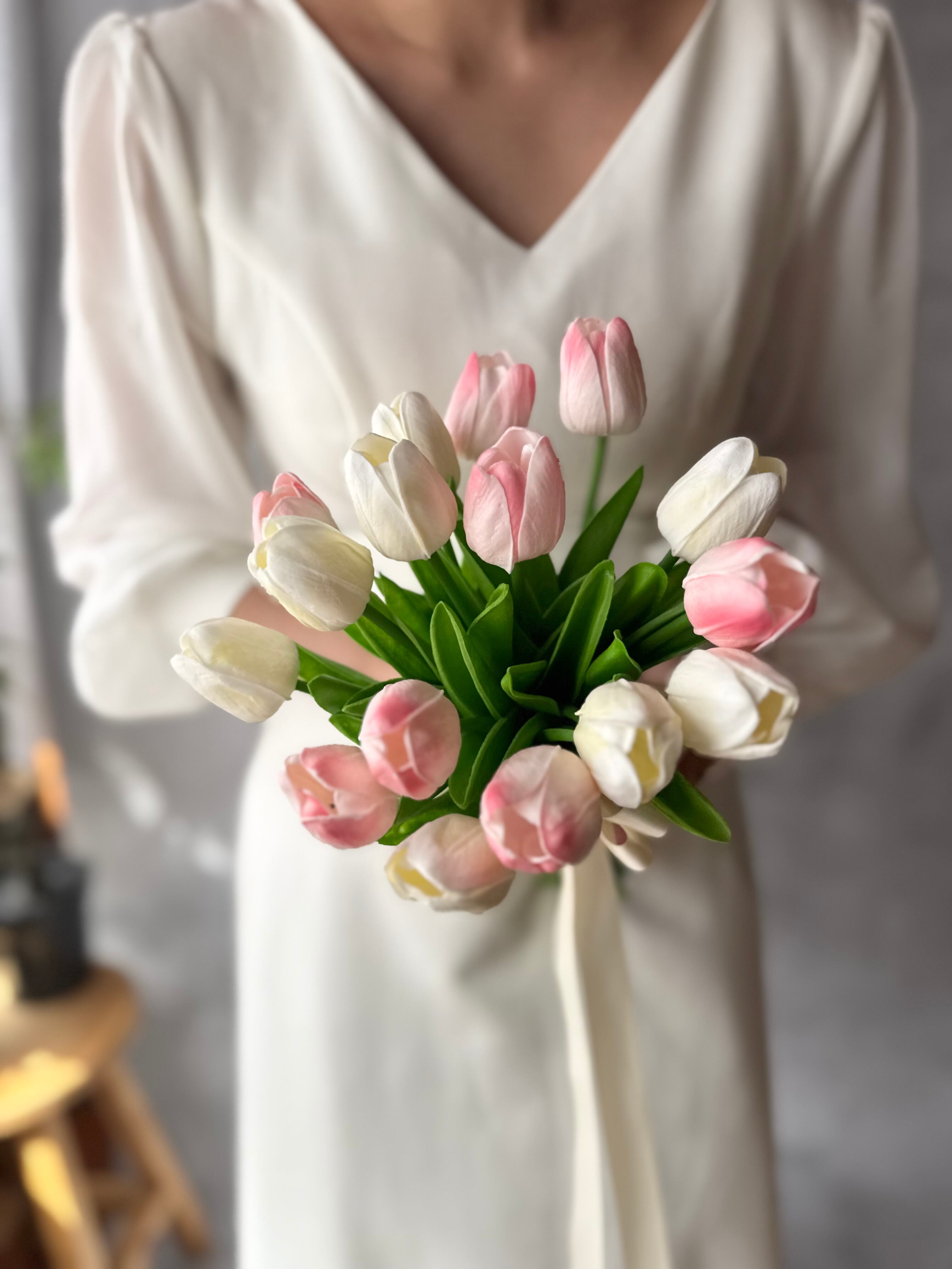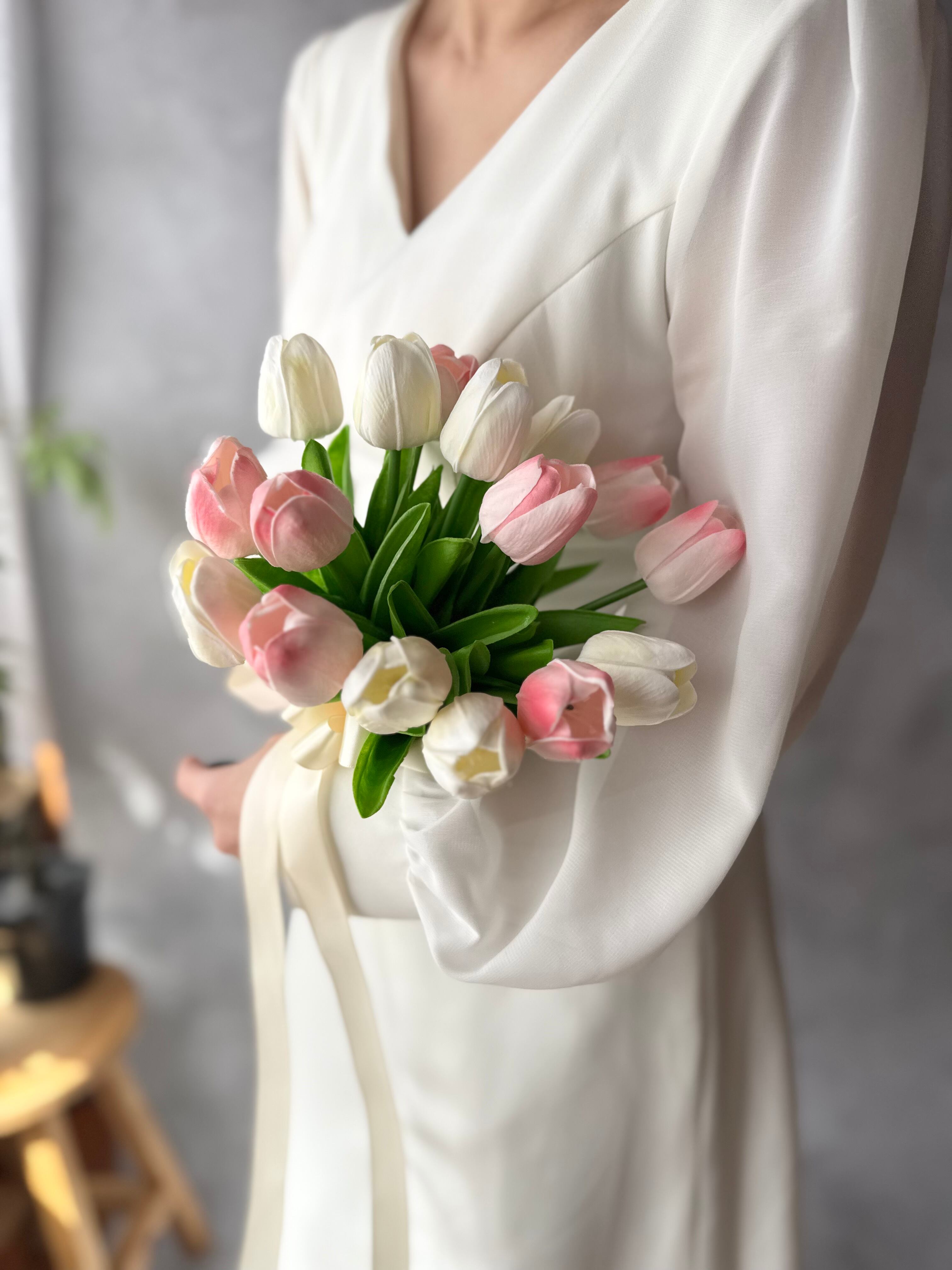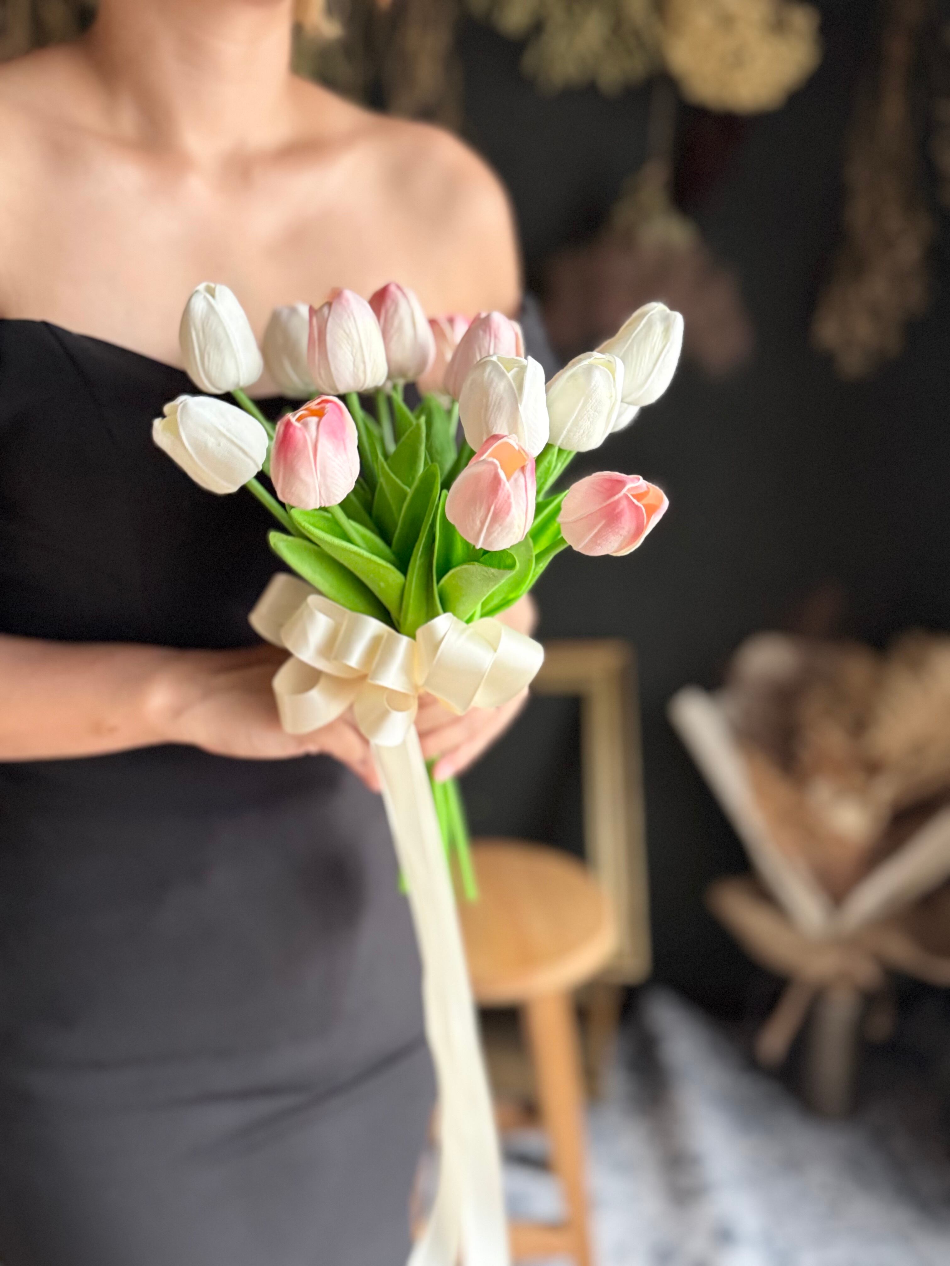 白とピンクのチューリップだけでお作りしたシンプルで可愛いクラッチブーケです♪