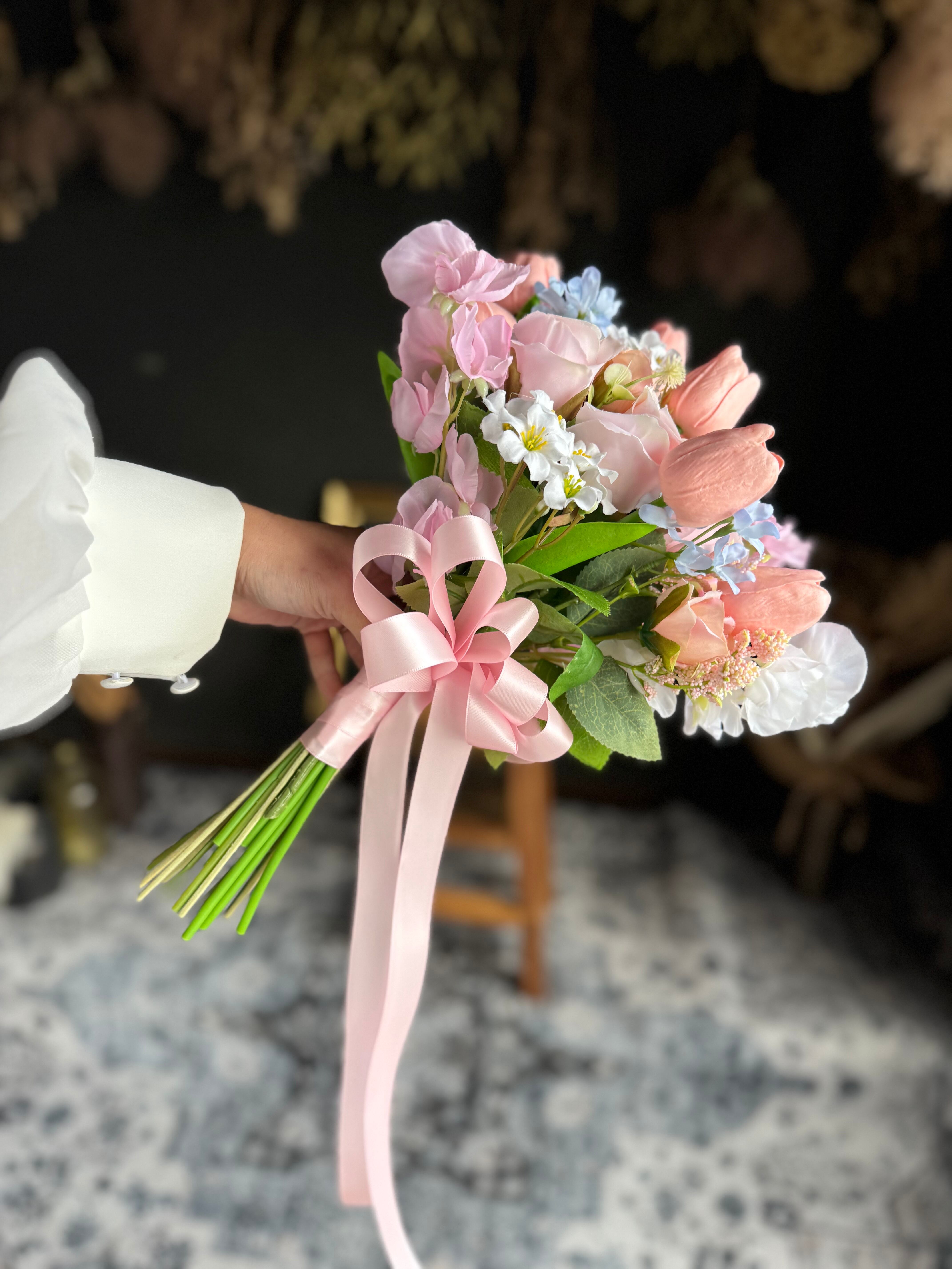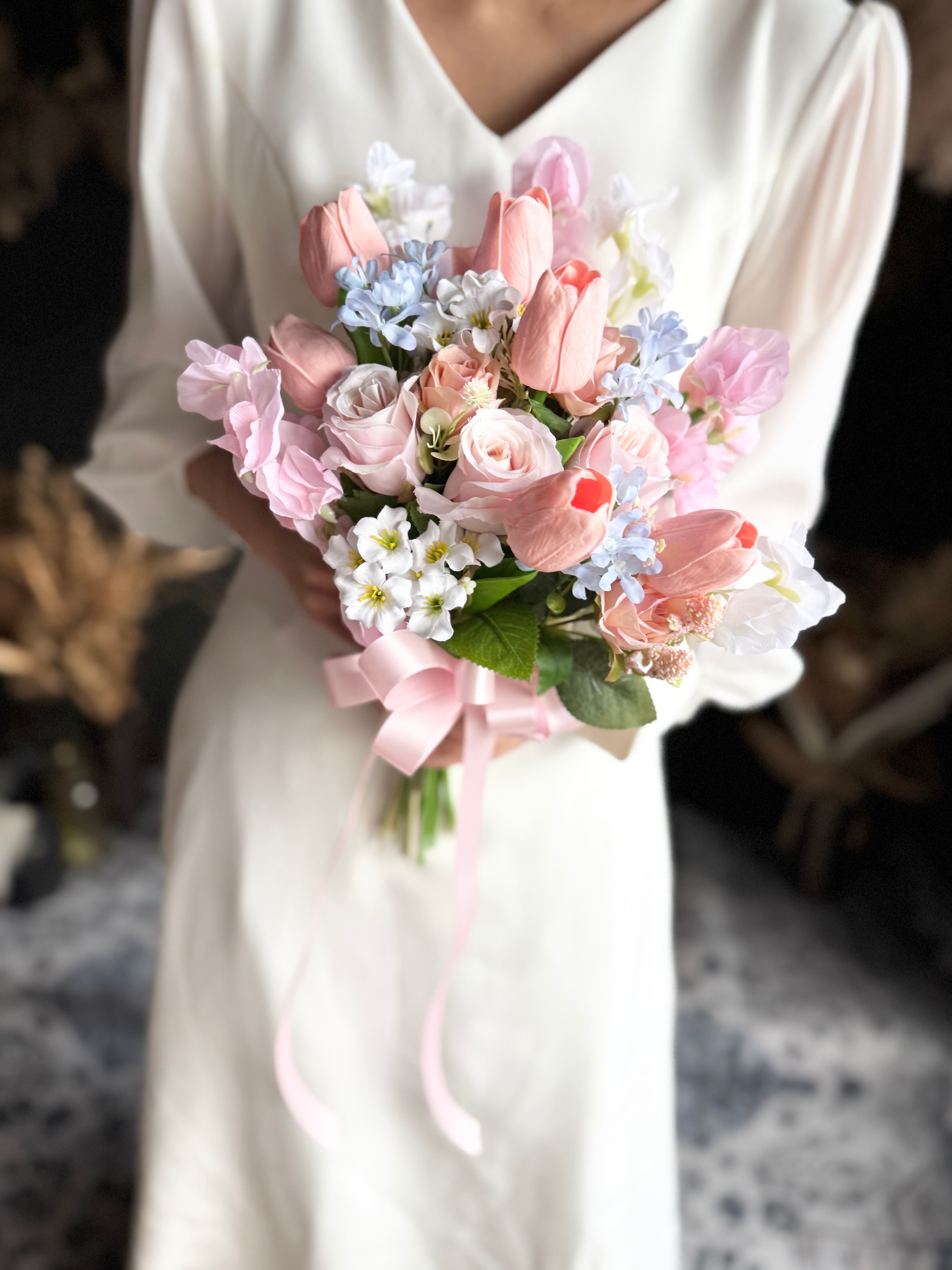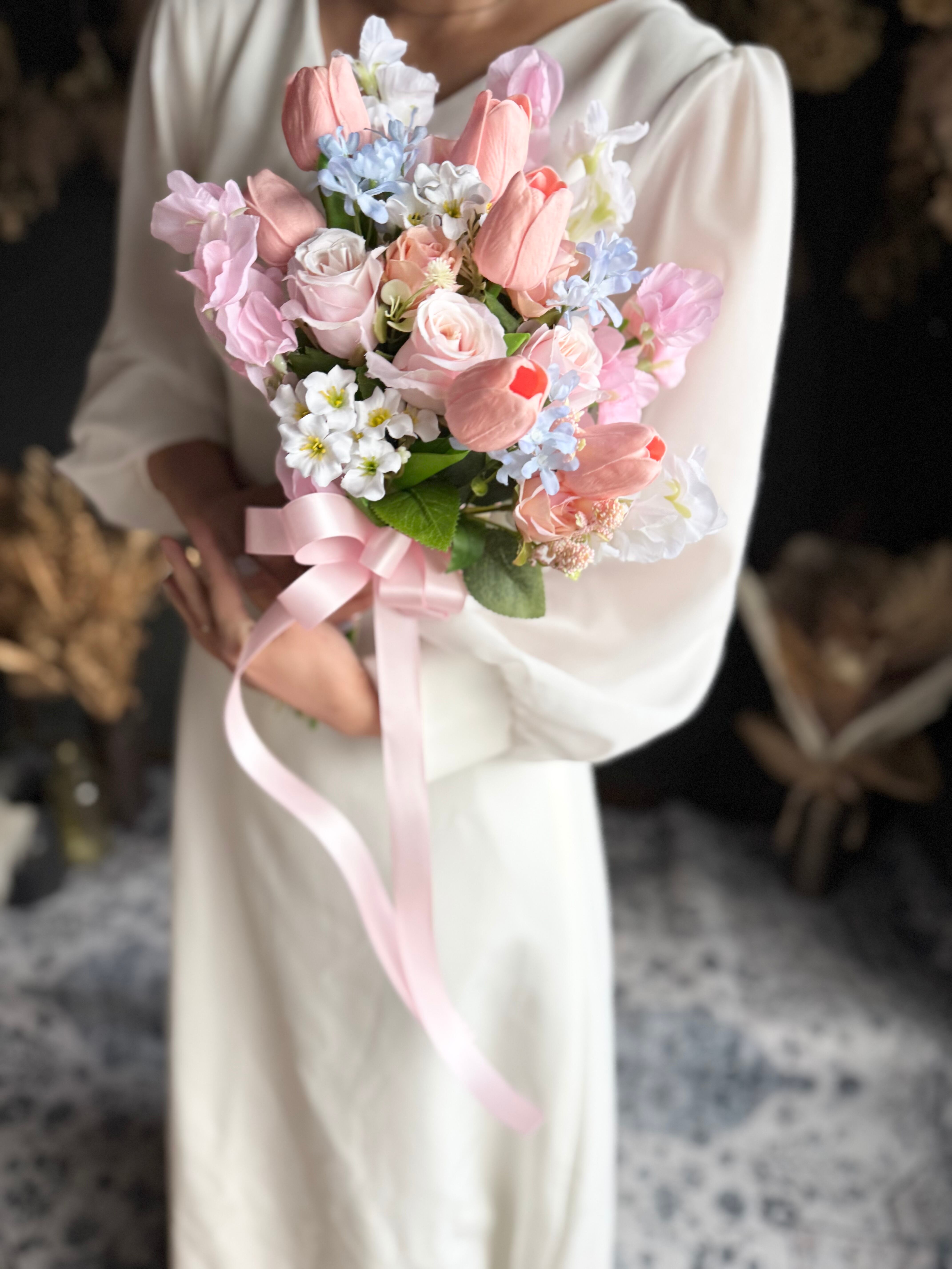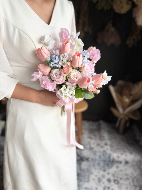 可愛いピンクチューリップにピンク濃淡の花々、水色のアクセントでお花畑のような華やかなブーケ•*・軽く持ちやすく、枯れる事のないアーティフィシャルフラワーのブーケは人気でオススメです•*・