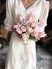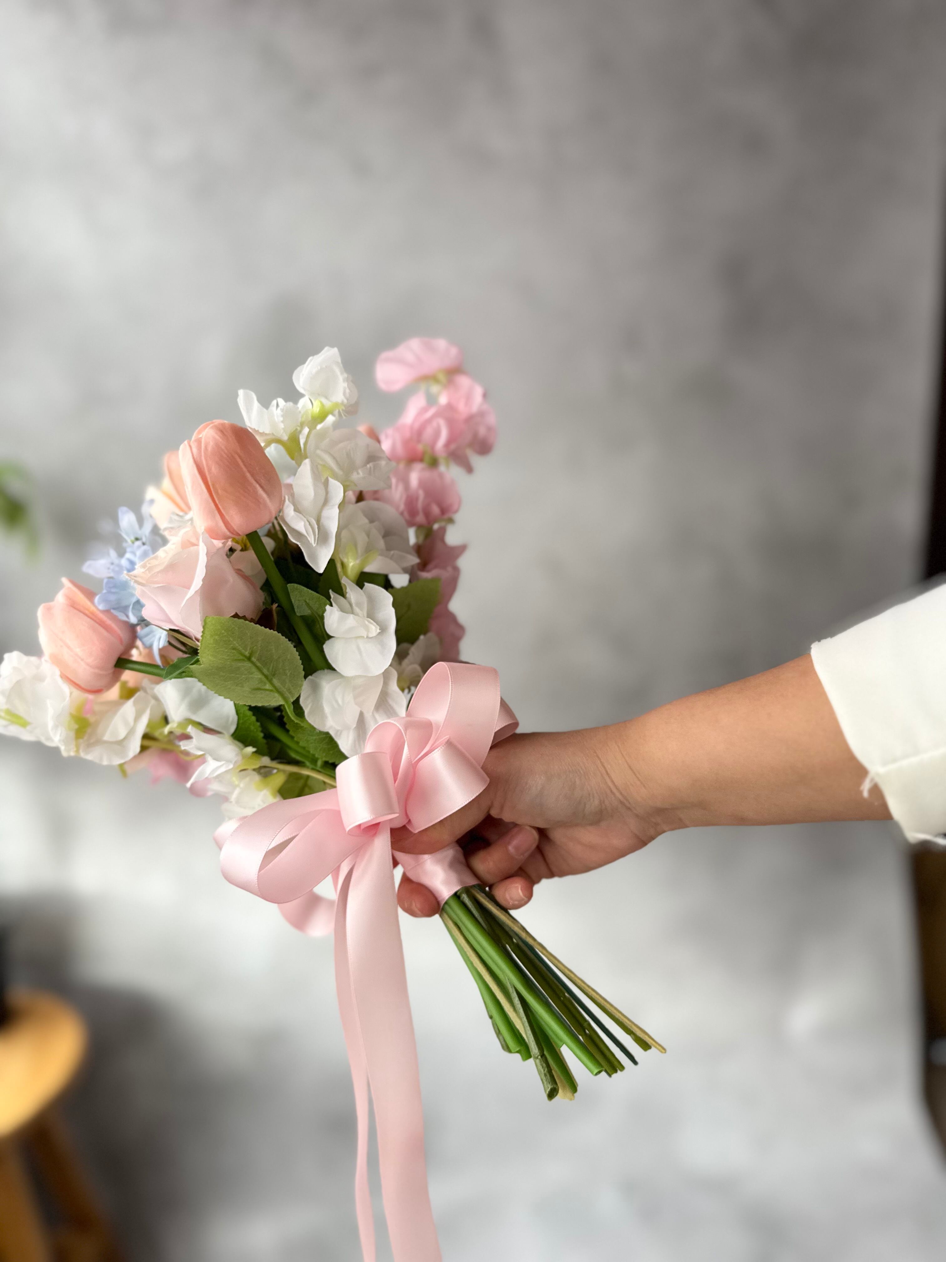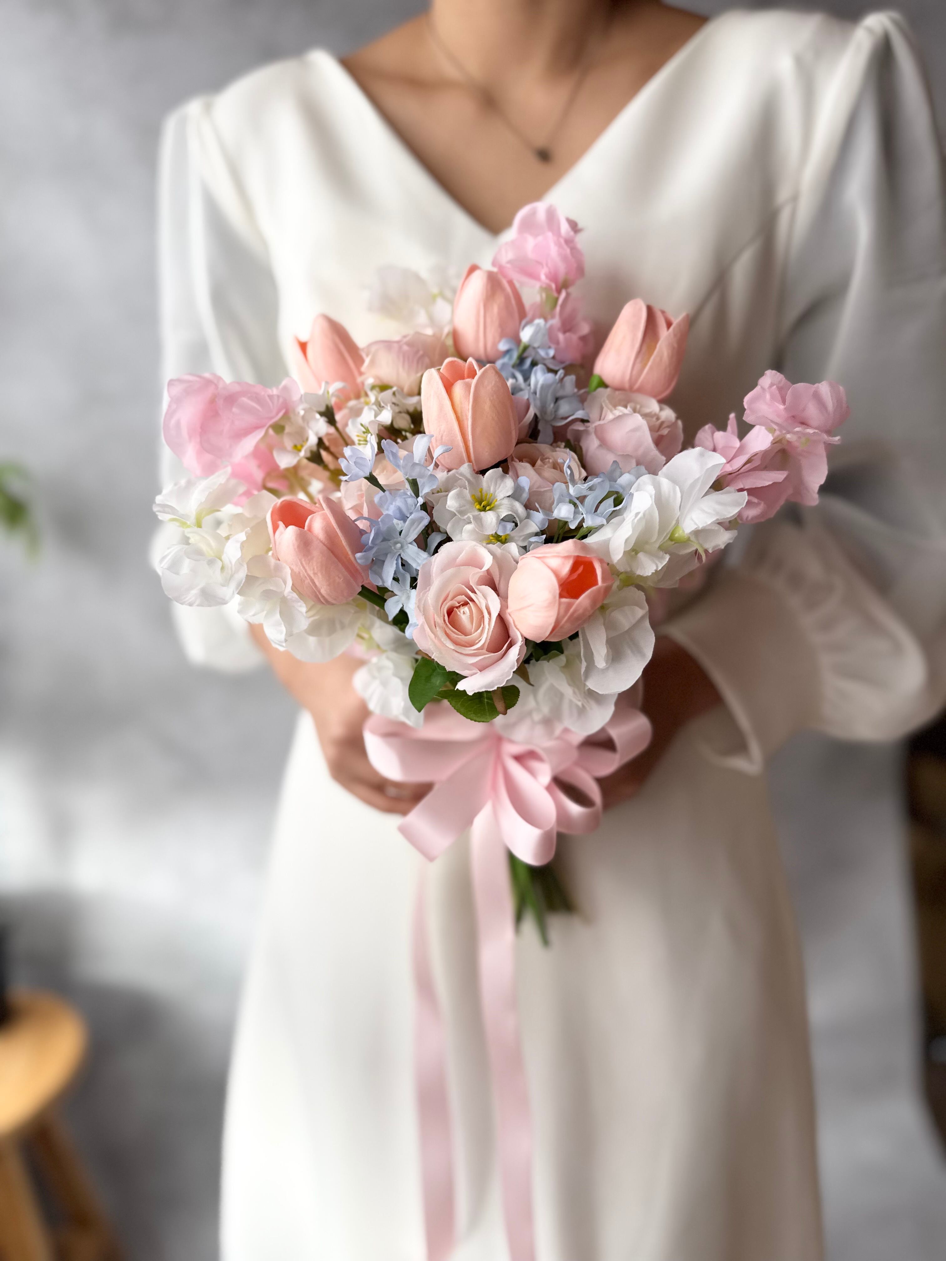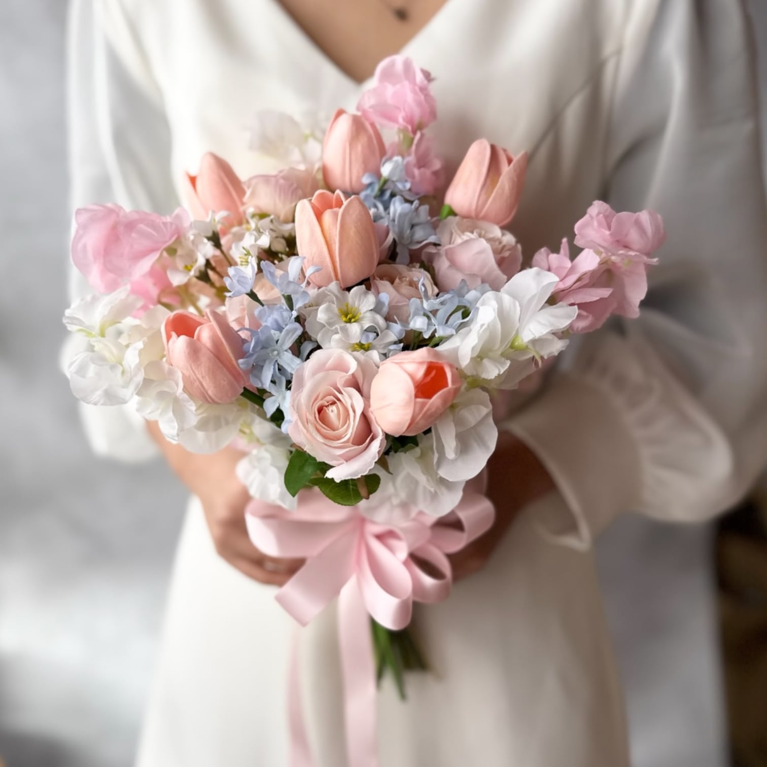 可愛いピンクチューリップにピンク濃淡の花々、水色のアクセントでお花畑のような華やかなブーケ•*・軽く持ちやすく、枯れる事のないアーティフィシャルフラワーのブーケは人気でオススメです•*・