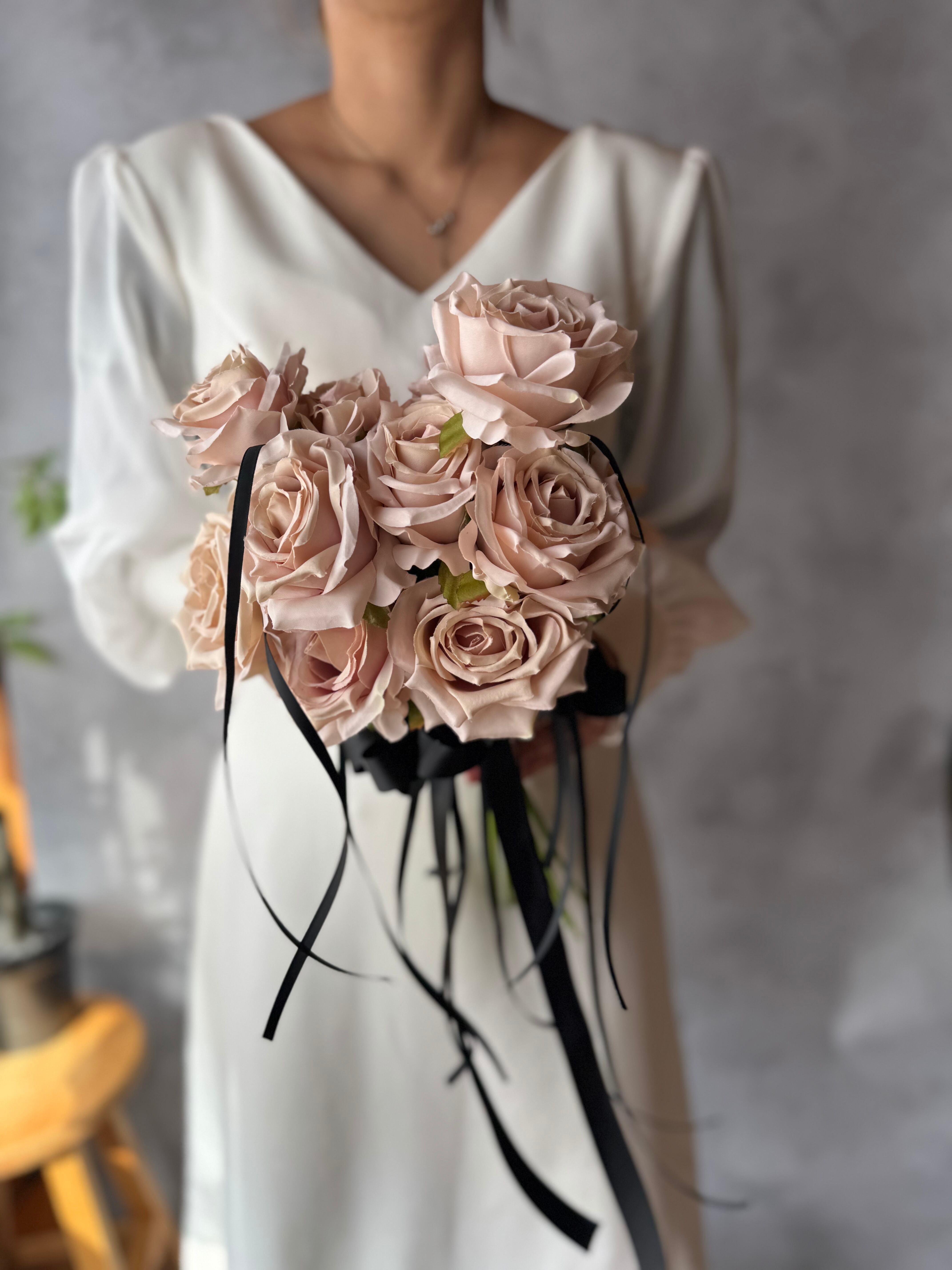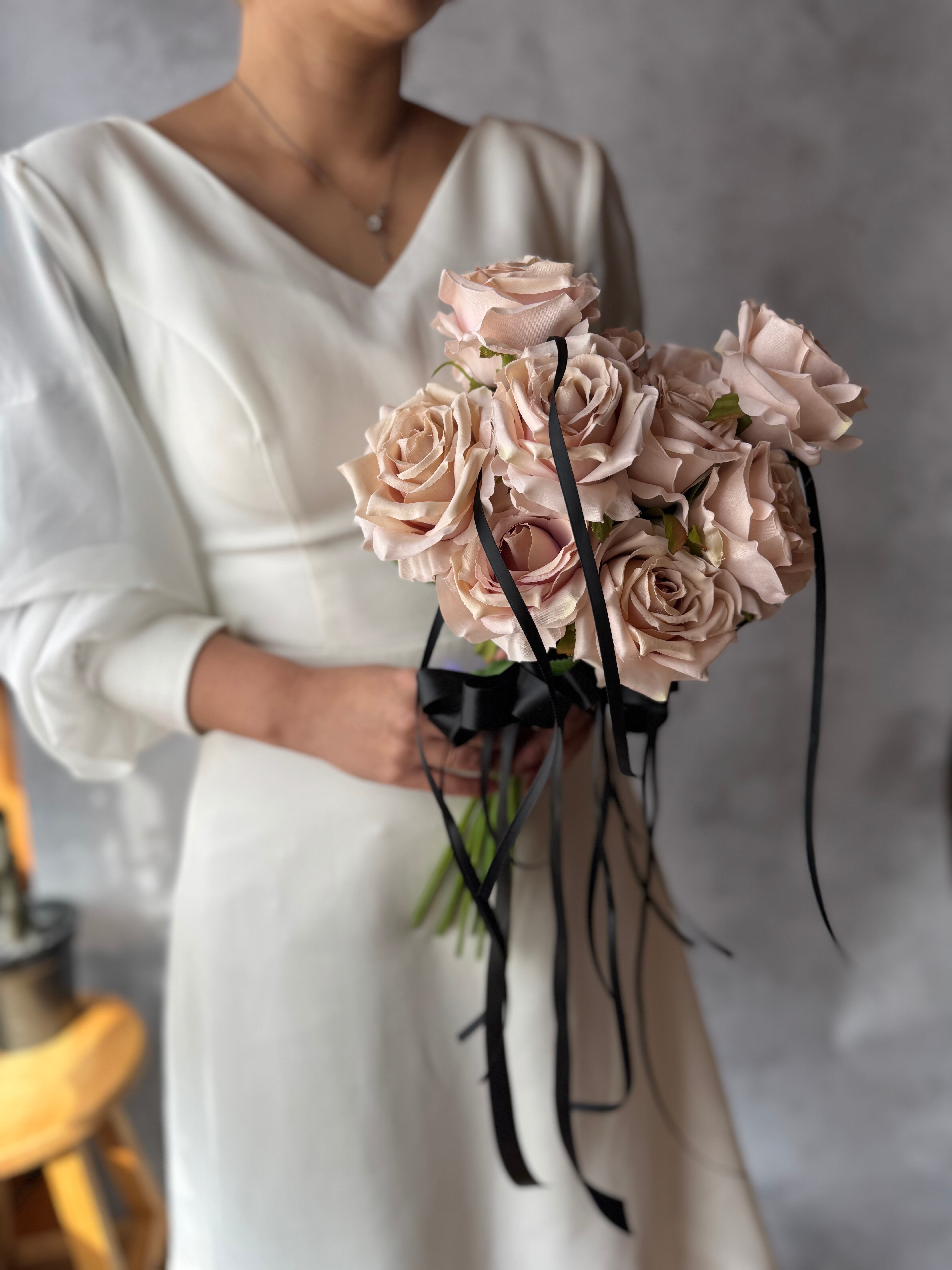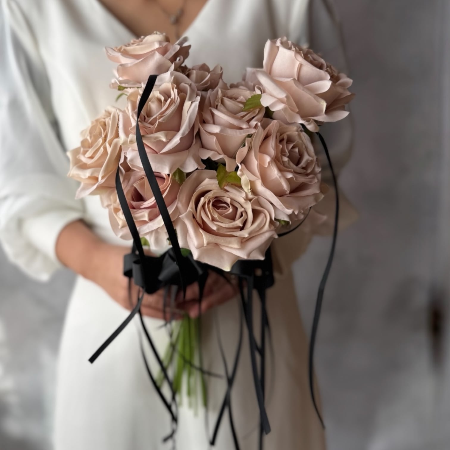 くすみピンクベージュのローズを贅沢に束ねた、シンプルかつ華やかなアレンジです。