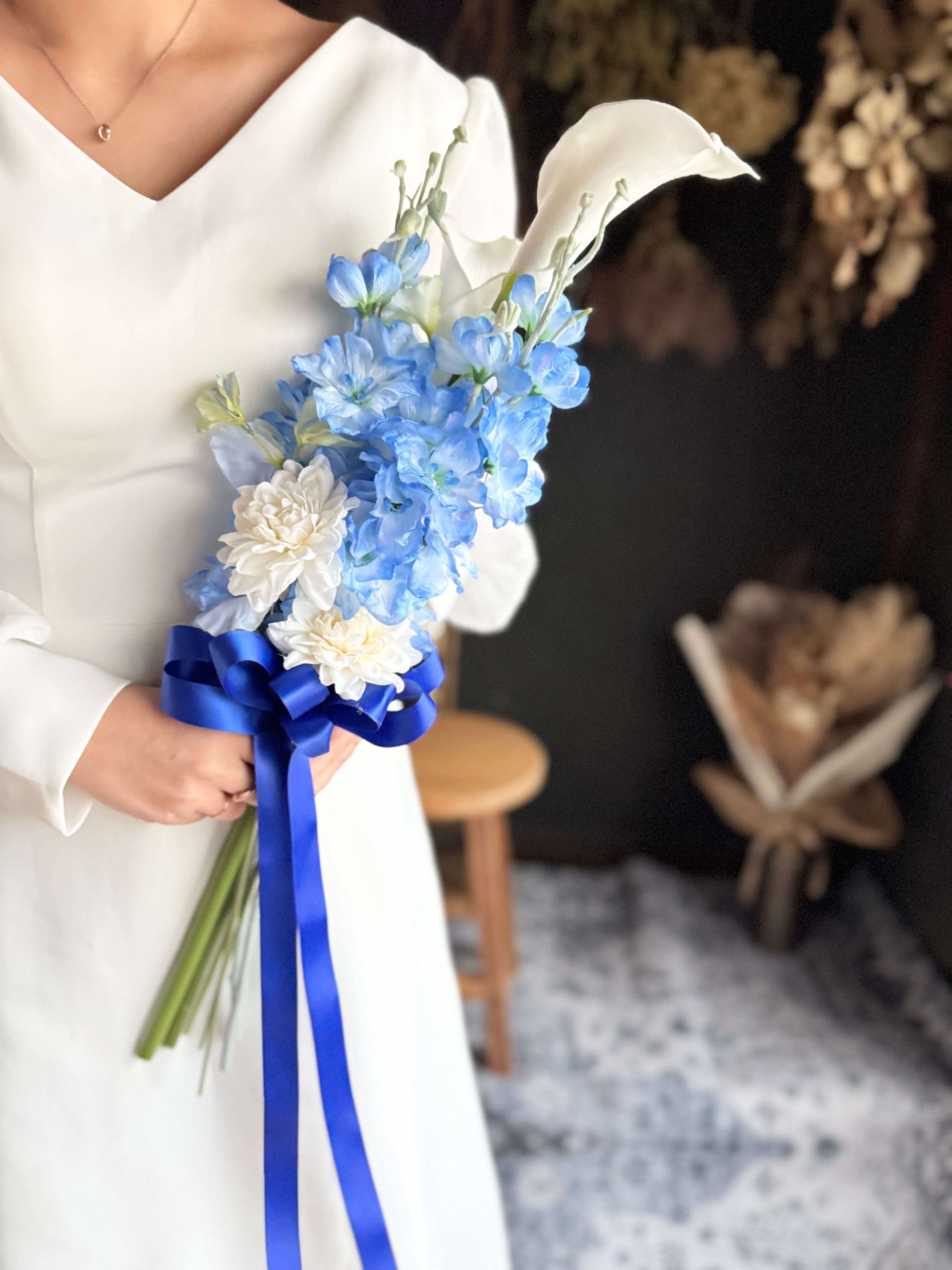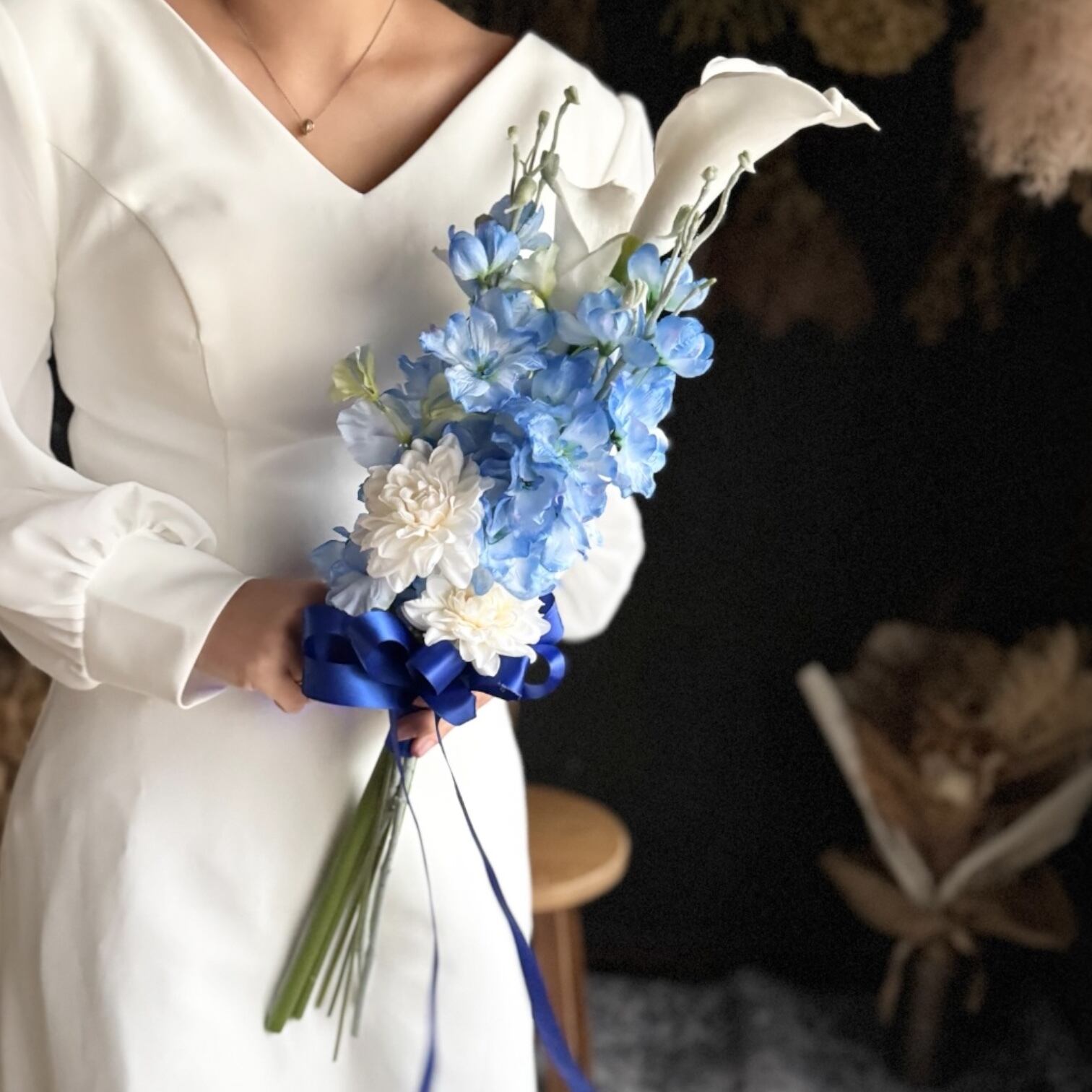 マーメイドラインのドレスや大人っぽいスタイリッシュなドレスにピッタリのブーケです•*・