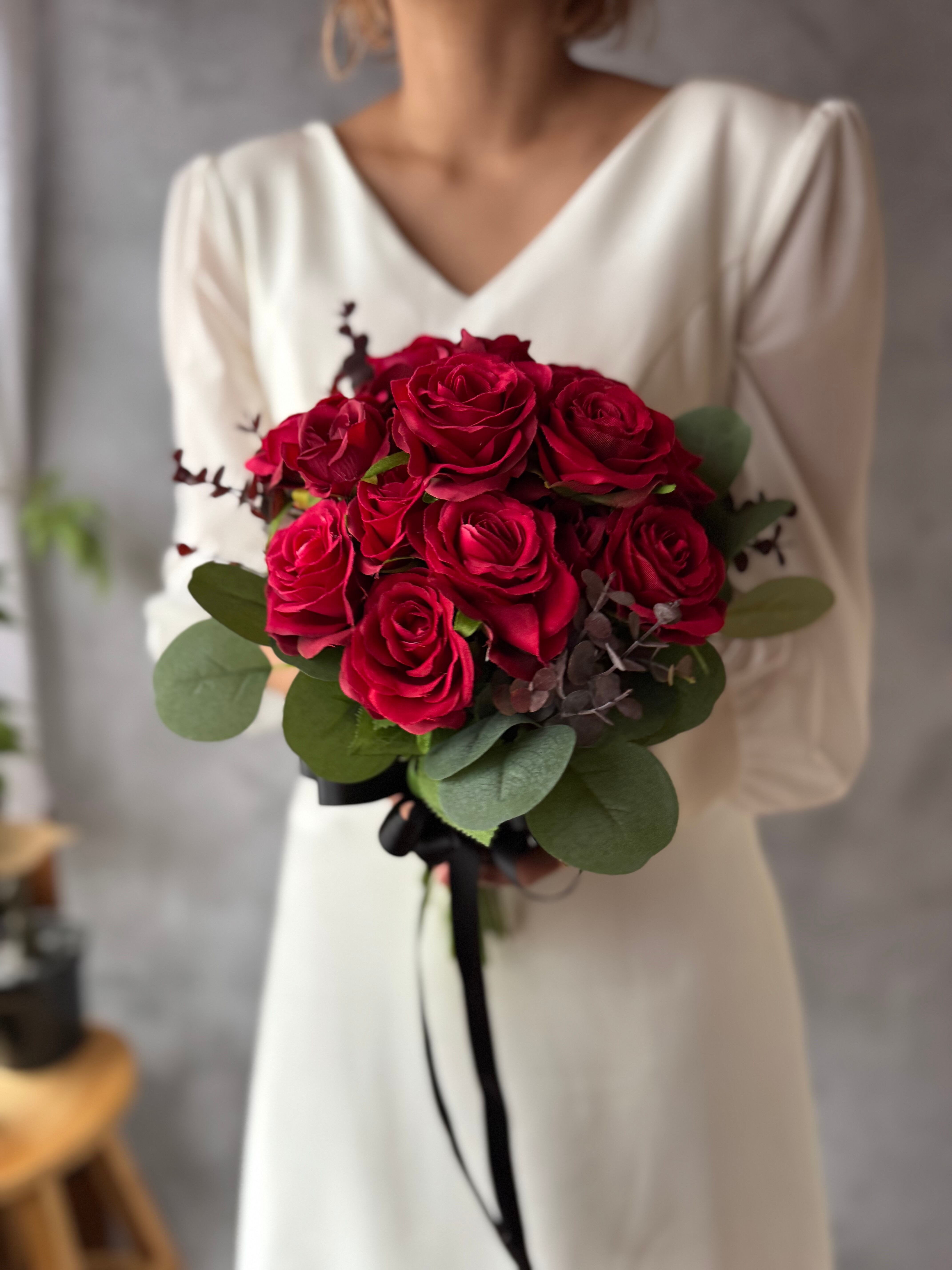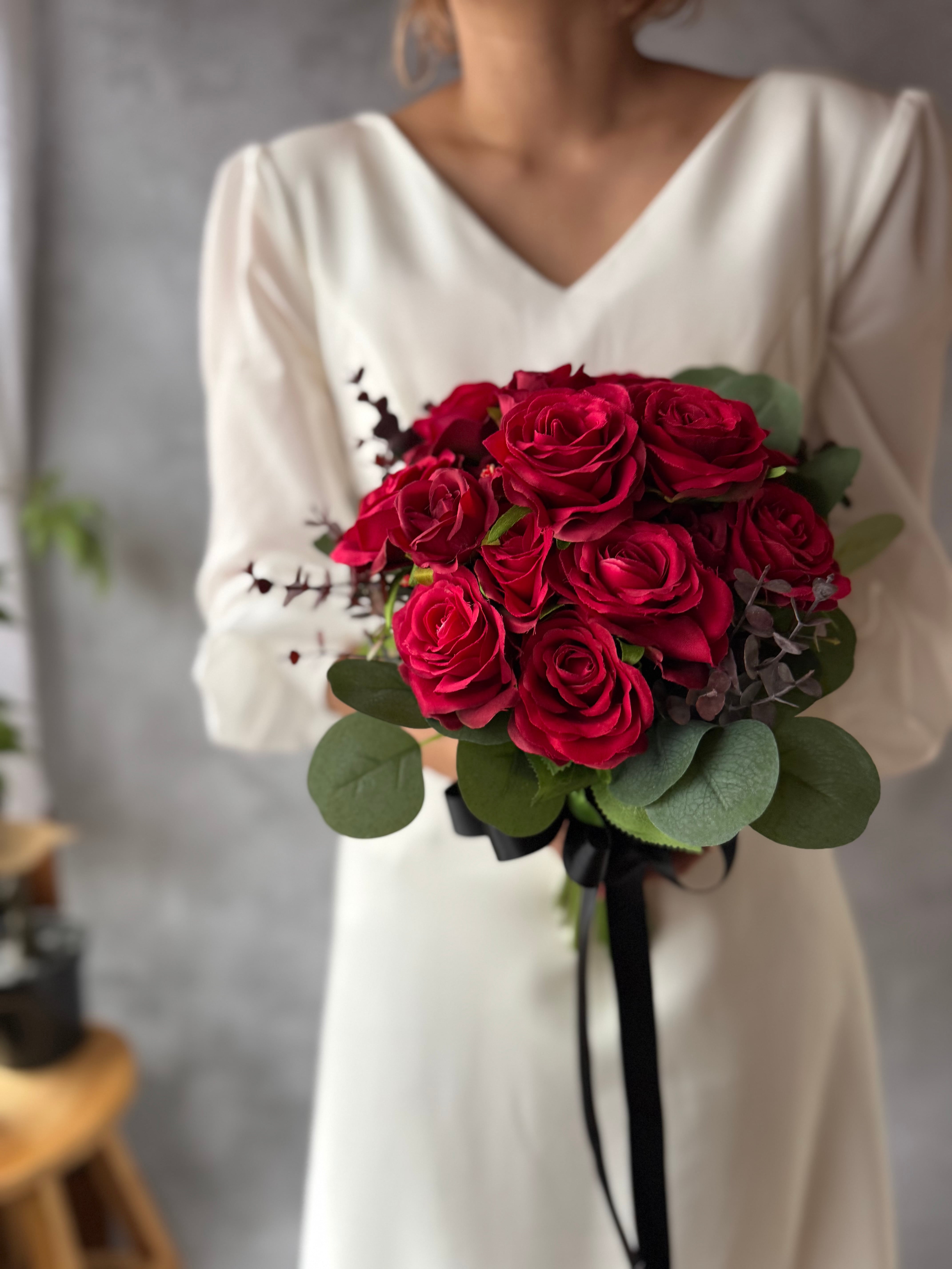 華やかなお写真映えバッチリの赤バラクラッチブーケ•*・赤バラの花言葉は【愛情】•*・プロポーズにも人気のお花です•*・