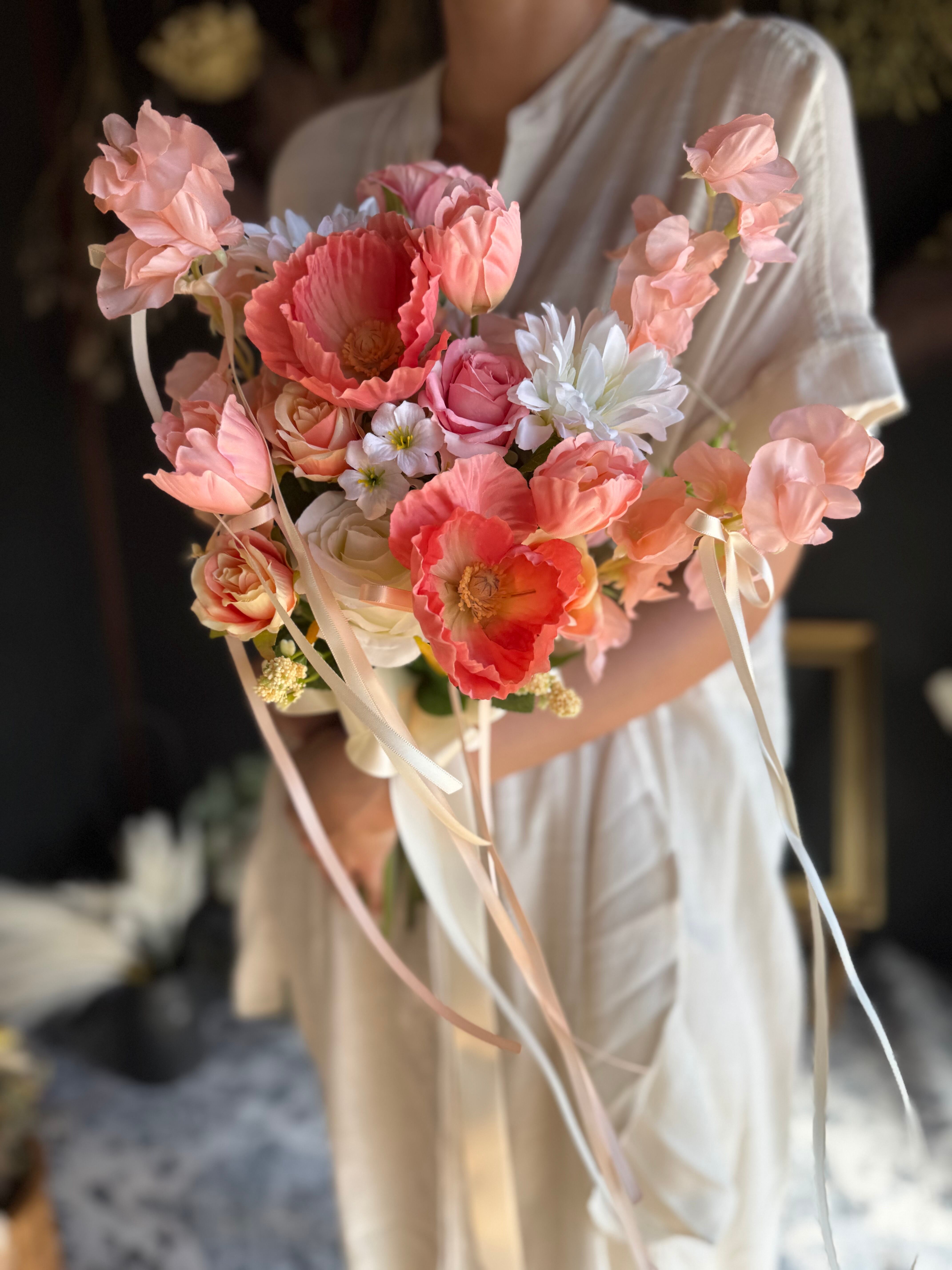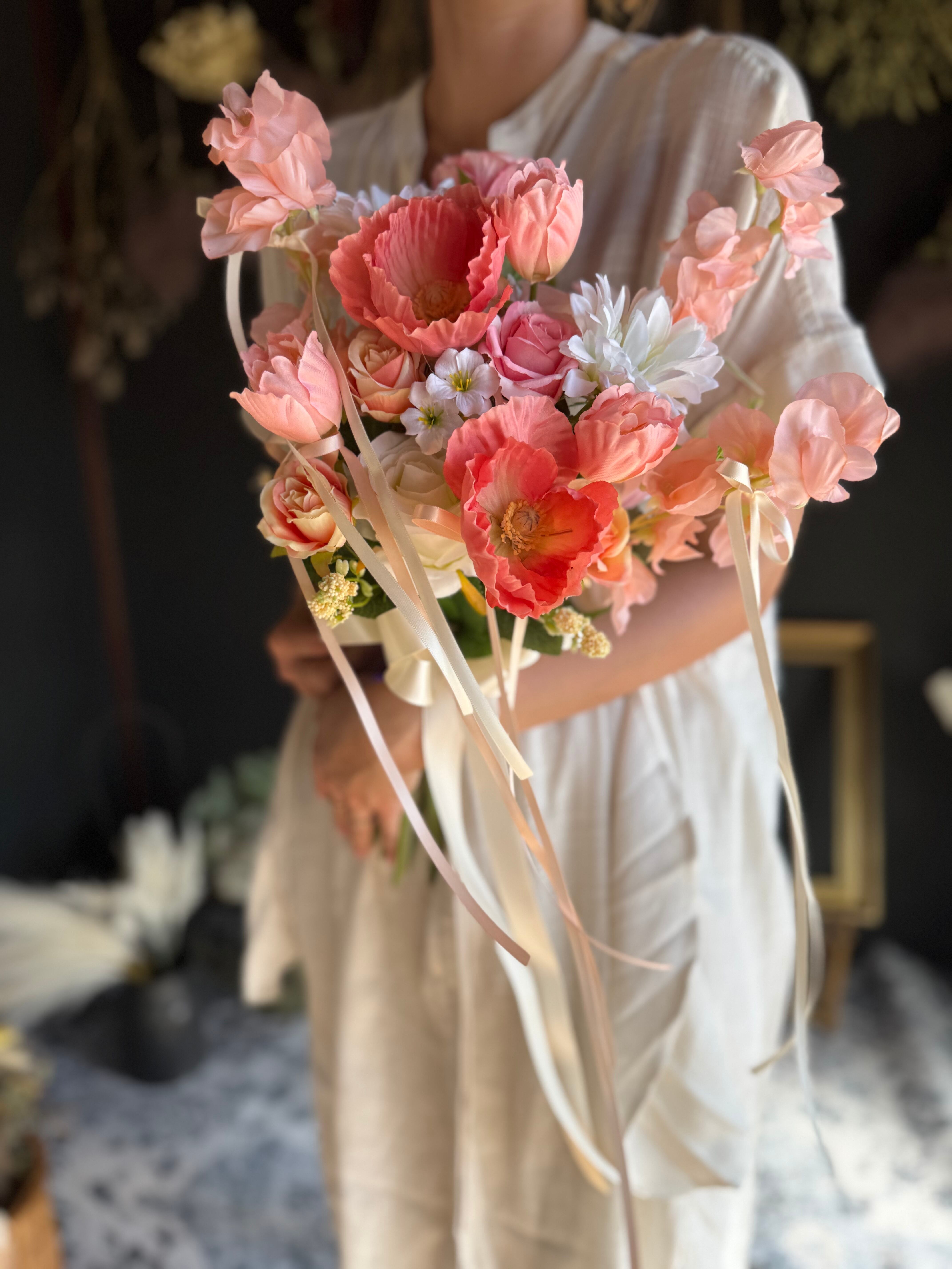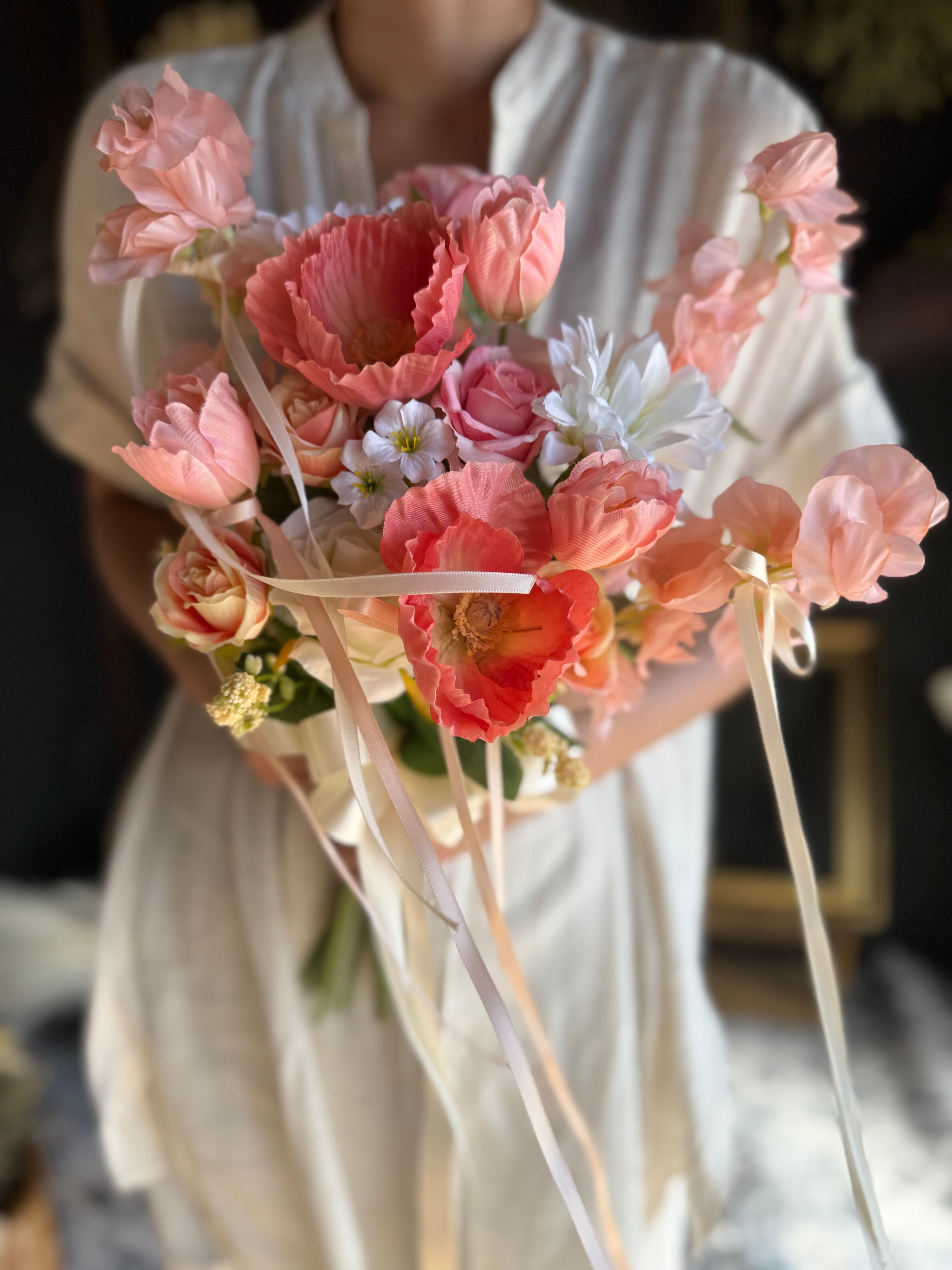 ひらひらと可憐な花びらが特徴のポピーを中心に、サーモンピンクのスイートピーや淡いバラ、白いガーベラをふんわりと束ねました。