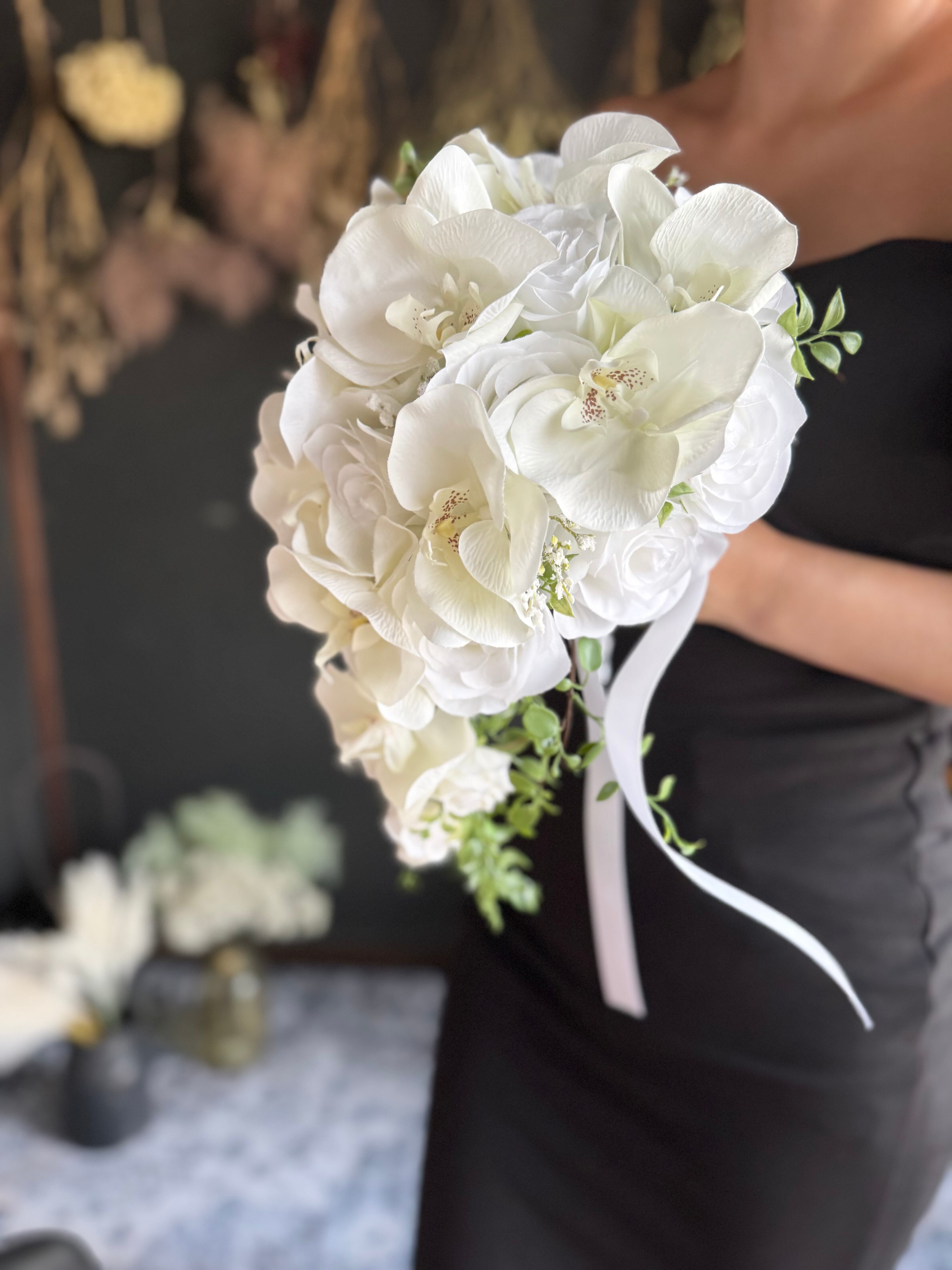 上品な胡蝶蘭、バラでお作りしたキャスケードブーケ•*・ドレスラインを隠してしまわない絶妙な長さのキャスケードブーケで大人ウェディングにぴったりの高級感あるブーケ•*・