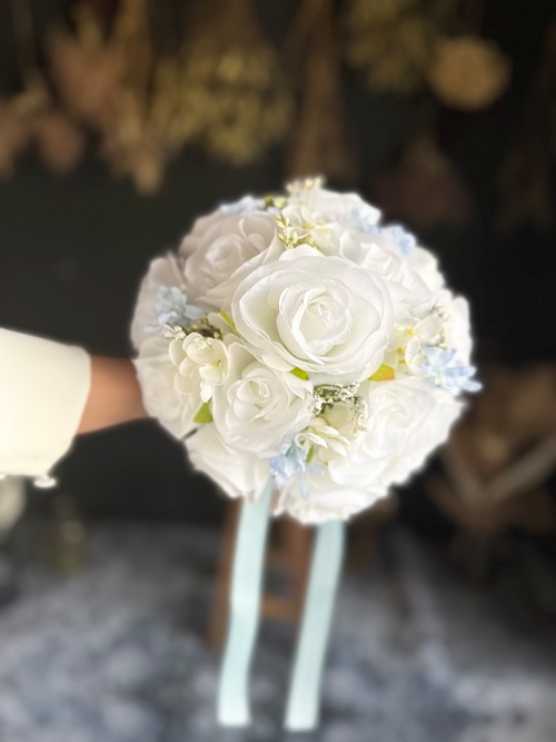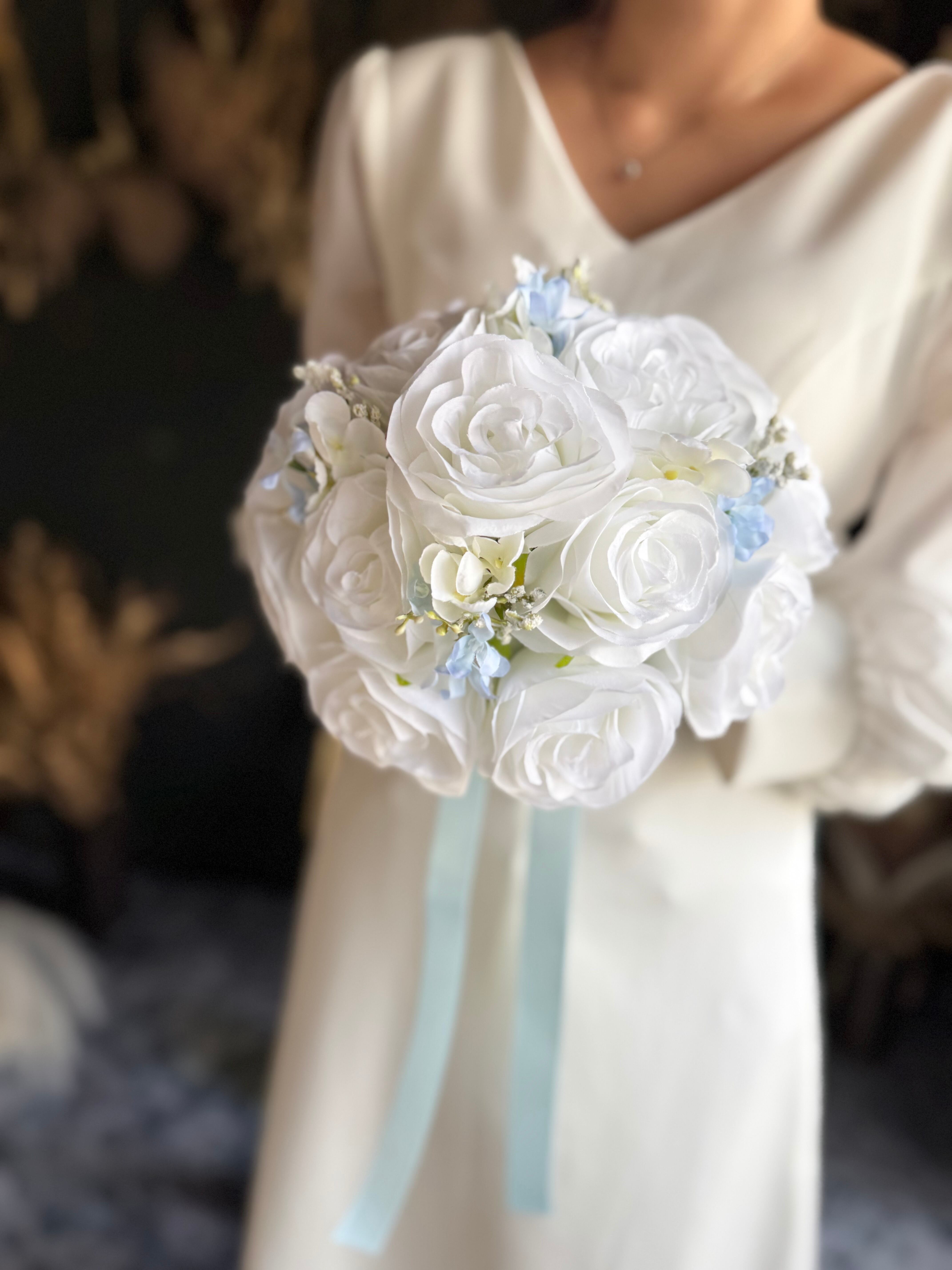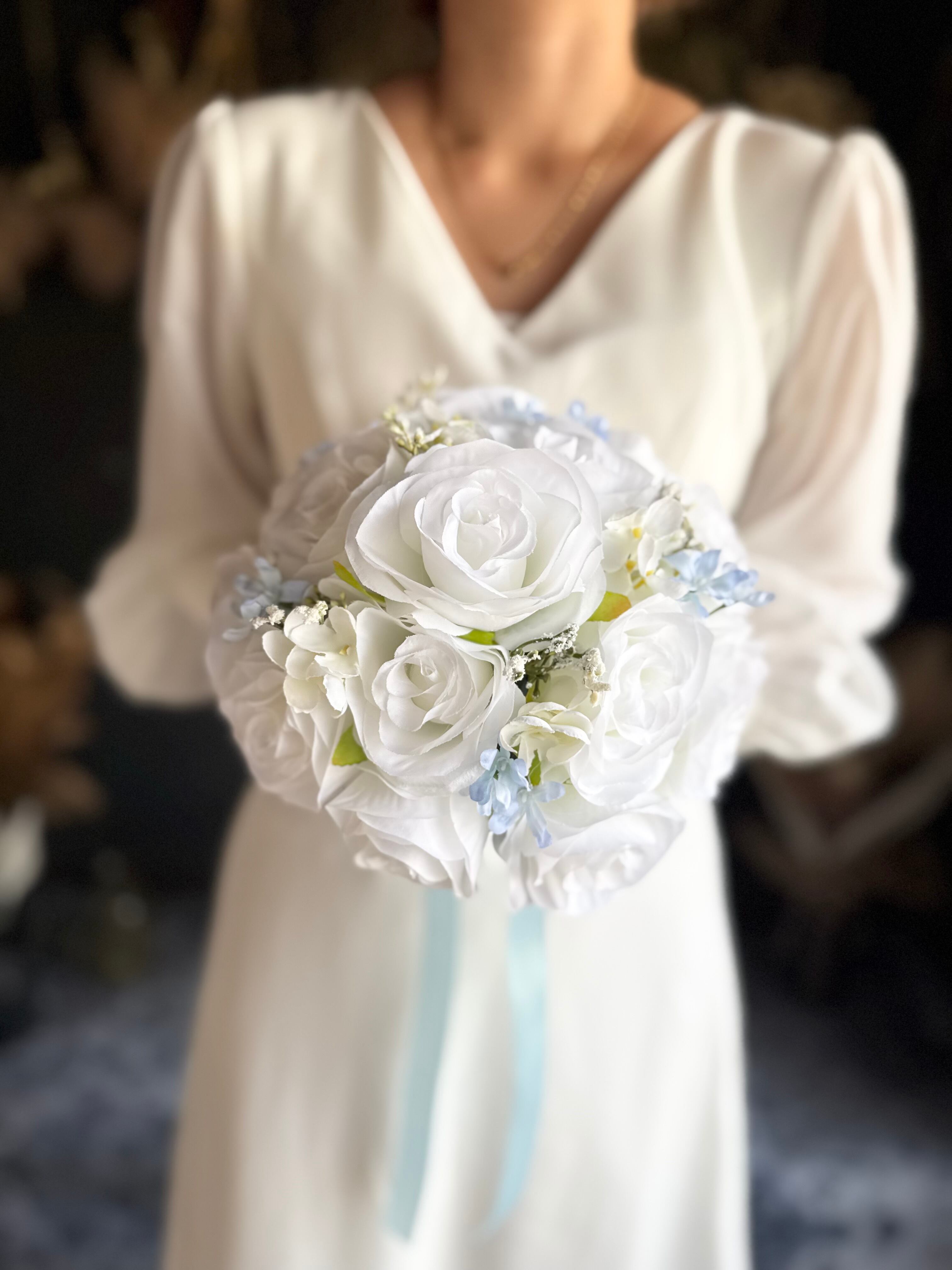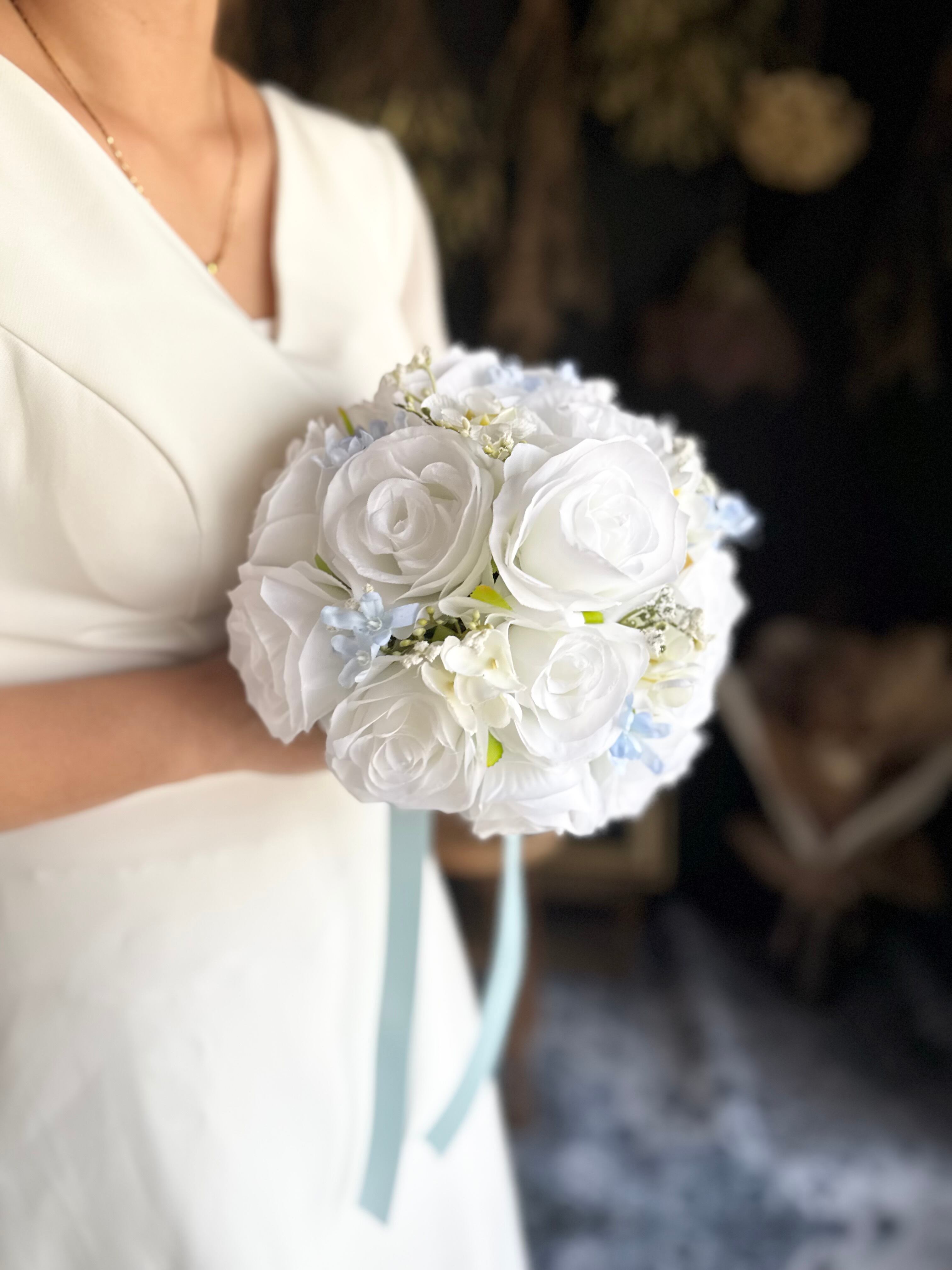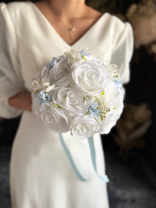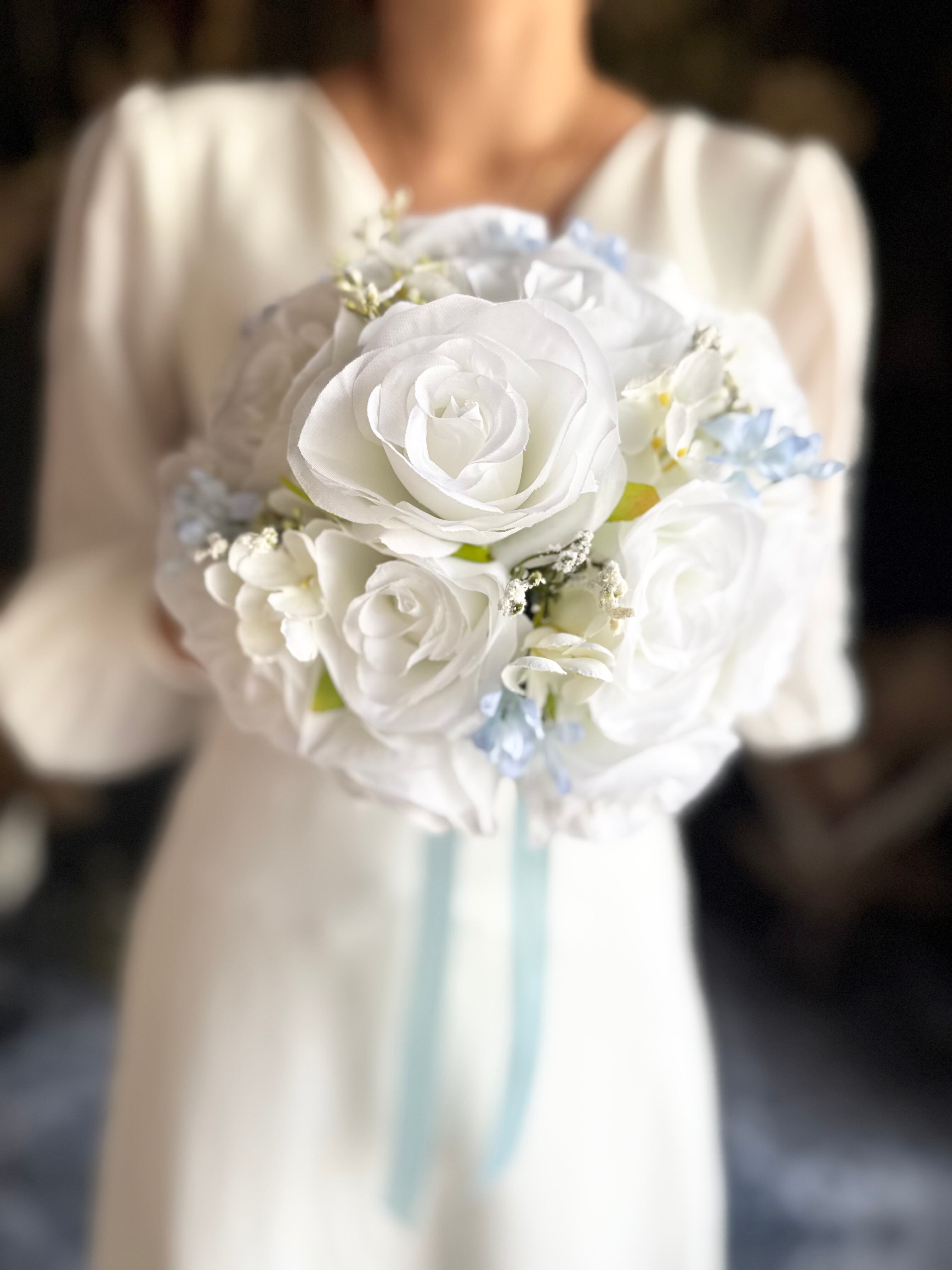 ホワイトベースに淡いブルーをアクセントにいれたウェディングブーケ•*・サムシングブルーとしても人気のデザインです•*・