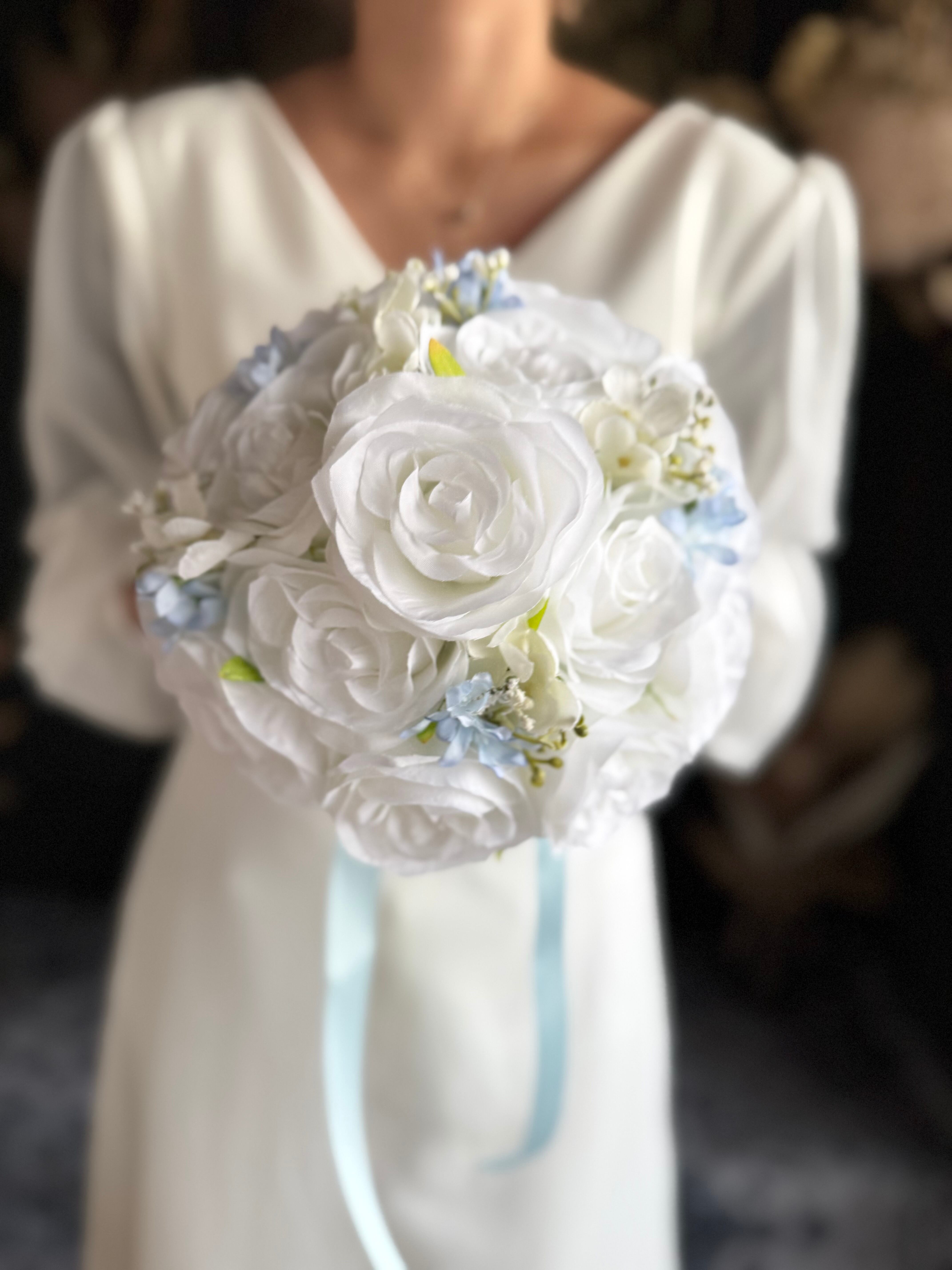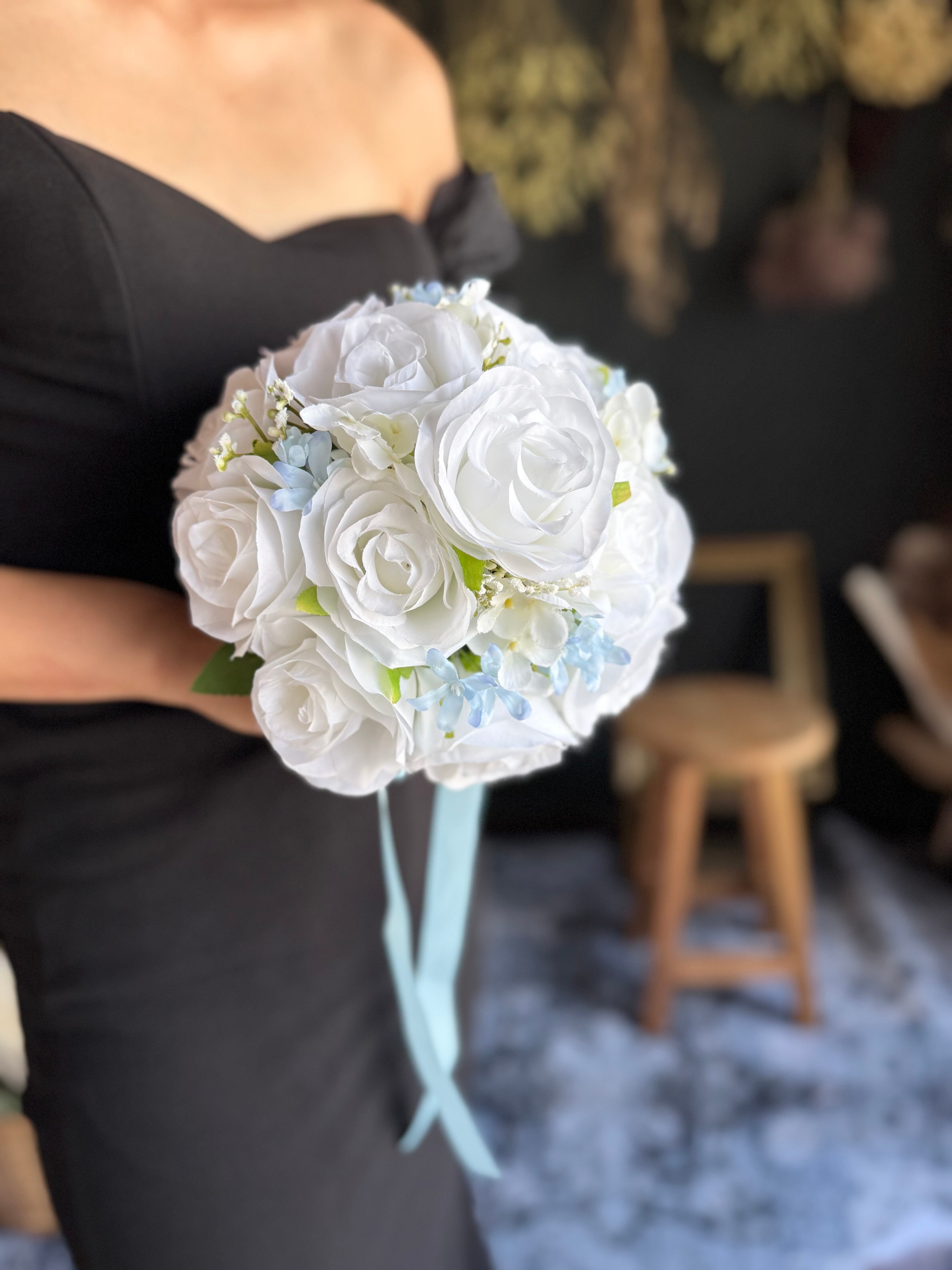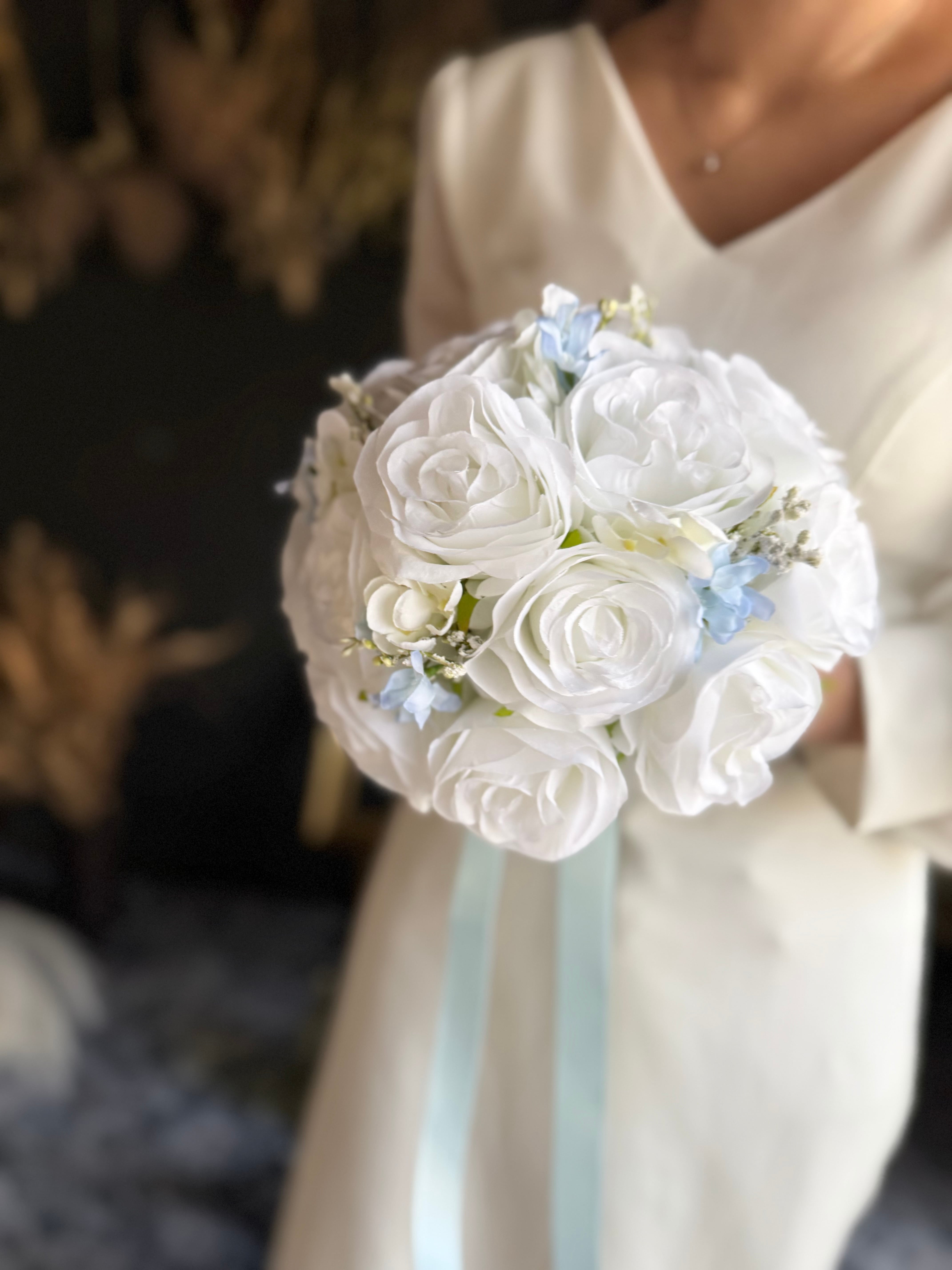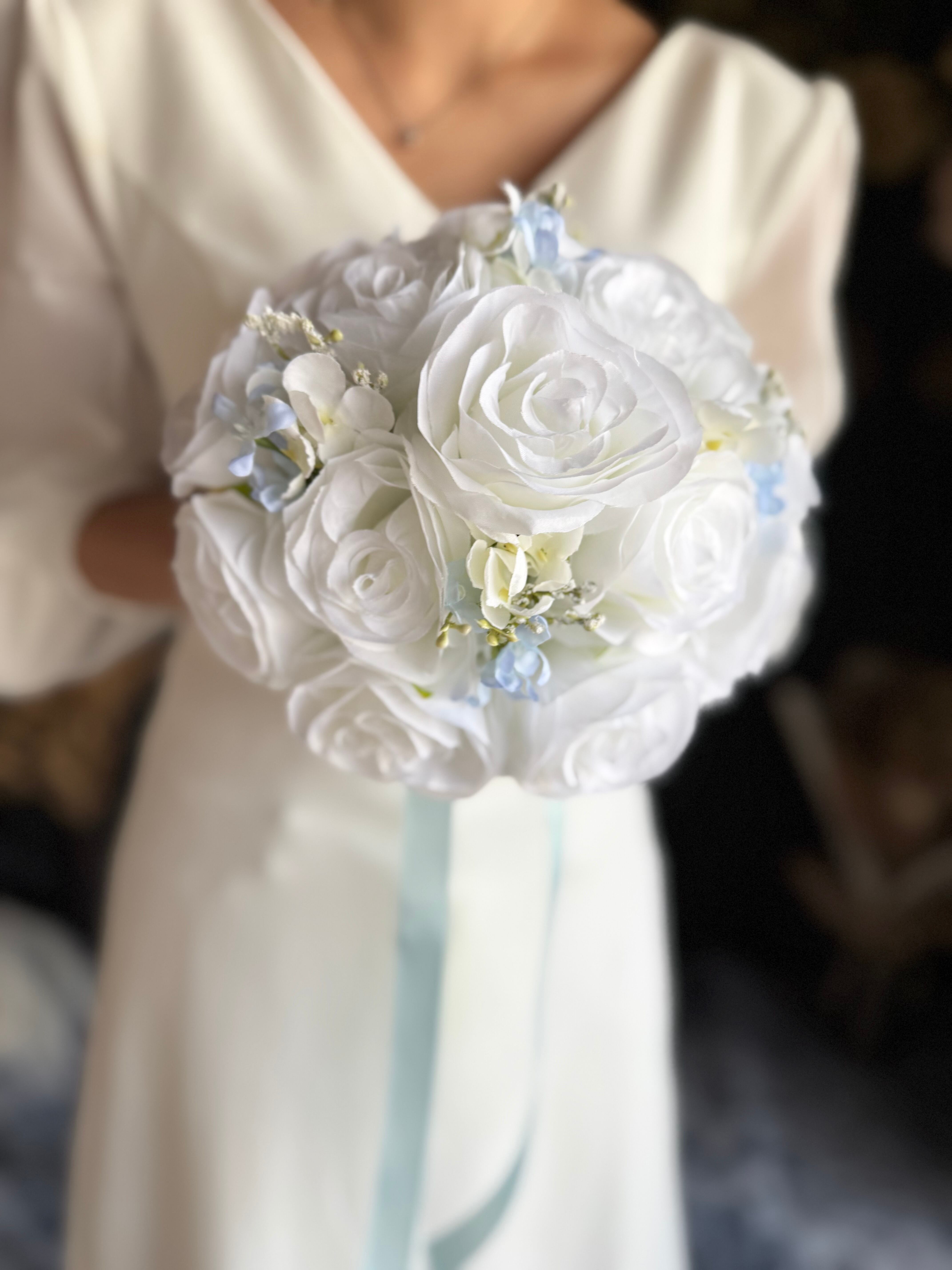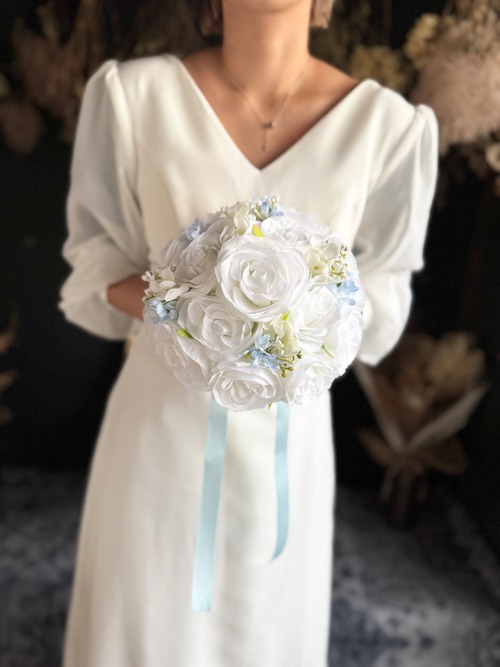 ホワイトベースに淡いブルーをアクセントにいれたウェディングブーケ•*・サムシングブルーとしても人気のデザインです•*・