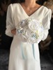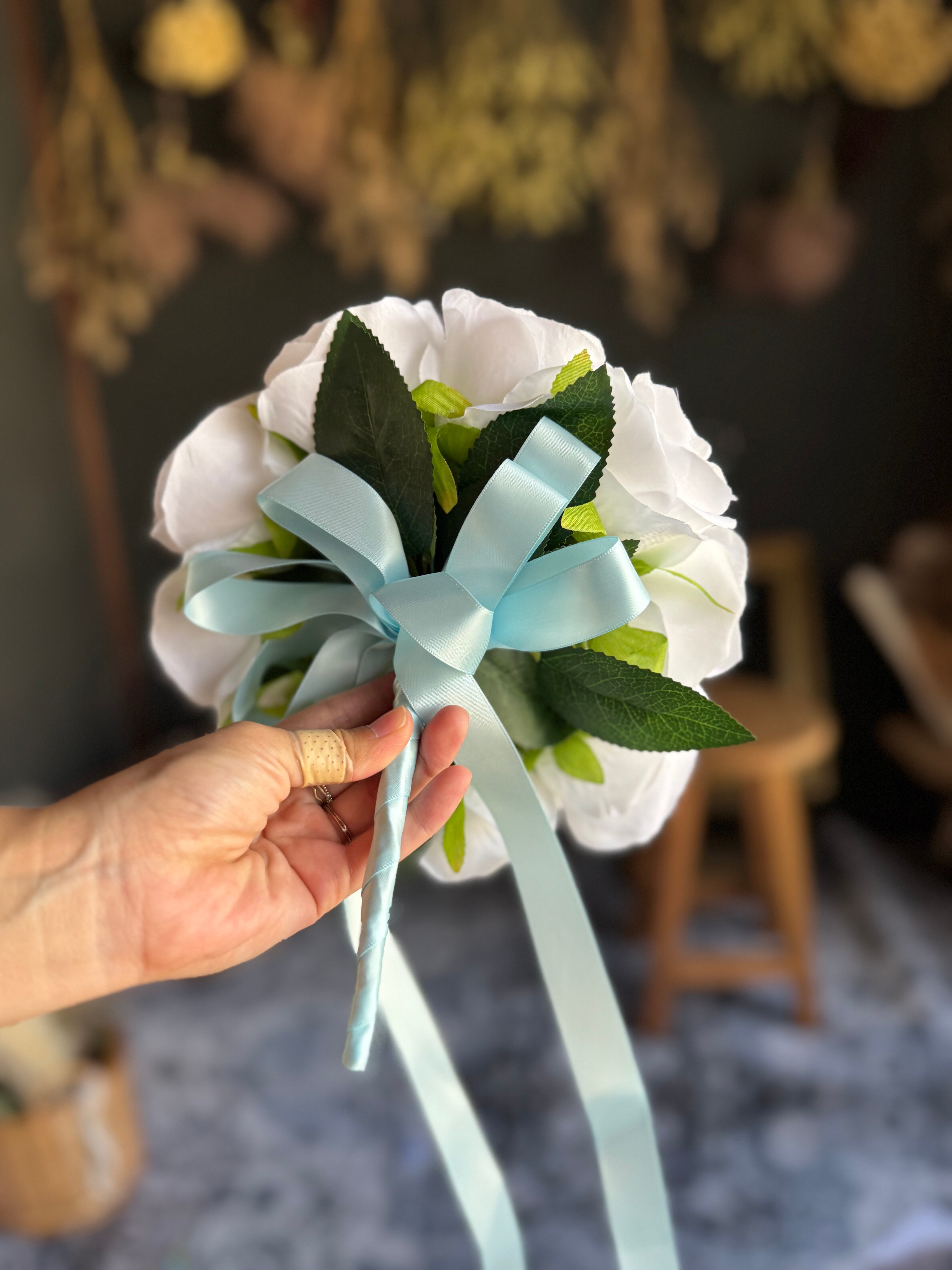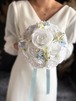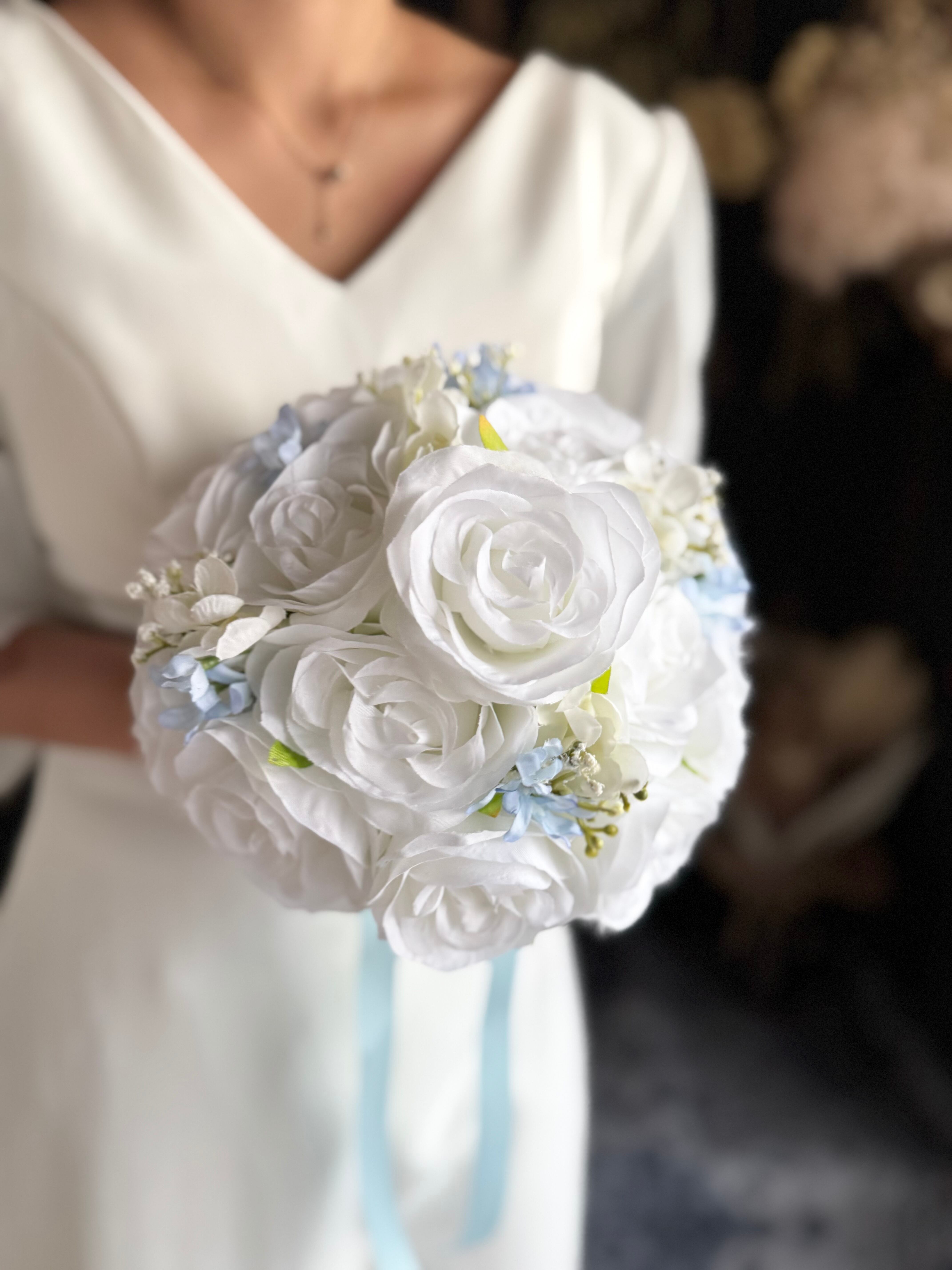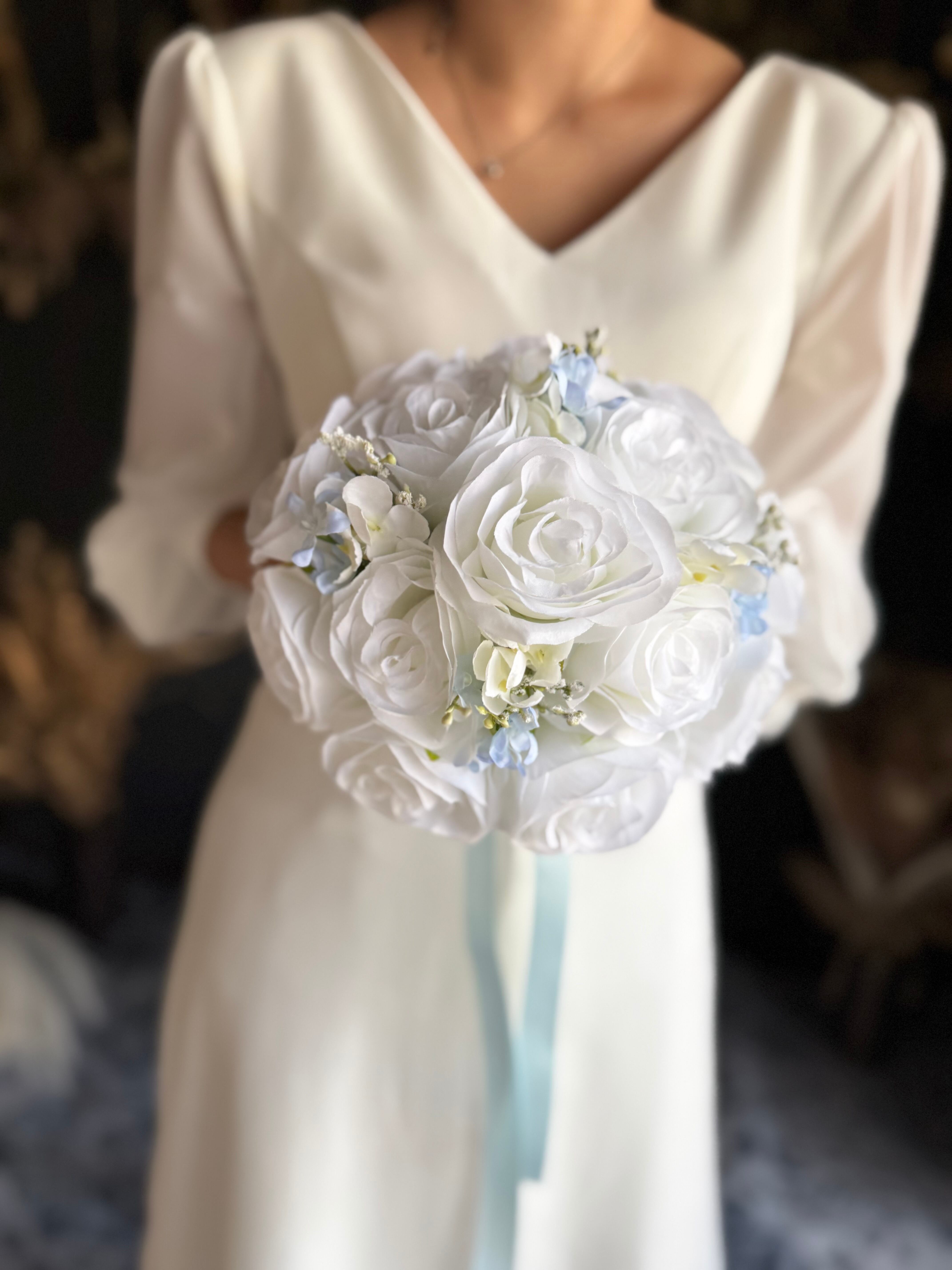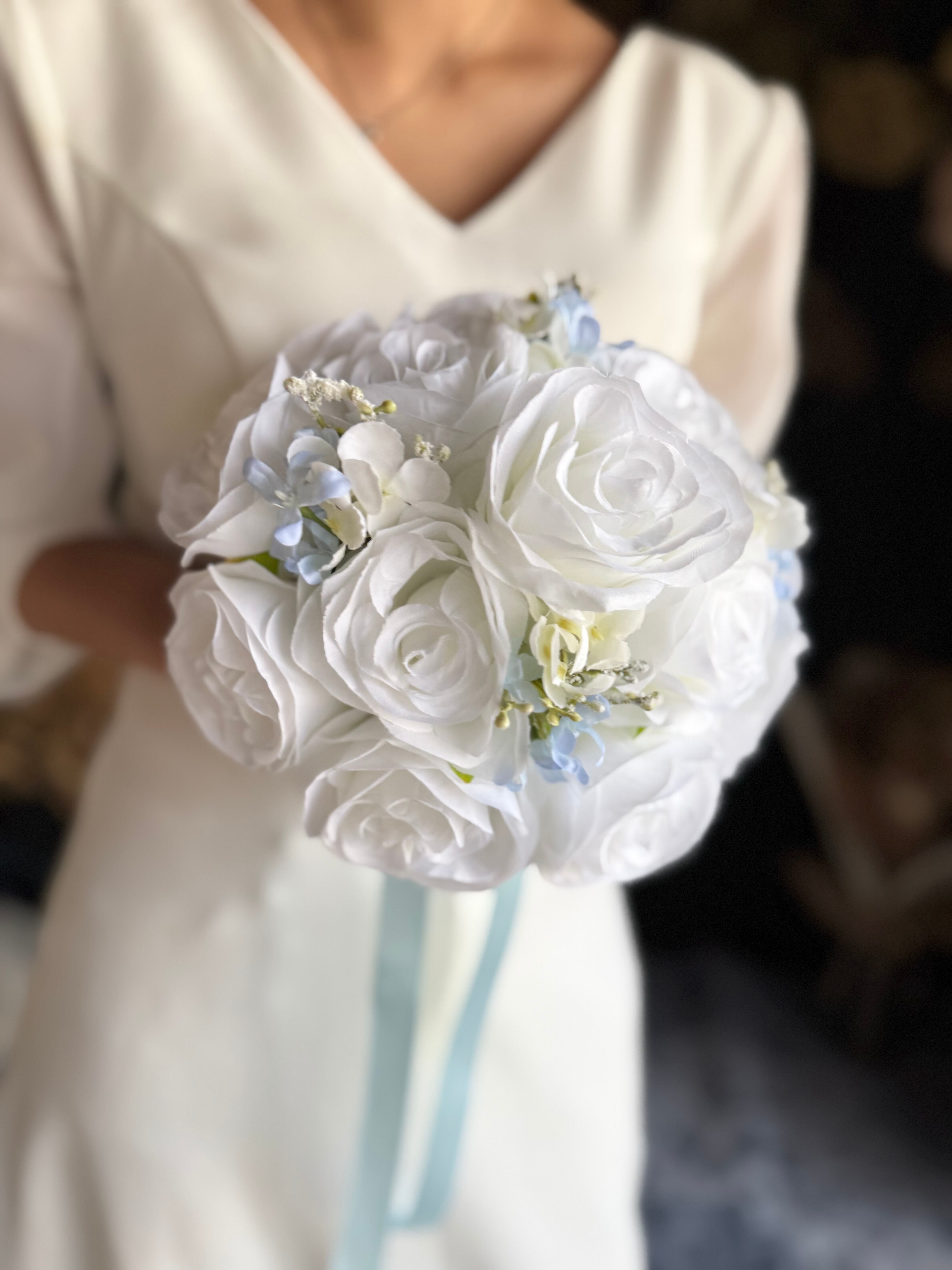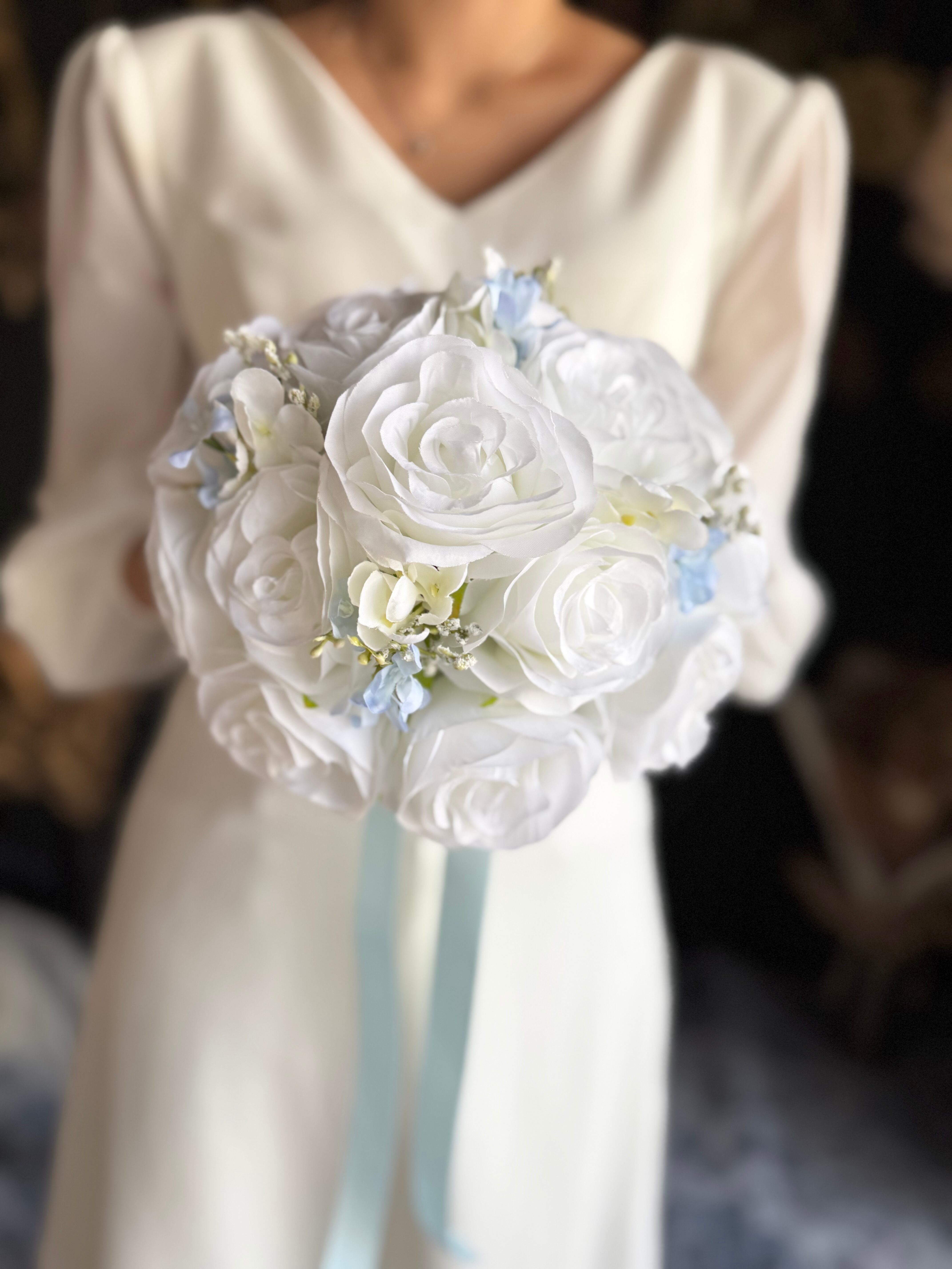 ホワイトベースに淡いブルーをアクセントにいれたウェディングブーケ•*・サムシングブルーとしても人気のデザインです•*・