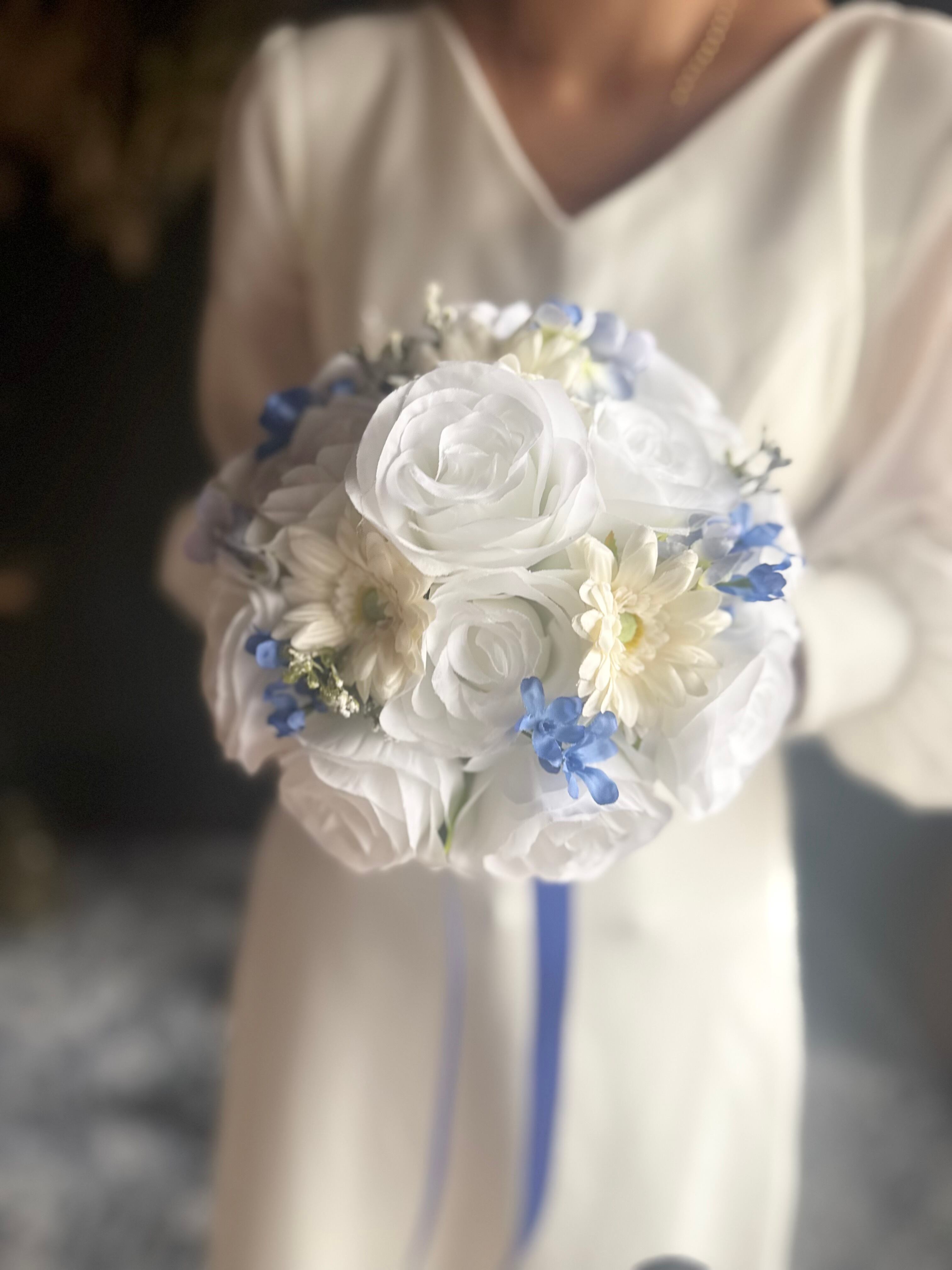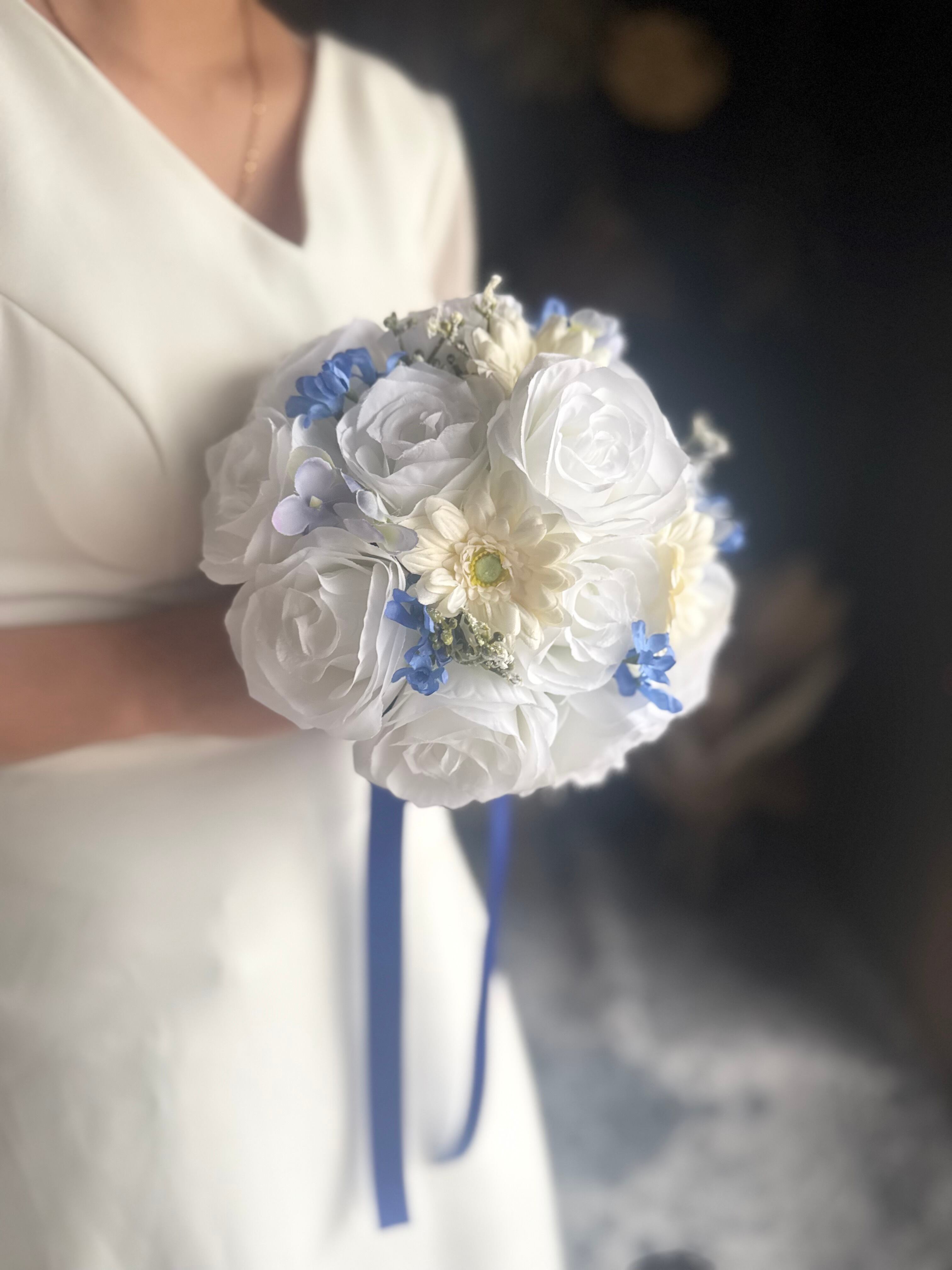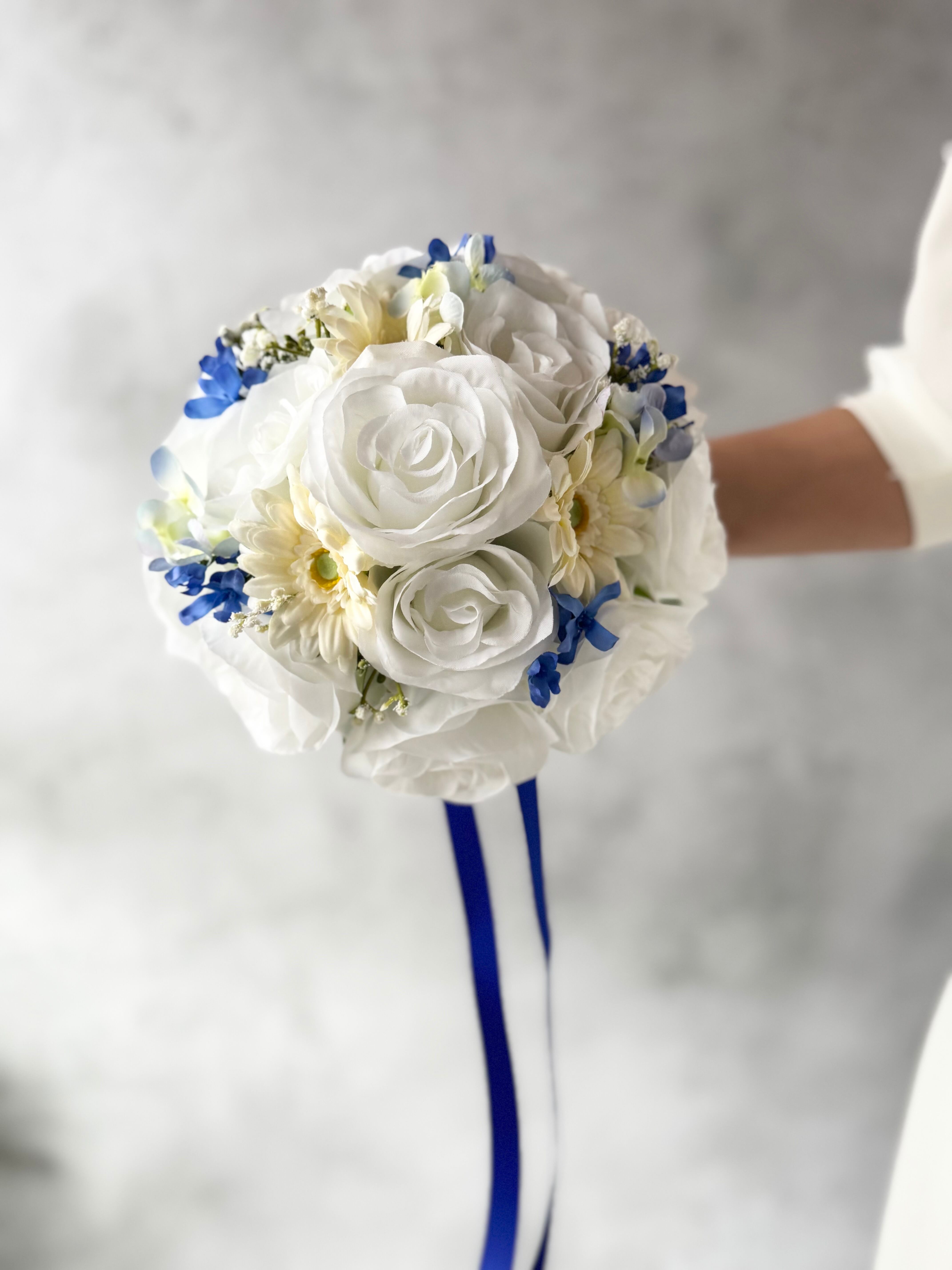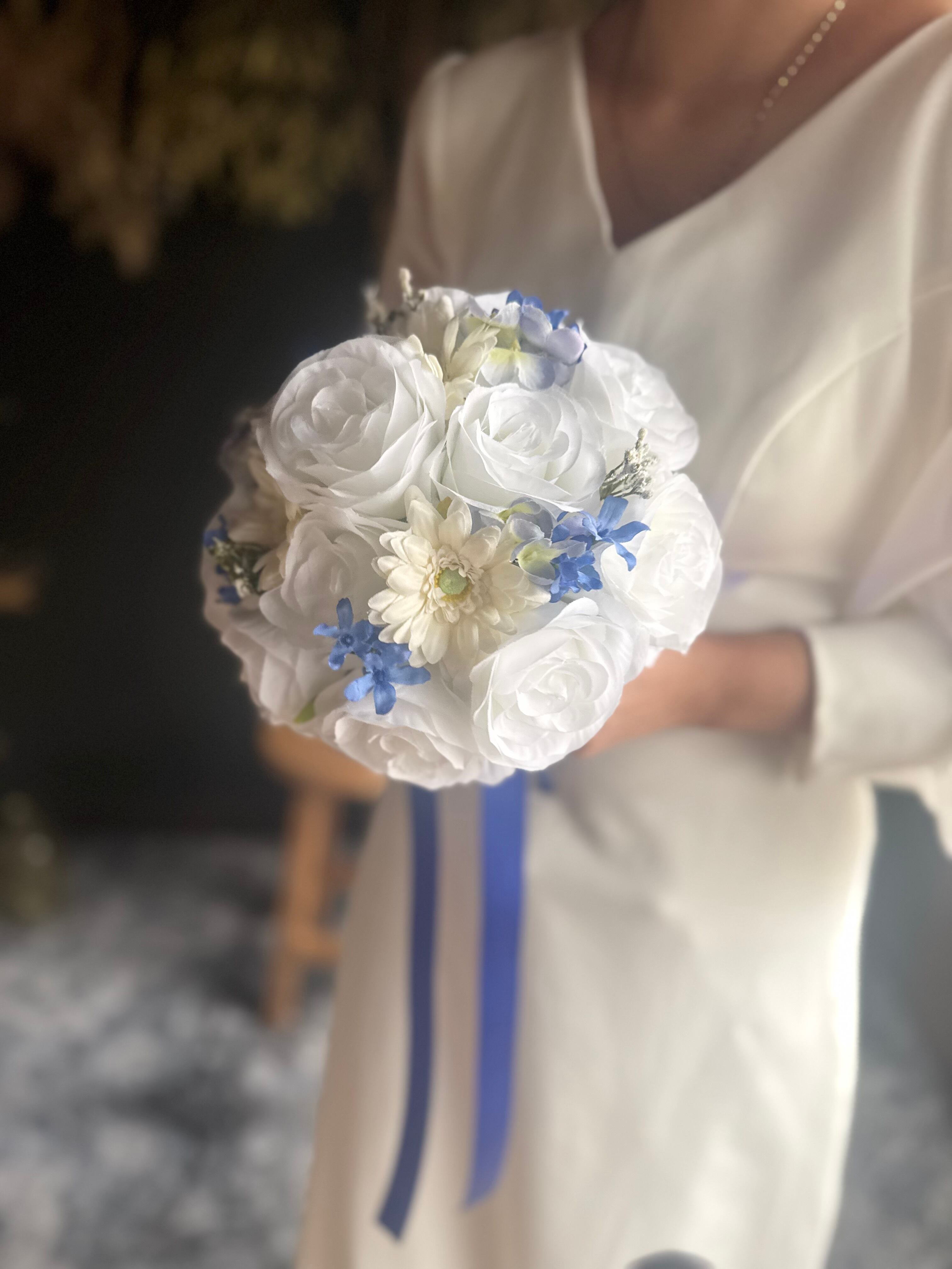 爽やかな白ガーベラとブルーの色合いが美しいラウンドブーケです•*・ ナチュラルな雰囲気が魅力で、さまざまなスタイルのウェディングにピッタリです•*・