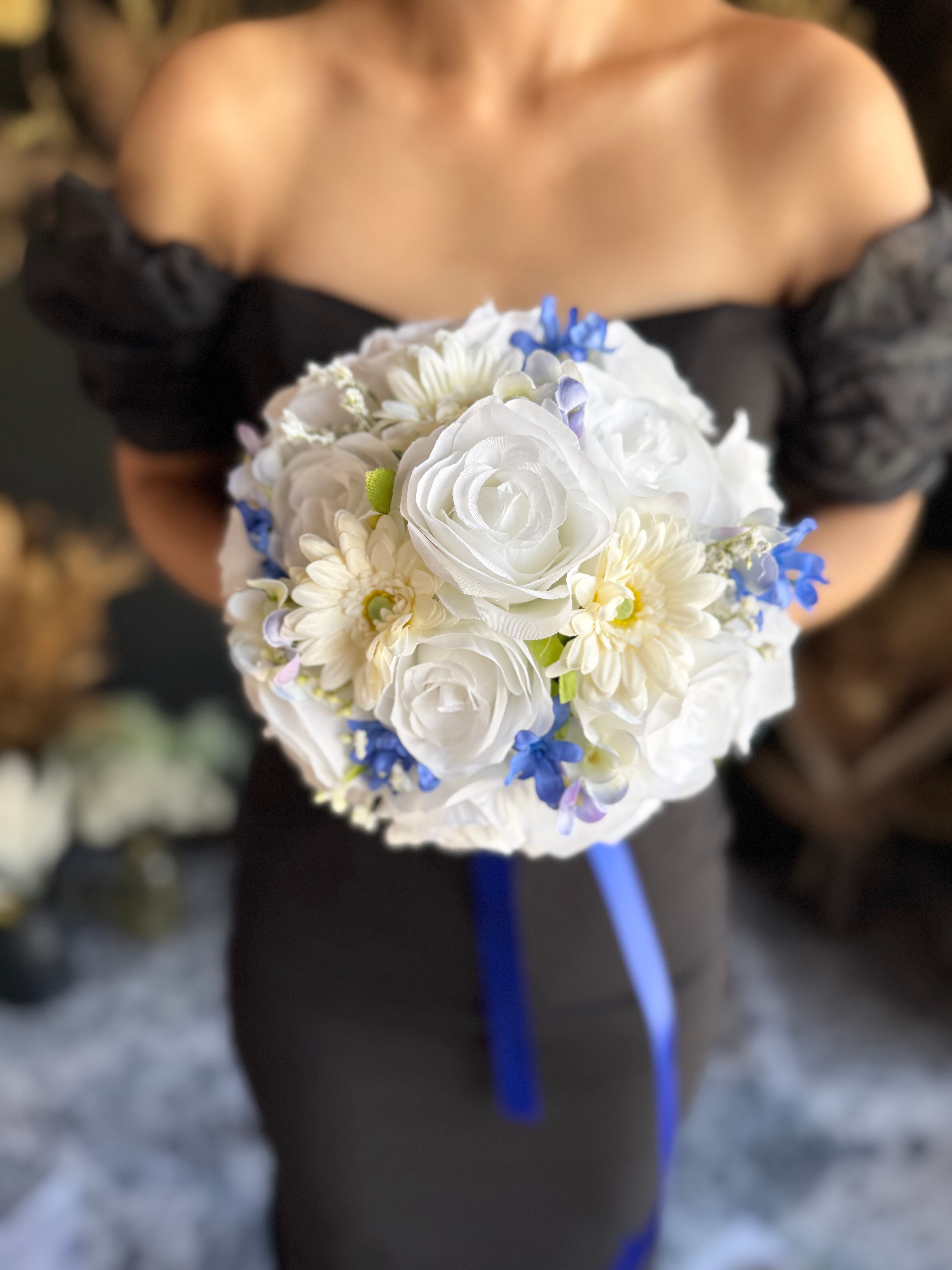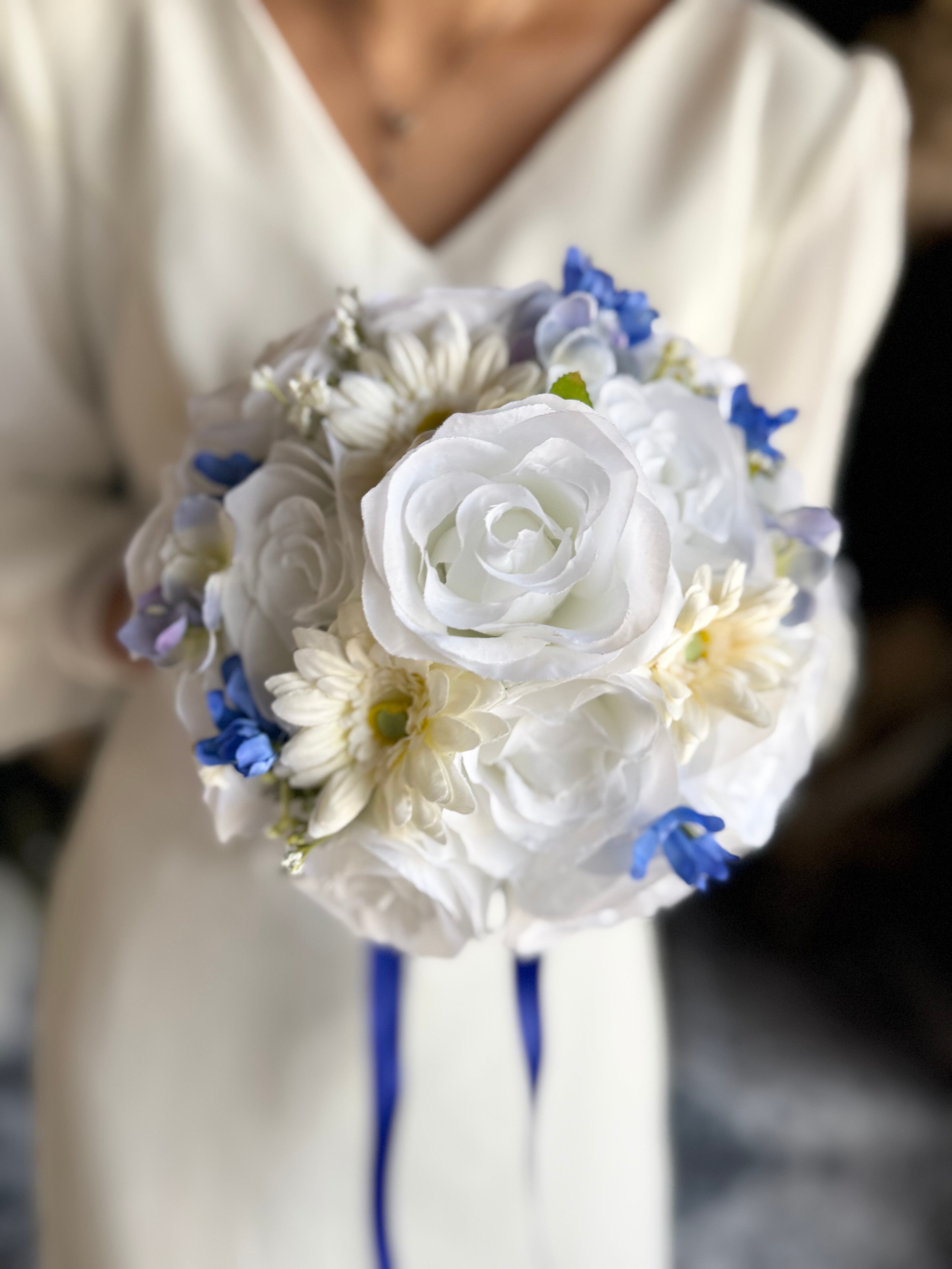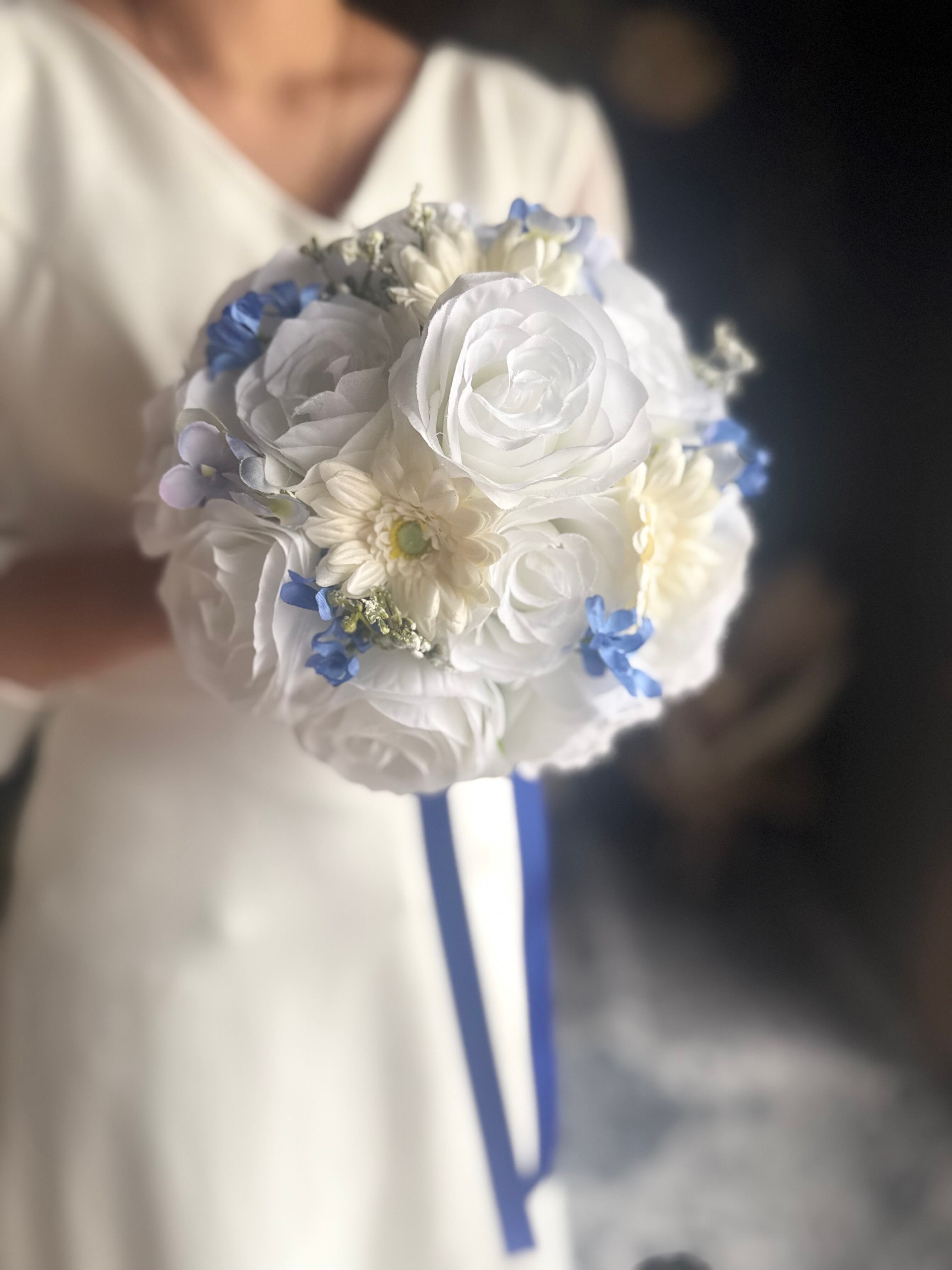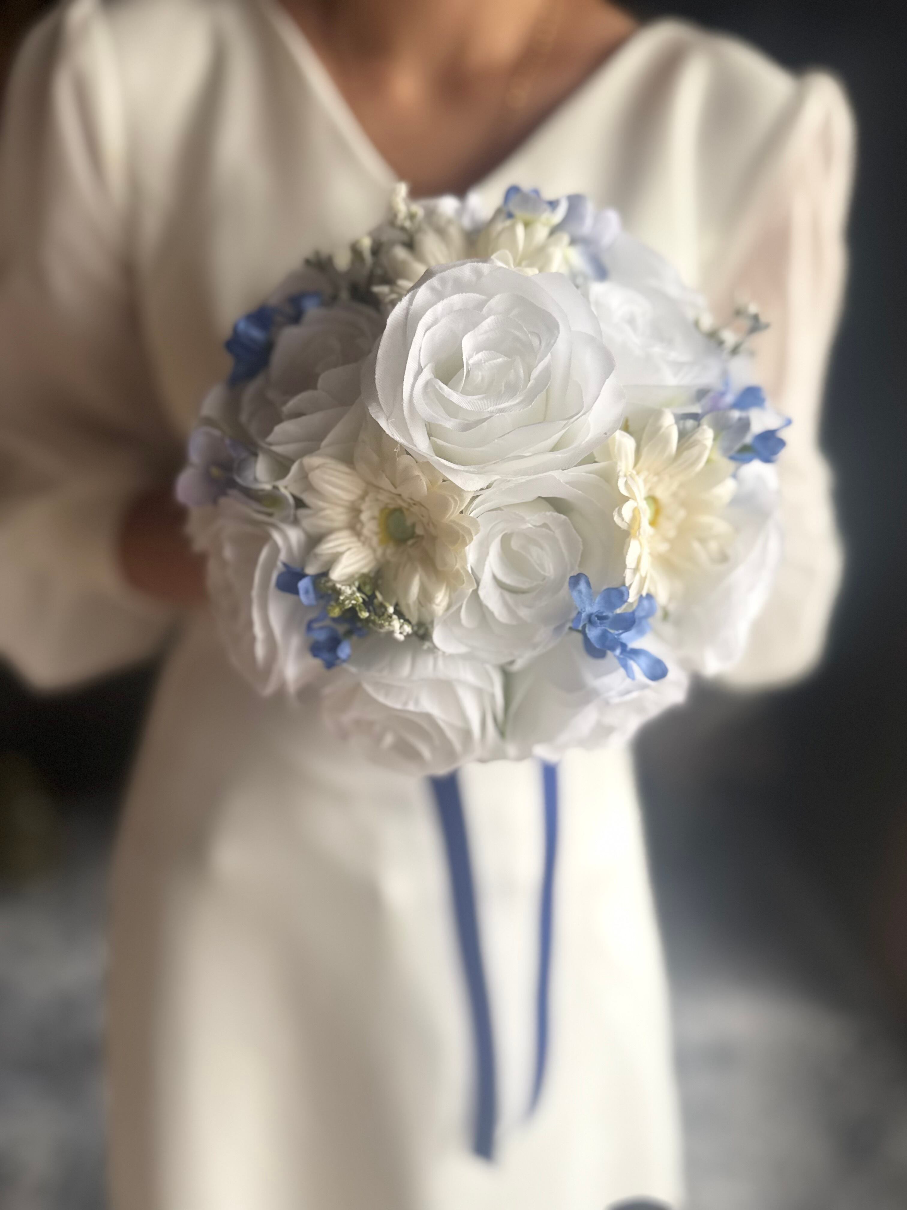爽やかな白ガーベラとブルーの色合いが美しいラウンドブーケです•*・ ナチュラルな雰囲気が魅力で、さまざまなスタイルのウェディングにピッタリです•*・
