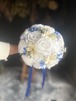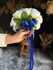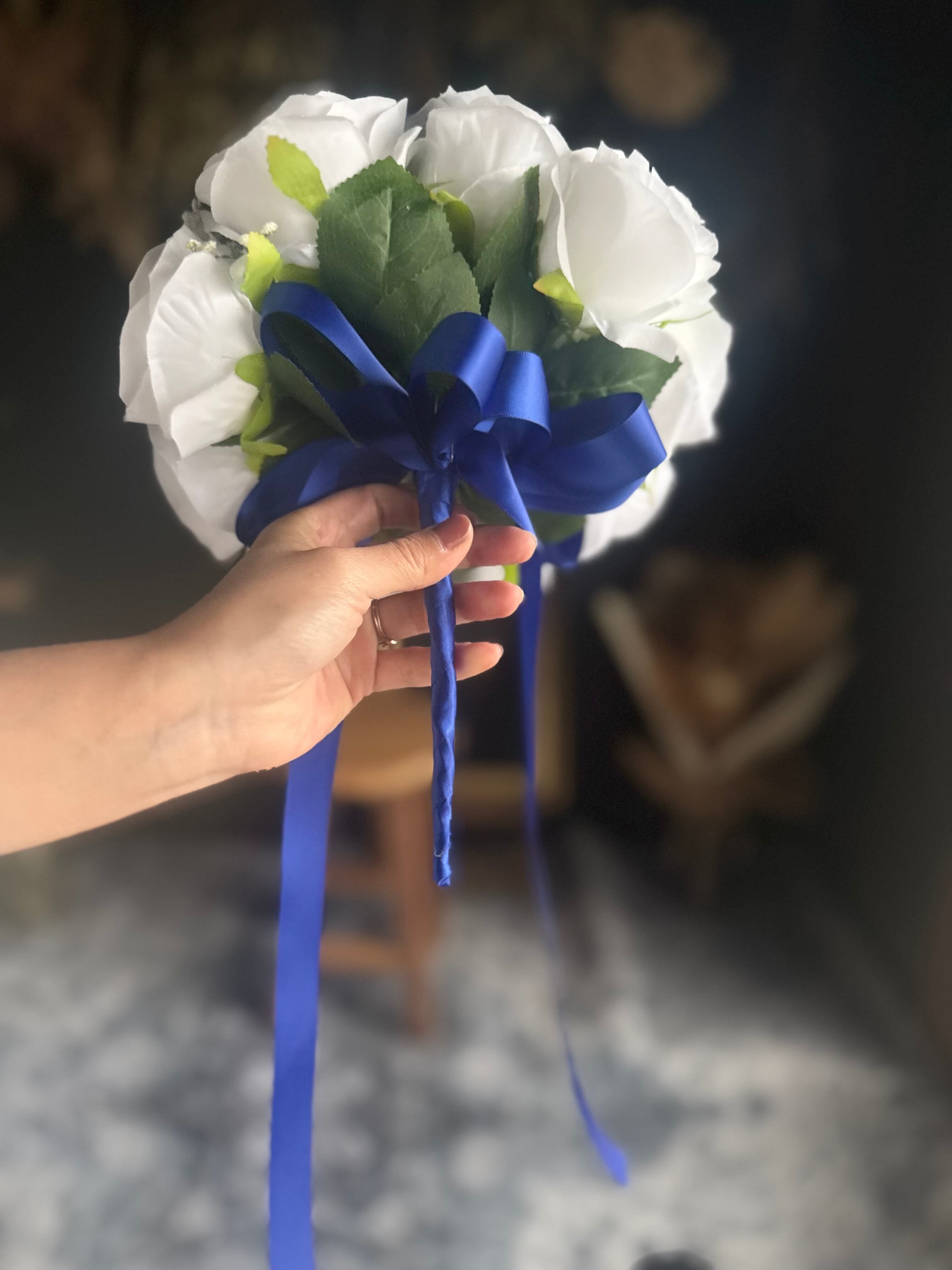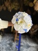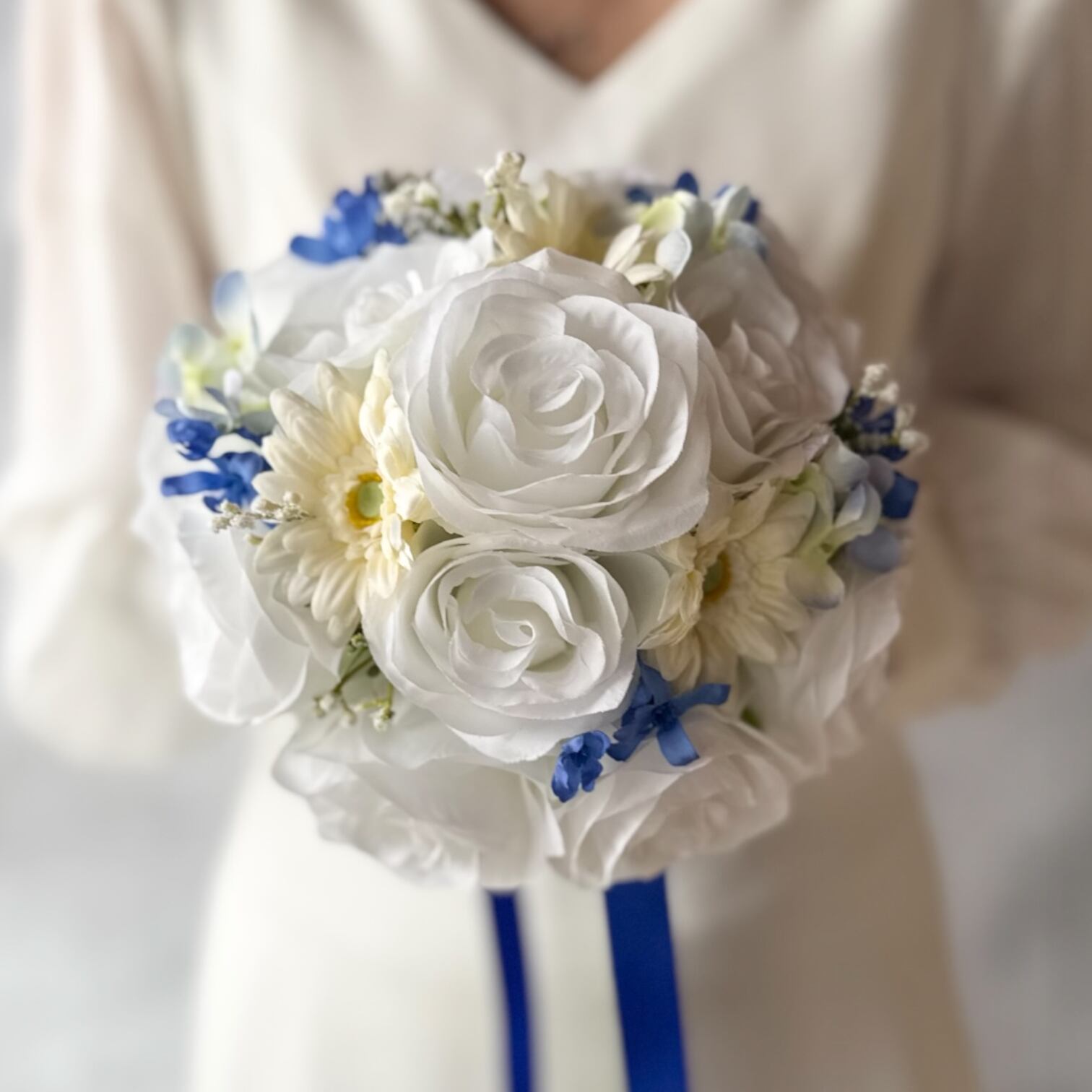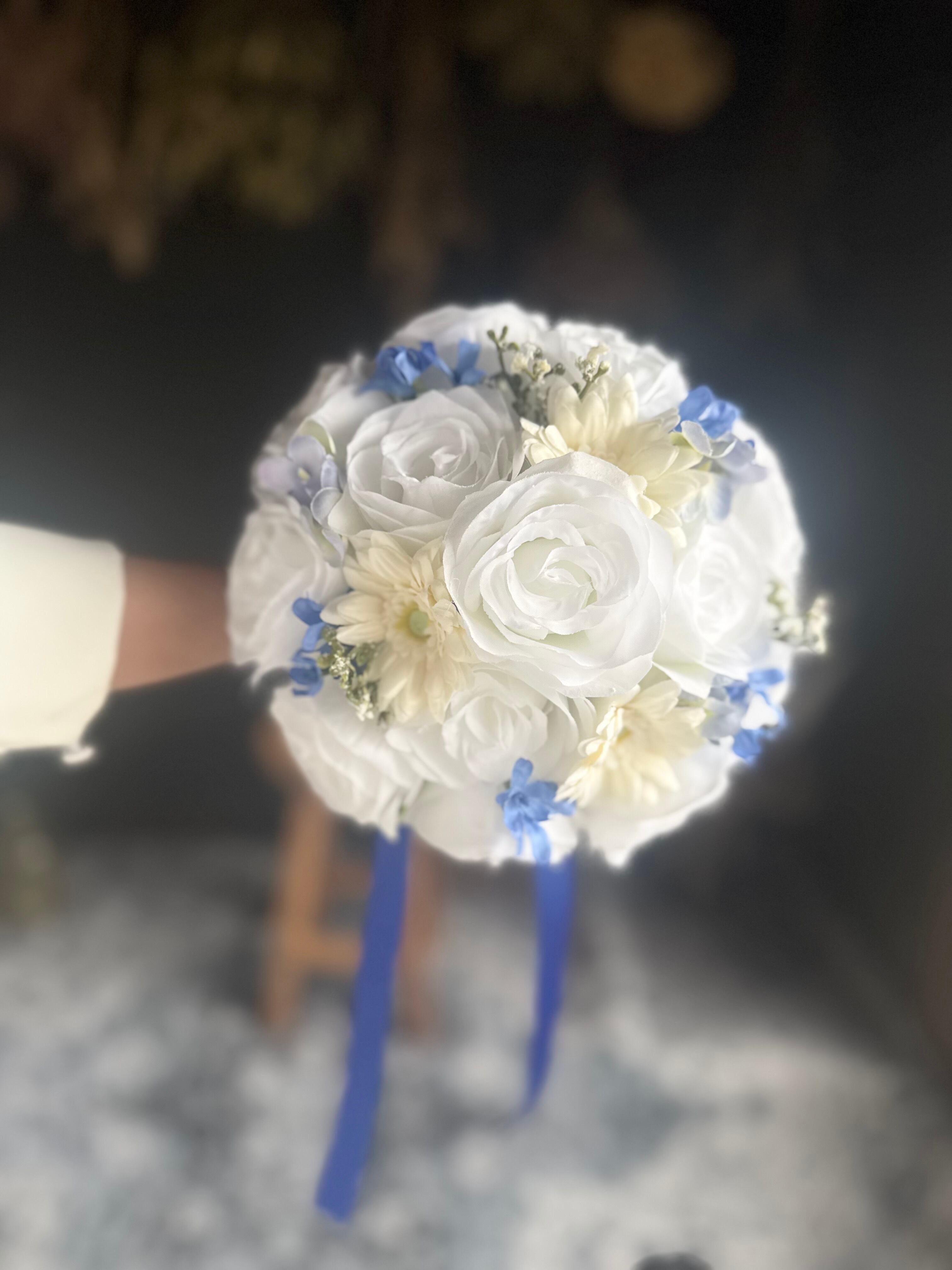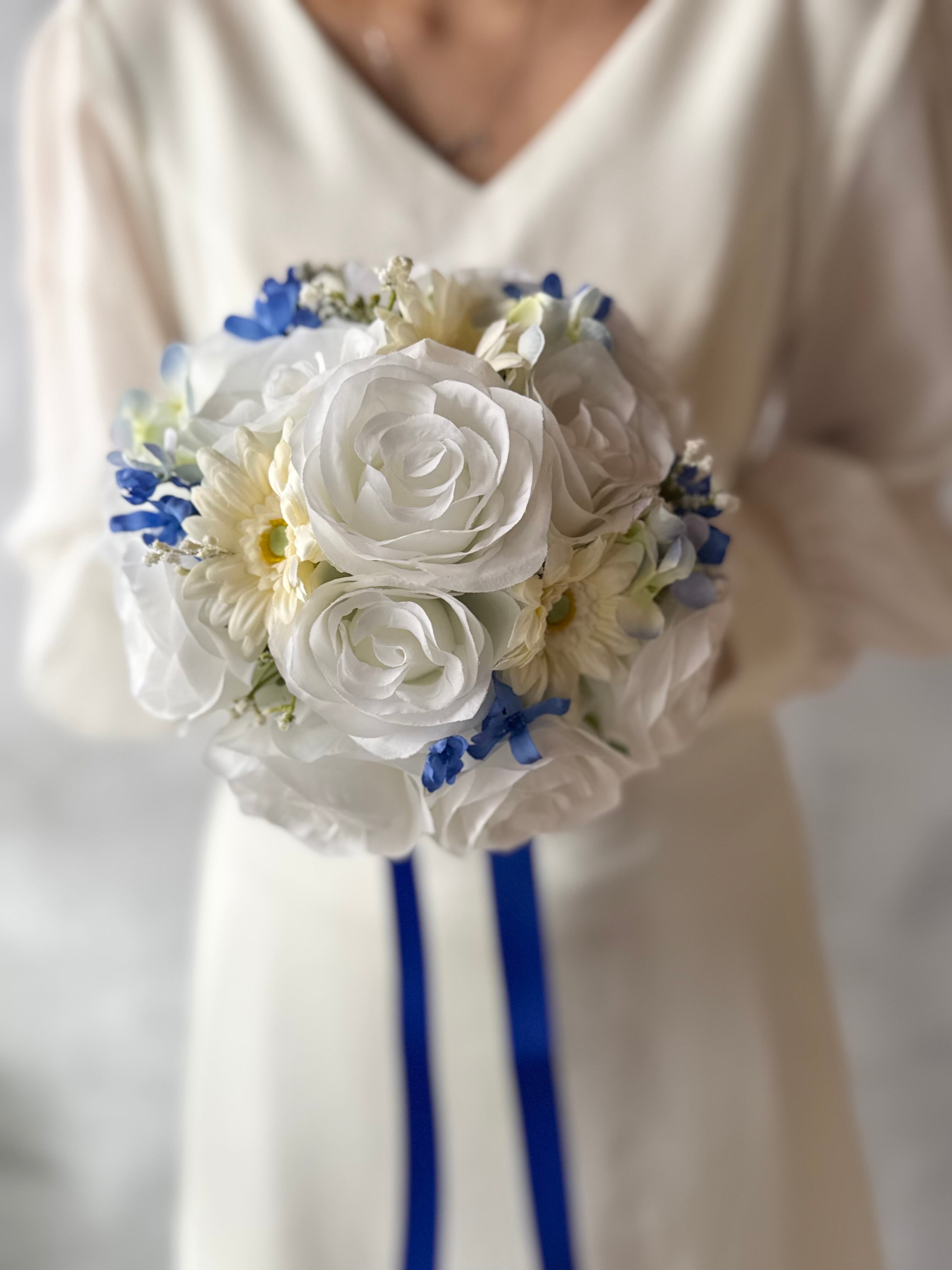 爽やかな白ガーベラとブルーの色合いが美しいラウンドブーケです•*・ ナチュラルな雰囲気が魅力で、さまざまなスタイルのウェディングにピッタリです•*・