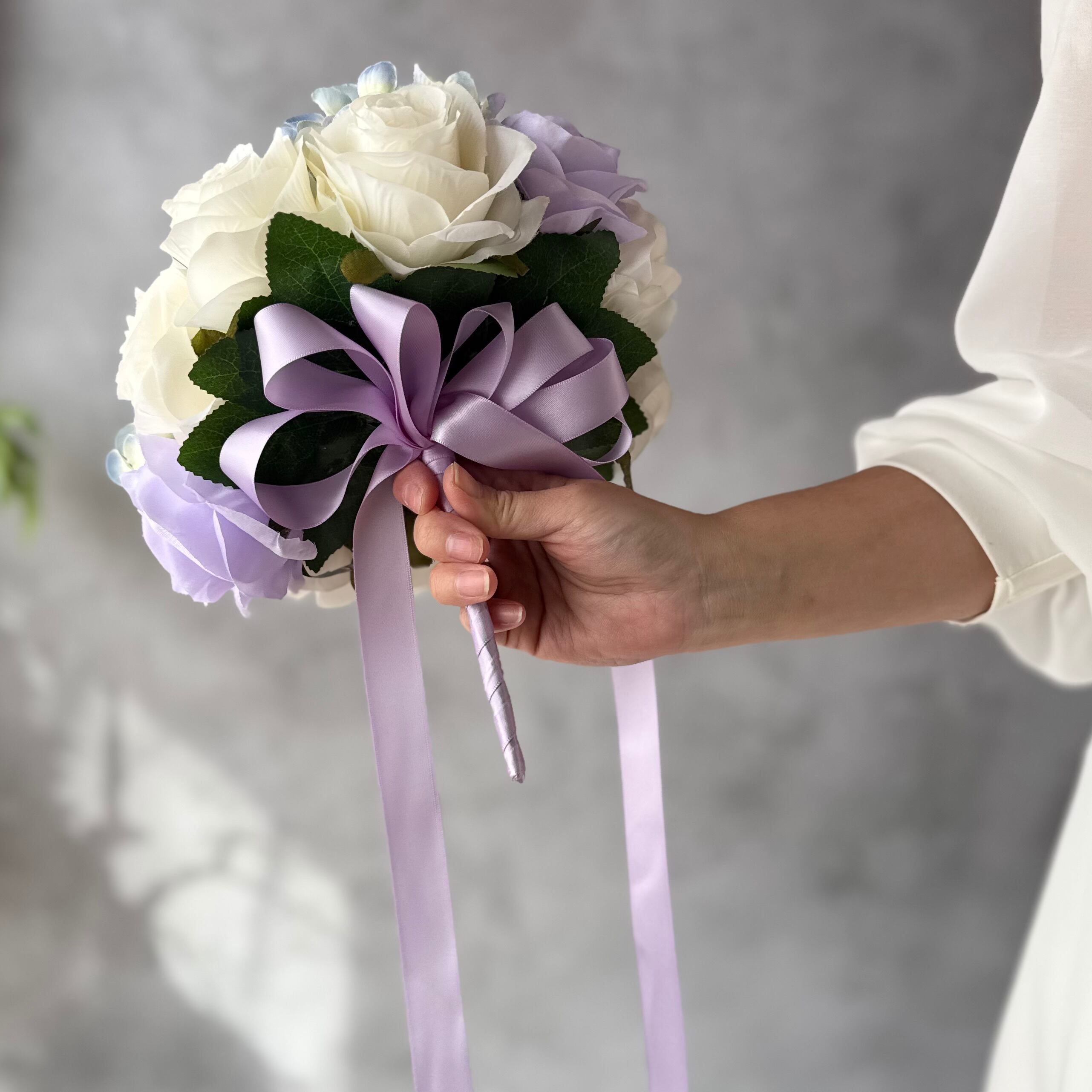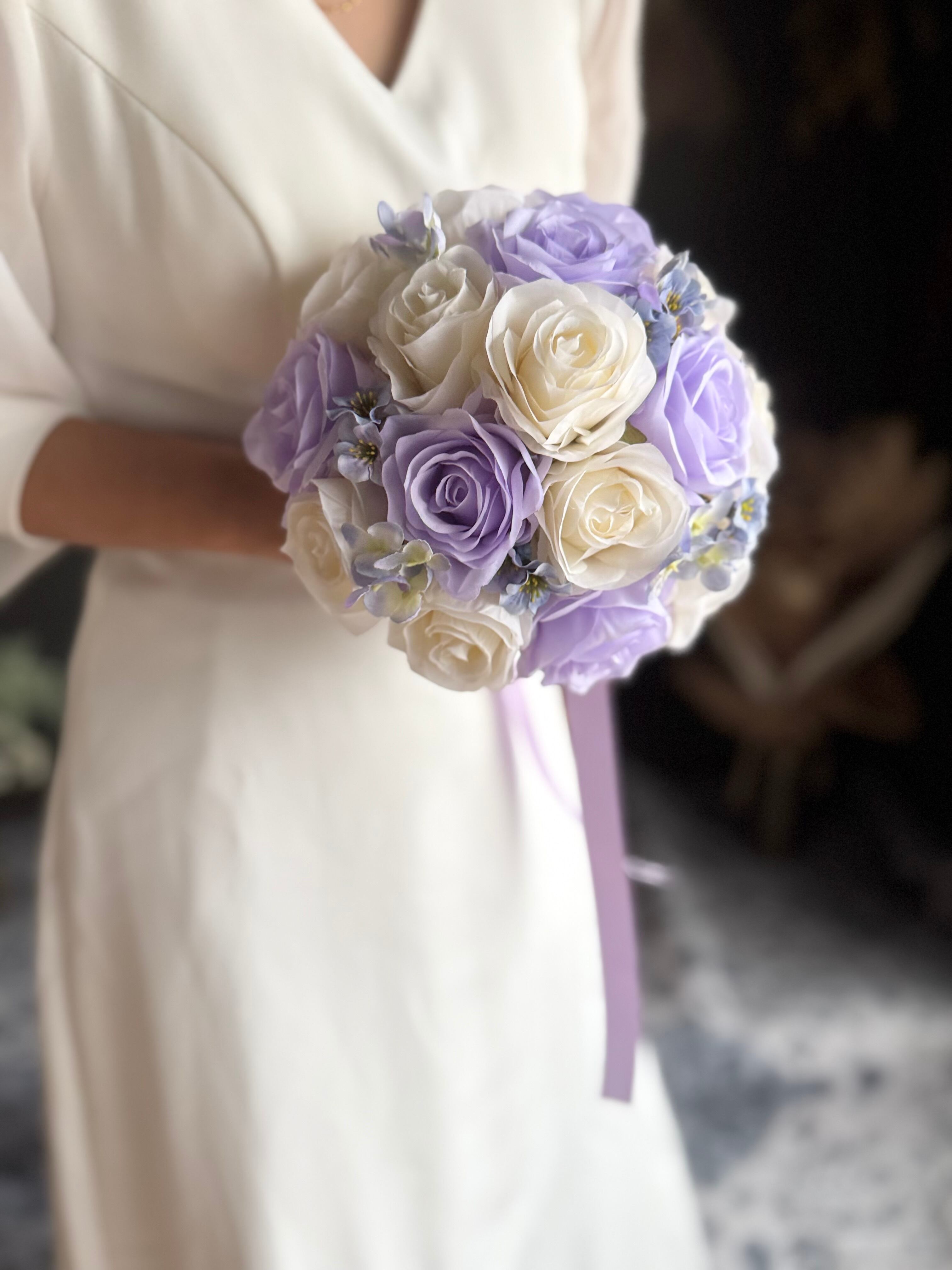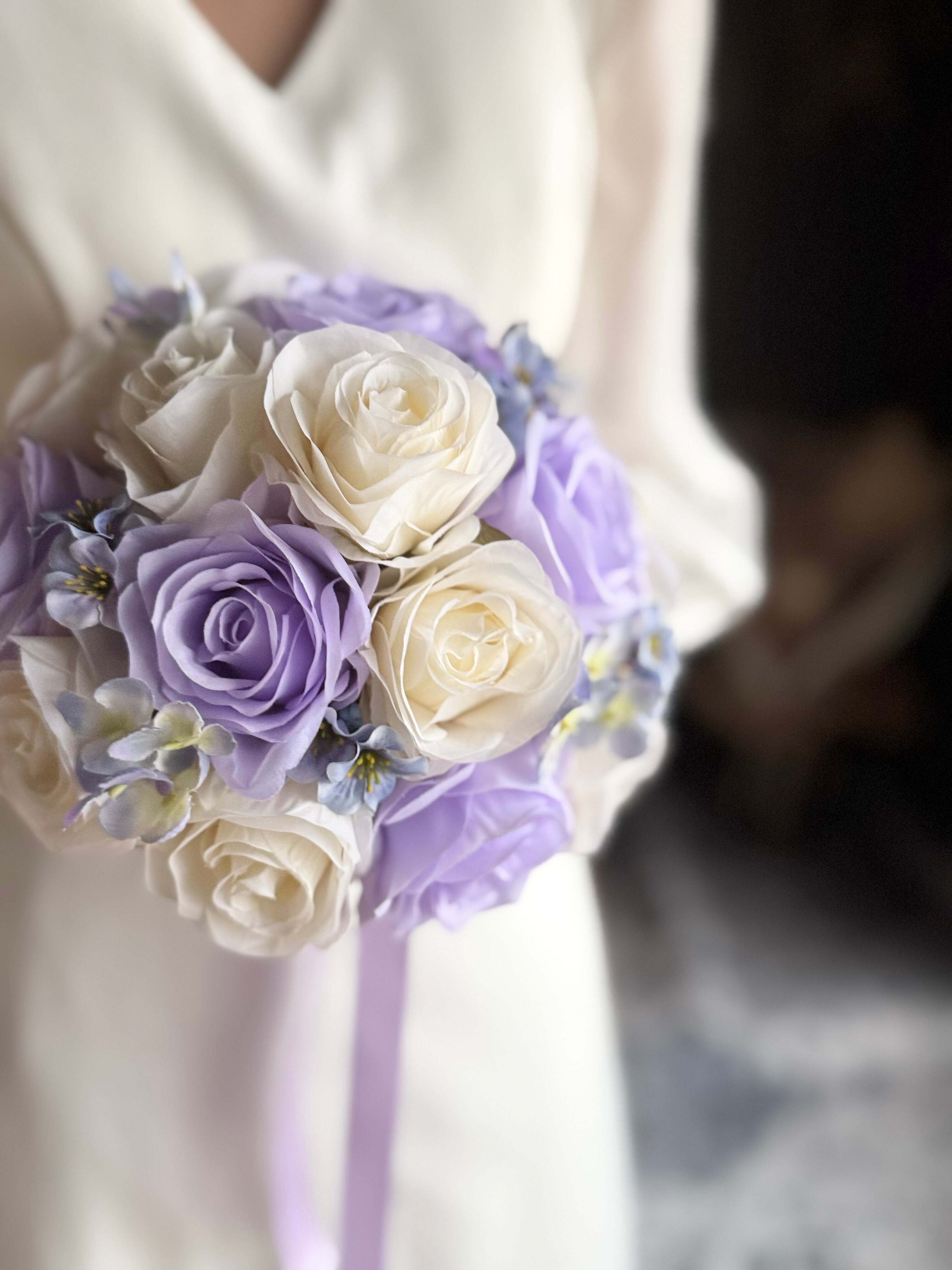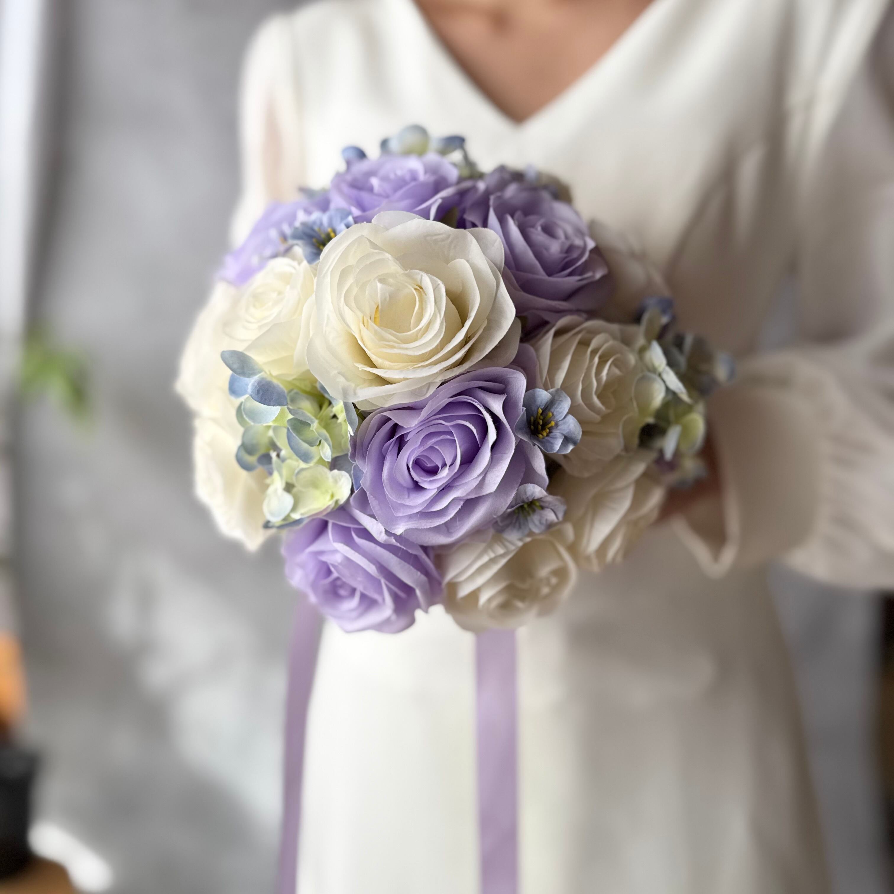 上品なアイボリーと紫を組み合わせたラウンドブーケ•*・ウェディング用ブーケとしても、カラードレス用ブーケとしてもどちらにもお使いいただけます•*・ラベンダー色のリボンが揺れて動きのあるブーケ