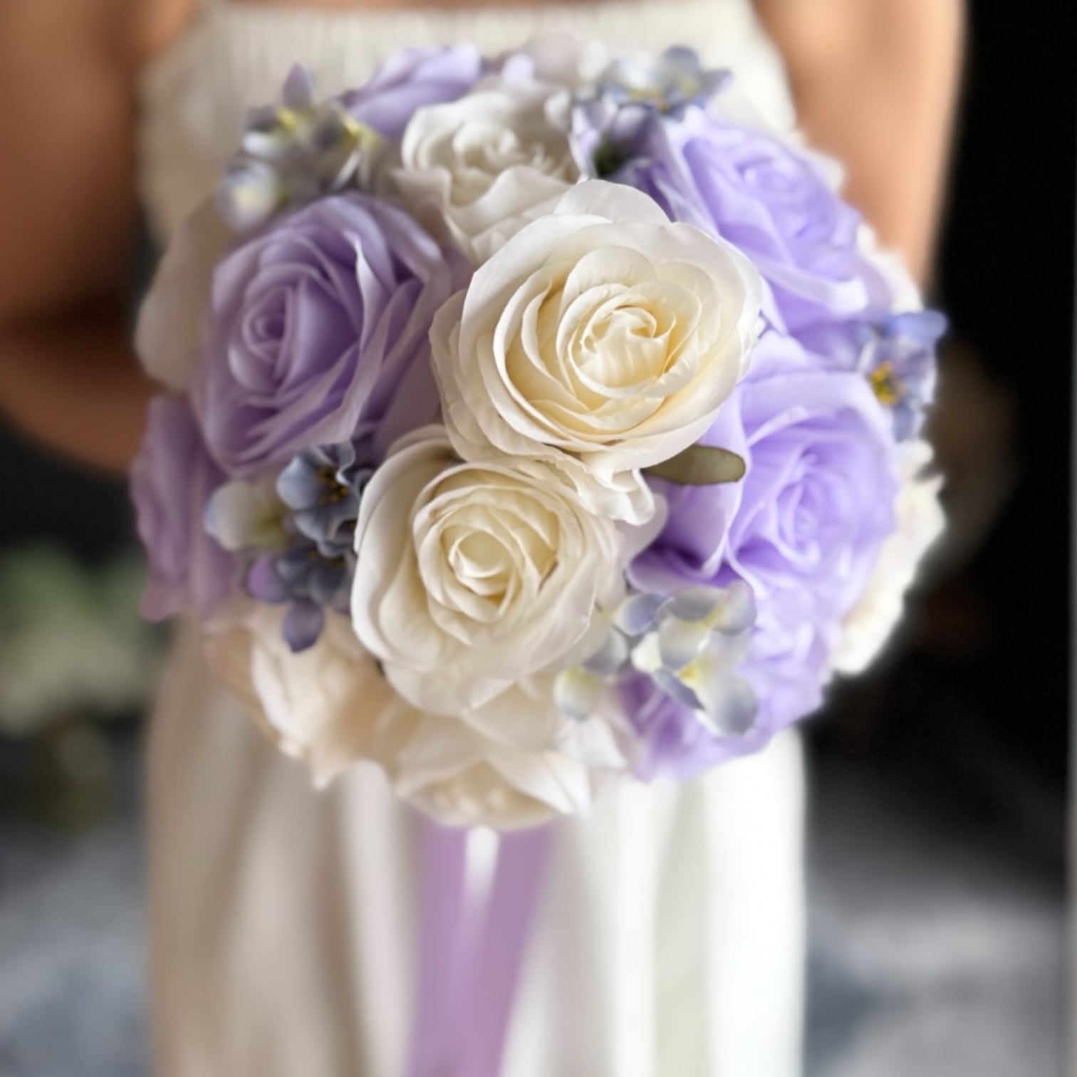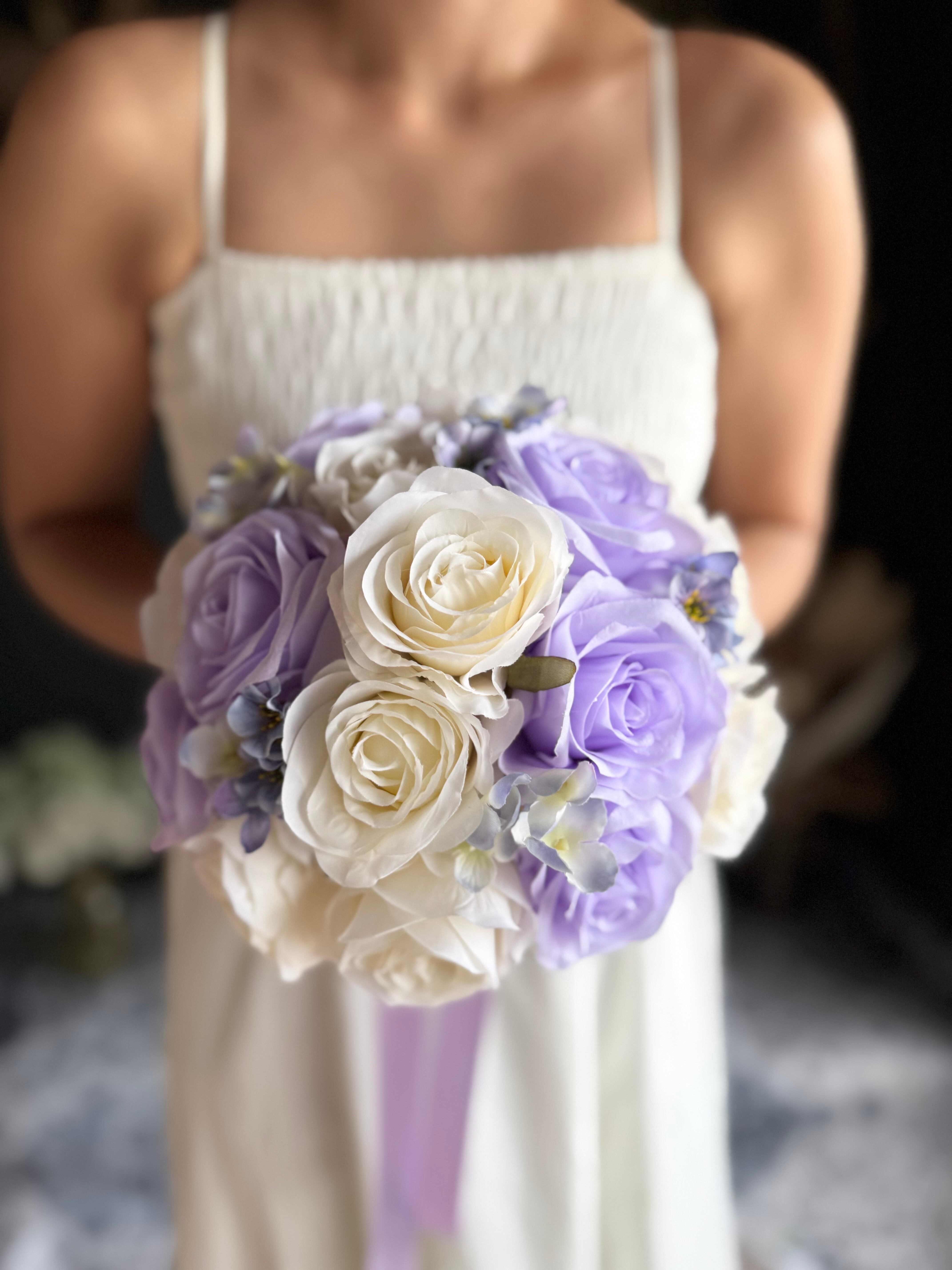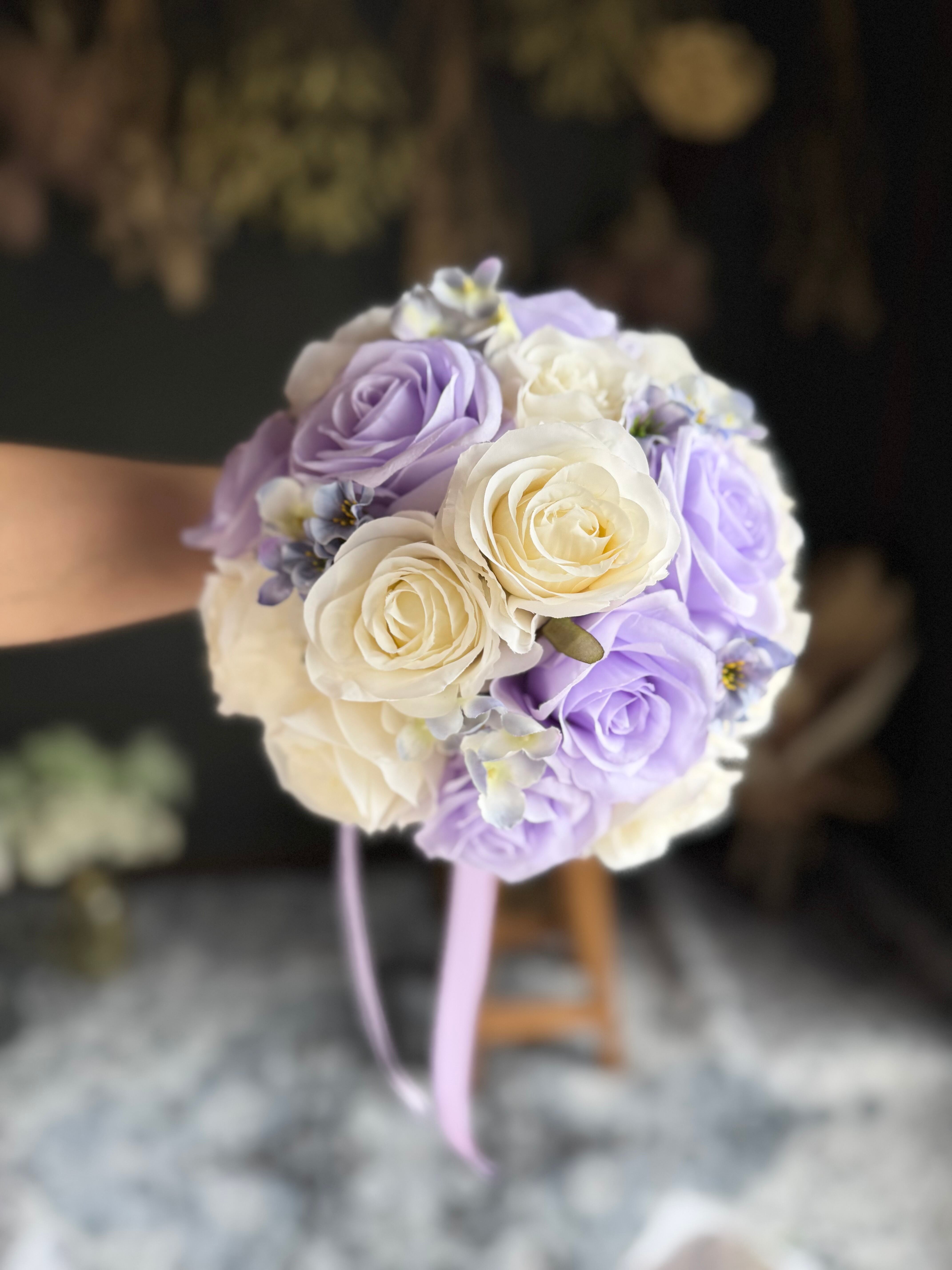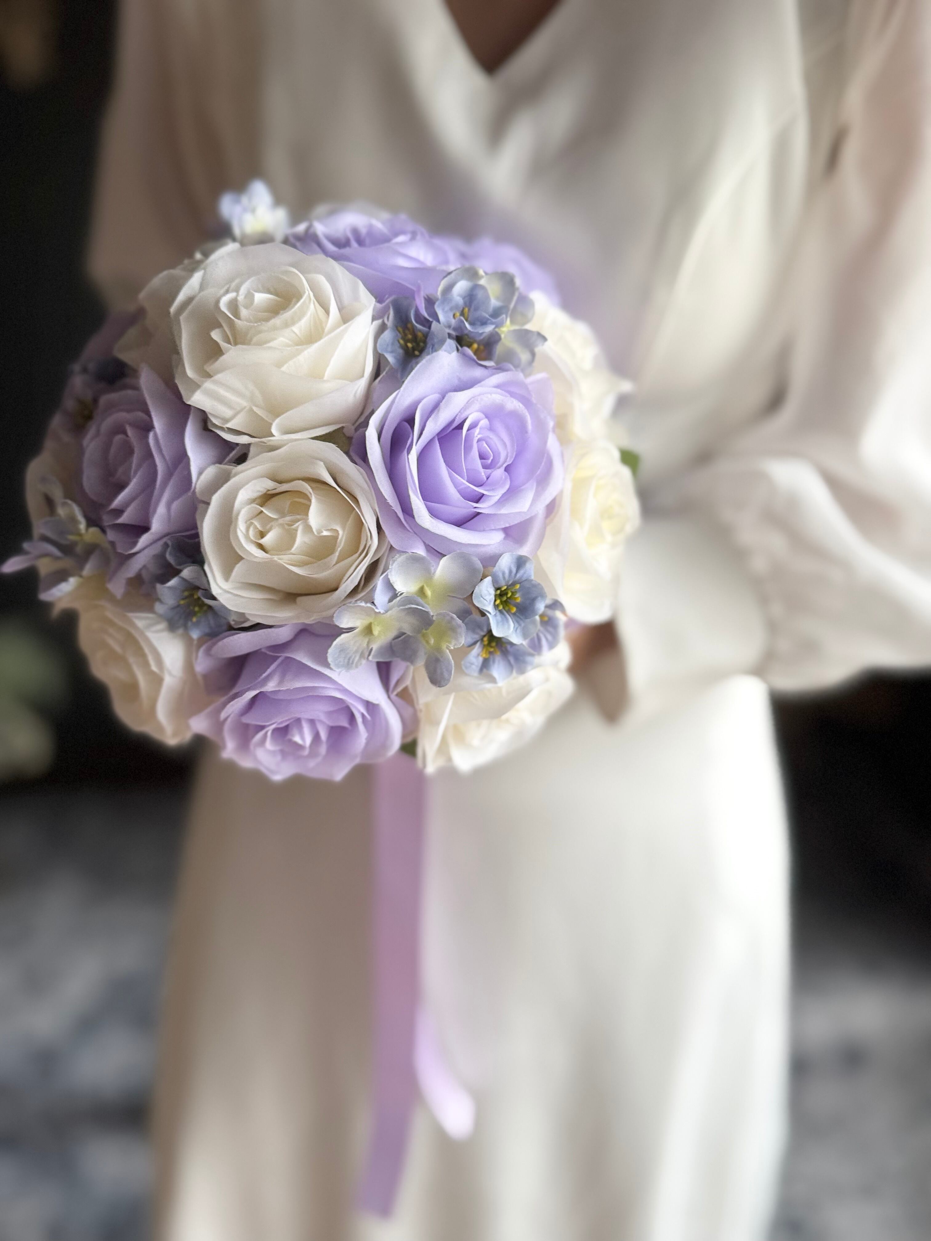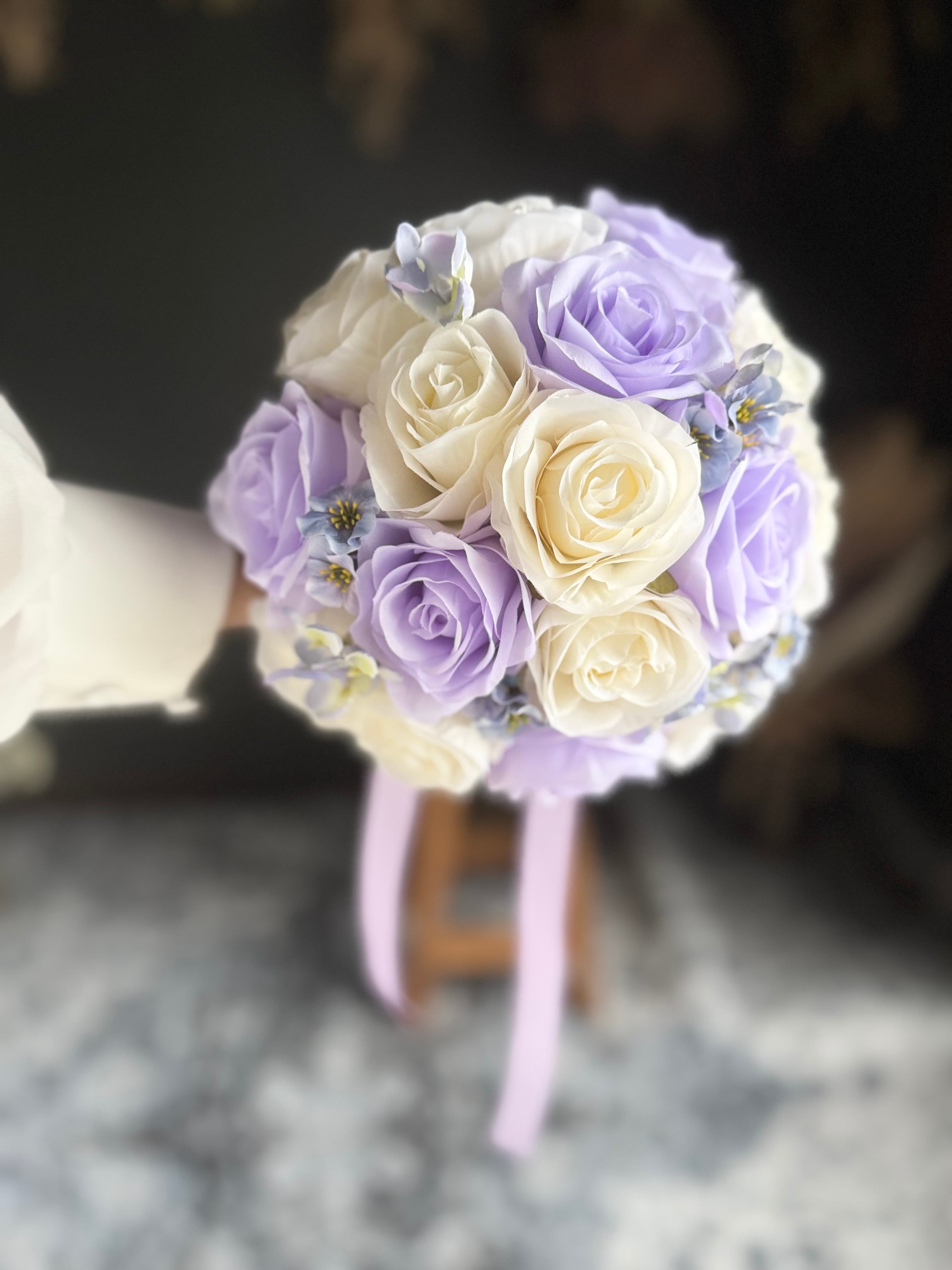 上品なアイボリーと紫を組み合わせたラウンドブーケ•*・ウェディング用ブーケとしても、カラードレス用ブーケとしてもどちらにもお使いいただけます•*・ラベンダー色のリボンが揺れて動きのあるブーケ