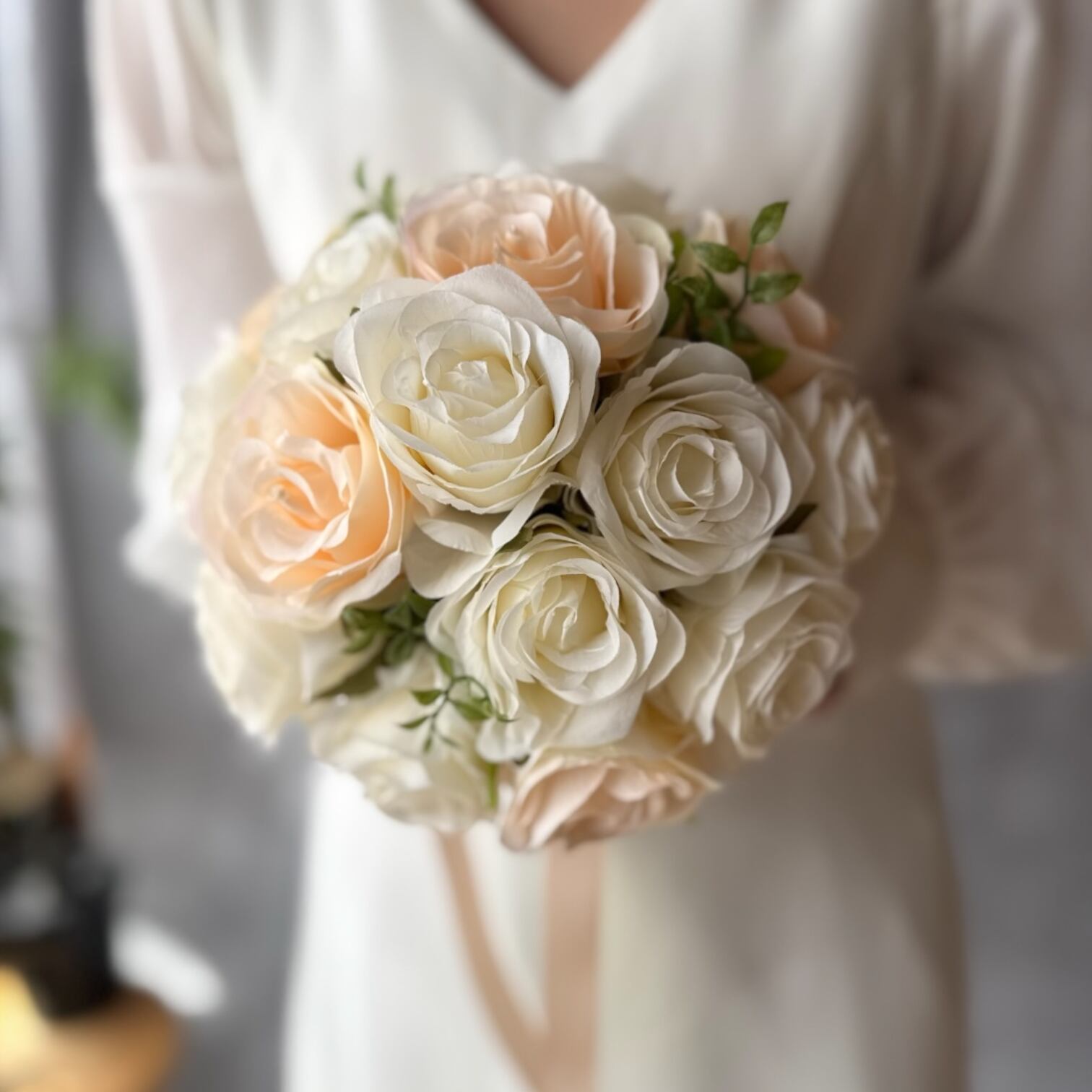 アイボリーとサーモンピンクのバラが優雅に絡み合い、上品さと可愛らしさを演出します⁽⁽٩(๑˃̶͈̀ ᗨ ˂̶͈́)۶⁾⁾