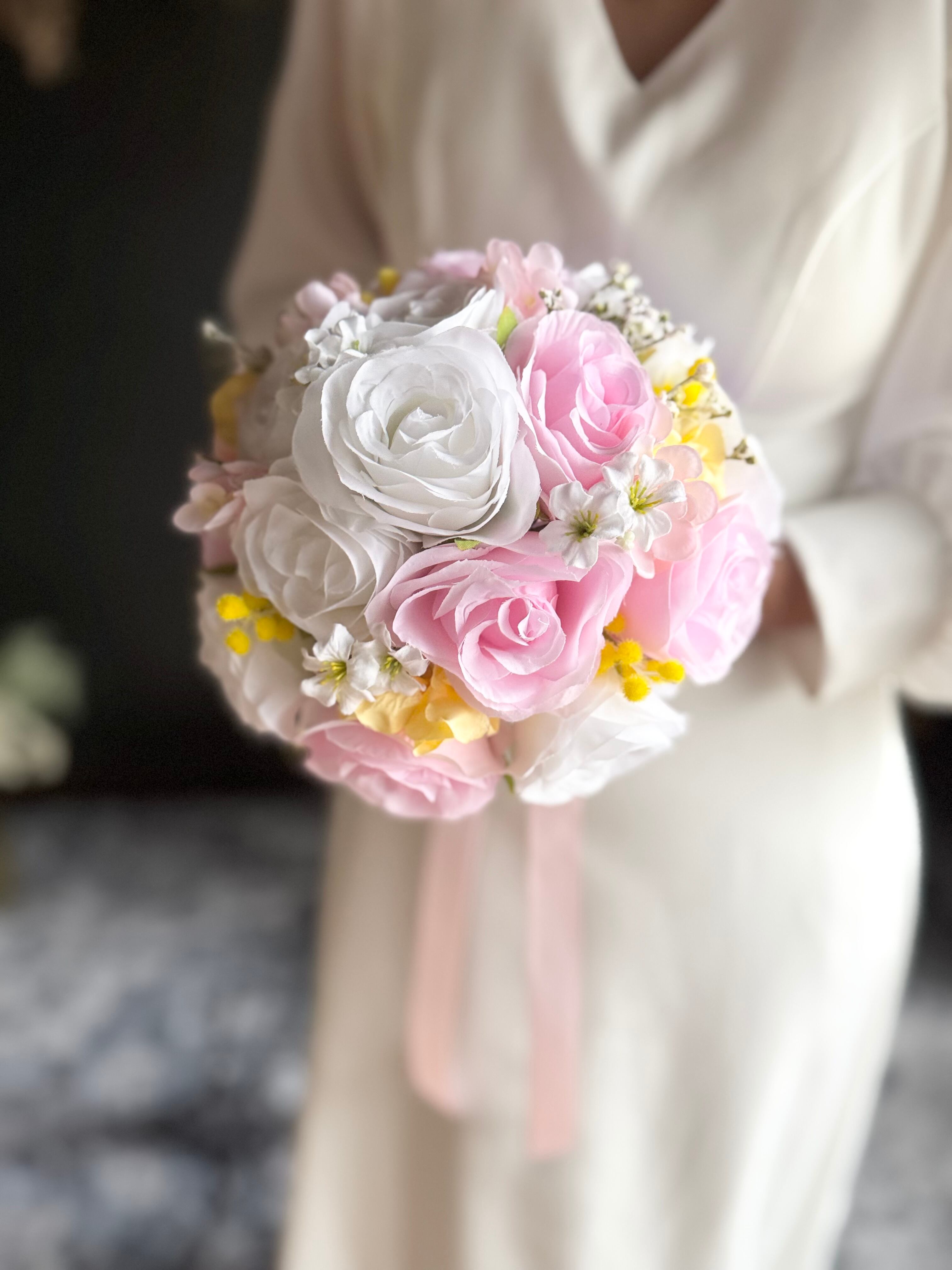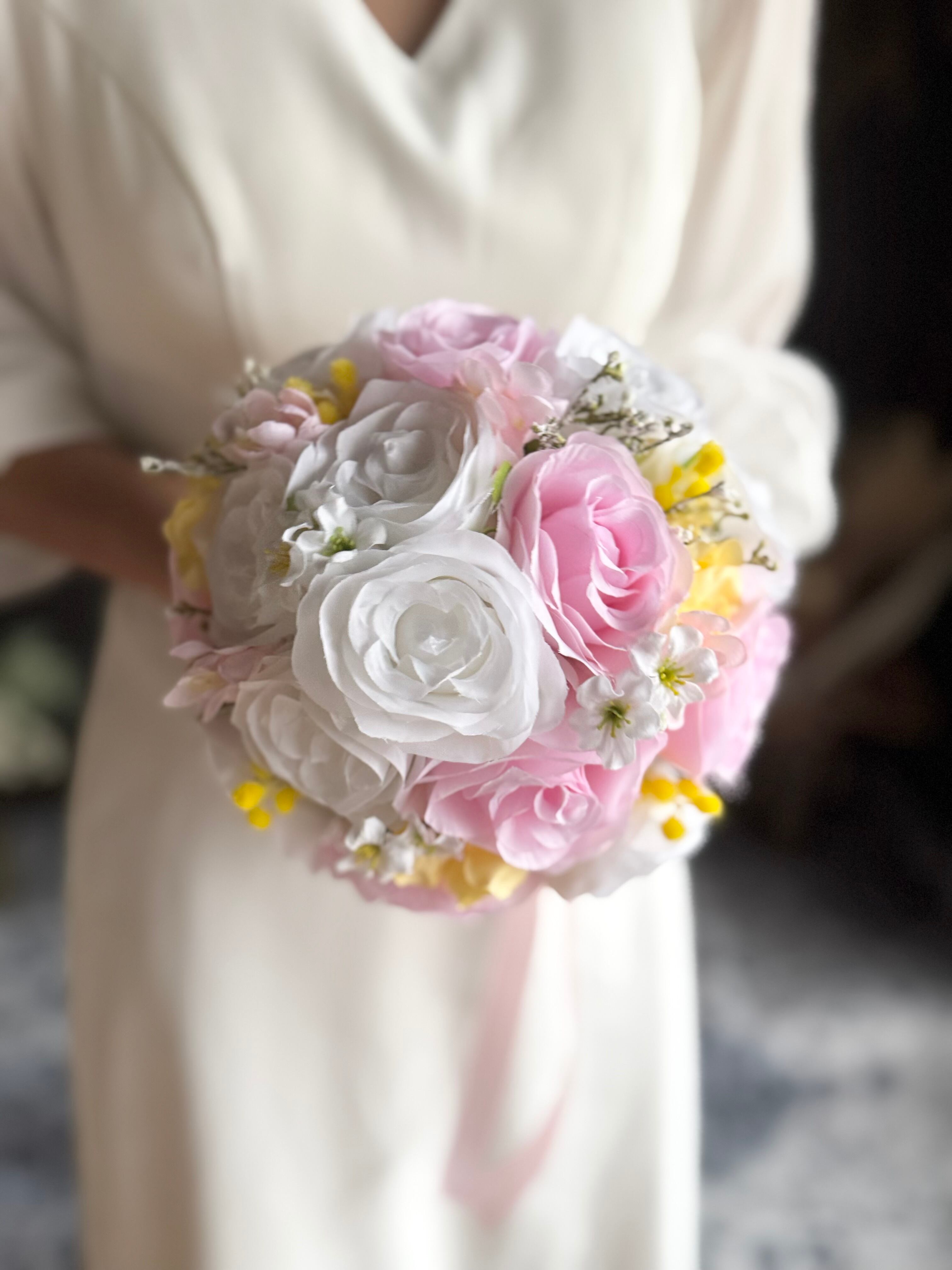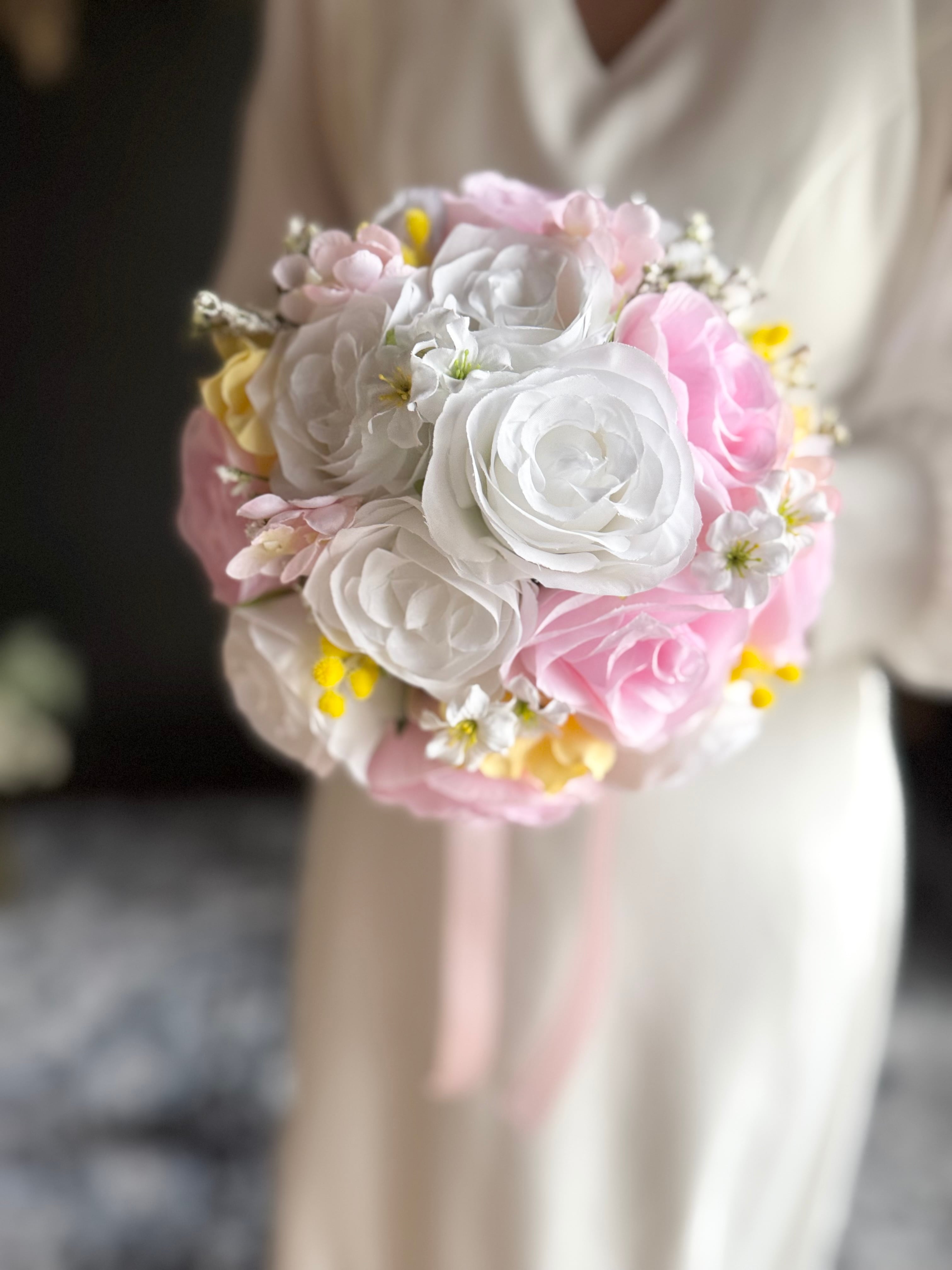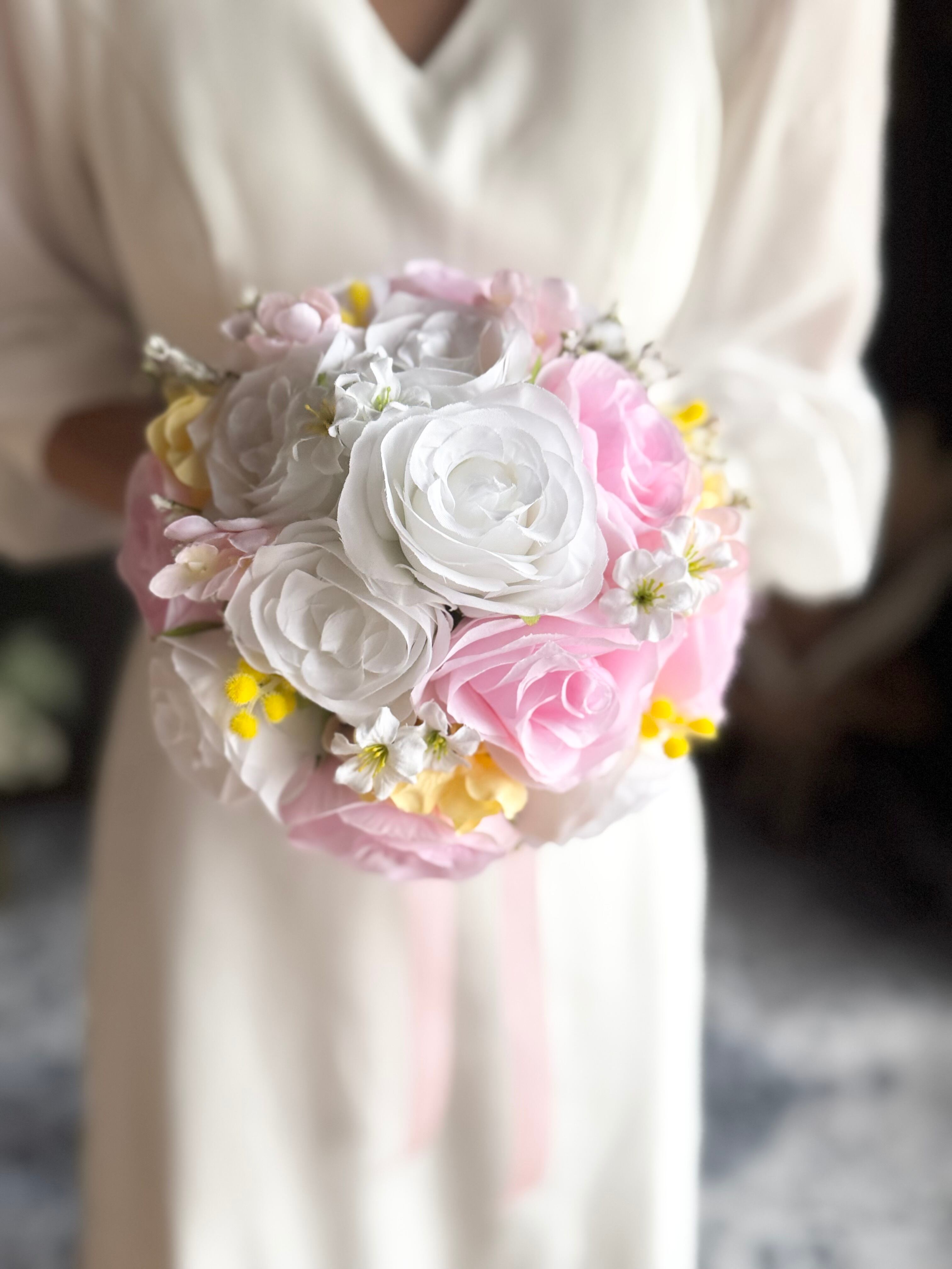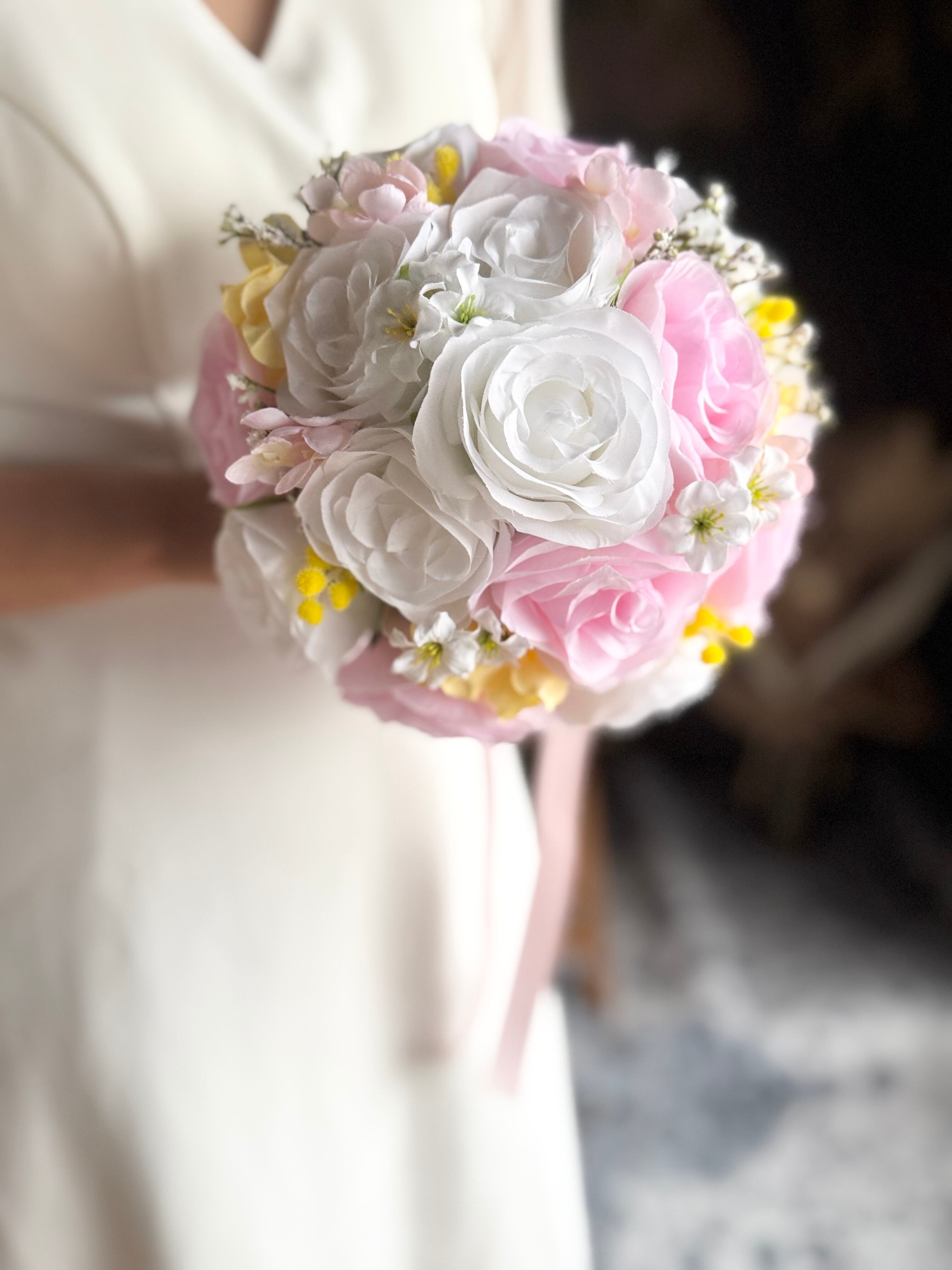 ホワイトベースに淡いピンクと黄色のミモザをアクセントに入れた可愛いウェディングブーケ•*・