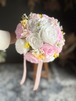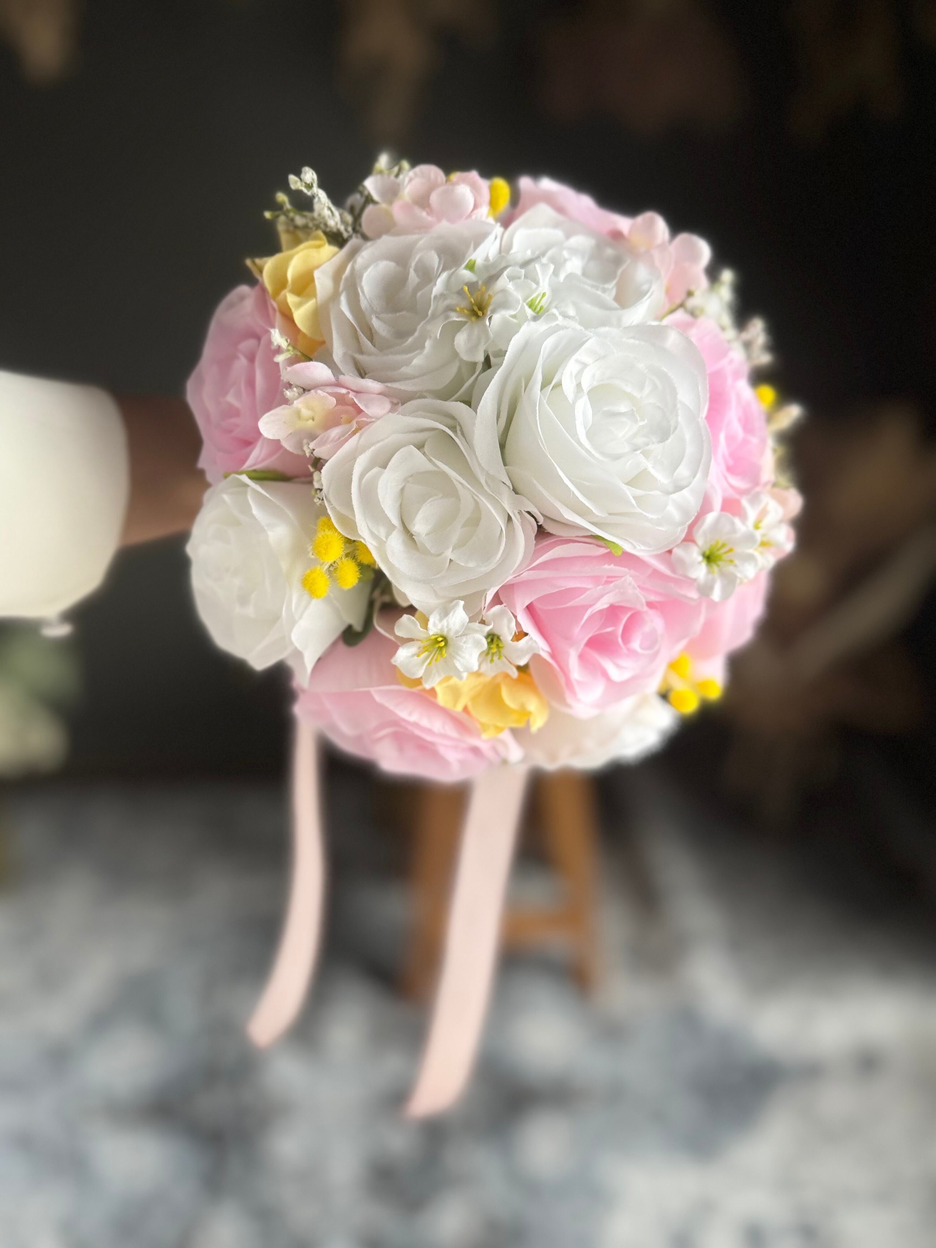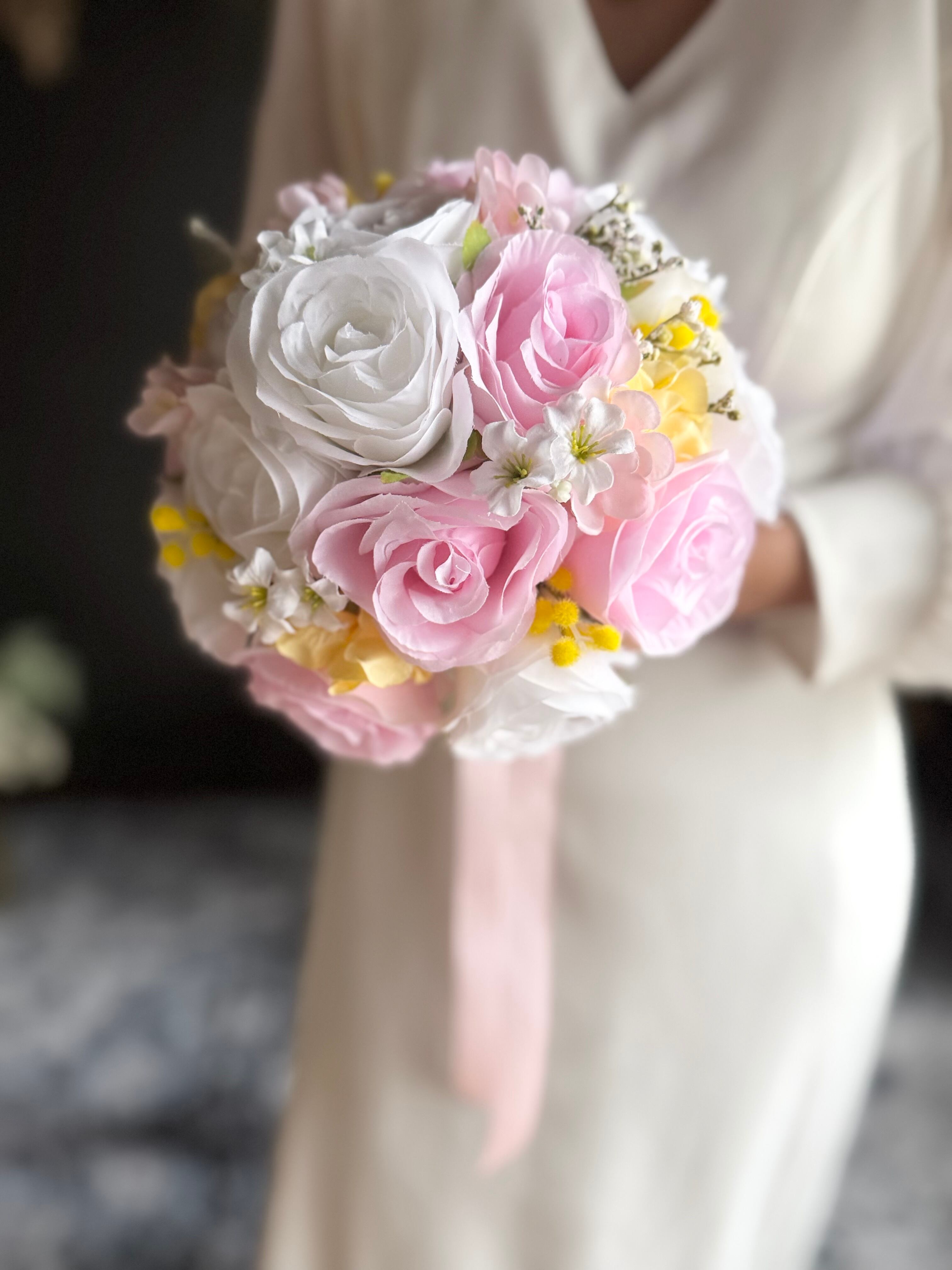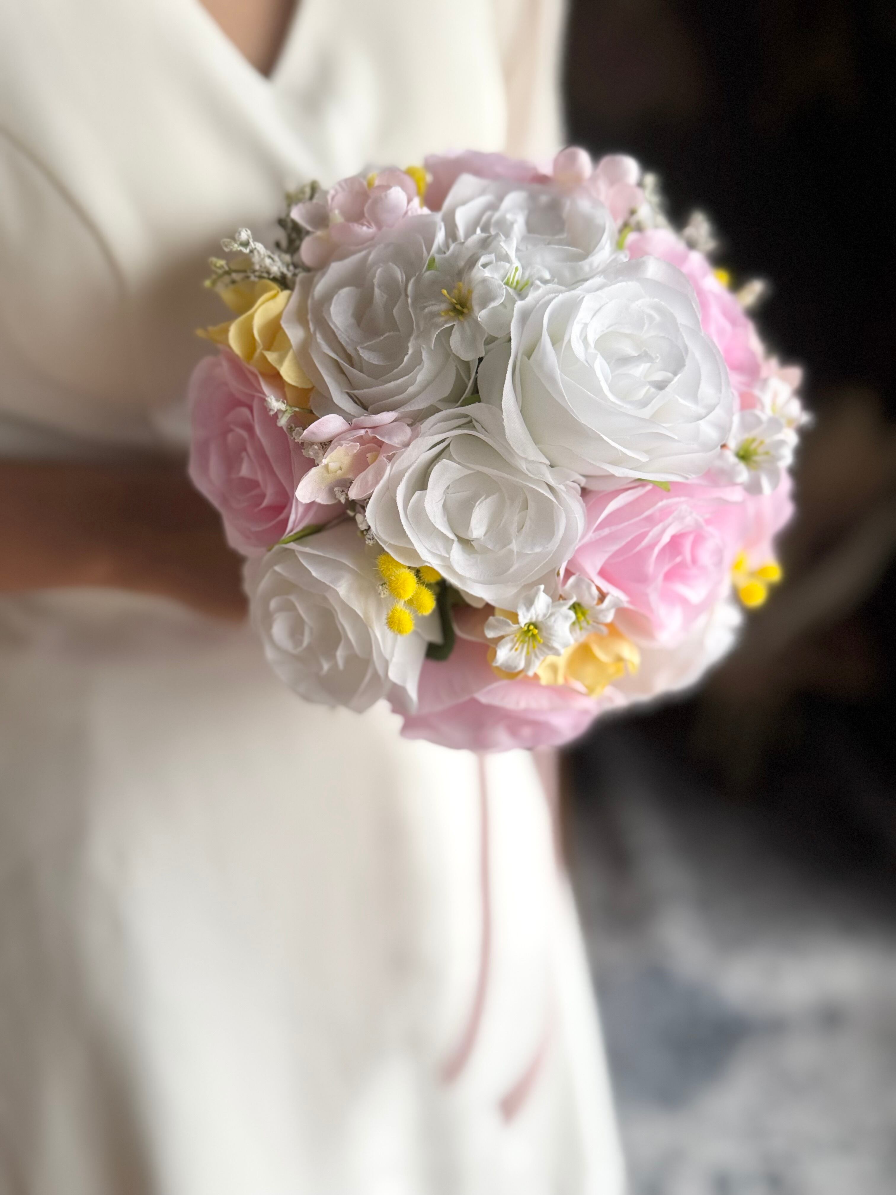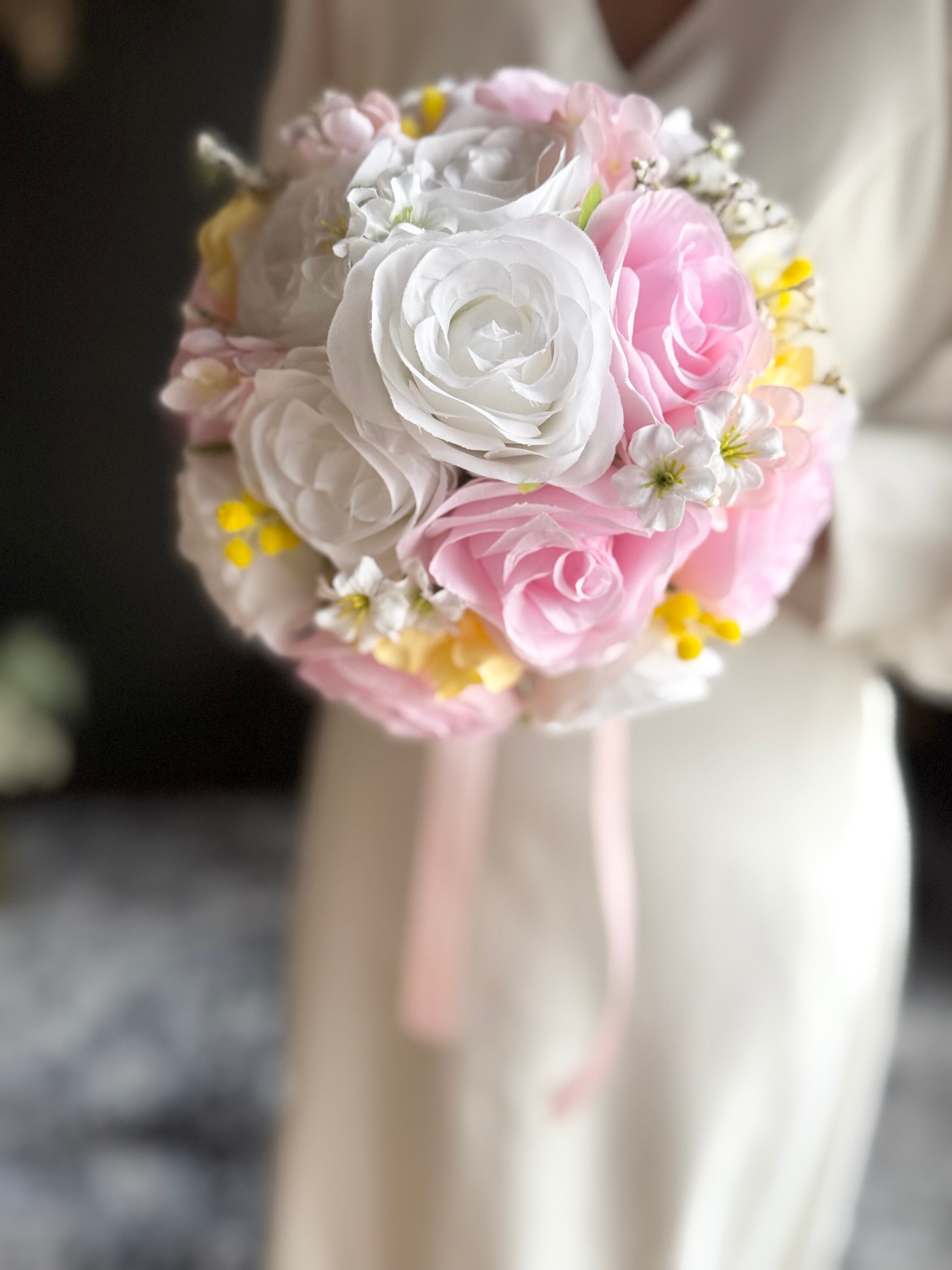 ホワイトベースに淡いピンクと黄色のミモザをアクセントに入れた可愛いウェディングブーケ•*・