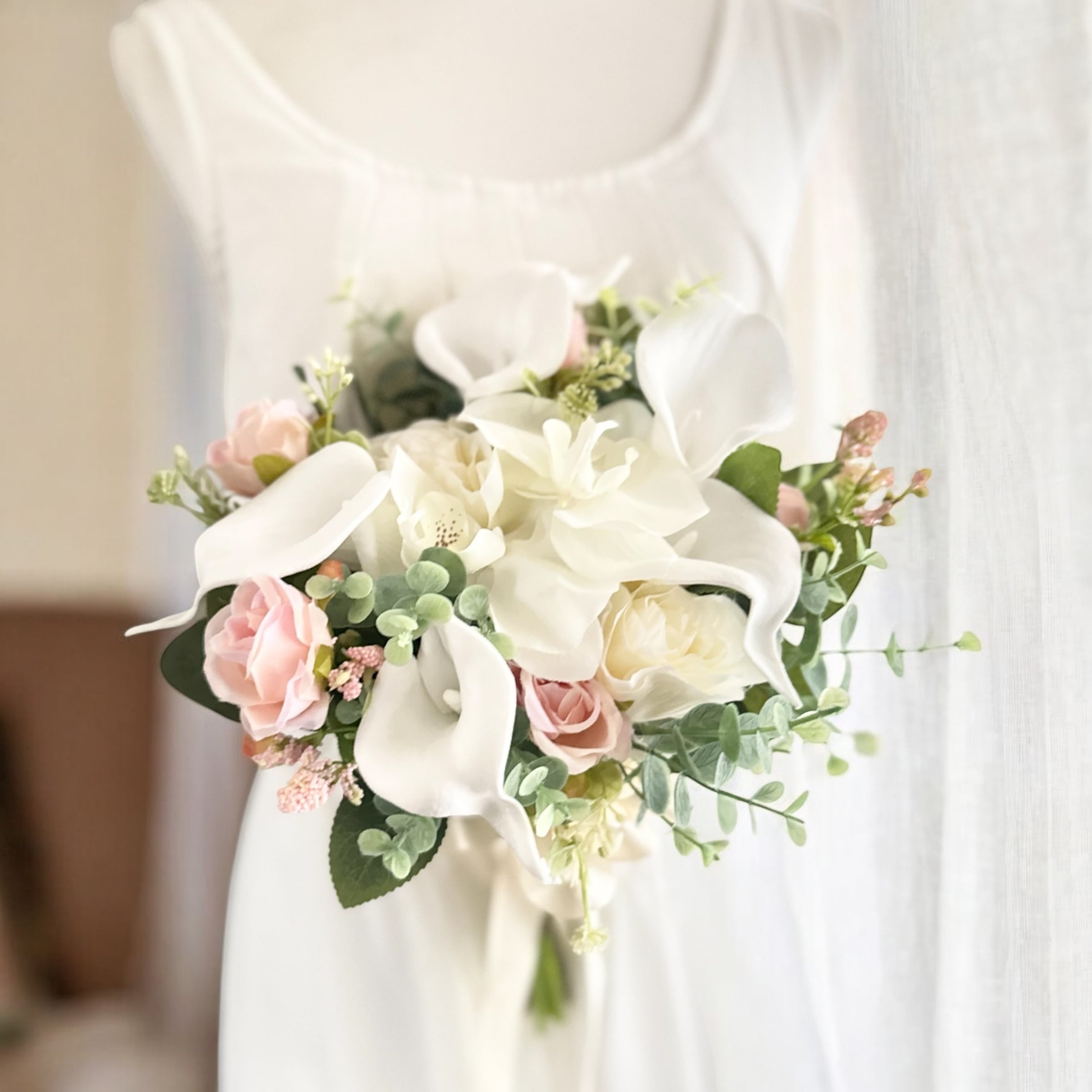 淡いピンクのバラに上品なカラーや胡蝶蘭を合わせて可愛くなりすぎない大人可愛いクラッチブーケ•*・