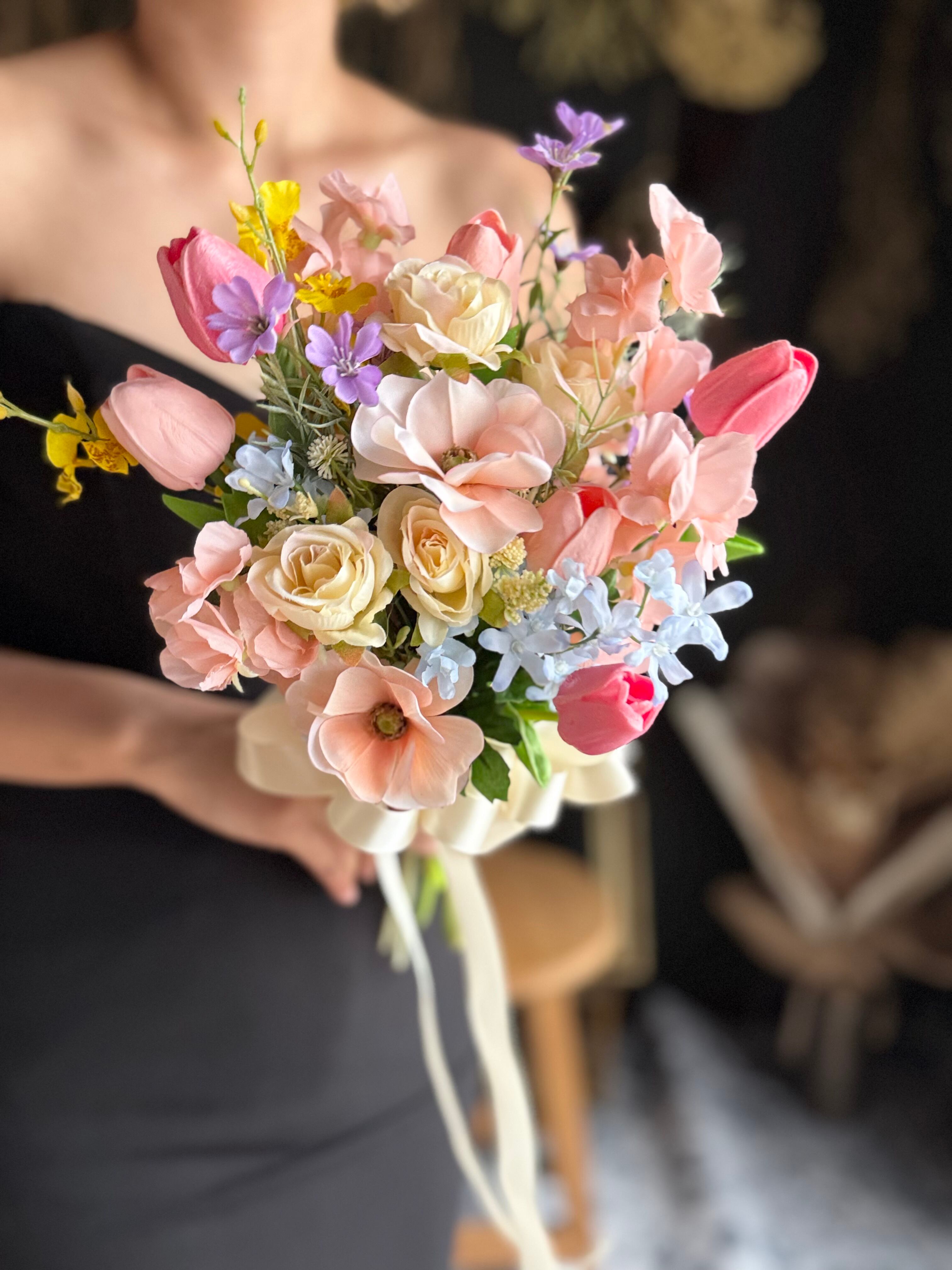 ピンクチューリップ にブルー系の小花やサーモンピンクのお花などの花材を組み合わせたカラフルが魅力的なデザインが特徴です。特別な日をさらに引き立てる、華やかなで可愛いウェディングブーケです•*・