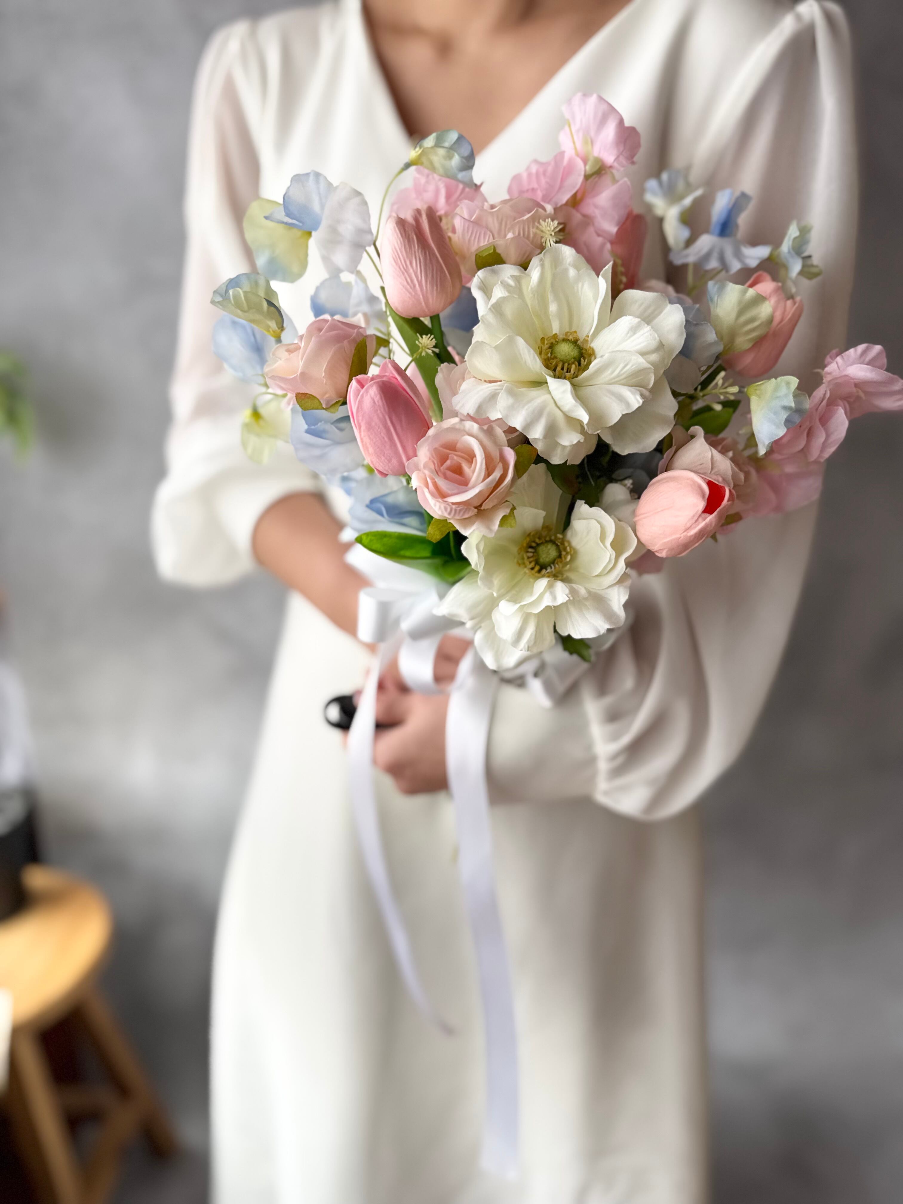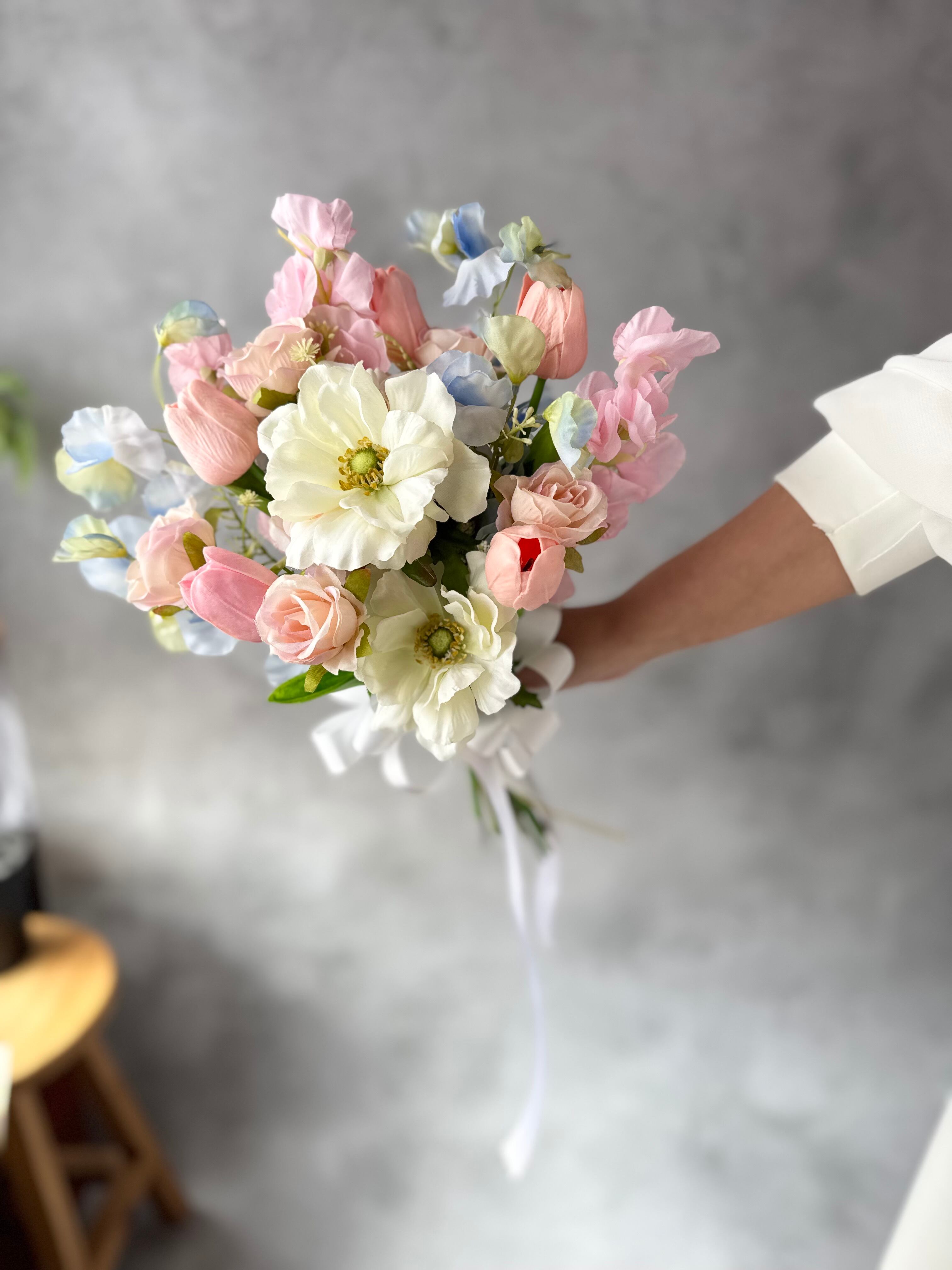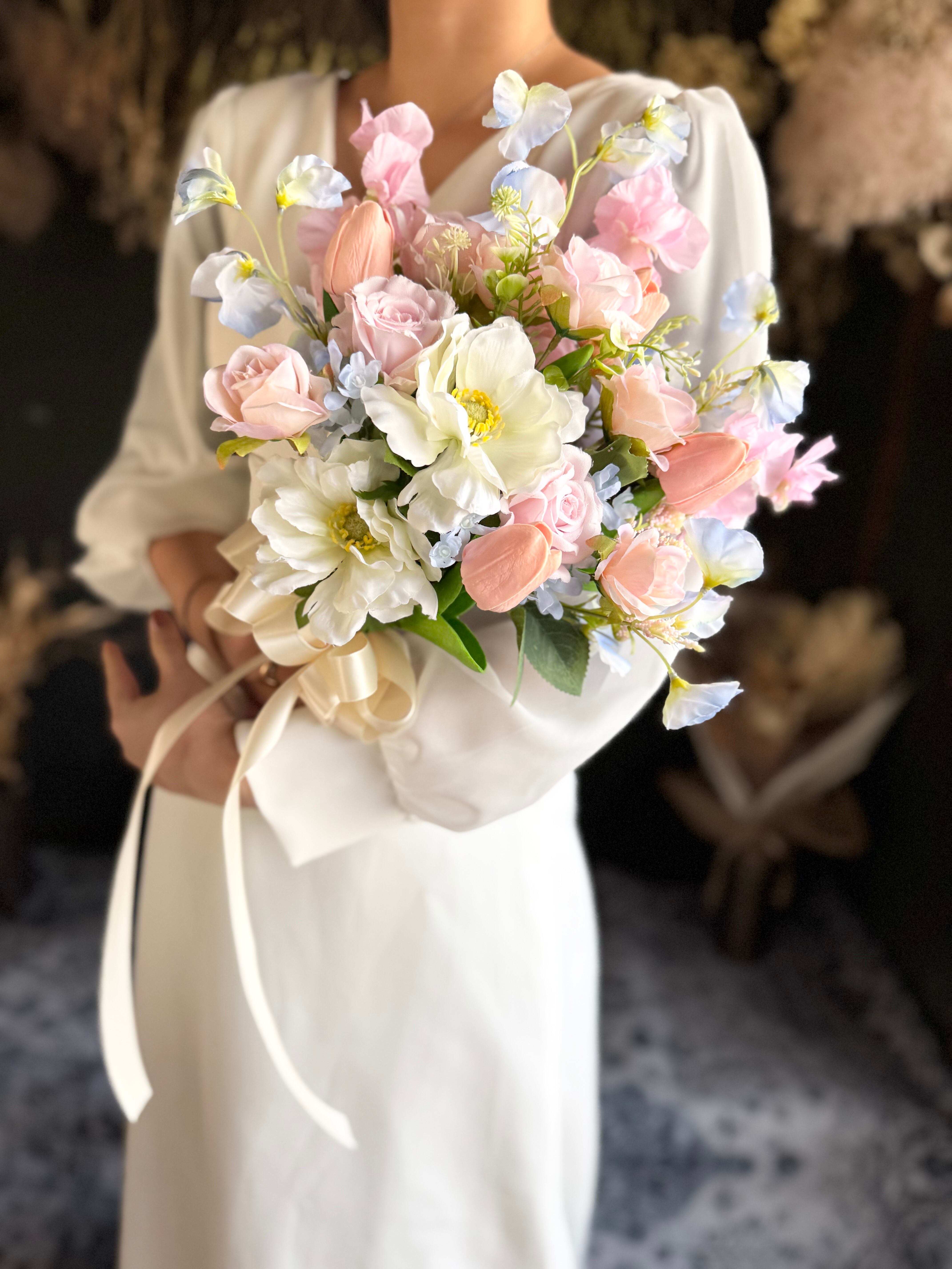 ピンクと白、水色の色合わせでスイートピーや可愛い小花の花材を組み合わせた魅力的なデザインが特徴です。特別な日をさらに引き立てる、上品で華やかなウェディングブーケです•*・