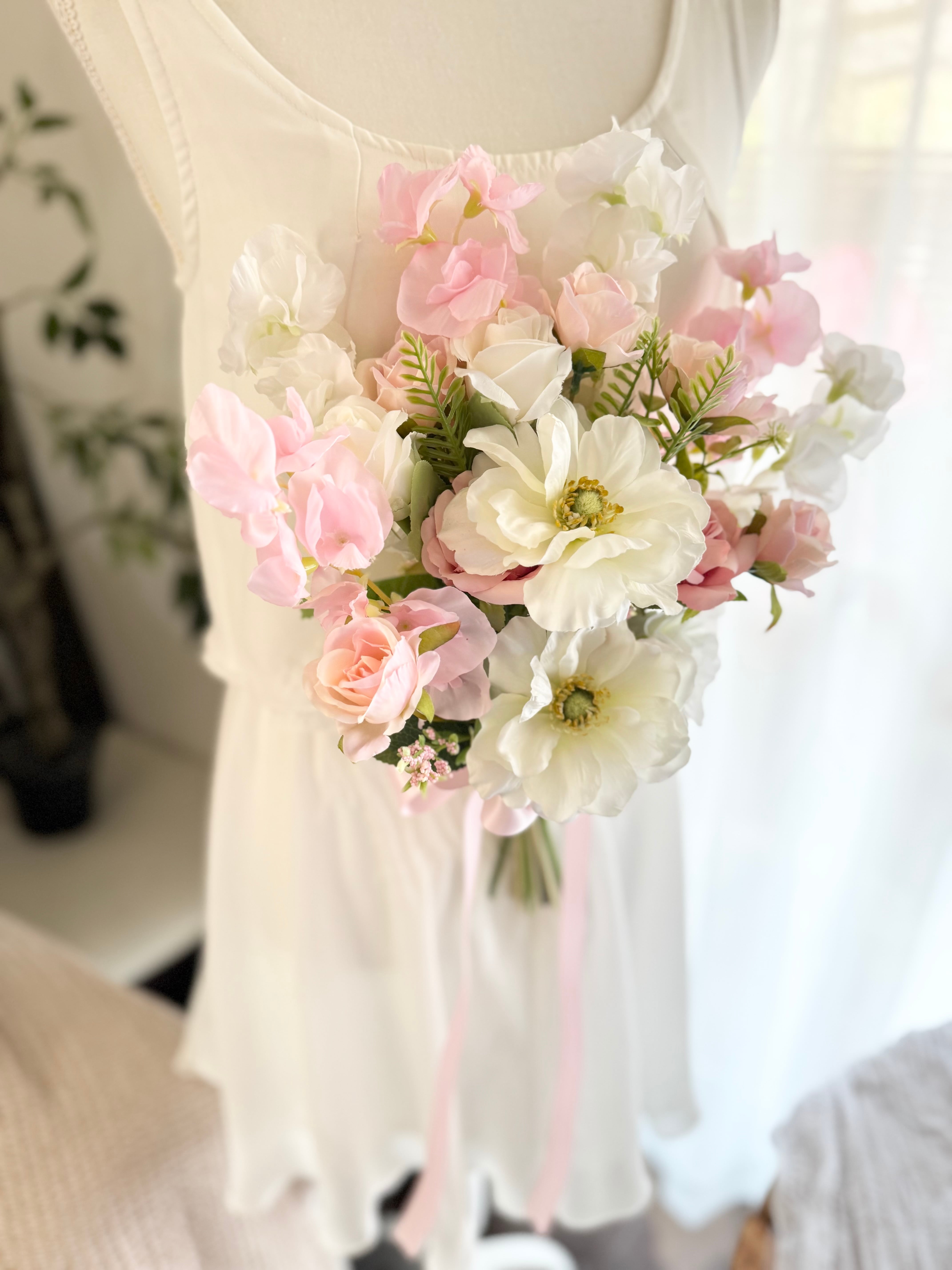 こちらのクラッチブーケは、ピンクのお花やアネモネのお花たち使用した、華やかでふわふわ可愛いデザインです!結婚式や前撮り、様々なイベントでお使いいただけます♪ ^