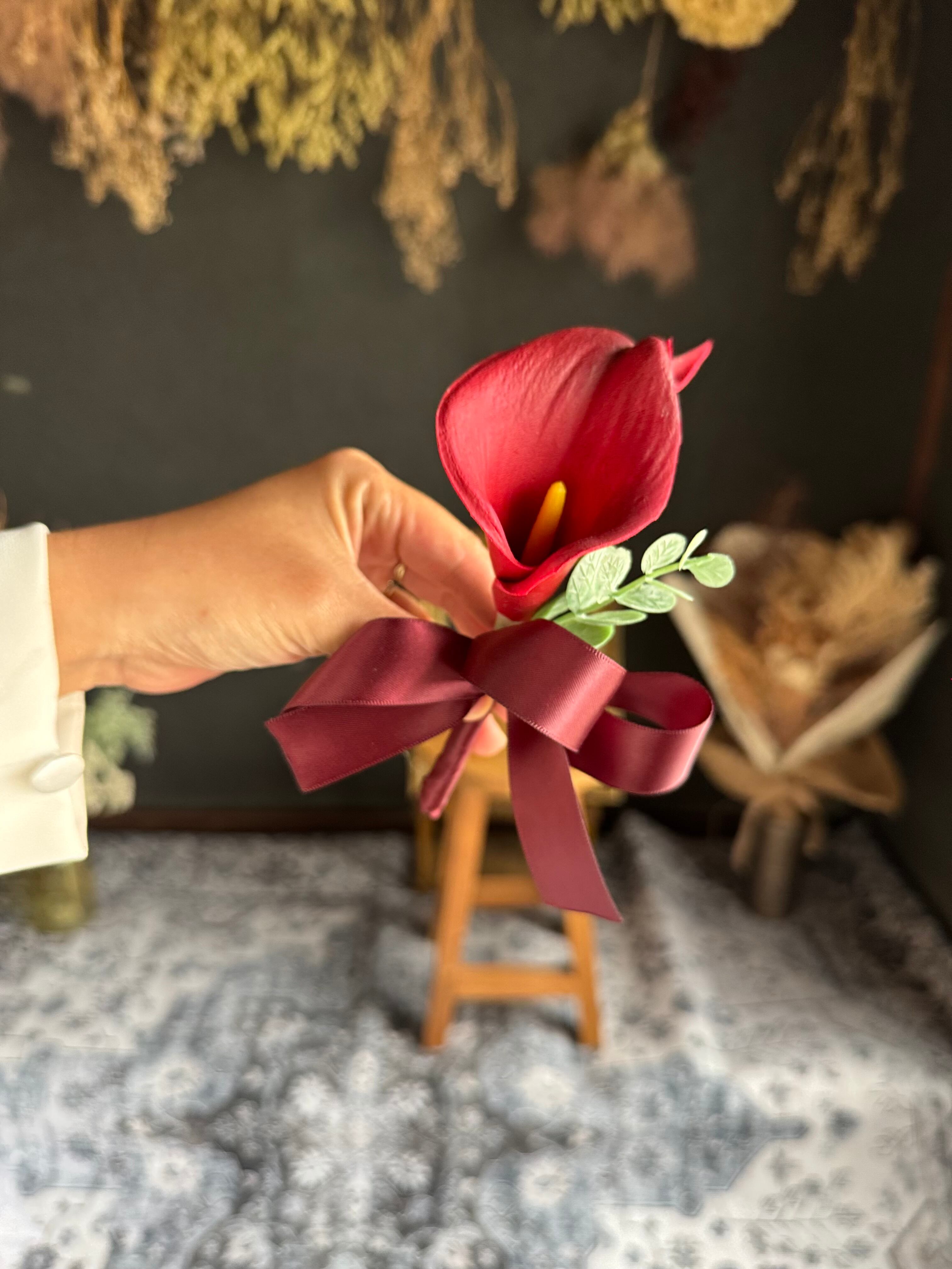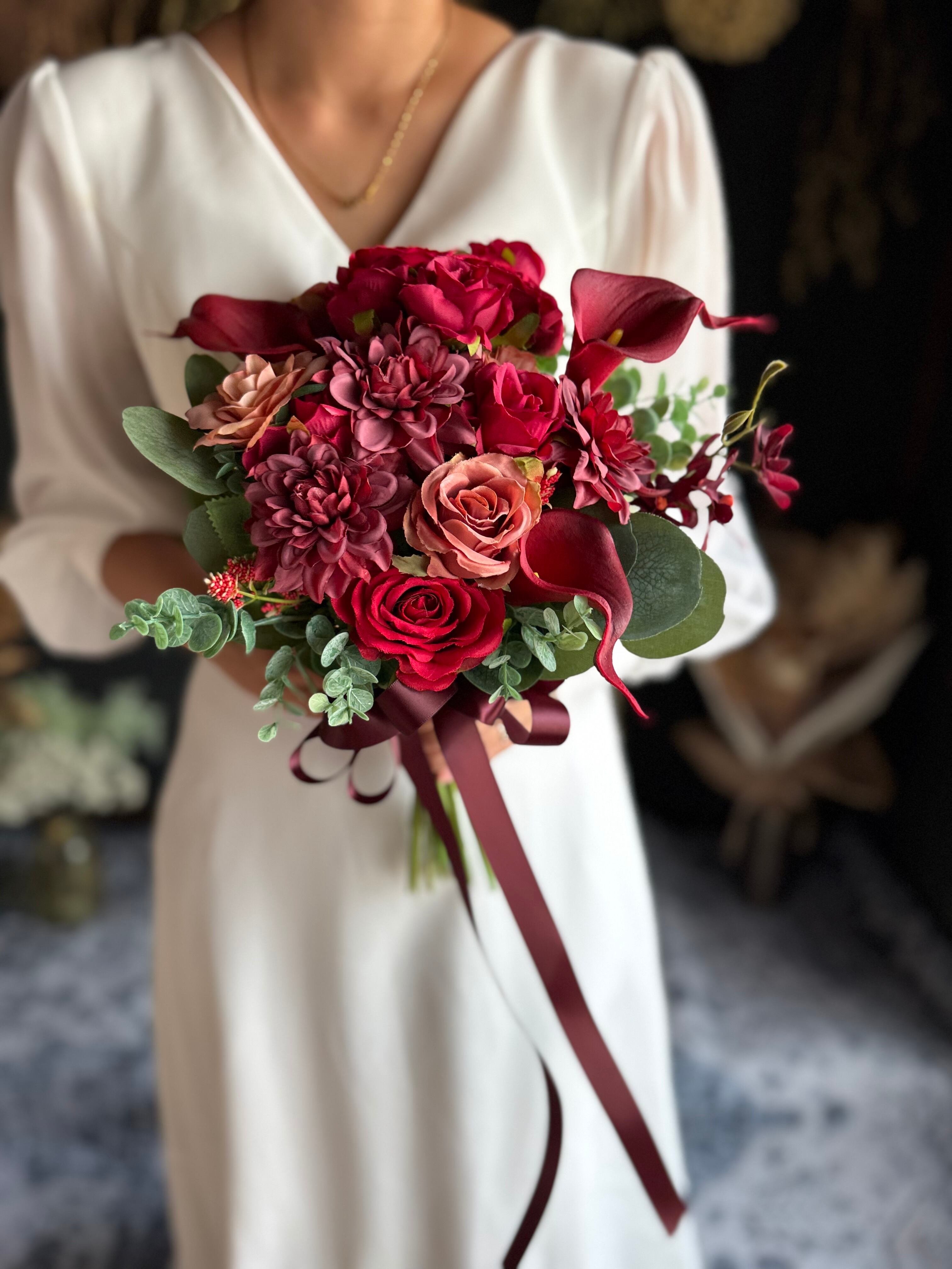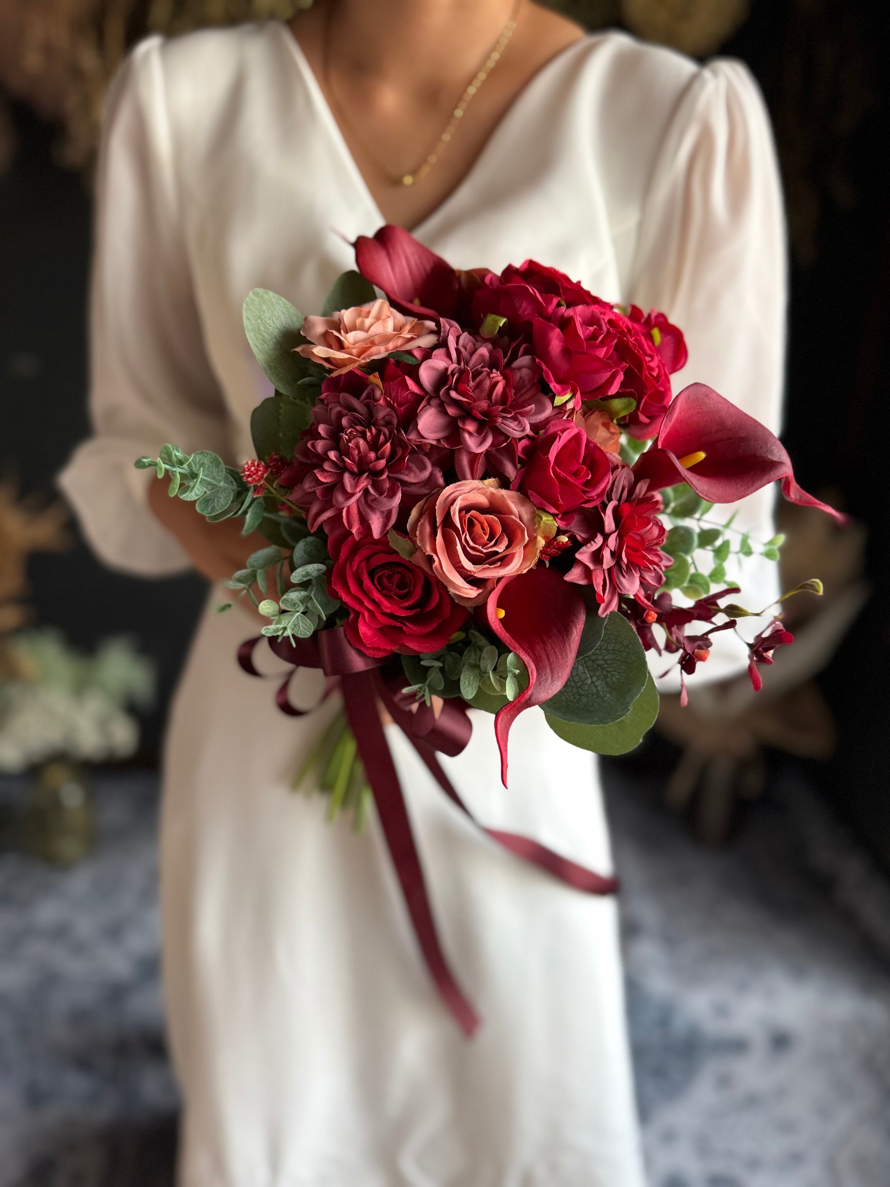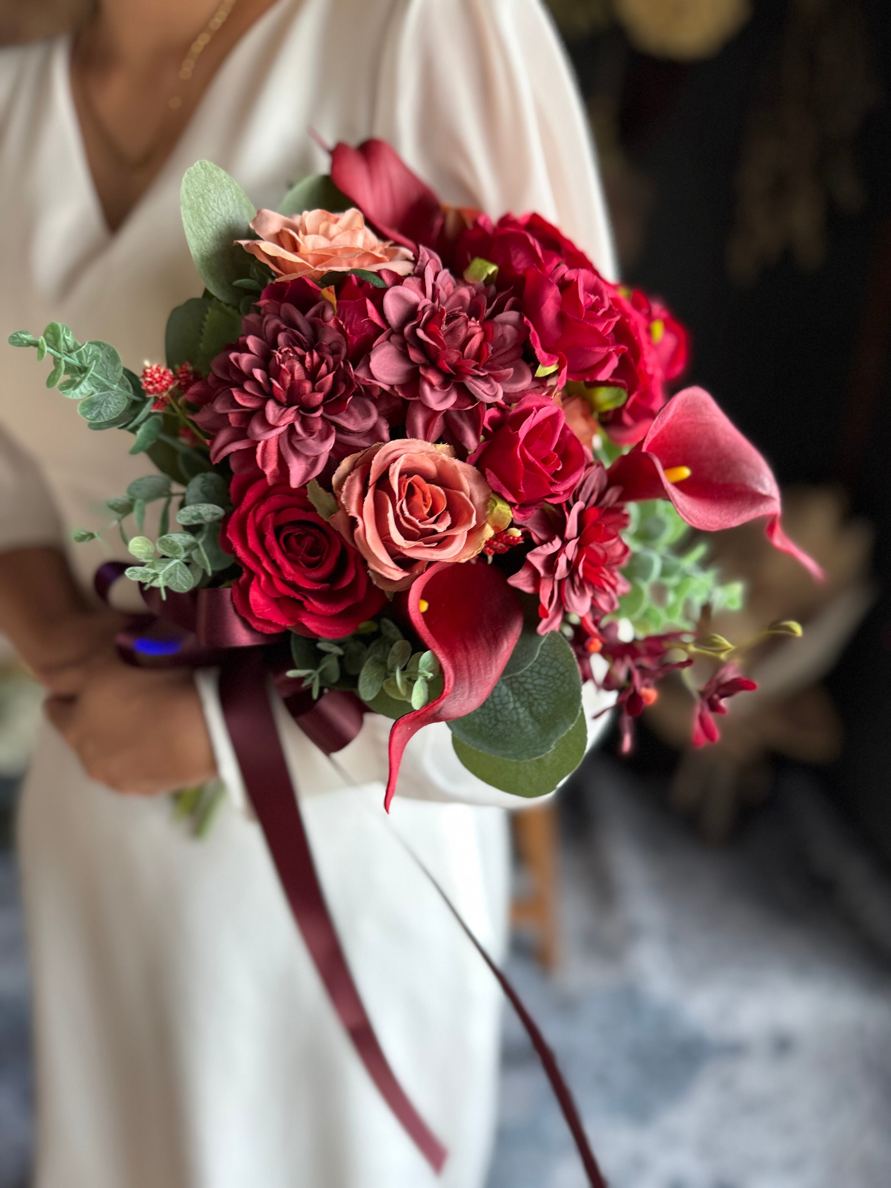 赤いバラを中心に、ダリアやカラーを組み合わせた上品なブーケ•*・リボン色の変更も可能です•*・ドレスに合わせてネイビーや黒リボンも似合います•*・