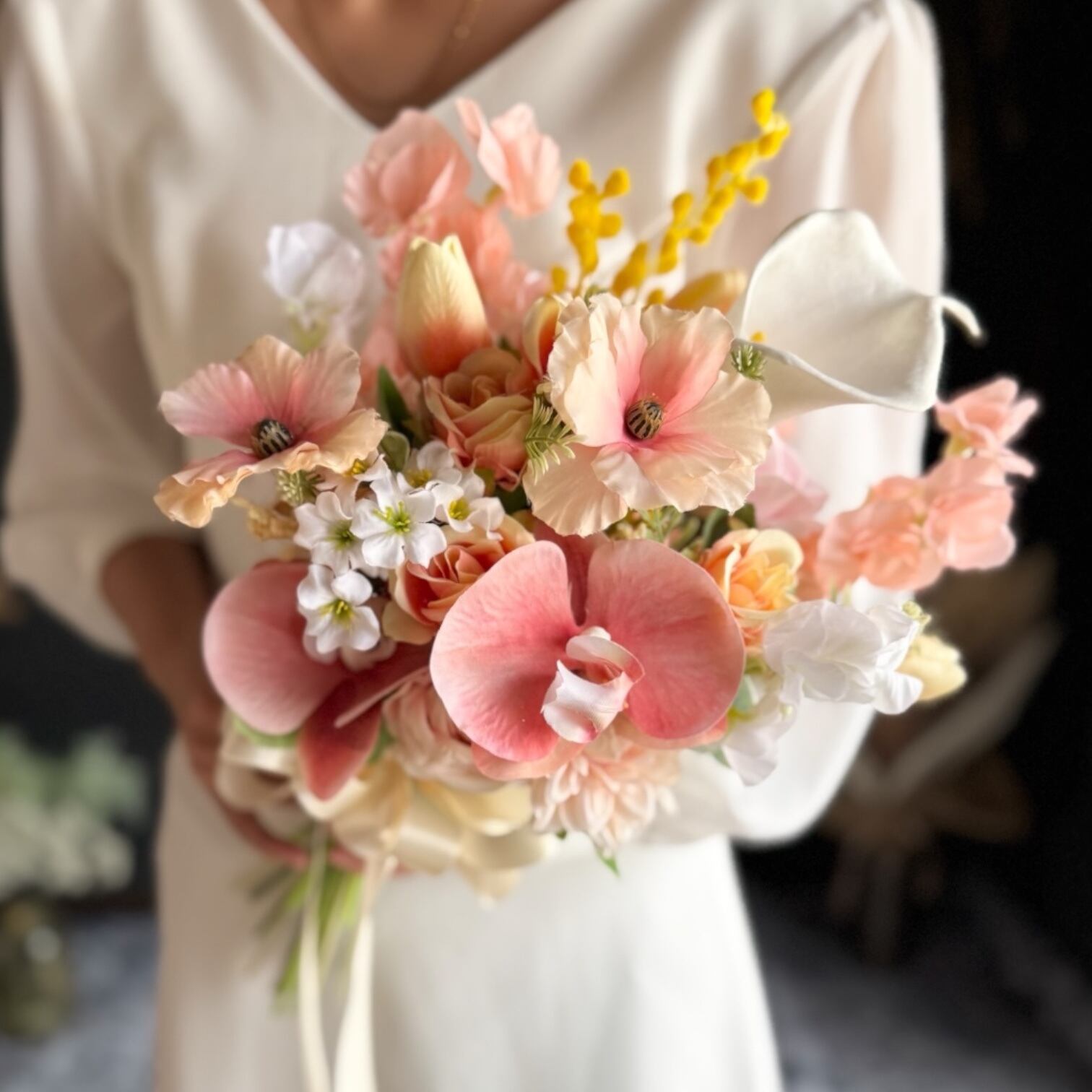 アプリコットピンクを主役に、爽やかな黄色やホワイト、サーモンピンクなど柔らかい色味を束ねたナチュラルブーケ•*・