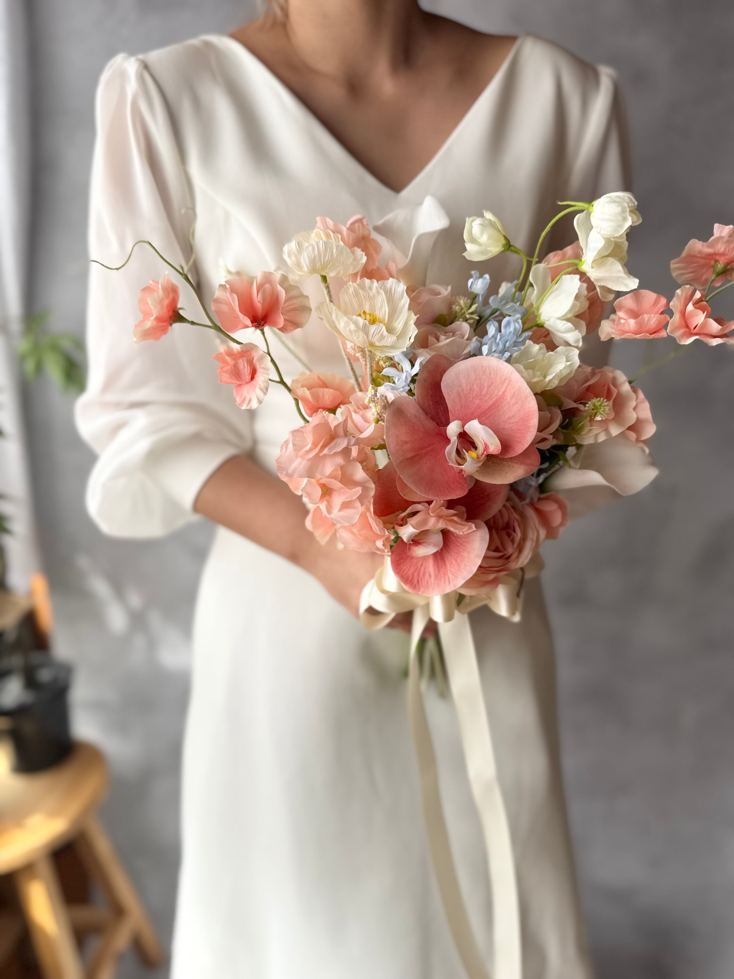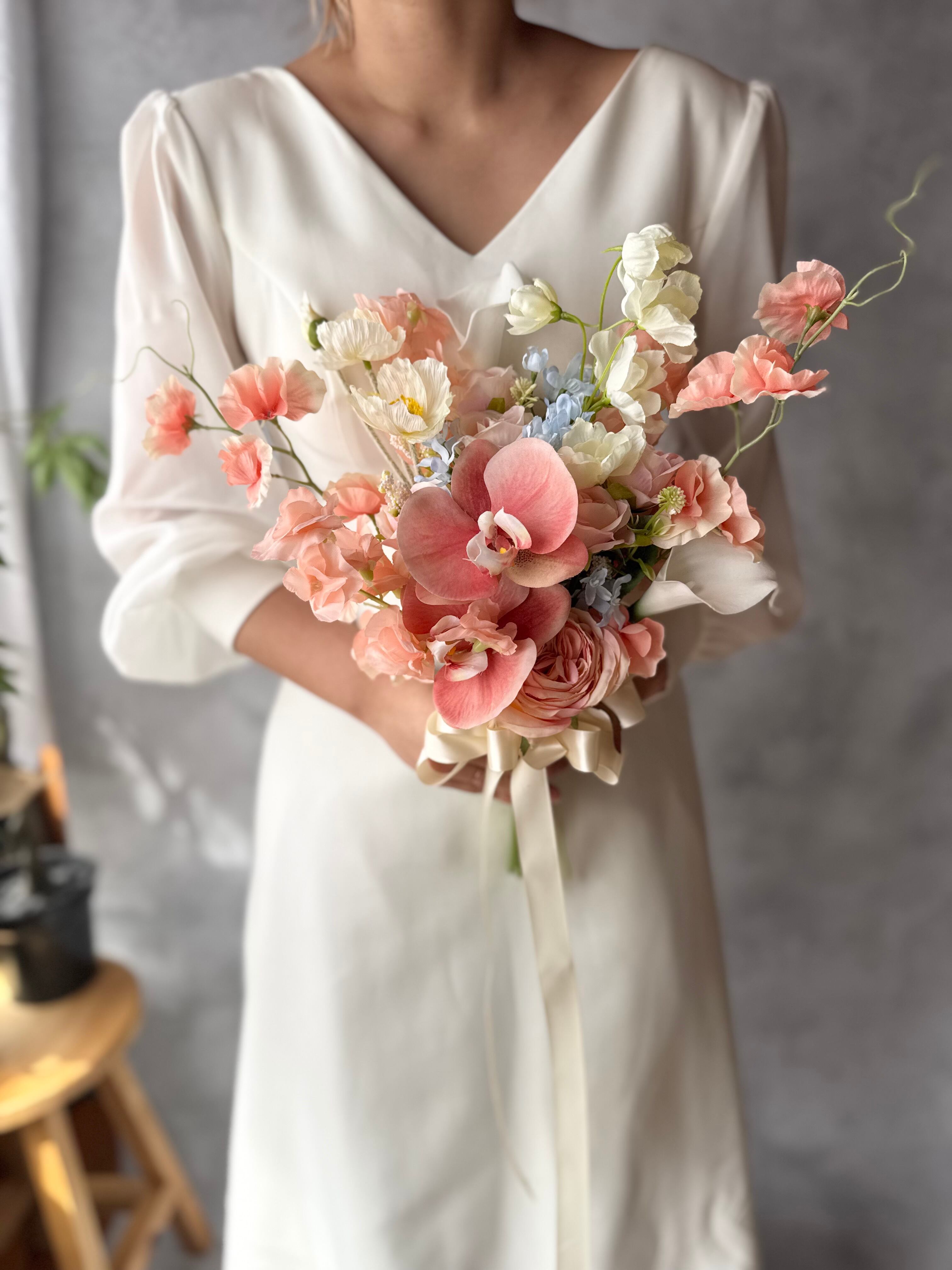 ・スイートピー、バラ、胡蝶蘭、ブルースターなど