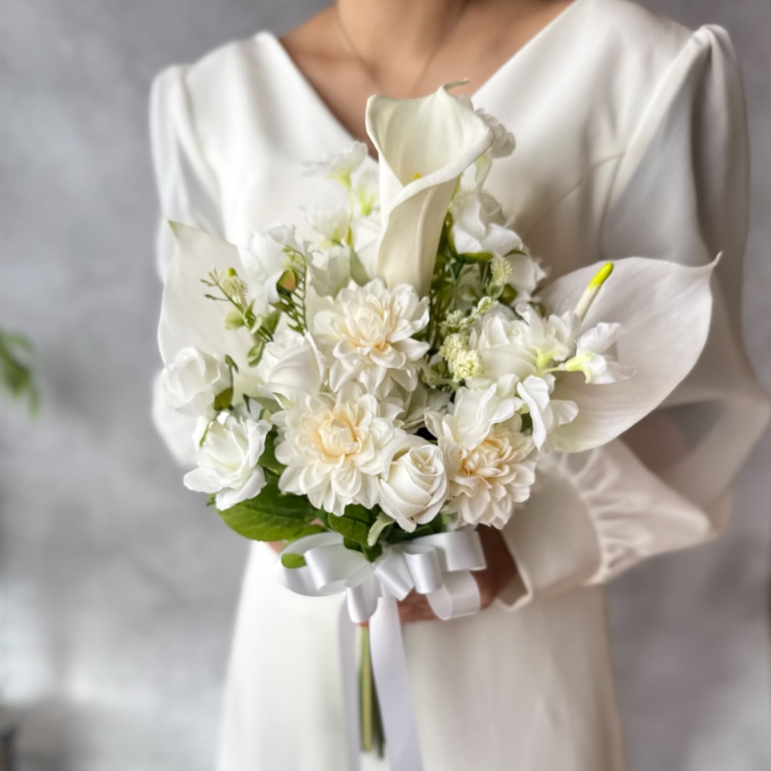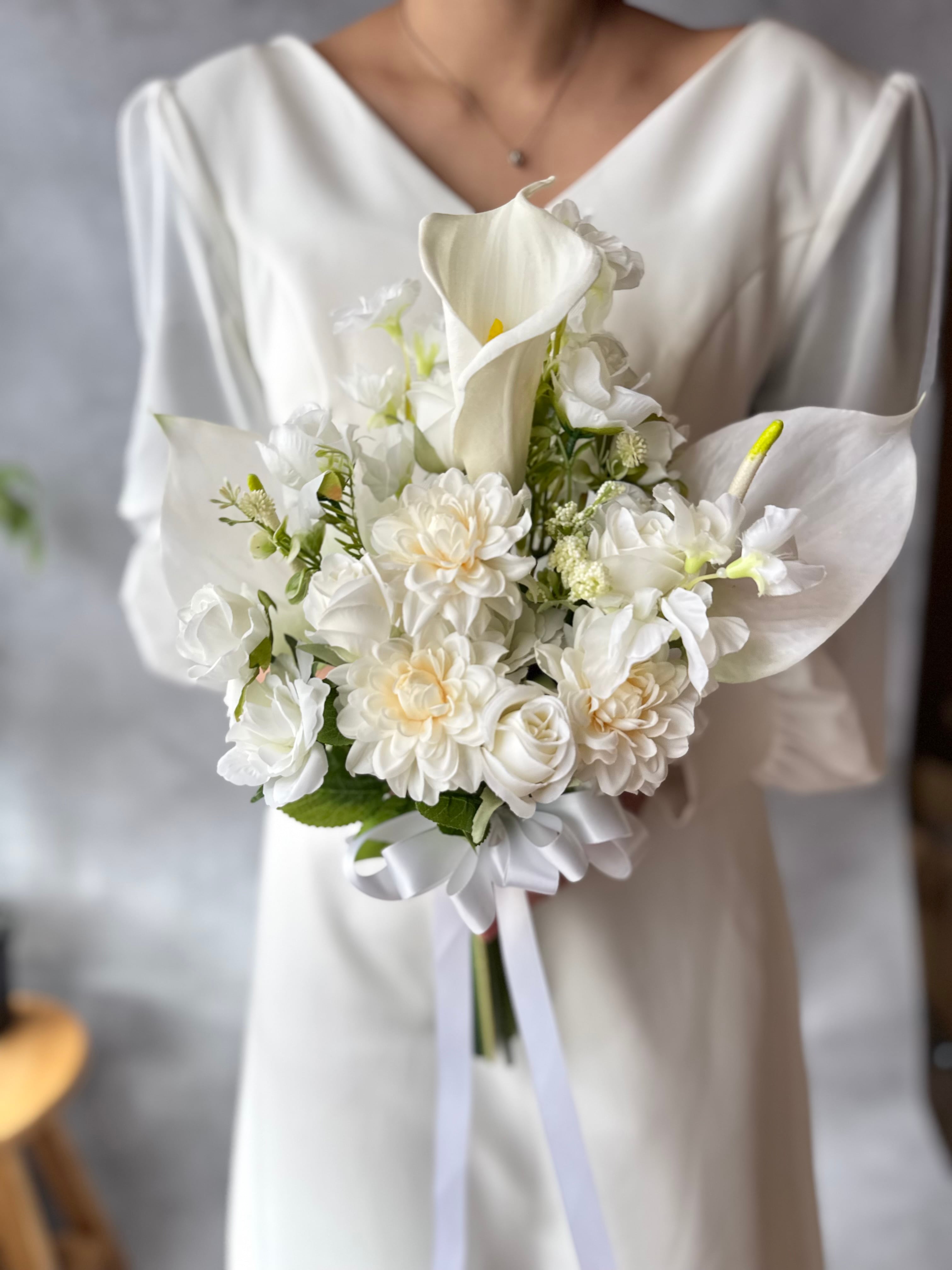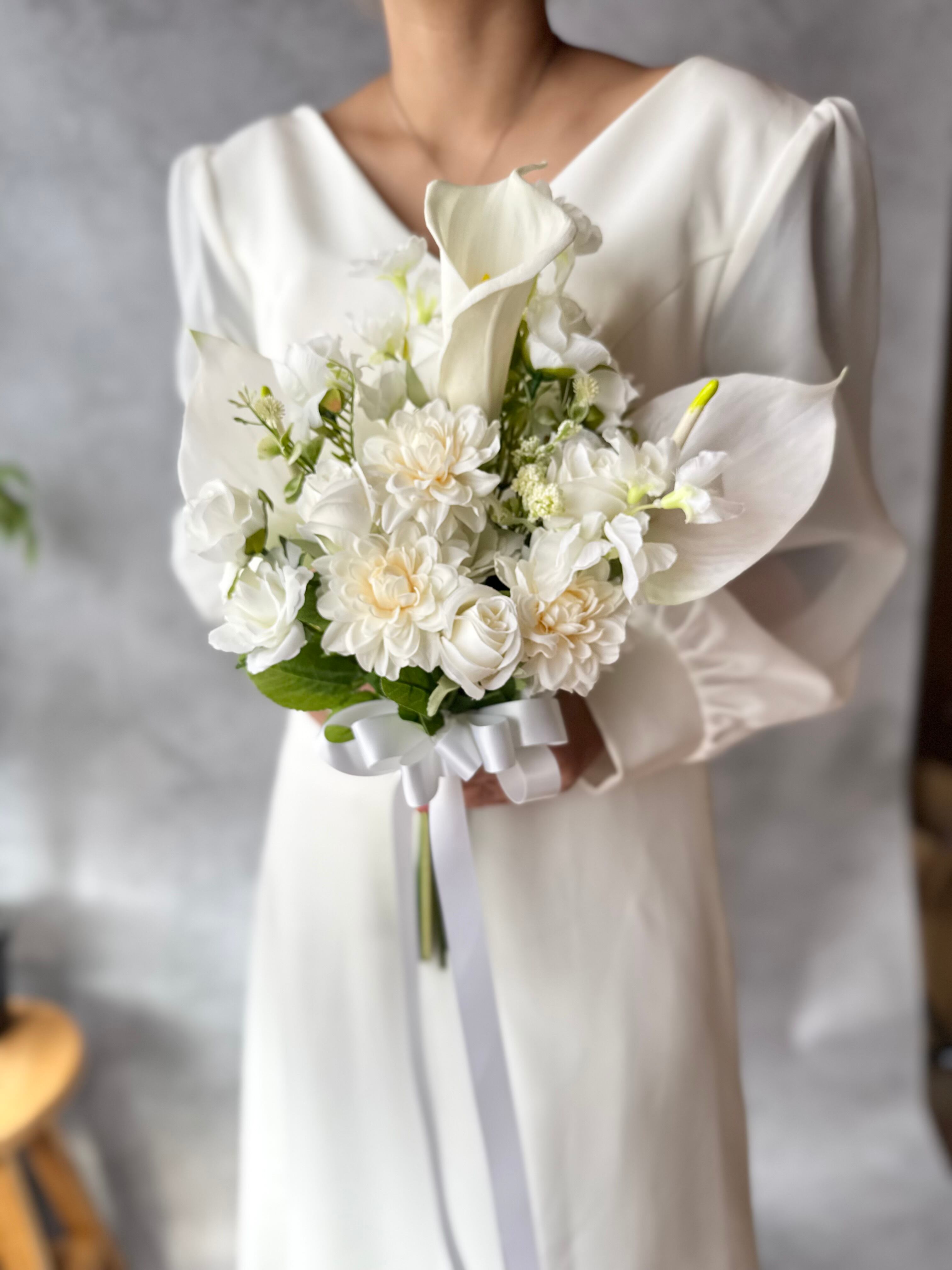 上品なホワイト系のお花たちを沢山詰め込んだ華やかなウェディングブーケ•*・