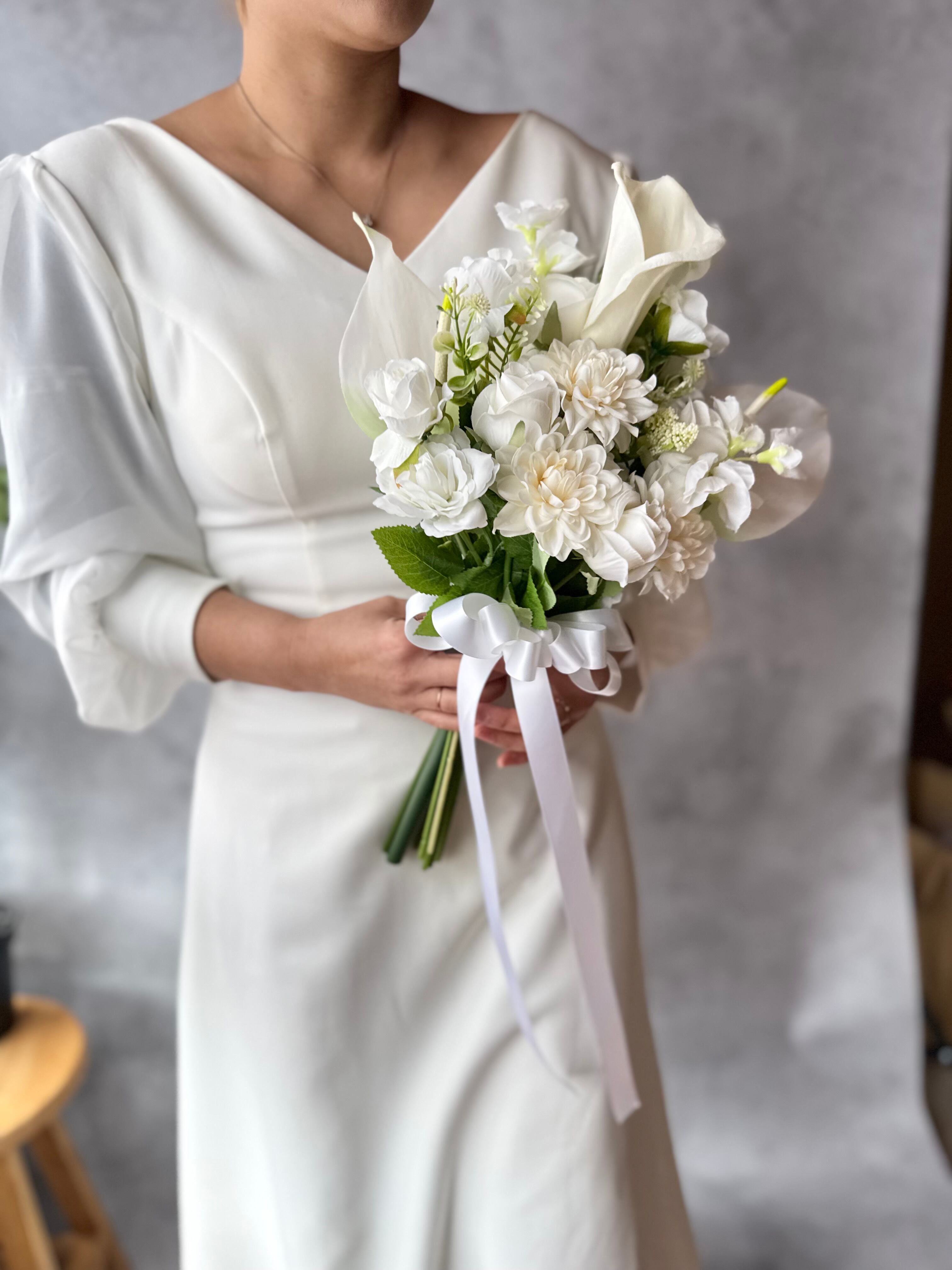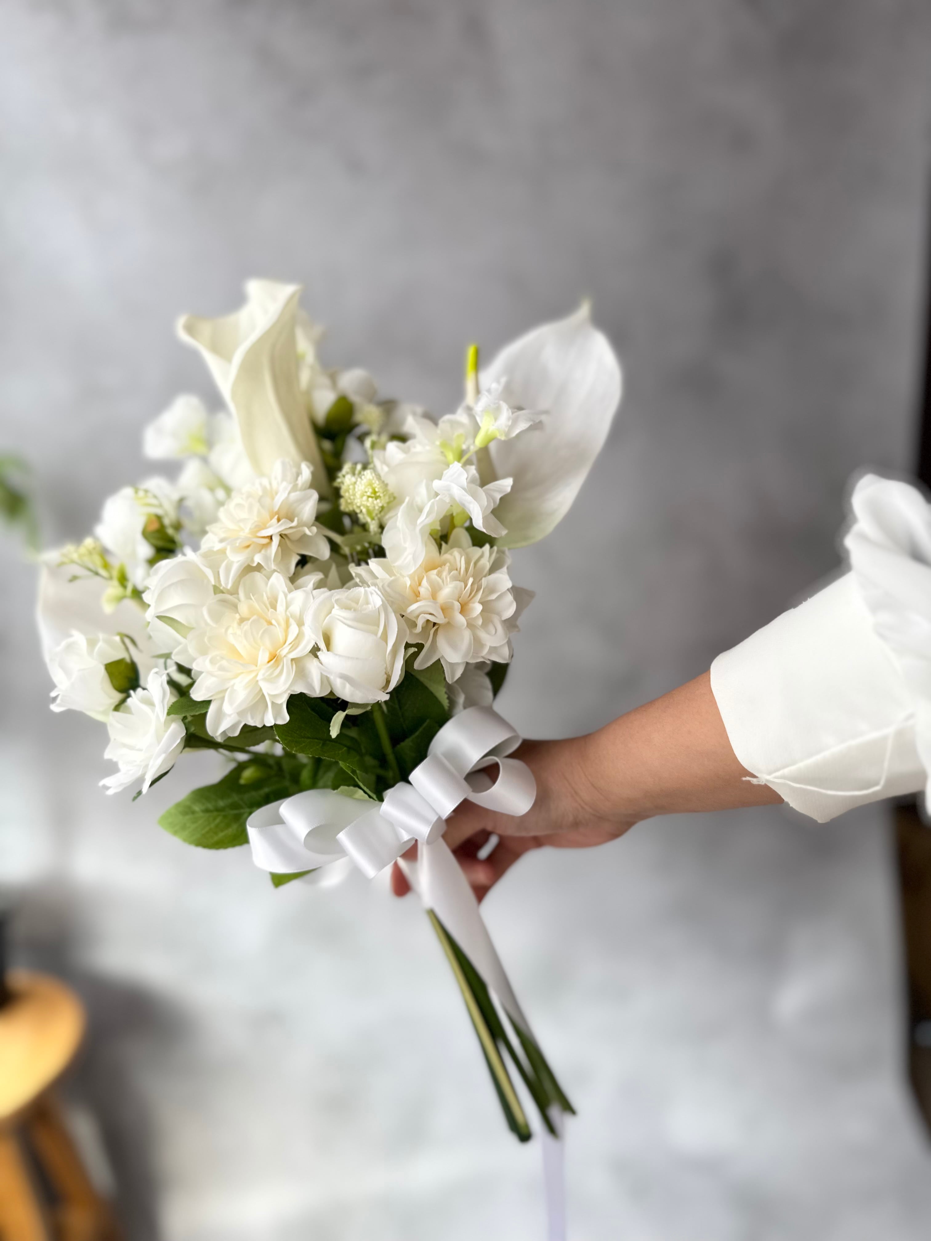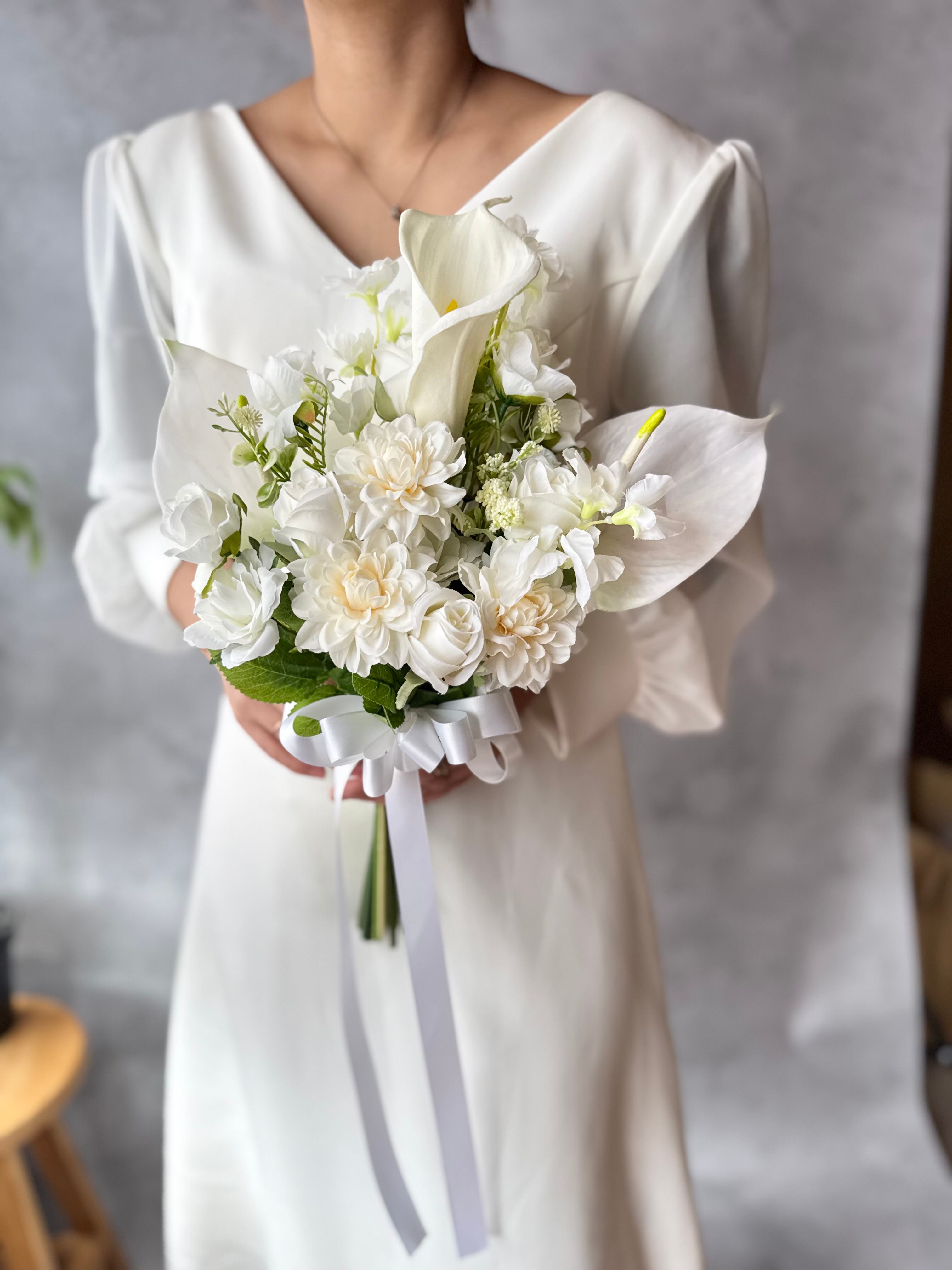 上品なホワイト系のお花たちを沢山詰め込んだ華やかなウェディングブーケ•*・