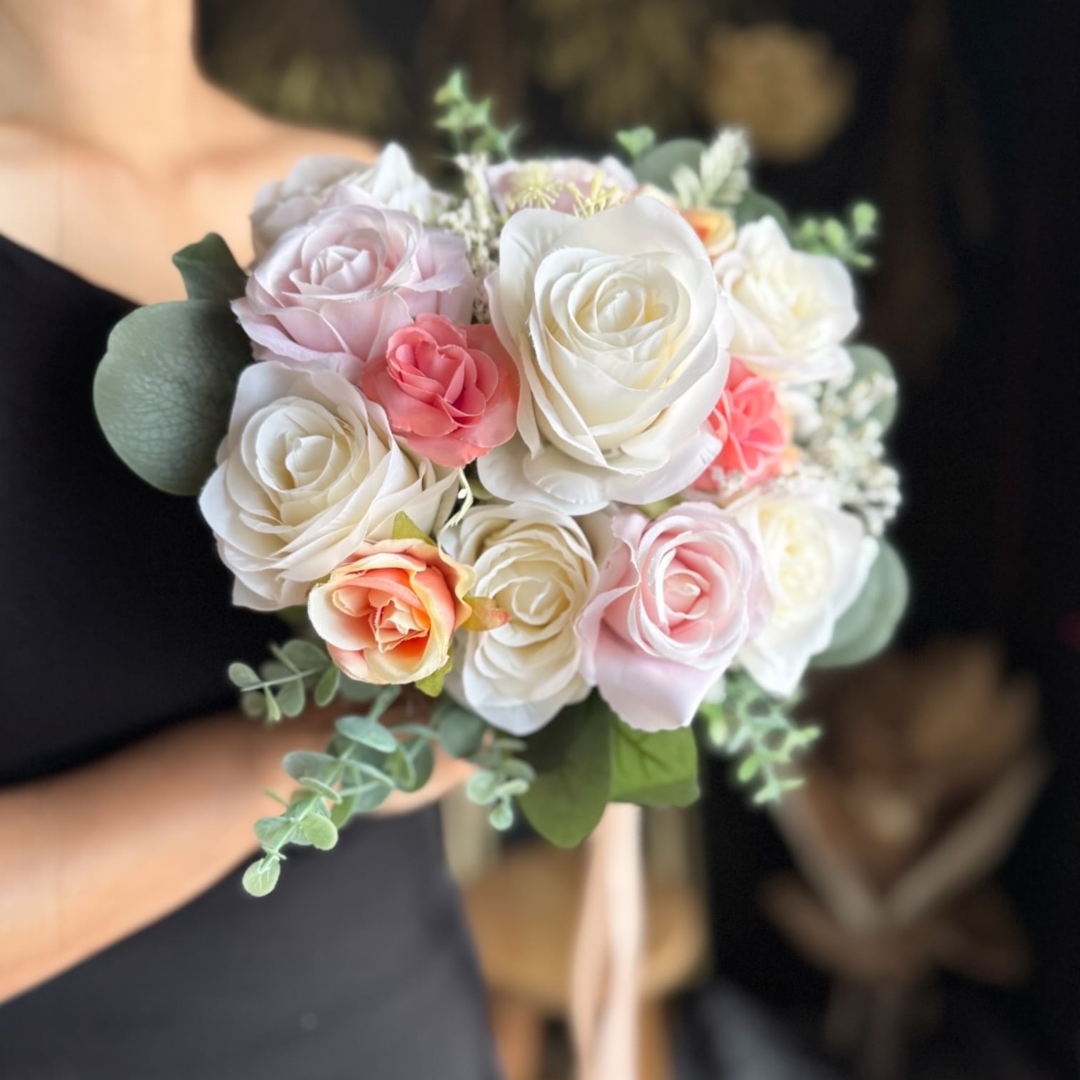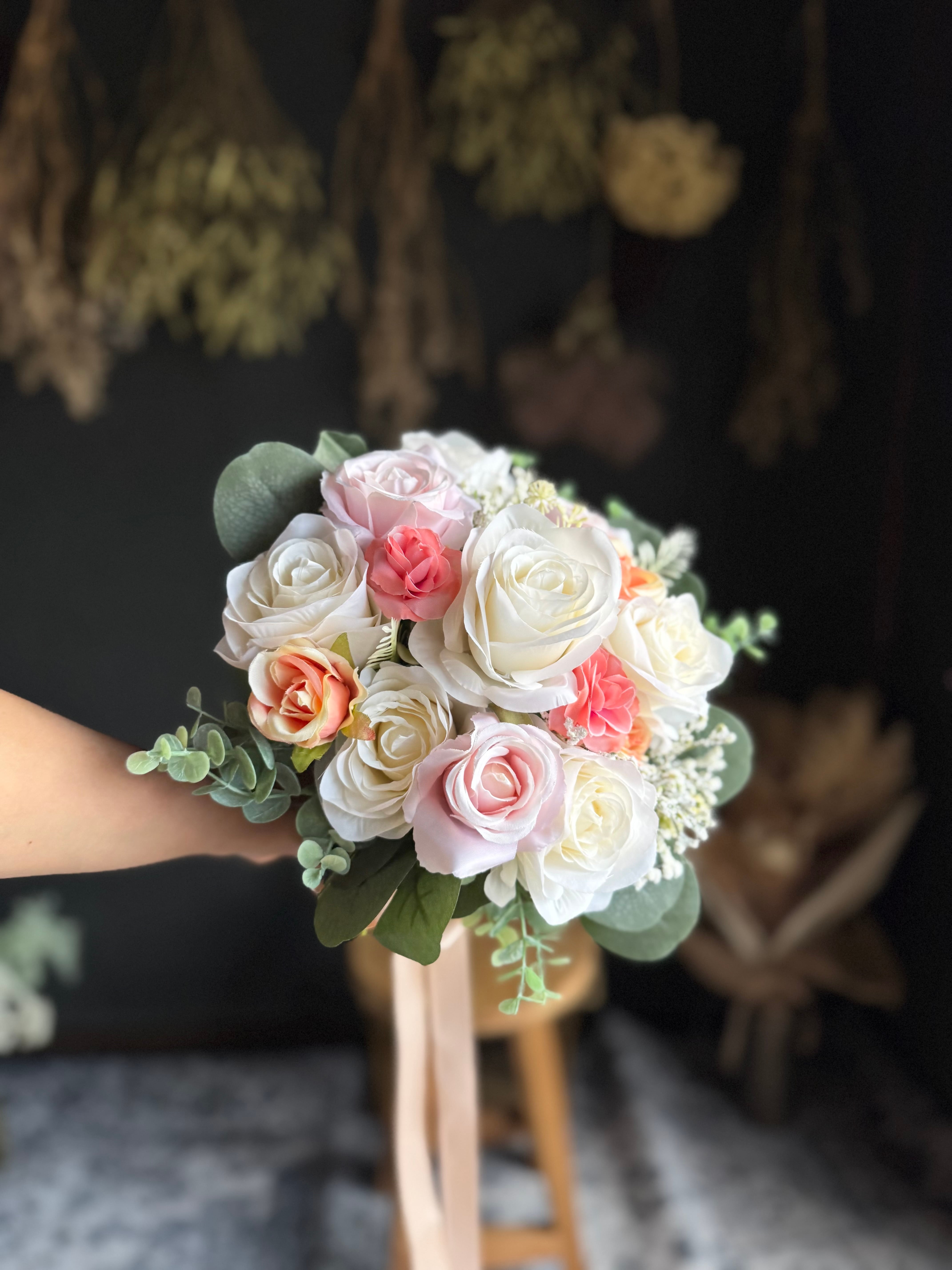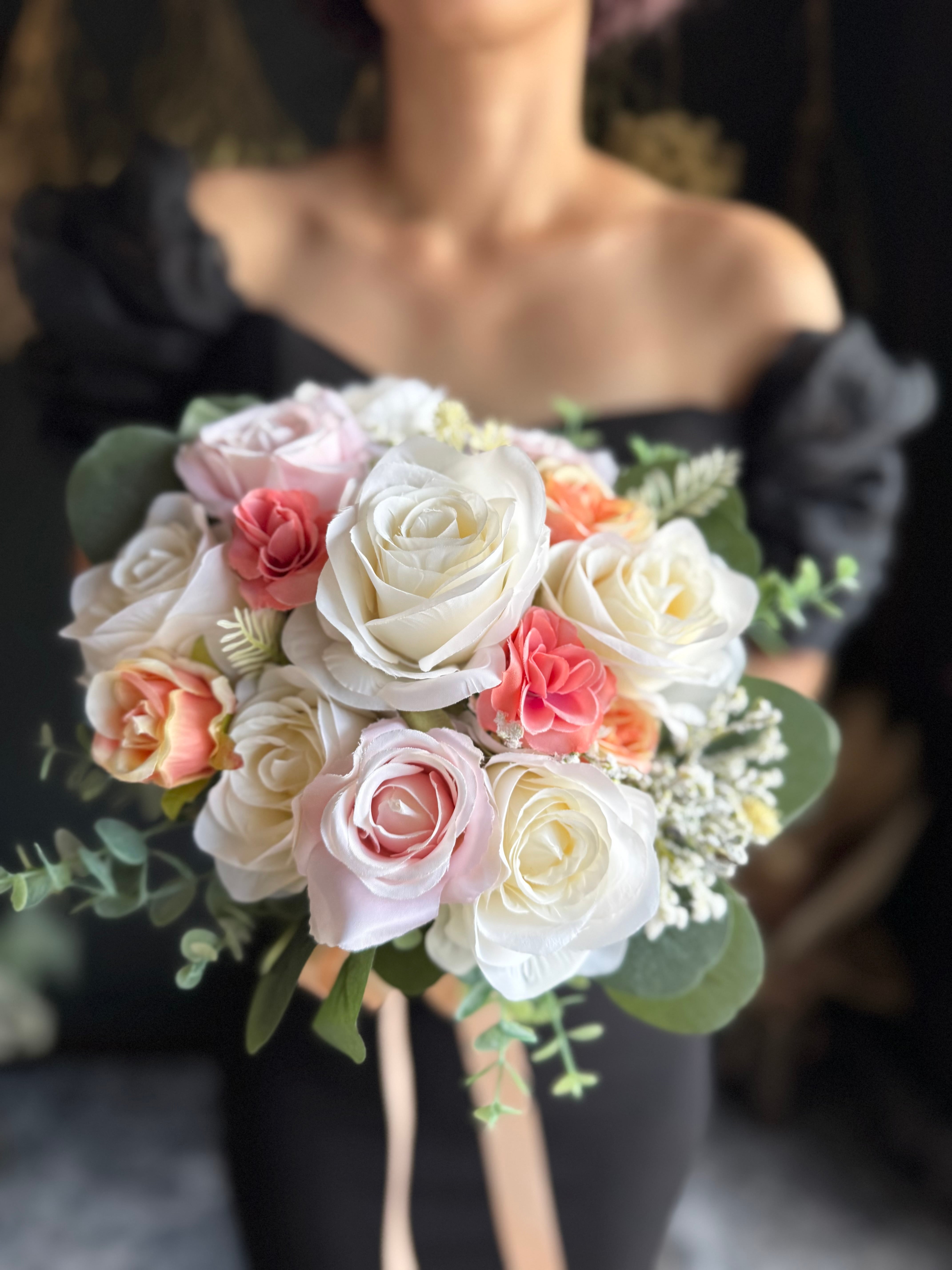 柔らかなホワイトとペールピンクのローズをメインに、差し色のコーラルピンクを添えたナチュラルで華やかなクラッチブーケです。