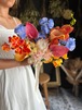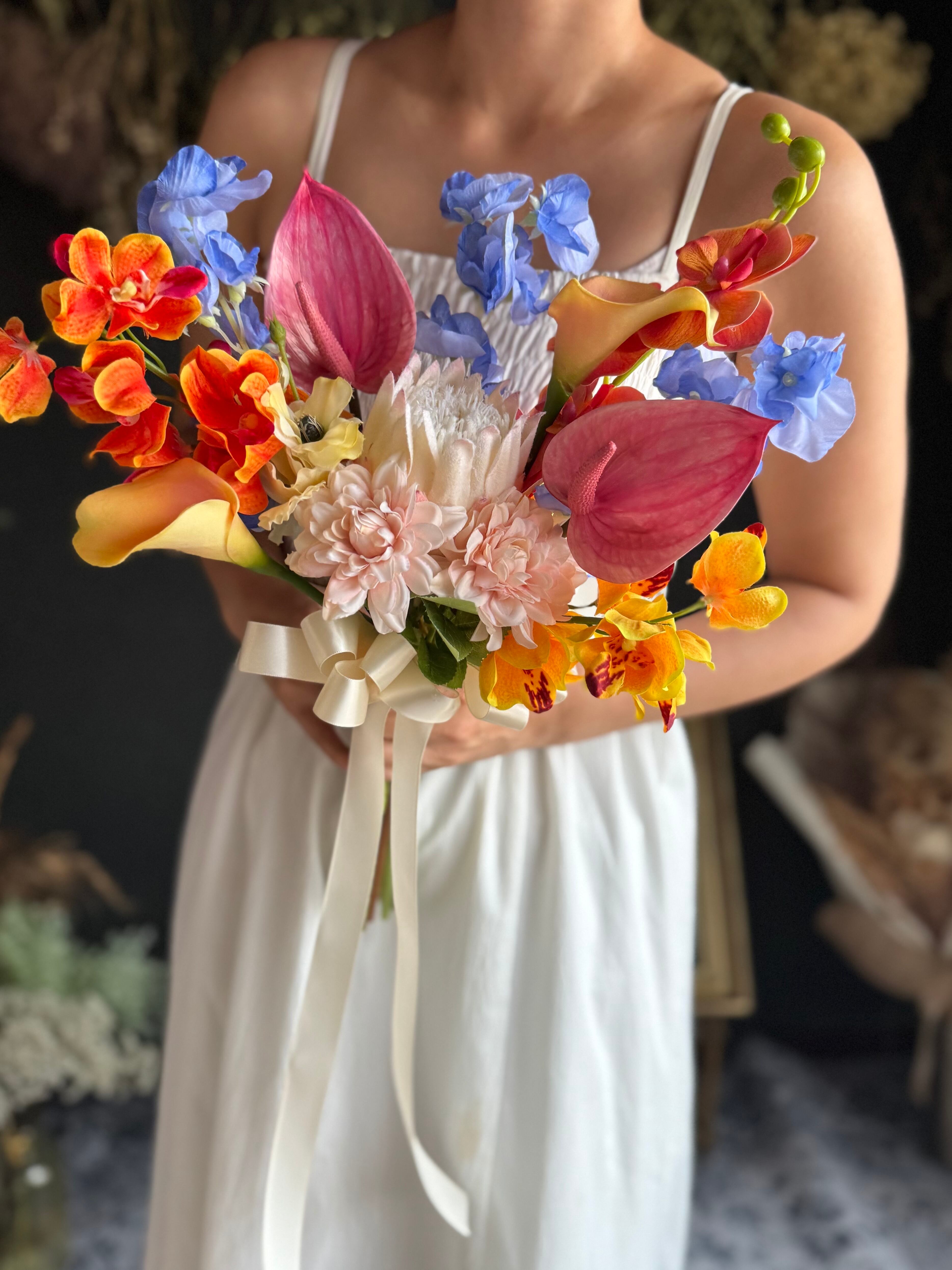 華やかな南国の花々をぎゅっと束ねた、リゾート感たっぷりのウェディングブーケ•*・