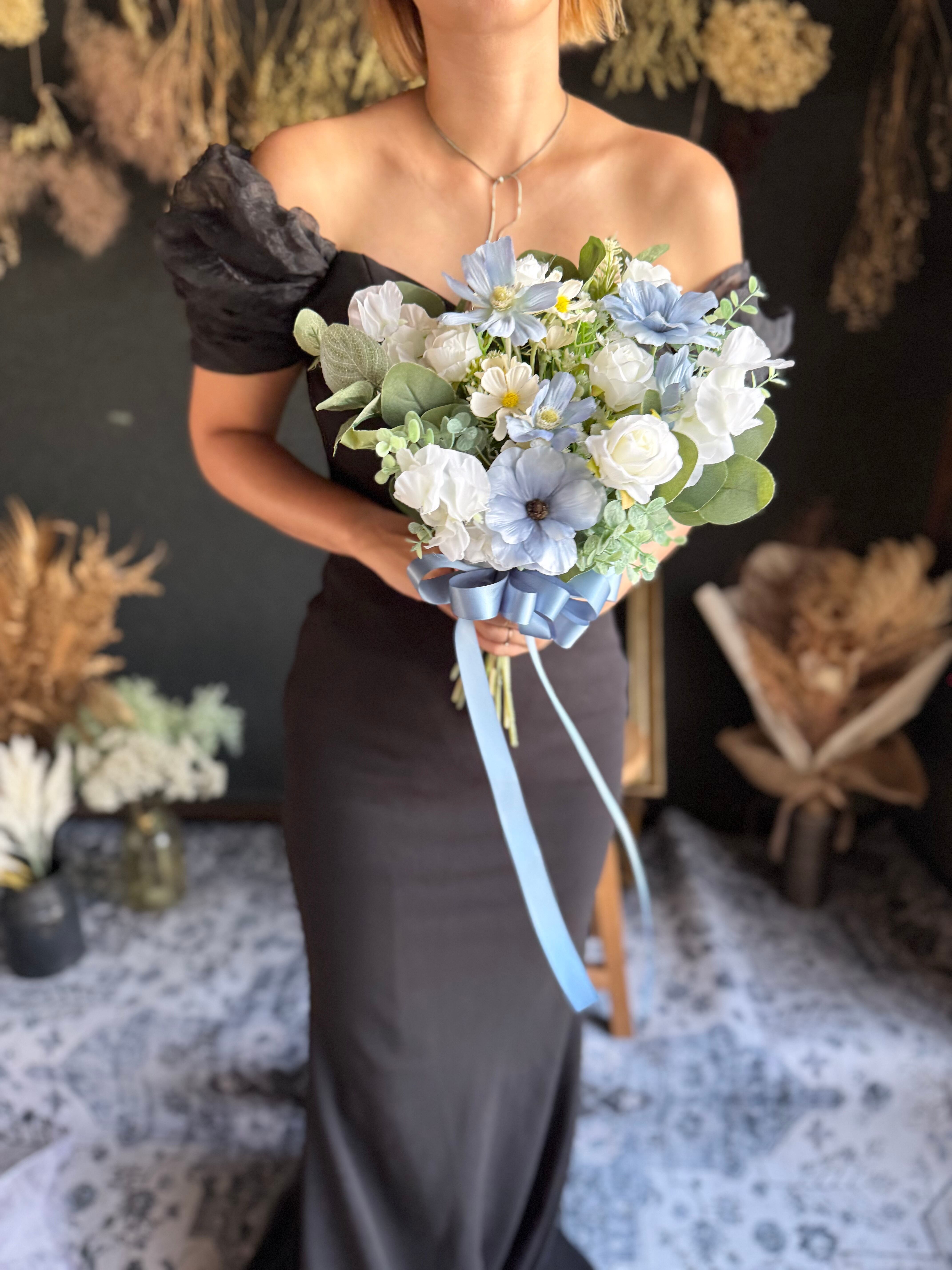 ブルーのコスモスに白の小花を合わせたクラッチブーケ•*・サムシングブルーとして、前撮りや挙式で大活躍してくれるブーケです•*・