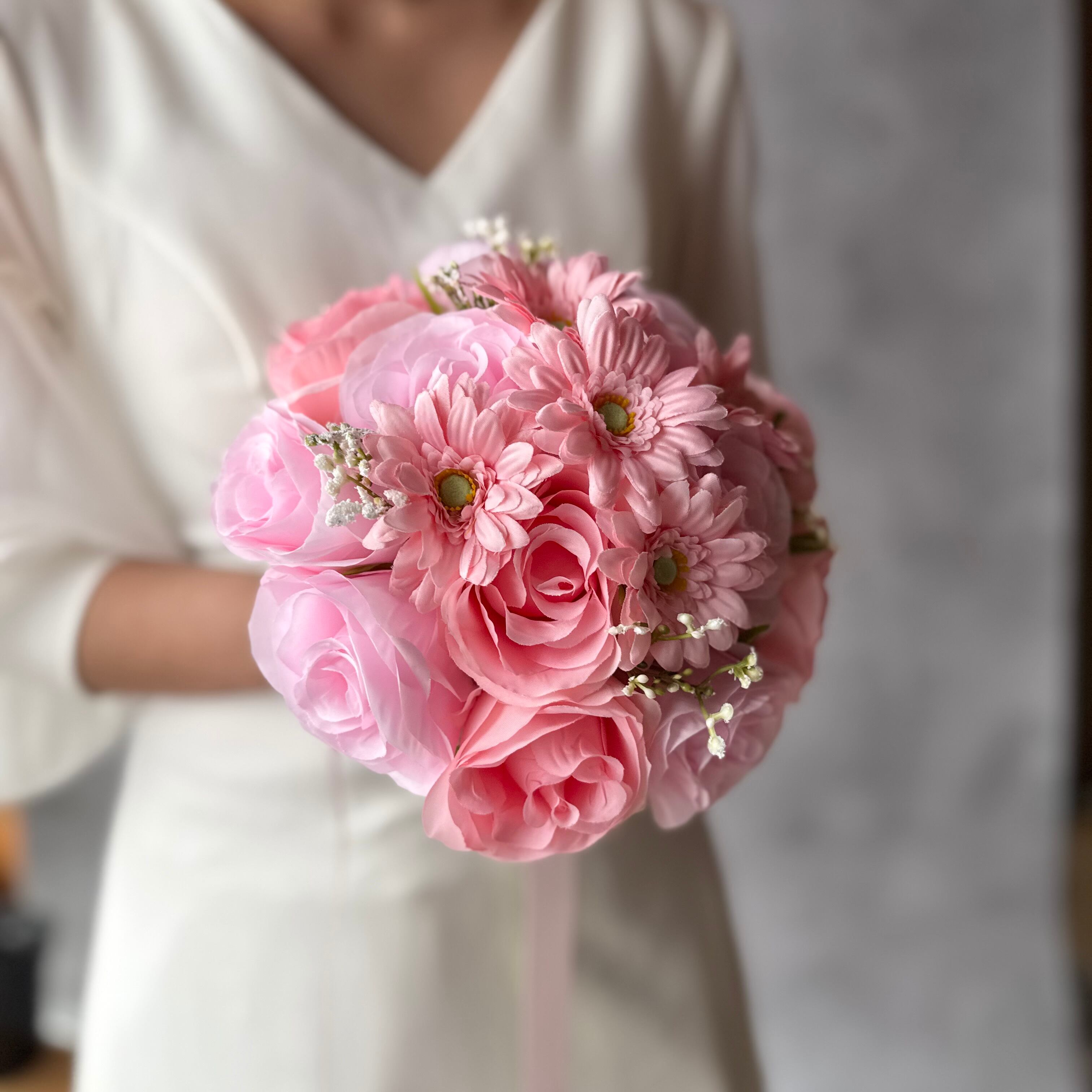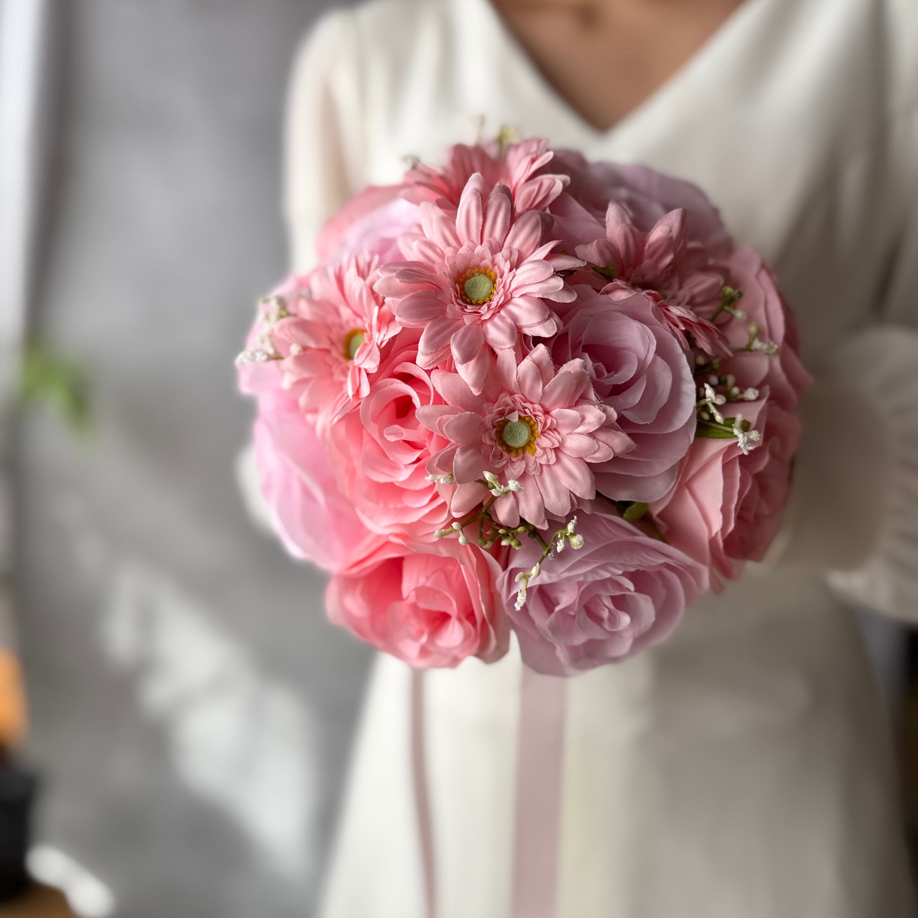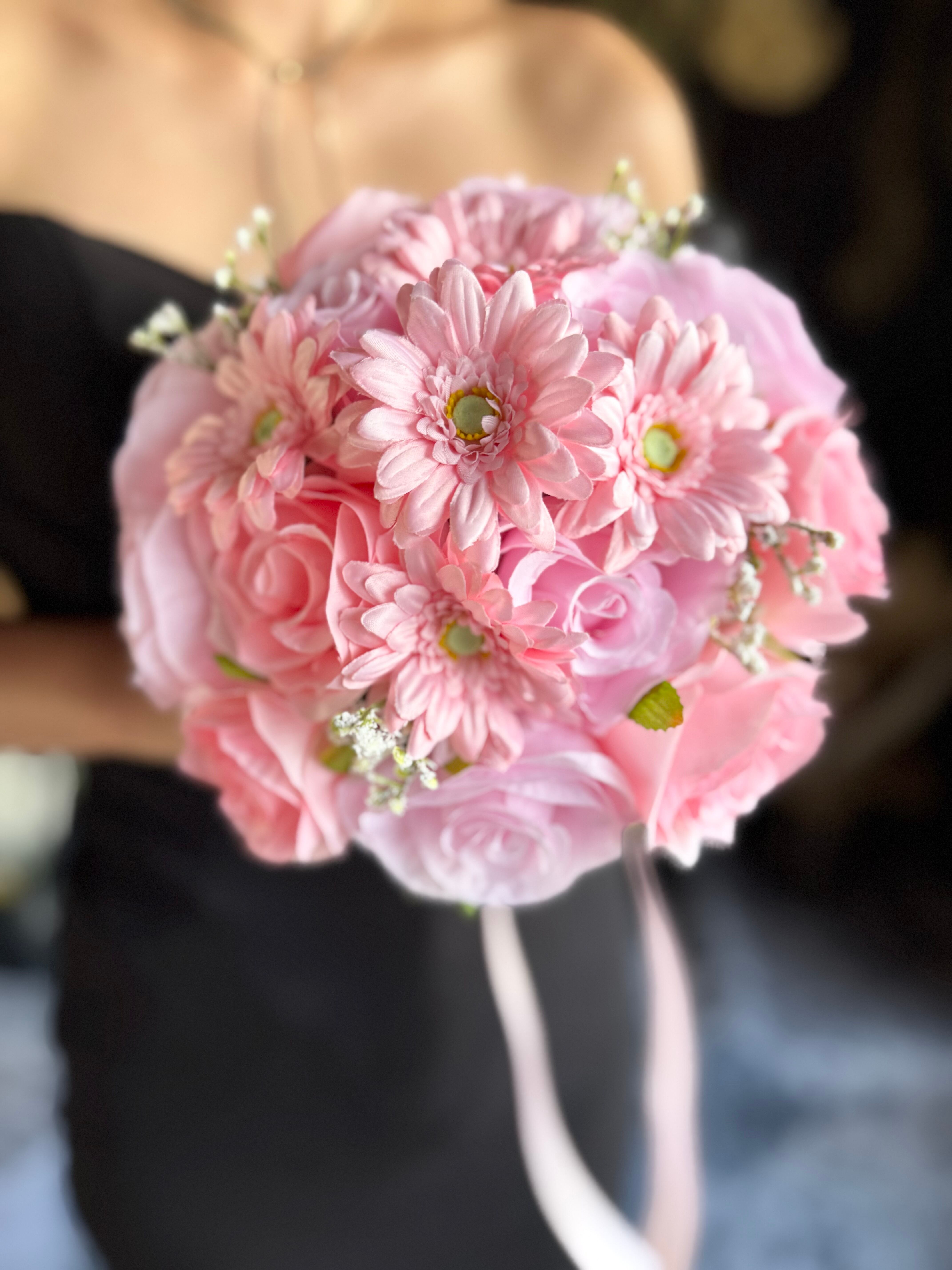 ピンクのバラとピンクのガーベラを組み合わせた可憐で可愛いラウンドブーケ•*