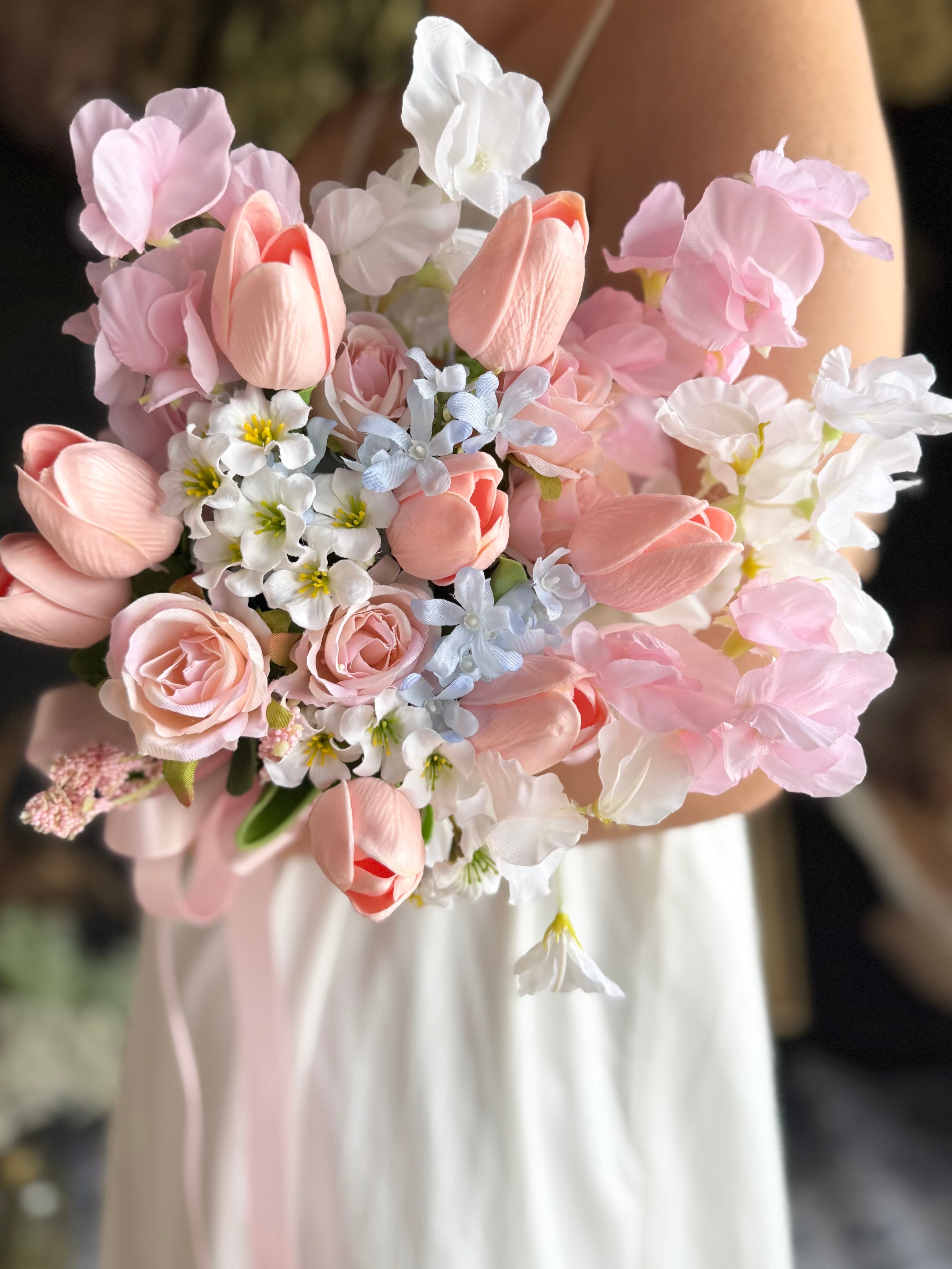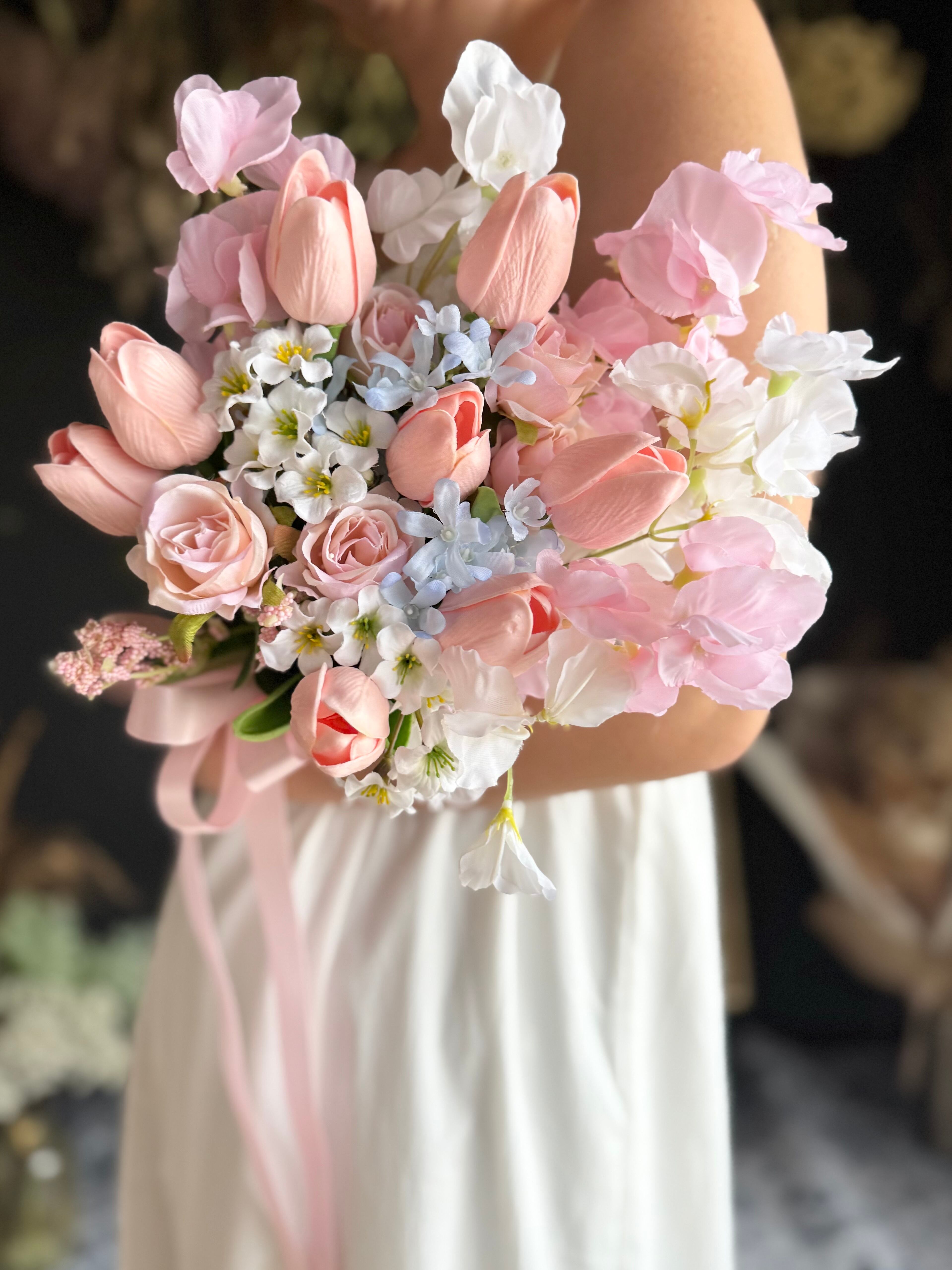 チューリップ、やスイートピー、バラなど可愛い花々をぎゅっと束ねて、やさしく華やかな印象に•*・