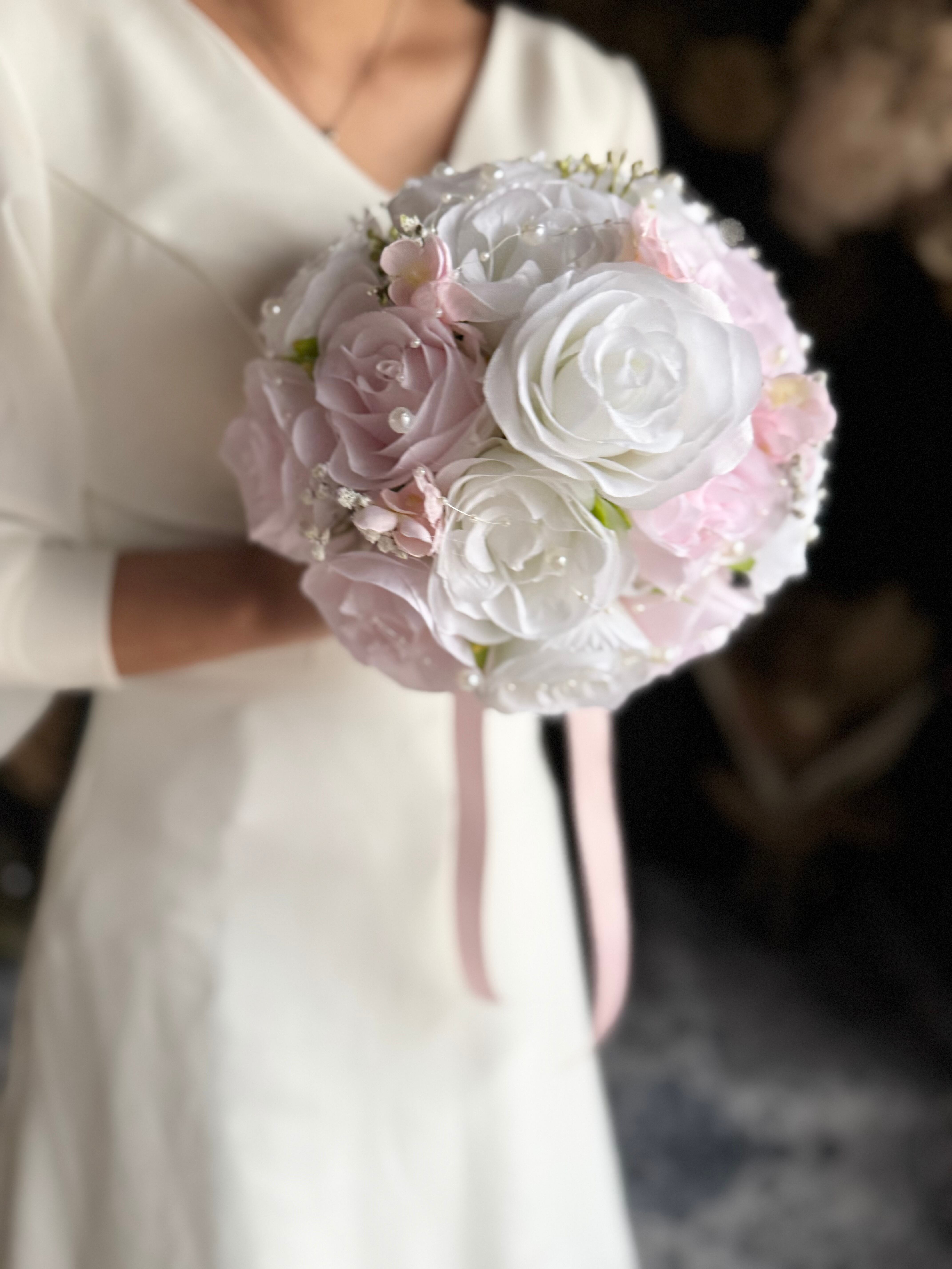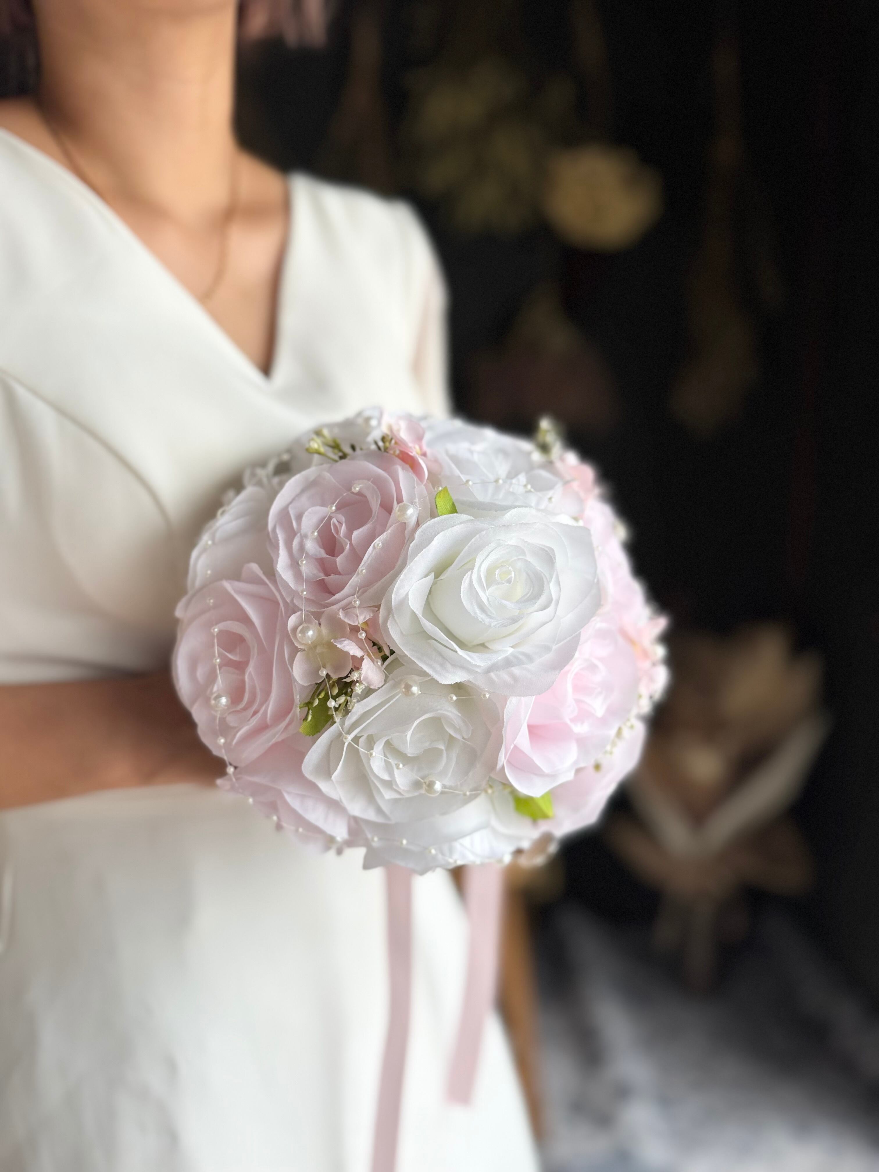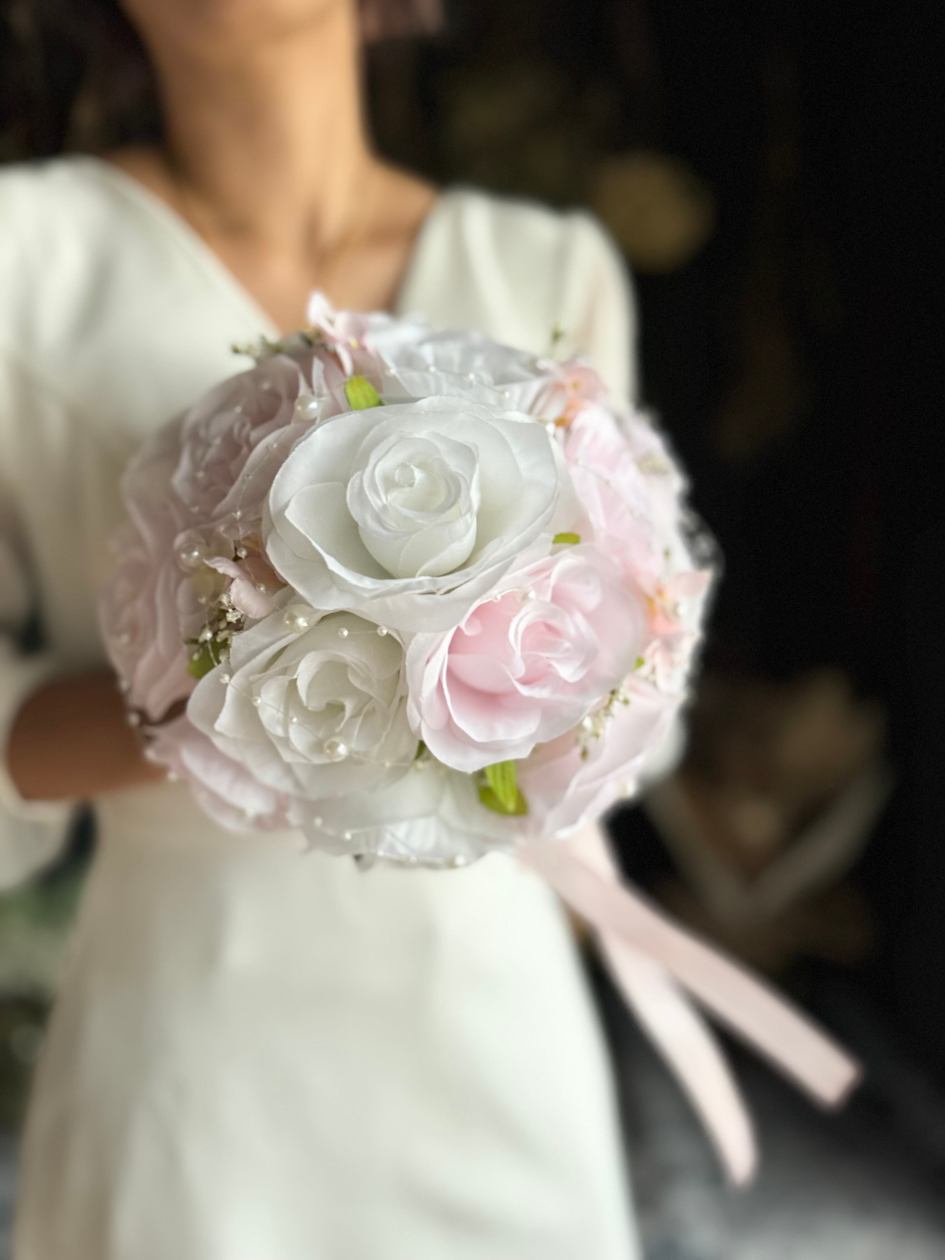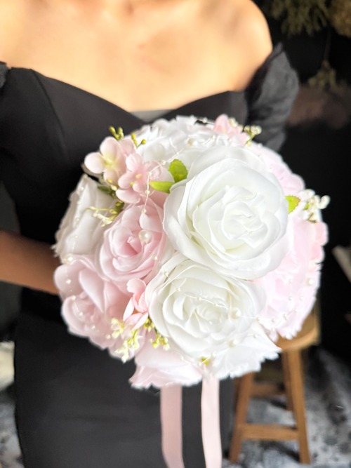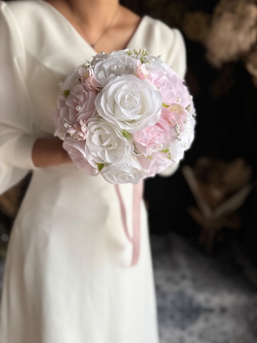 白バラの優雅な雰囲気と、ピンクの小花の可愛らしさがマッチした絶妙なデザインのラウンドブーケで、どんなドレスにも合わせやすい為、人気のデザインです(๑˃̵ᴗ˂̵)