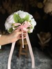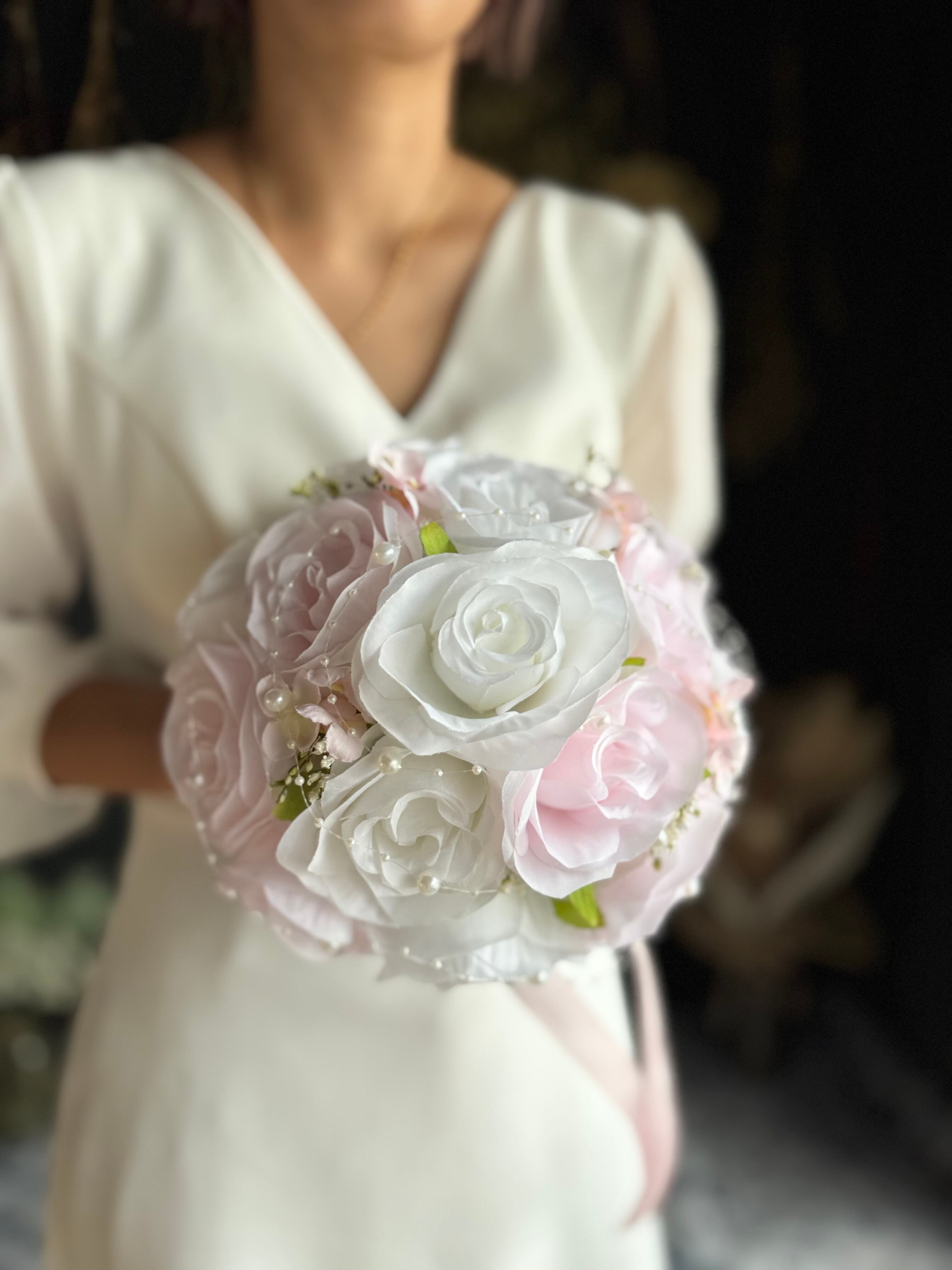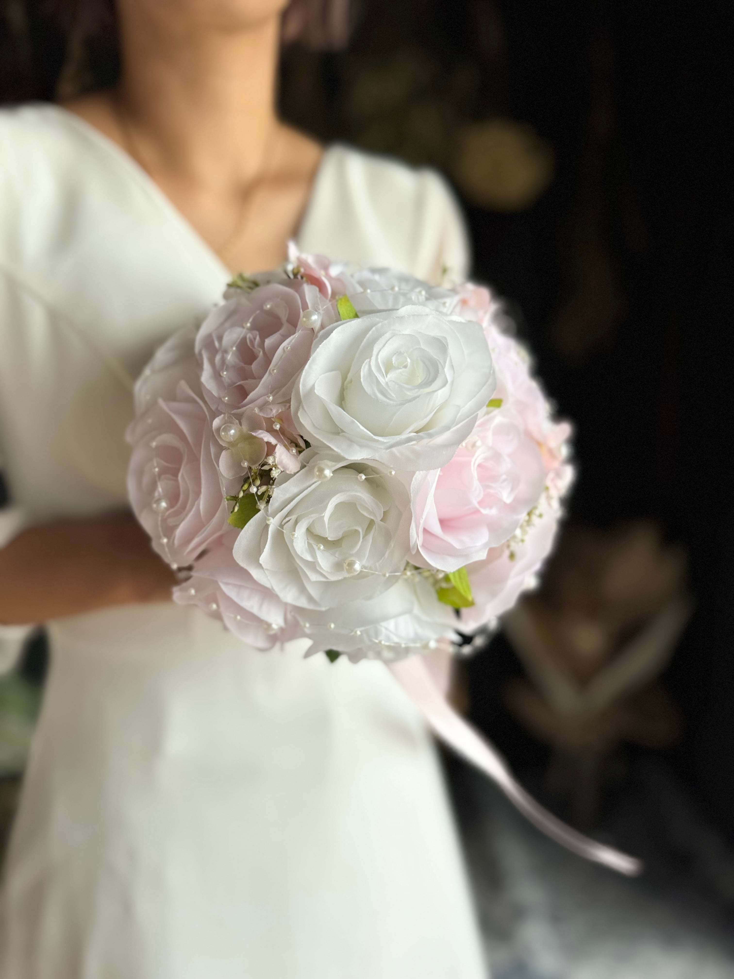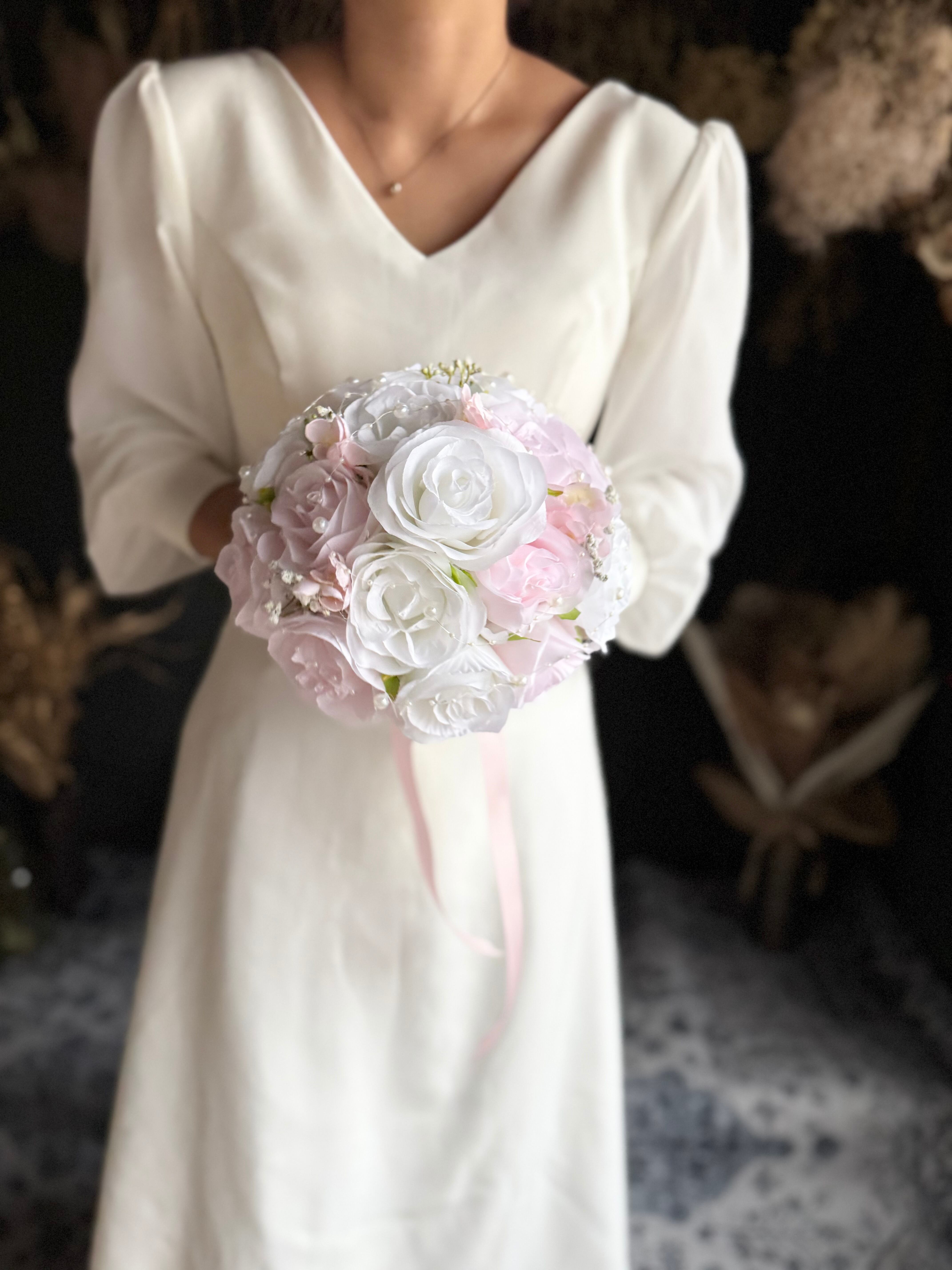白バラの優雅な雰囲気と、ピンクの小花の可愛らしさがマッチした絶妙なデザインのラウンドブーケで、どんなドレスにも合わせやすい為、人気のデザインです(๑˃̵ᴗ˂̵)