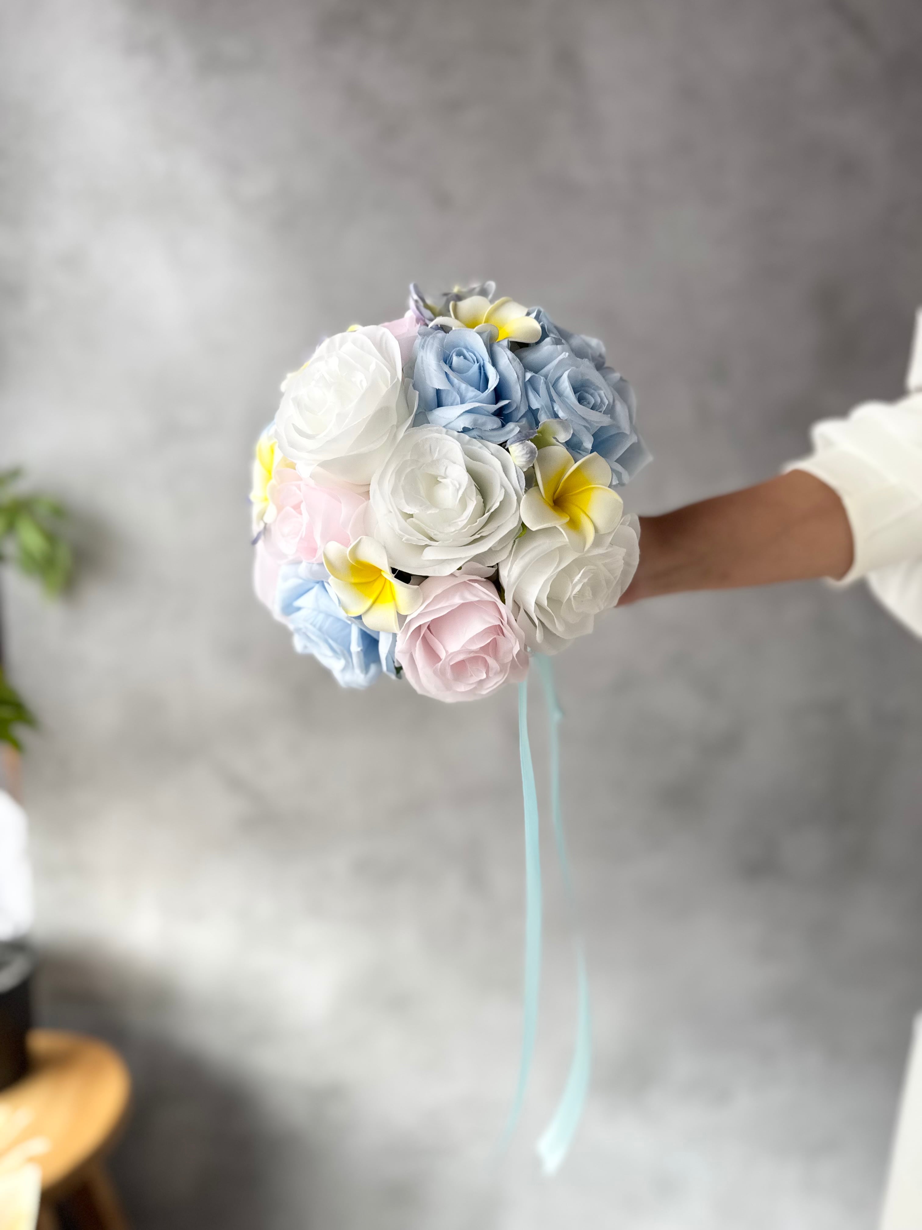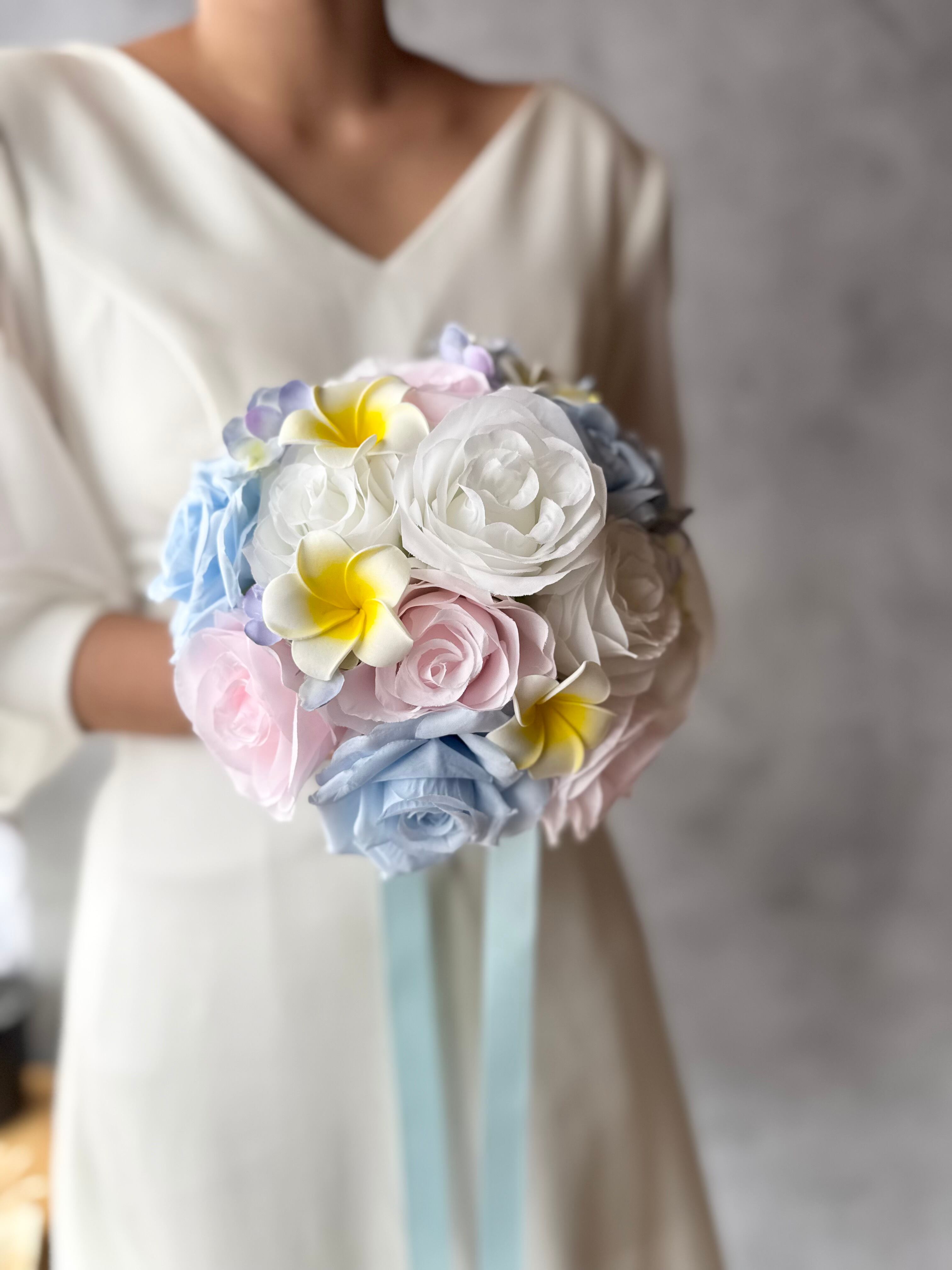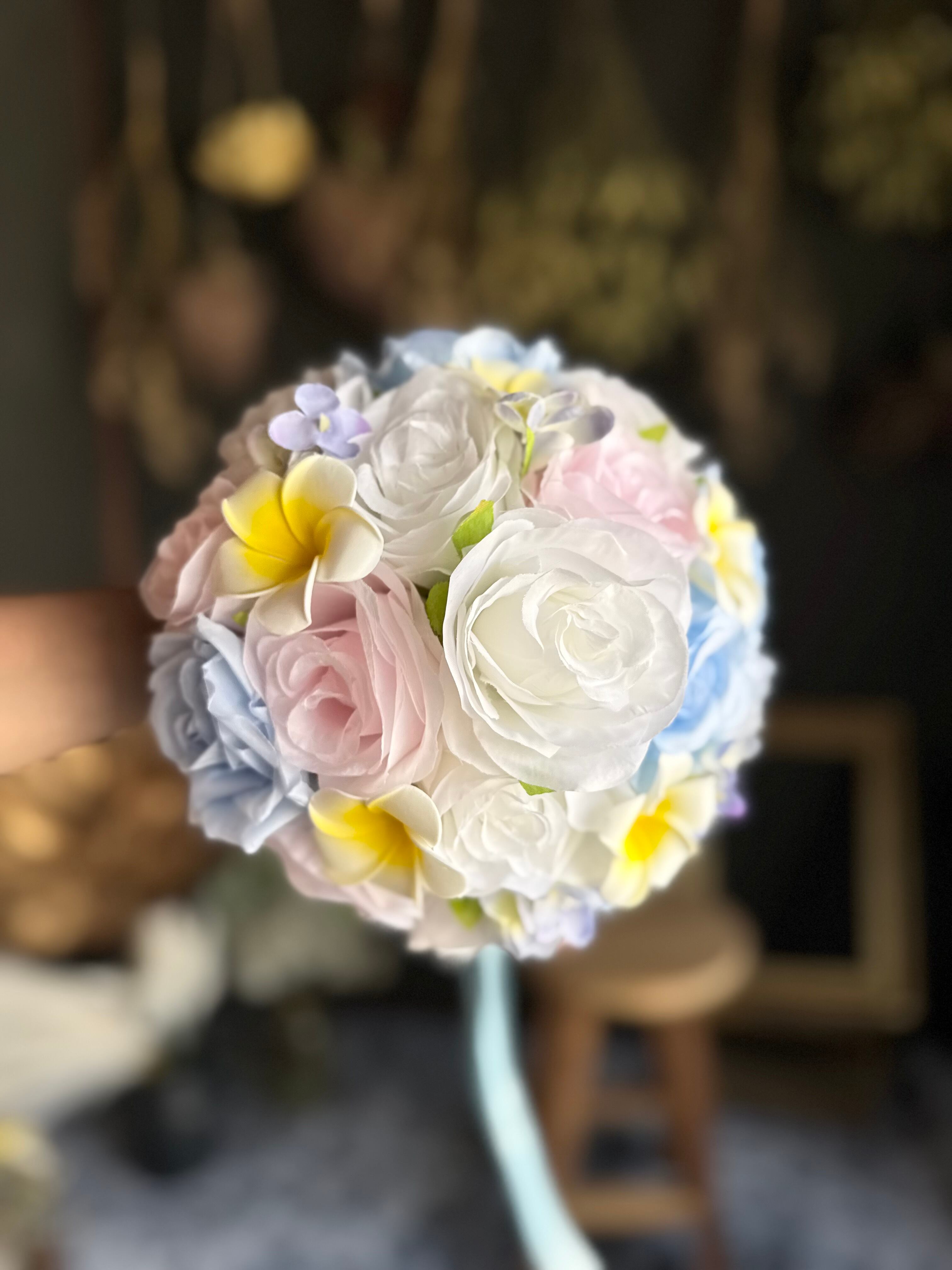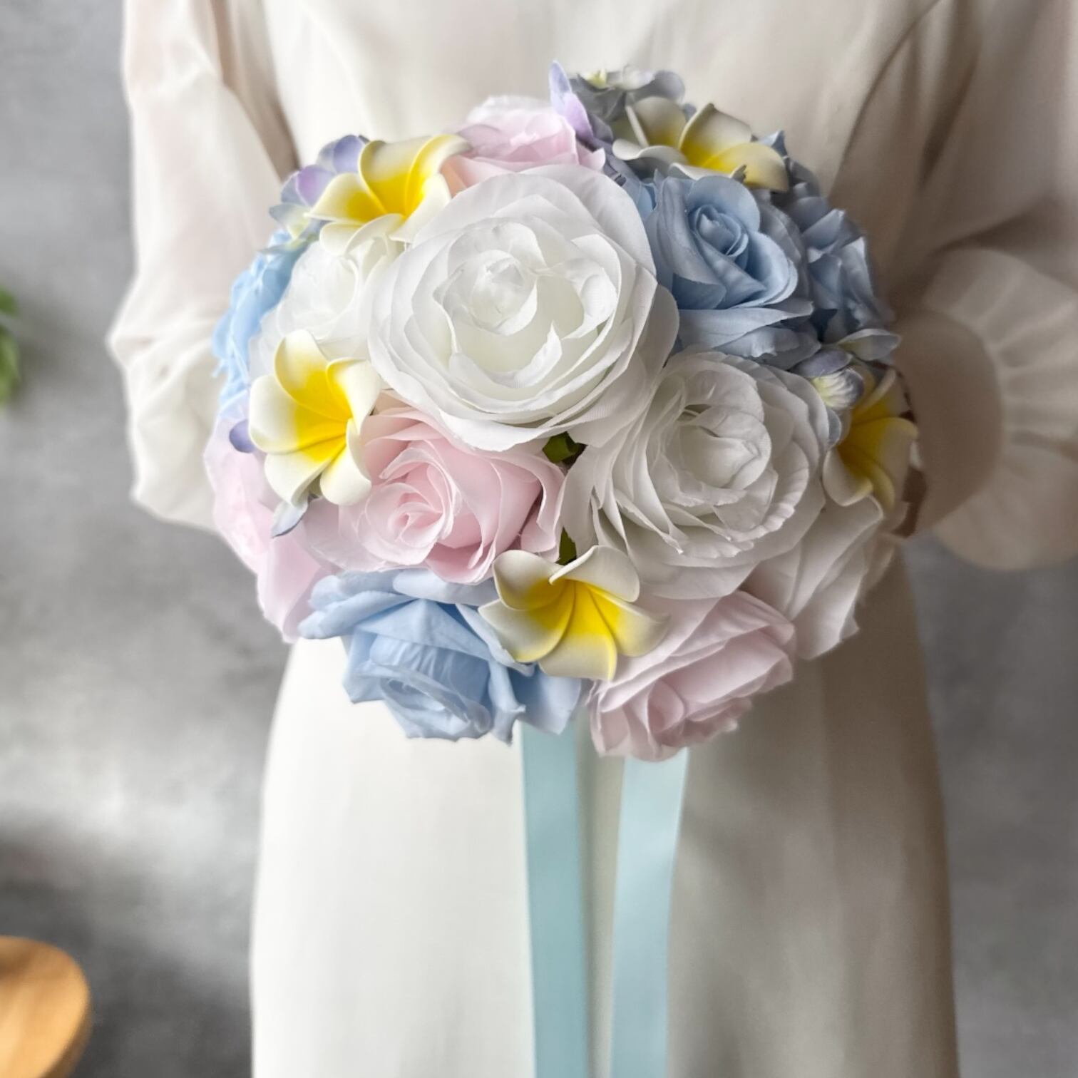 パステルカラーで可愛いらしいラウンドブーケ♪プルメリアがアクセントで海辺の撮影やチャペルにもピッタリのデザインです^ ^色んなドレスに合わせやすいです•*・