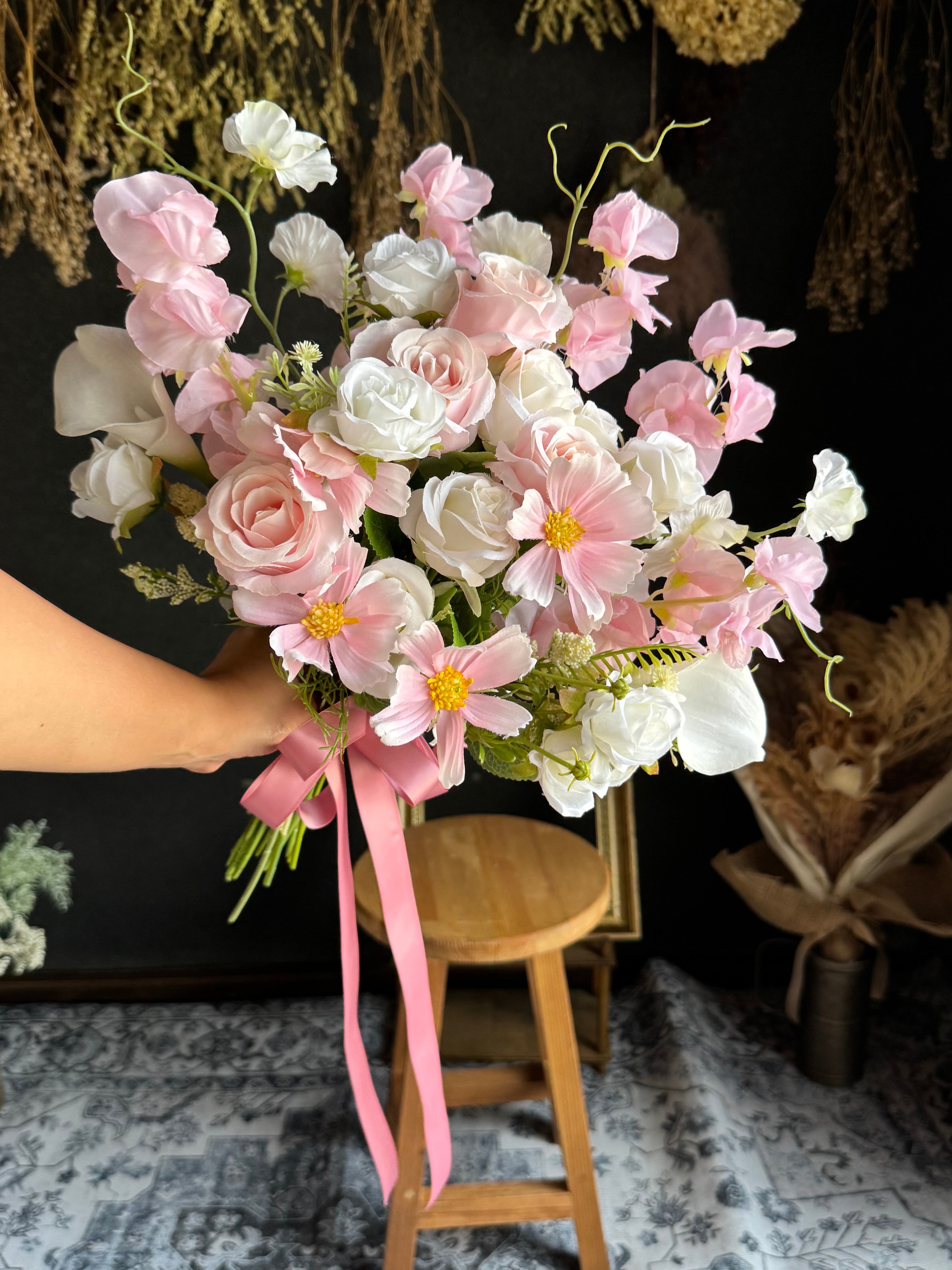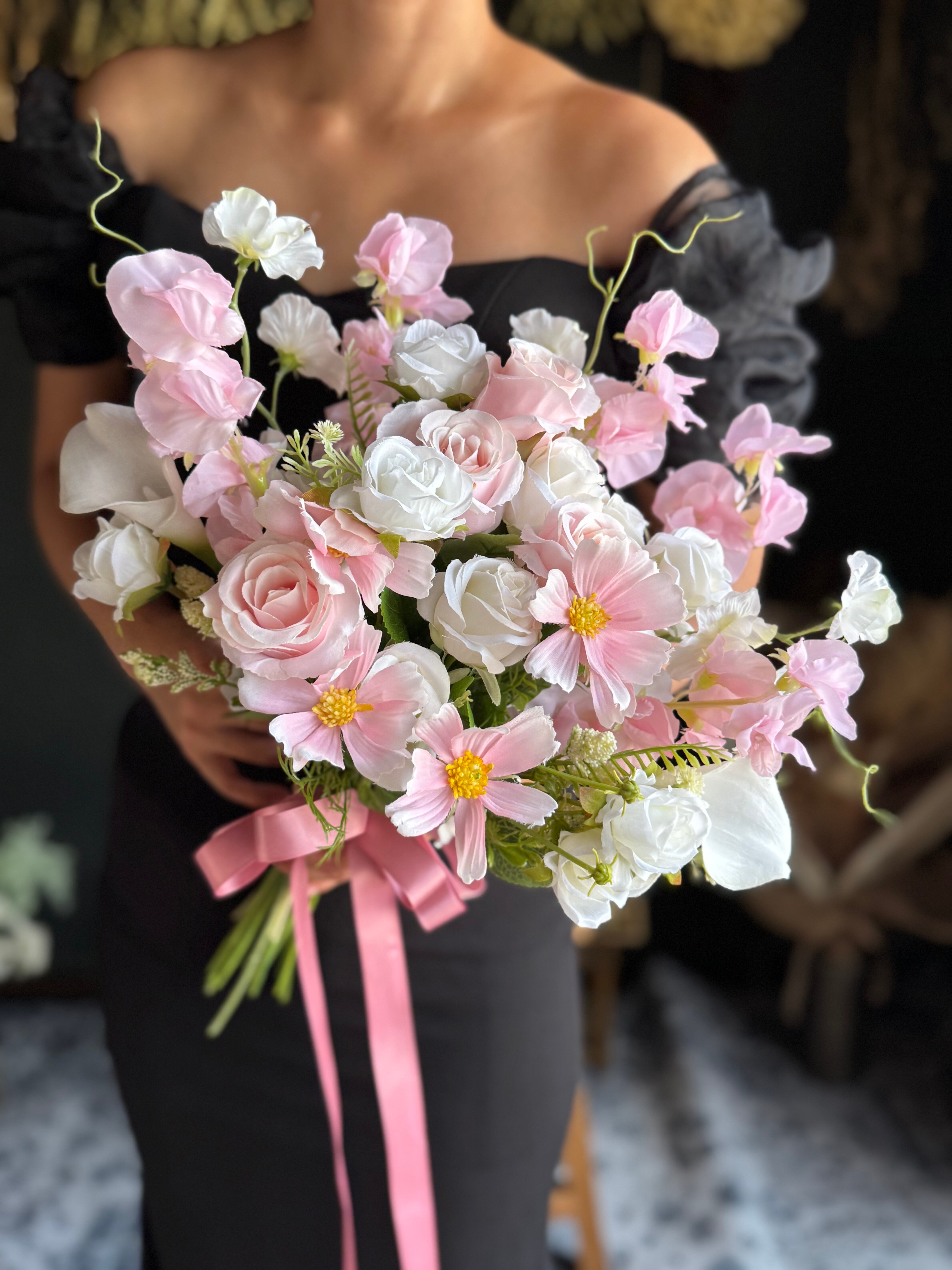 ピンクコスモスとホワイトピンクのスイートピーが絶妙な組み合わせが魅力的なブーケです•*・エレガントな雰囲気を醸し出し、どんなスタイルのウェディングにもぴったりです•*・