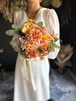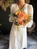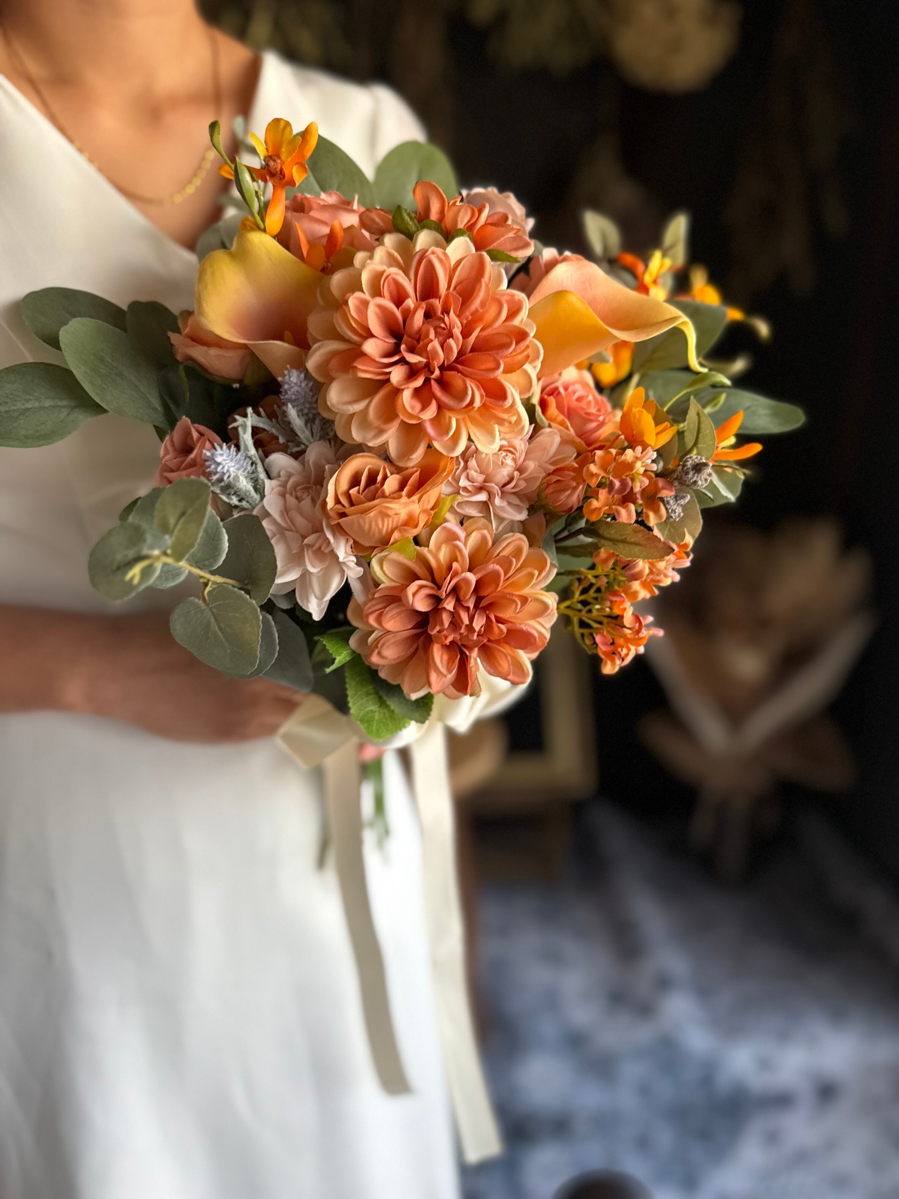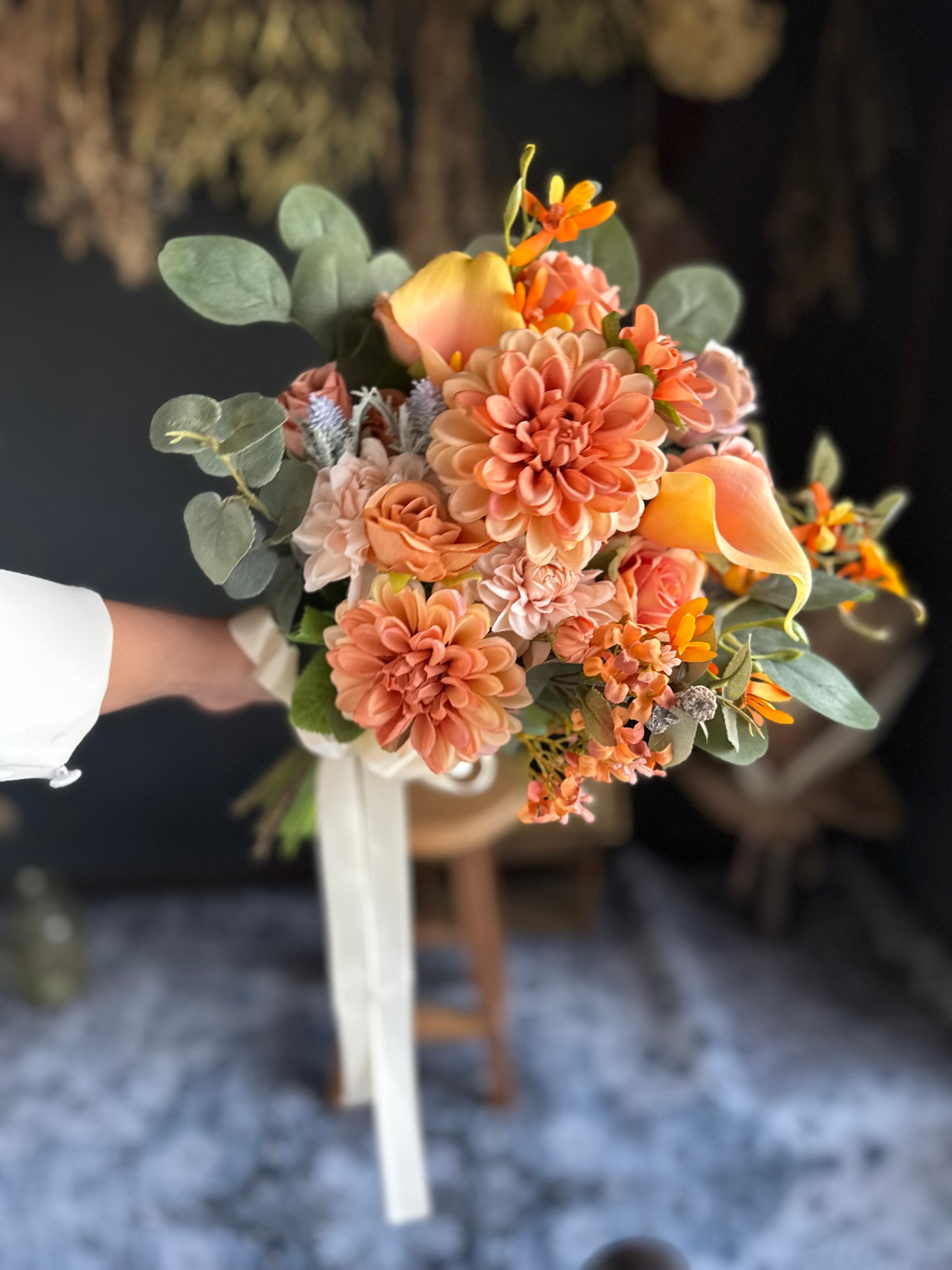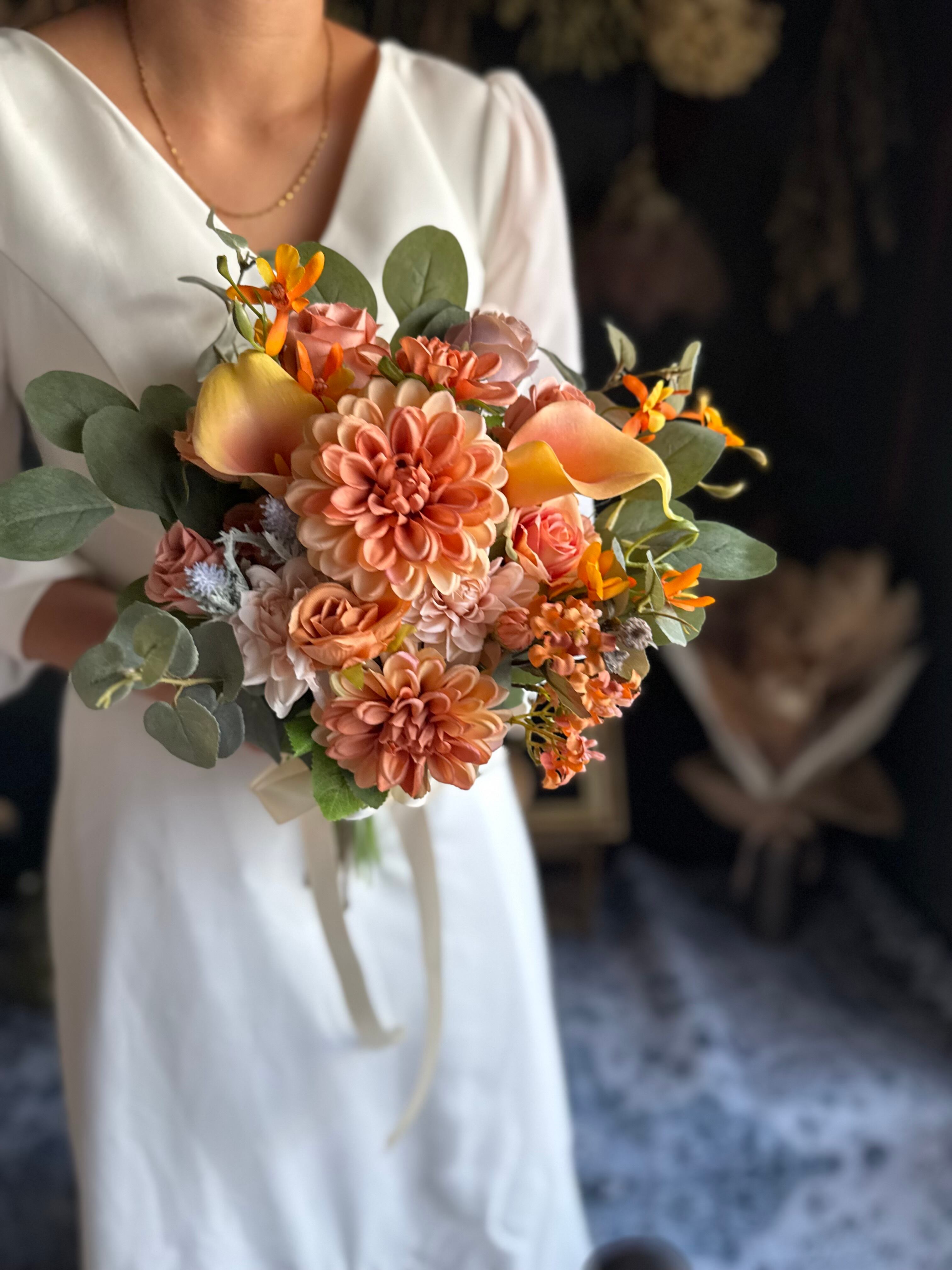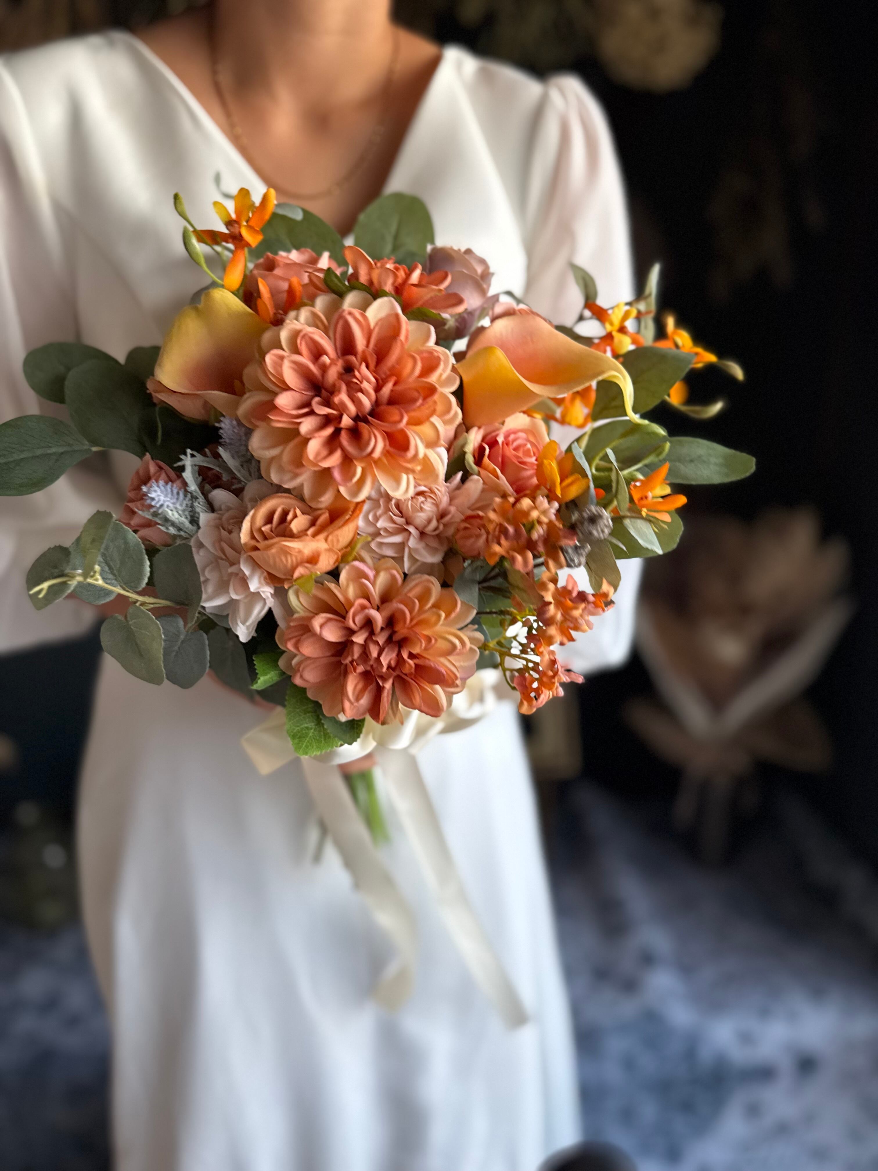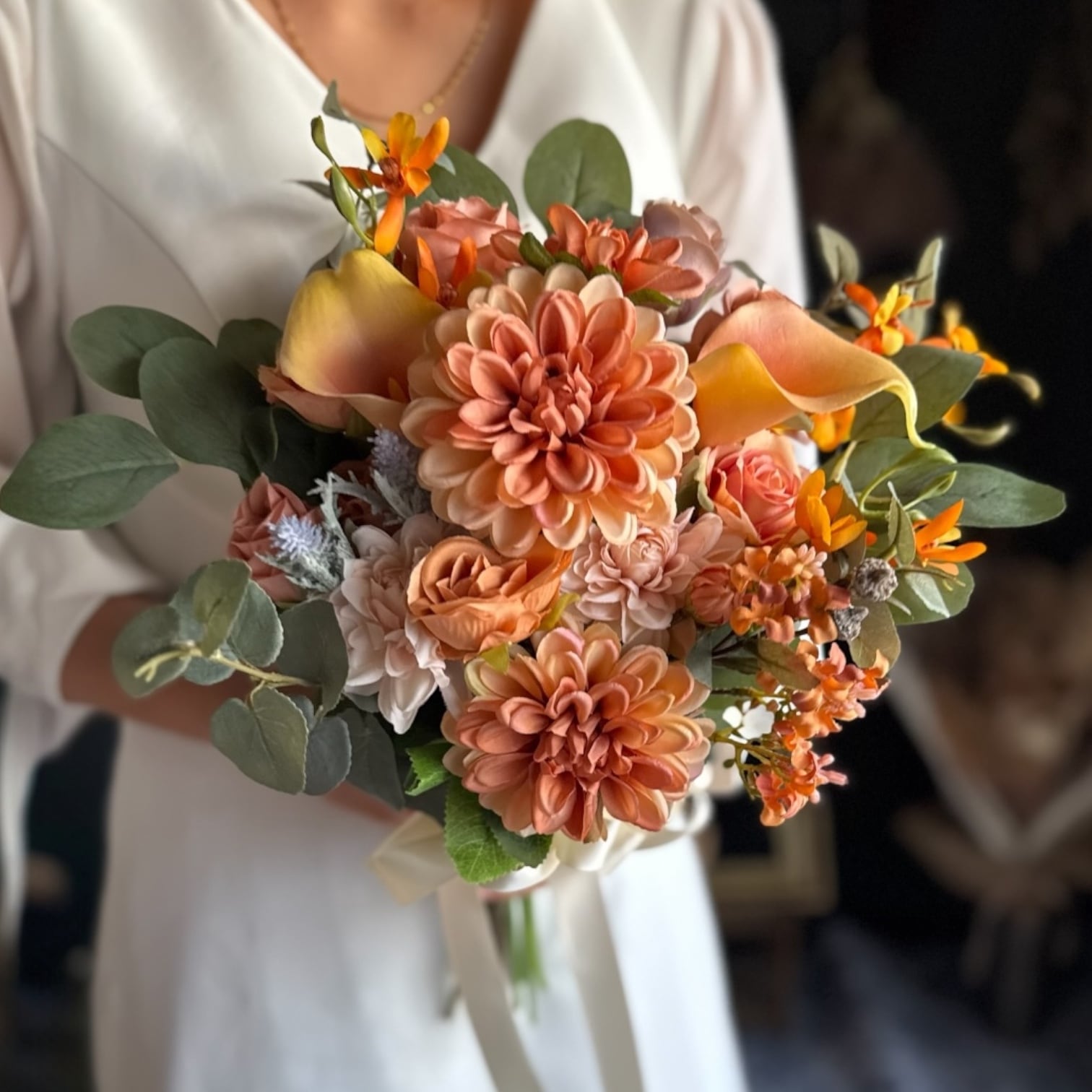やわらかな夕陽のようなオレンジカラーが美しい、華やかで温もりのあるブーケ•*・