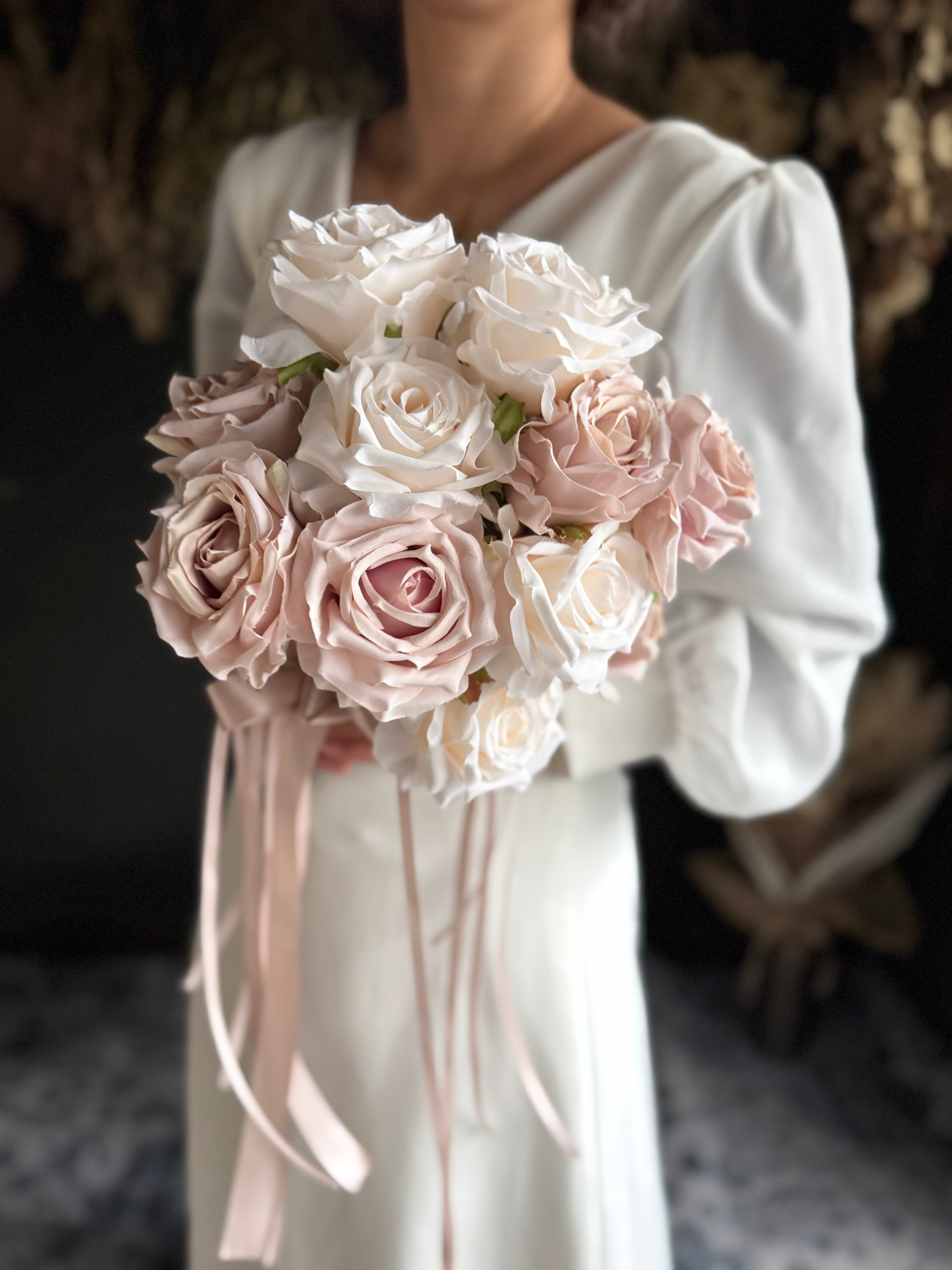 アイボリーのローズとくすみピンクベージュのローズを贅沢に束ねた、シンプルかつ華やかなアレンジです。