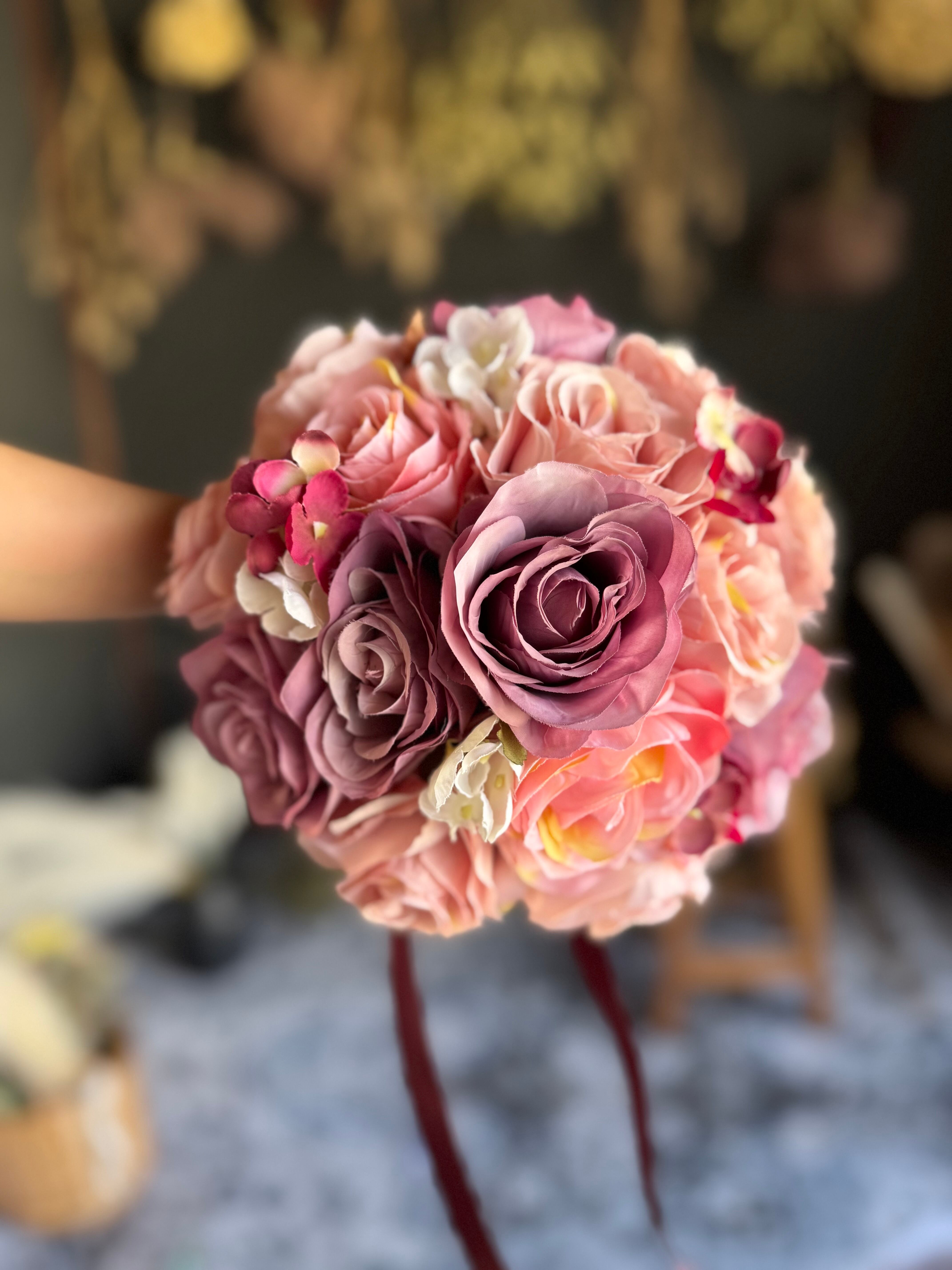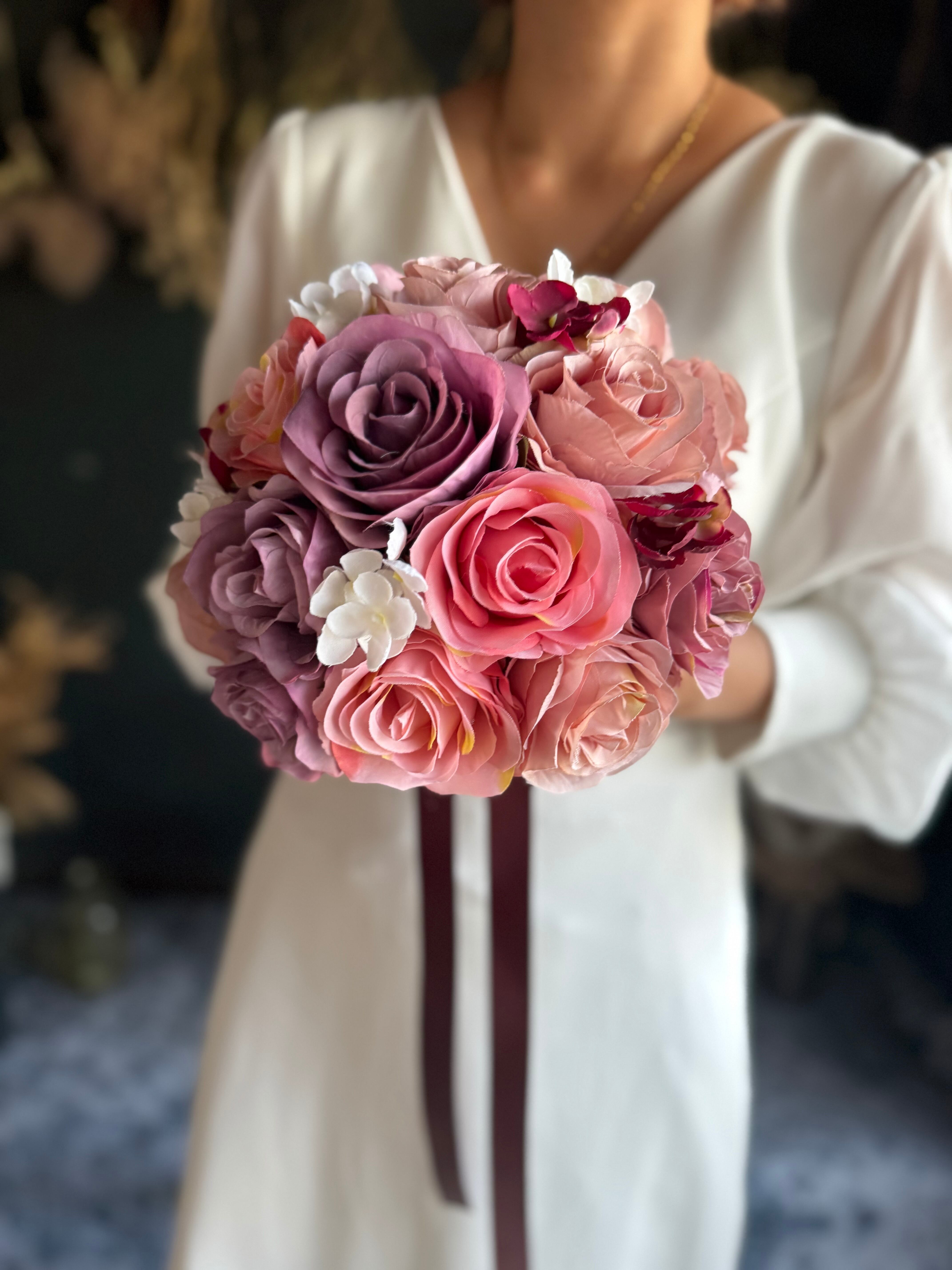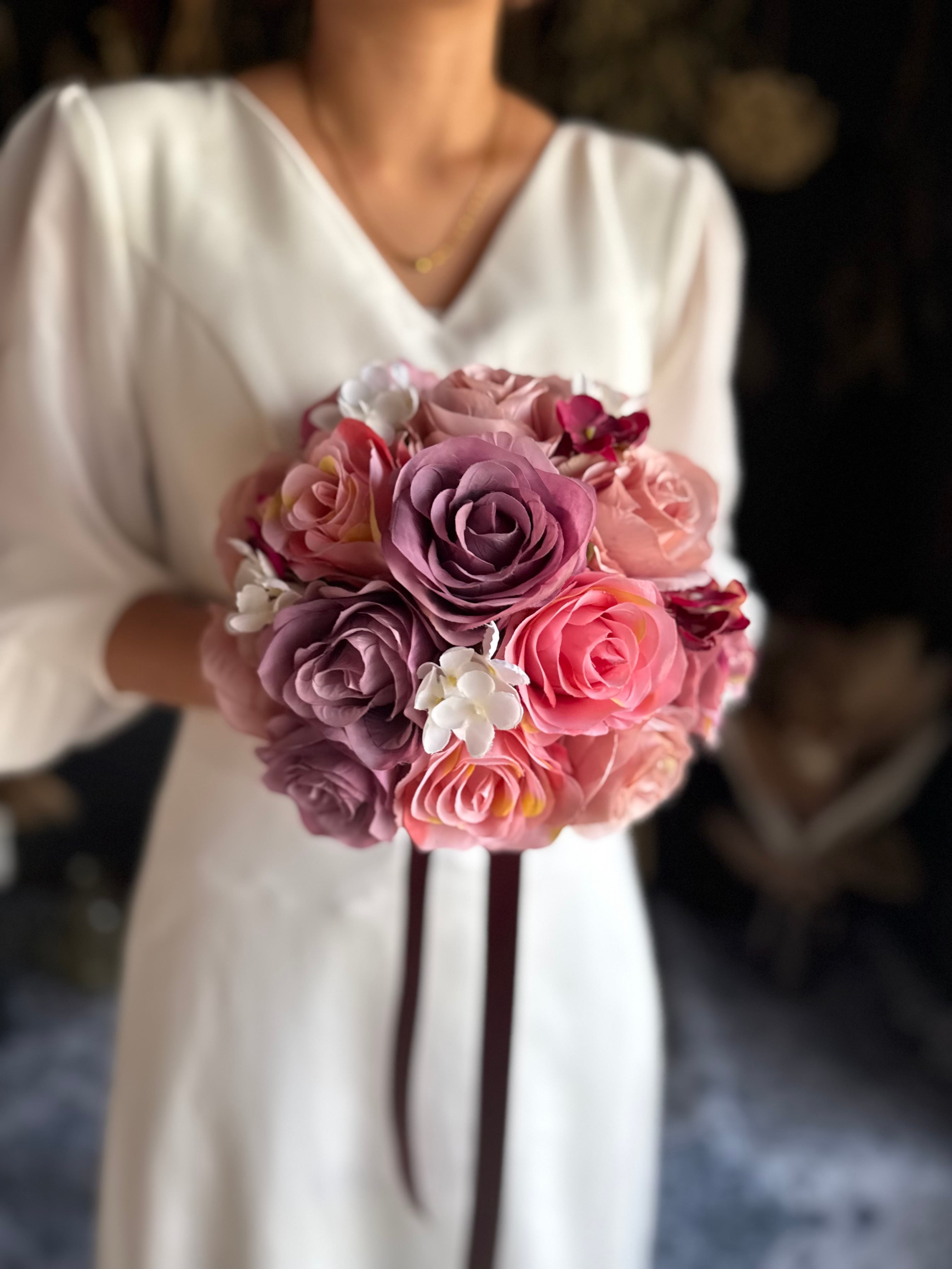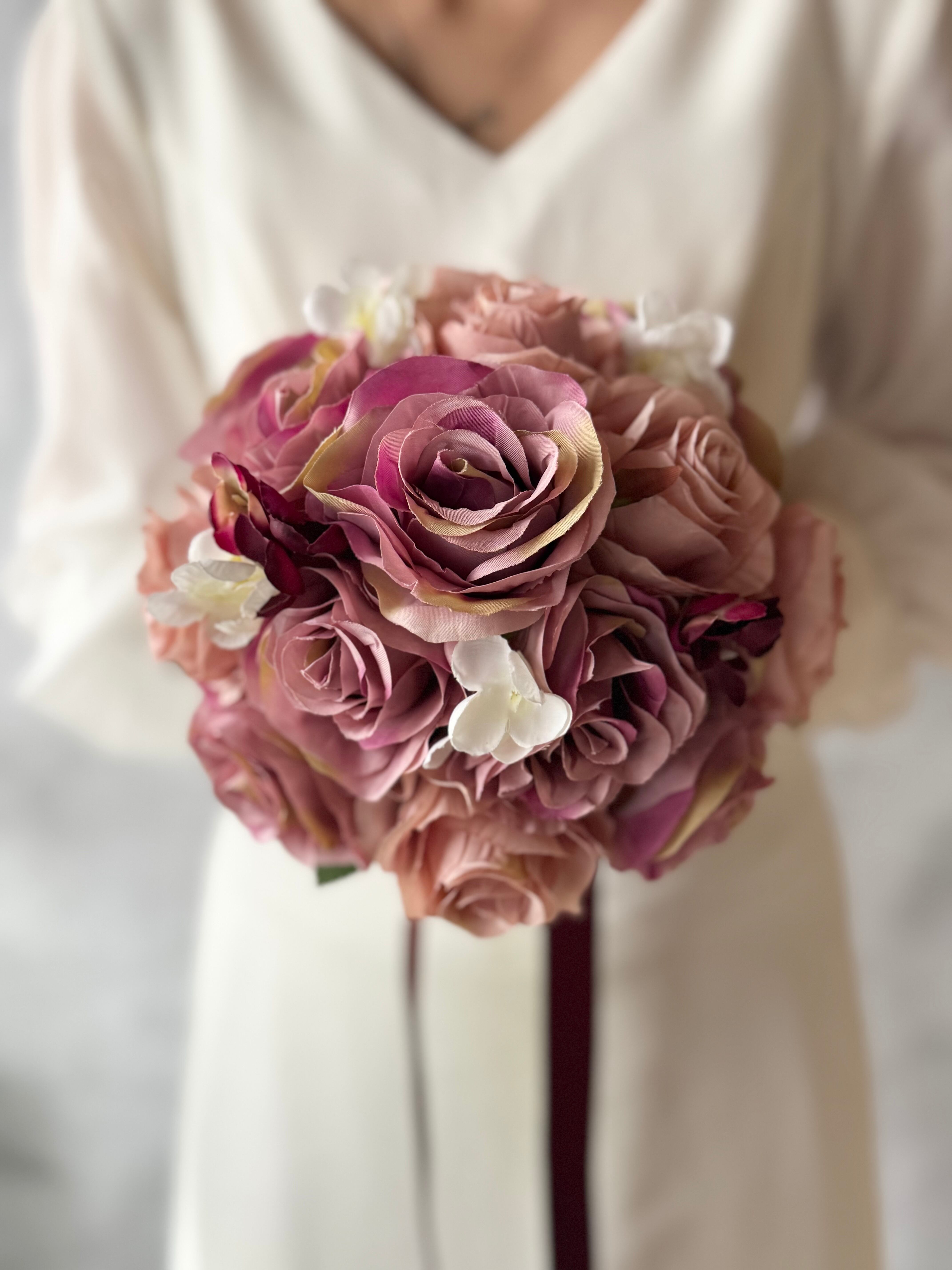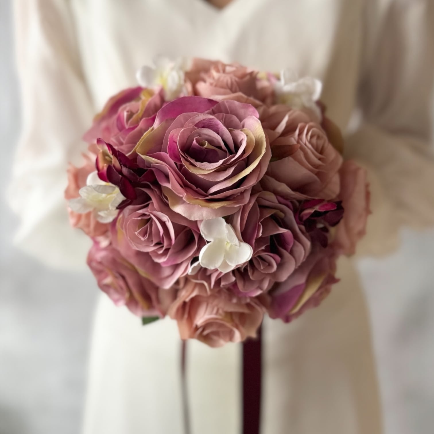 深みのあるシックなモーブピンクやベージュで大人っぽさイメージのラウンドブーケです♡