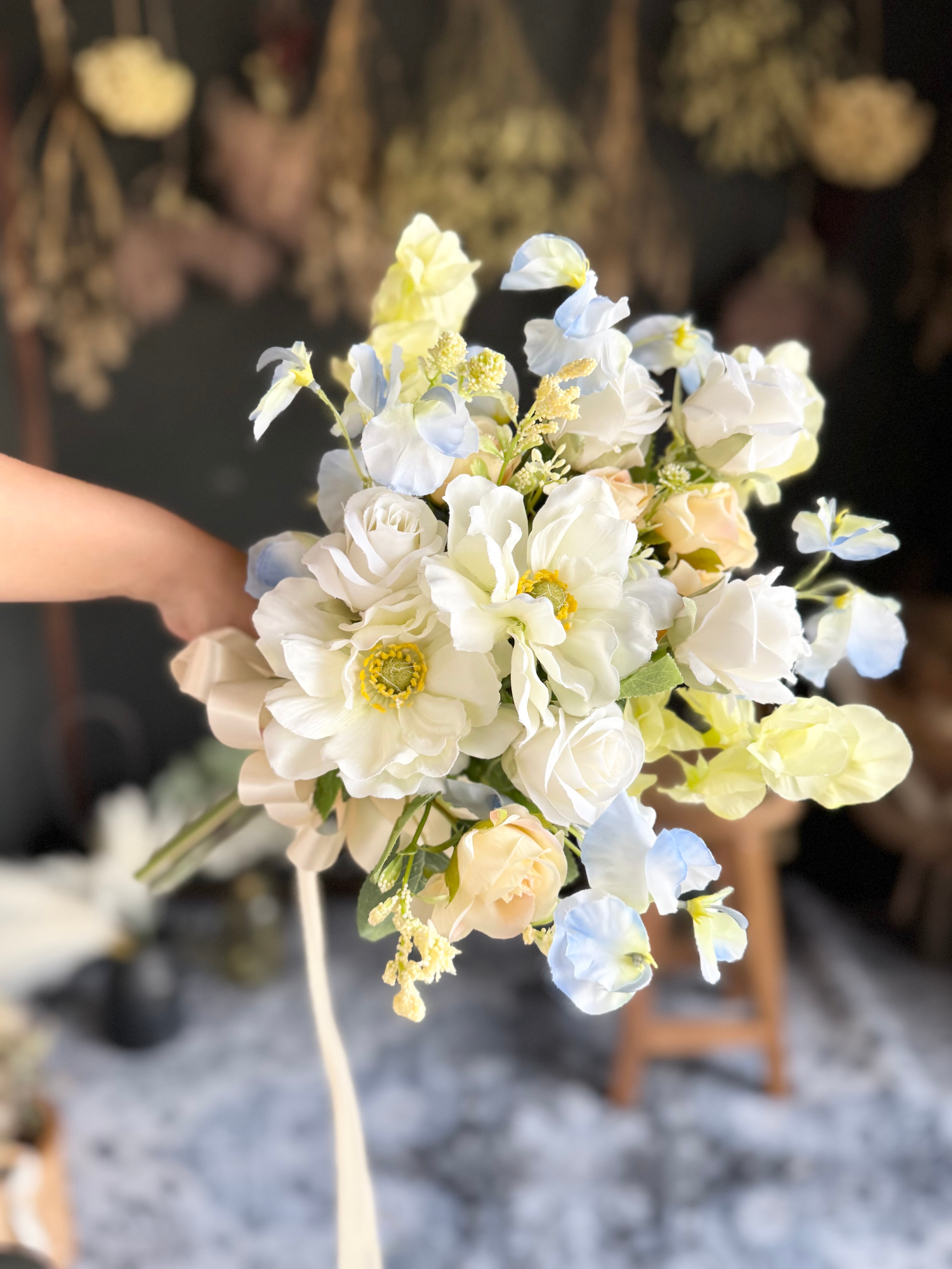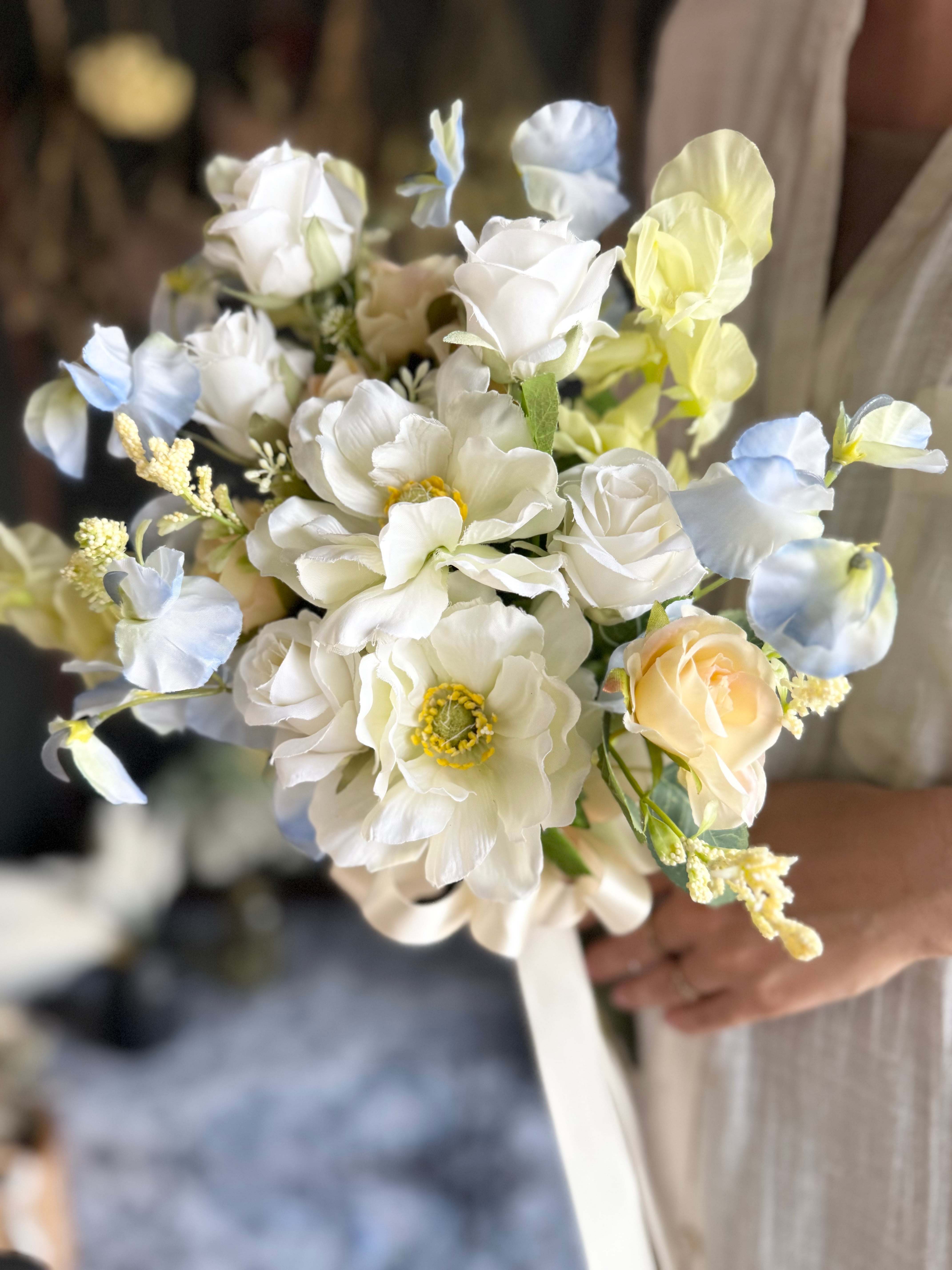 ホワイトとペールブルーが織りなす爽やかなブーケ•*・