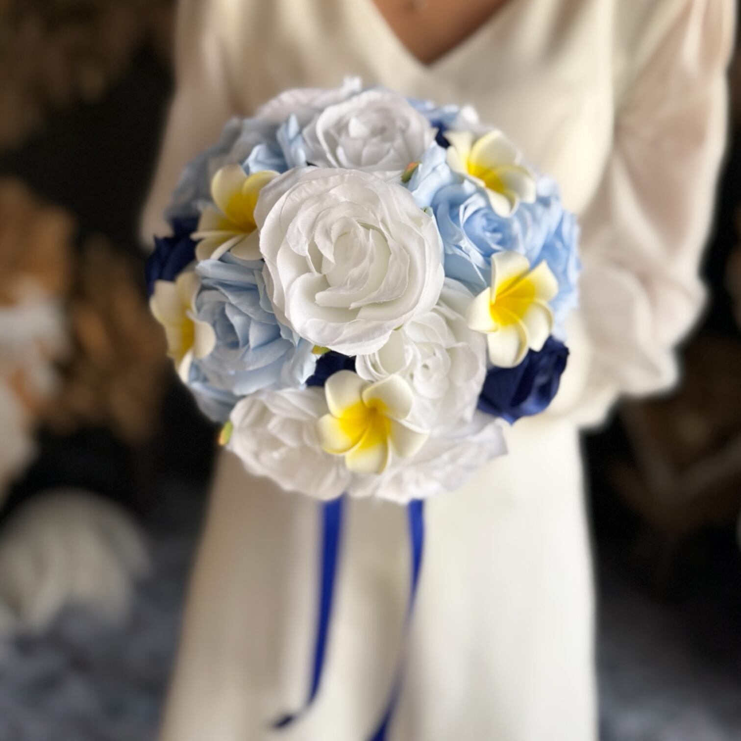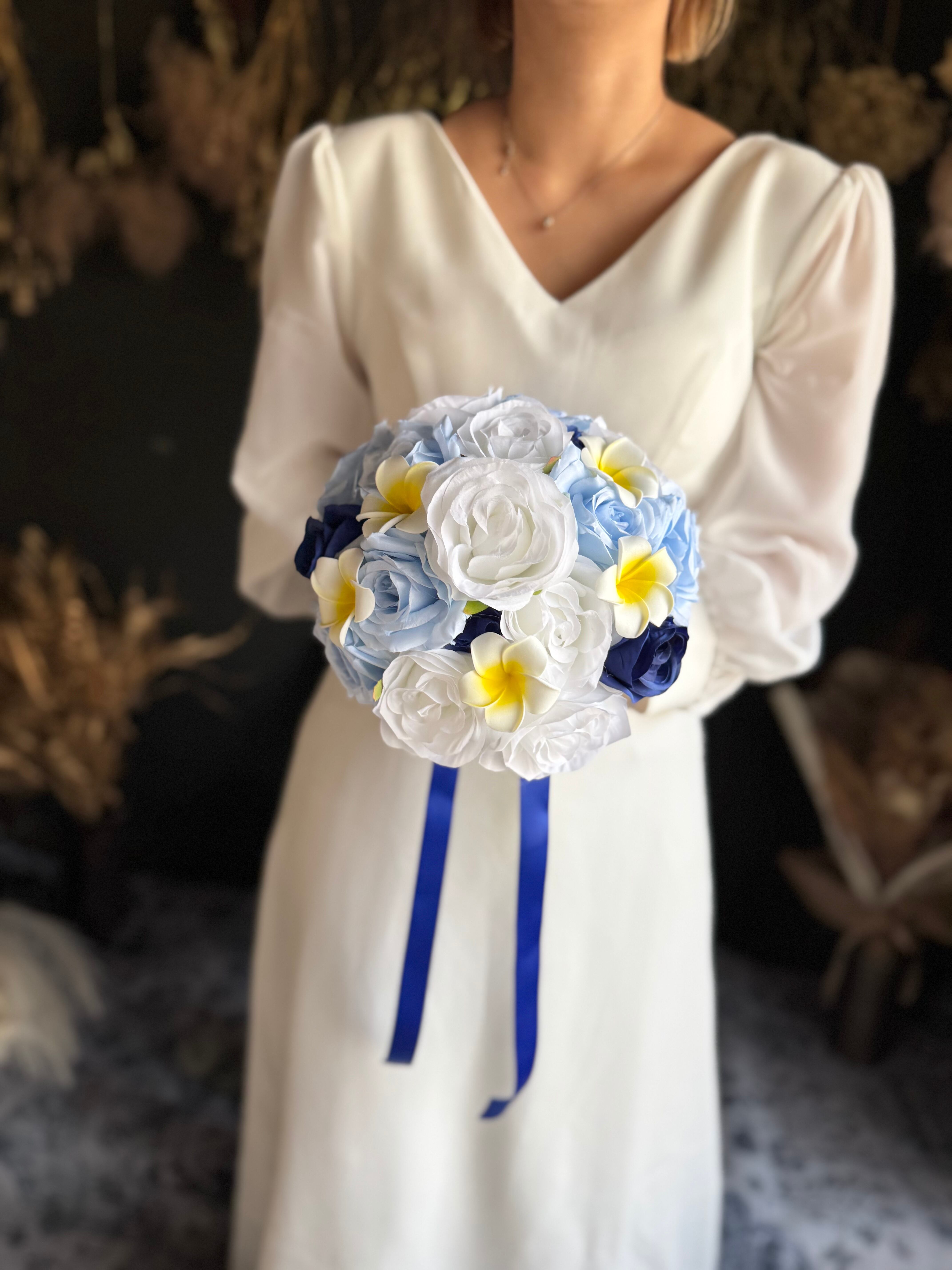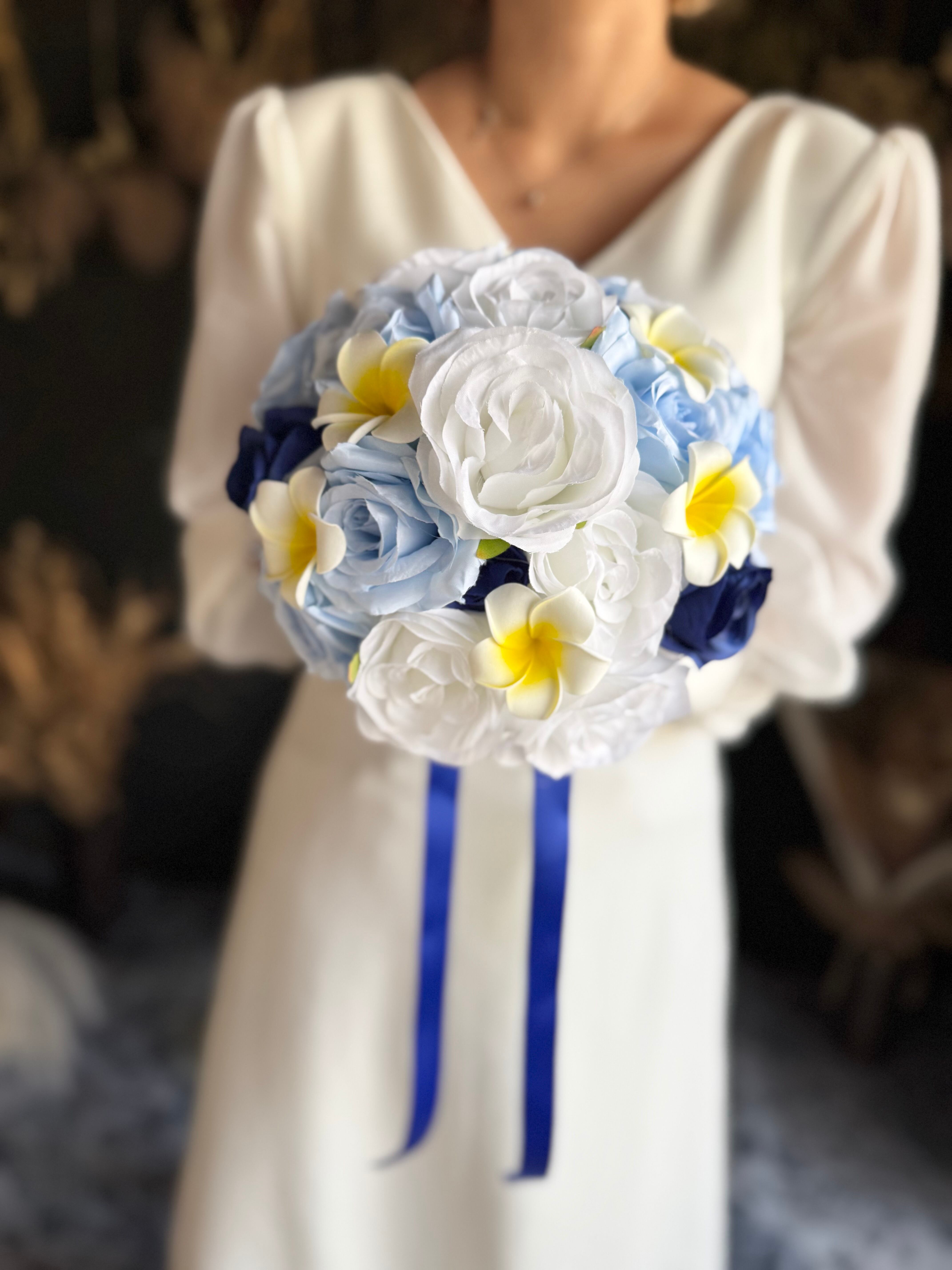 爽やかな白バラとブルーカラーのコントラストが美しい♪南国の雰囲気を取り入れたプルメリアも可愛らしく、夏にぴったりのラウンドブーケです。海辺でのウェディングや夏シーズンにもオススメです^ ^