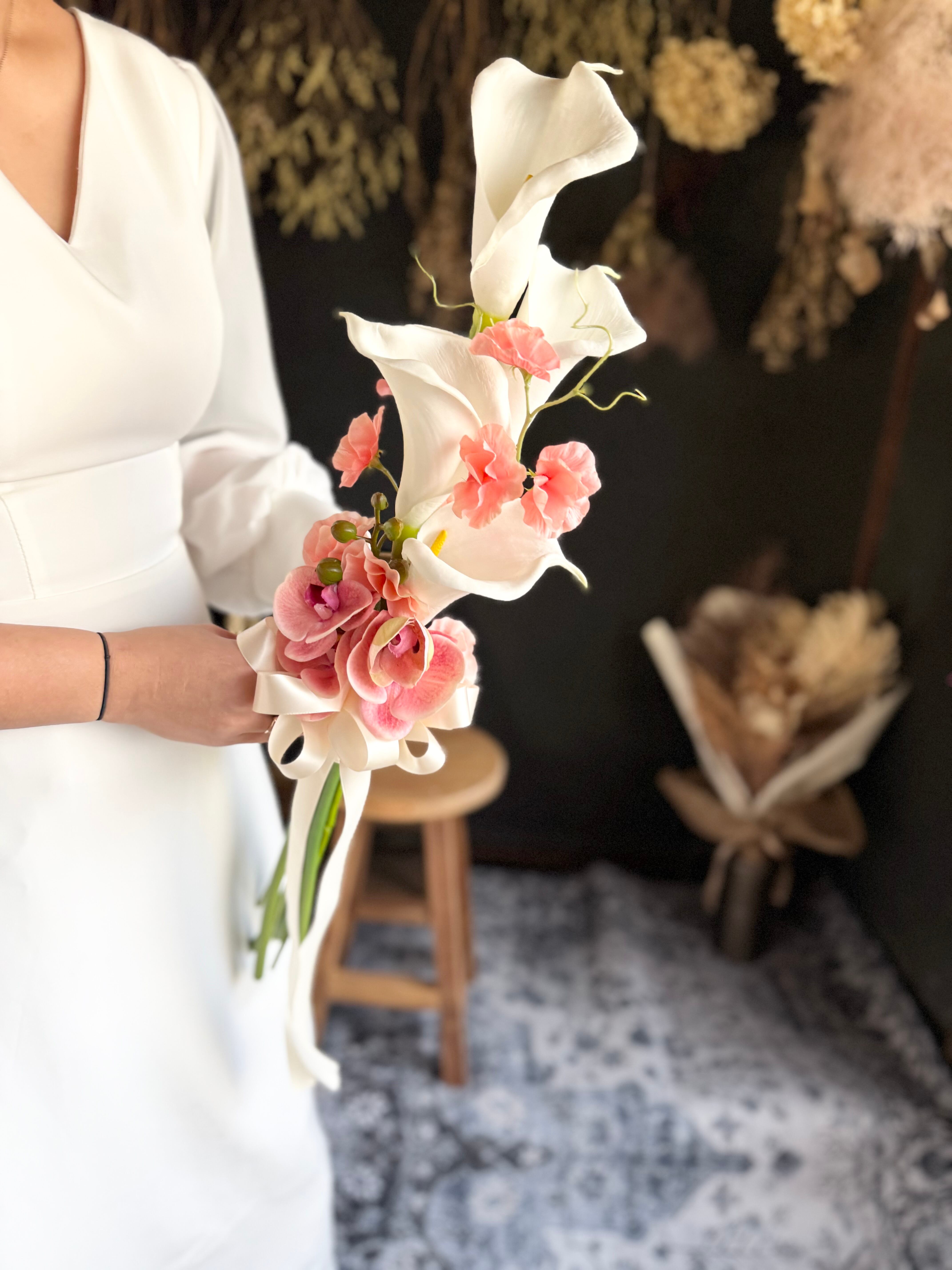 ラウンドブーケ、キャスケードブーケは式後、お部屋に飾れるようアレンジ出来るようになっています(*^^*)アレンジの仕方はYouTubeでもアップしてますのでほうき星 ブーケと検索ください♪