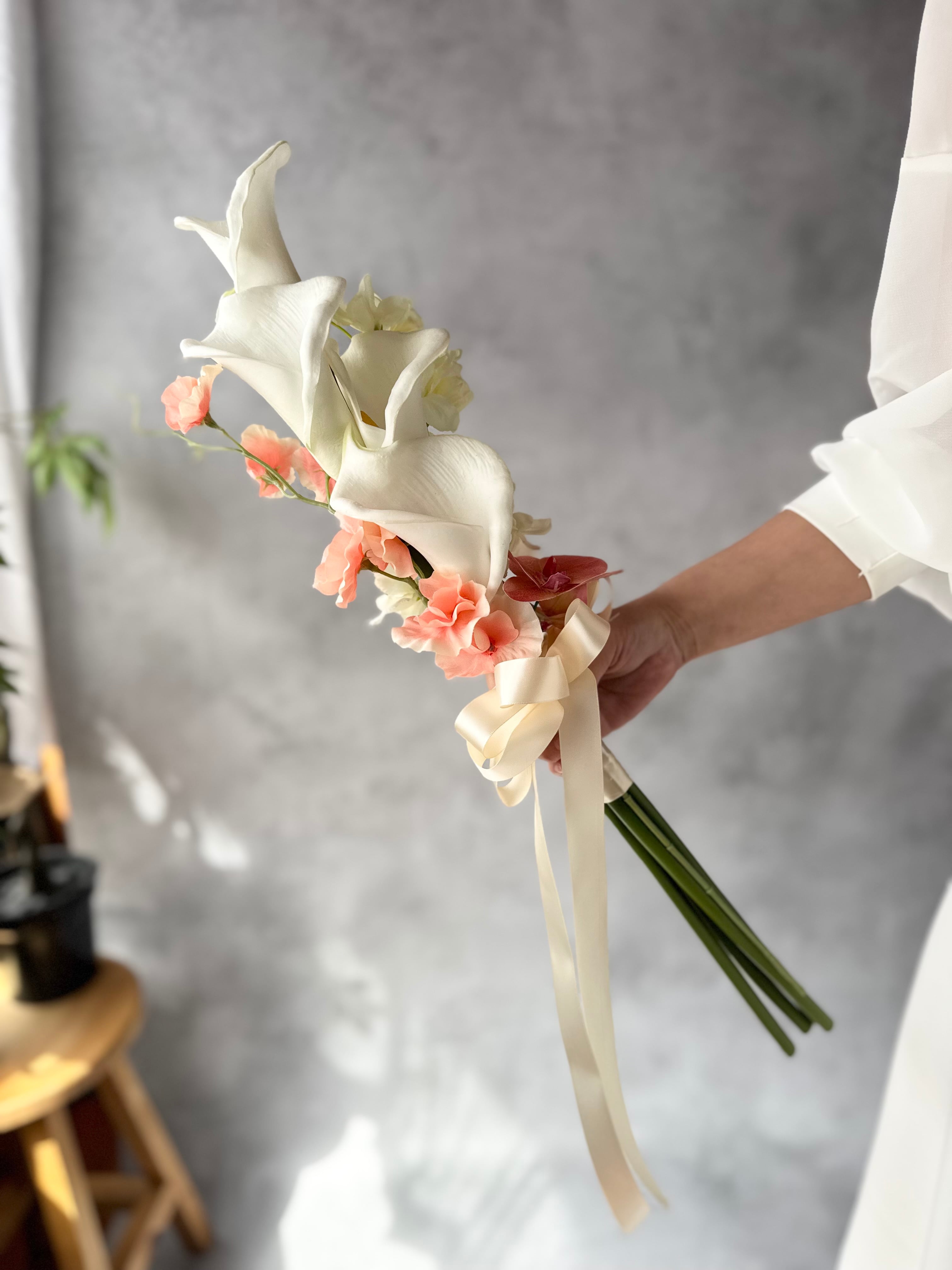 カラーをメインに、胡蝶蘭やスイートピーを合わせたナチュラルで上品な雰囲気のブーケです。